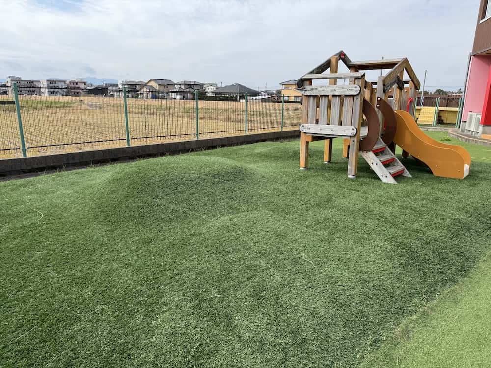 人工芝の山なので斜面を滑りおりたり、小さい子どもたちはハイハイをしてのぼったりして安心して身体を動かせます。