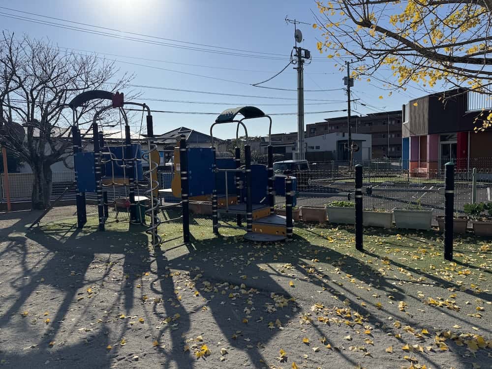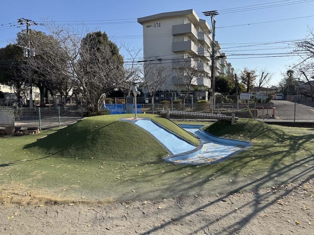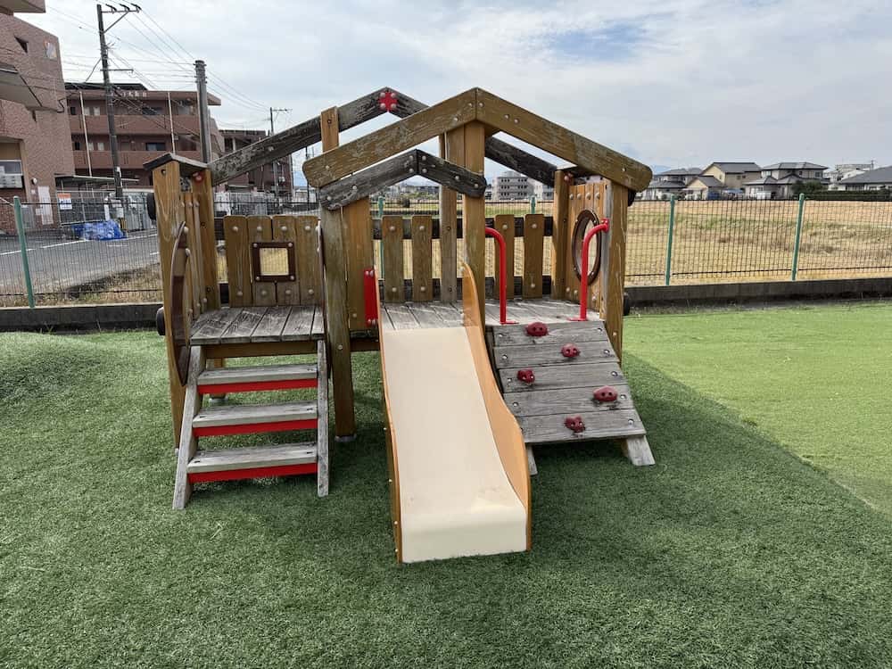 築山に遊具があり、0・1歳児が楽しめるようなサイズでのぼり降りやすべり台を楽しめます。