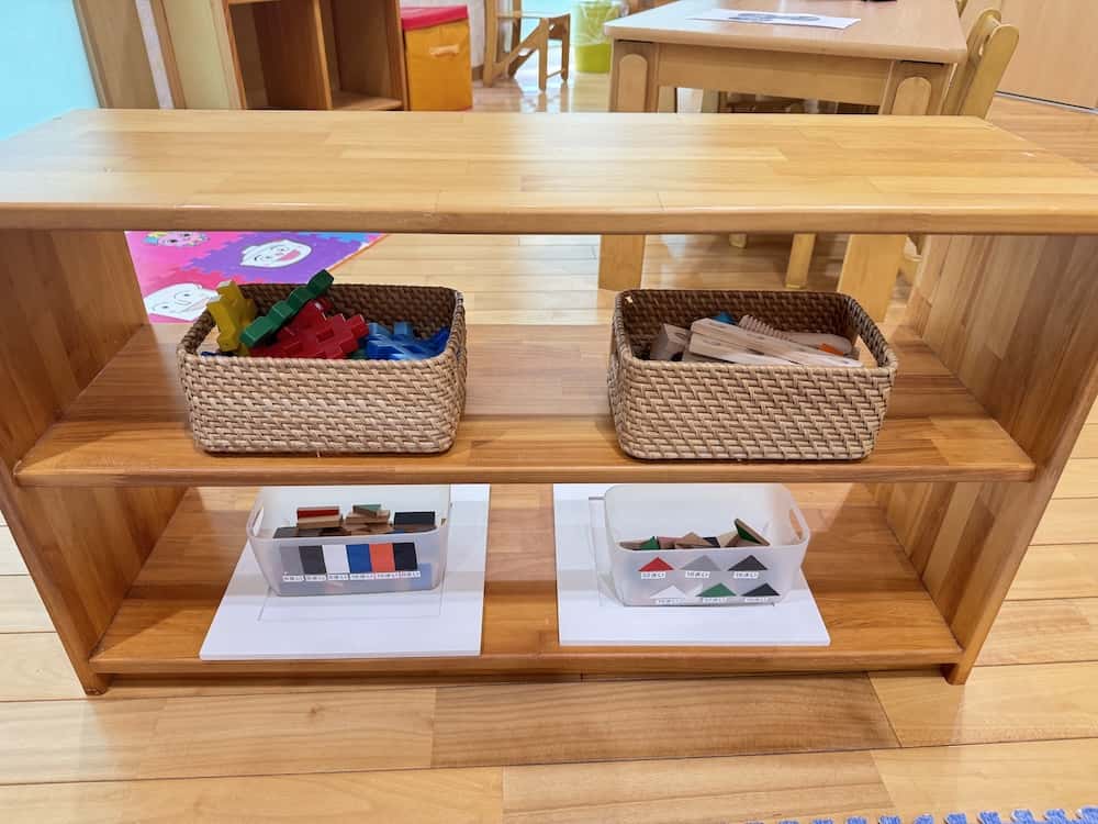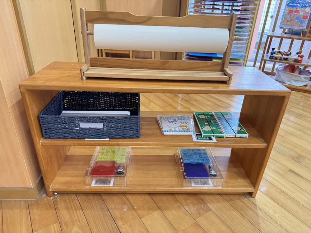 小さな折り紙棚があり、好きな色を選ぶことができ、また近くには折り方の本があるので思考力を育みながら好きなのを折ることができます。