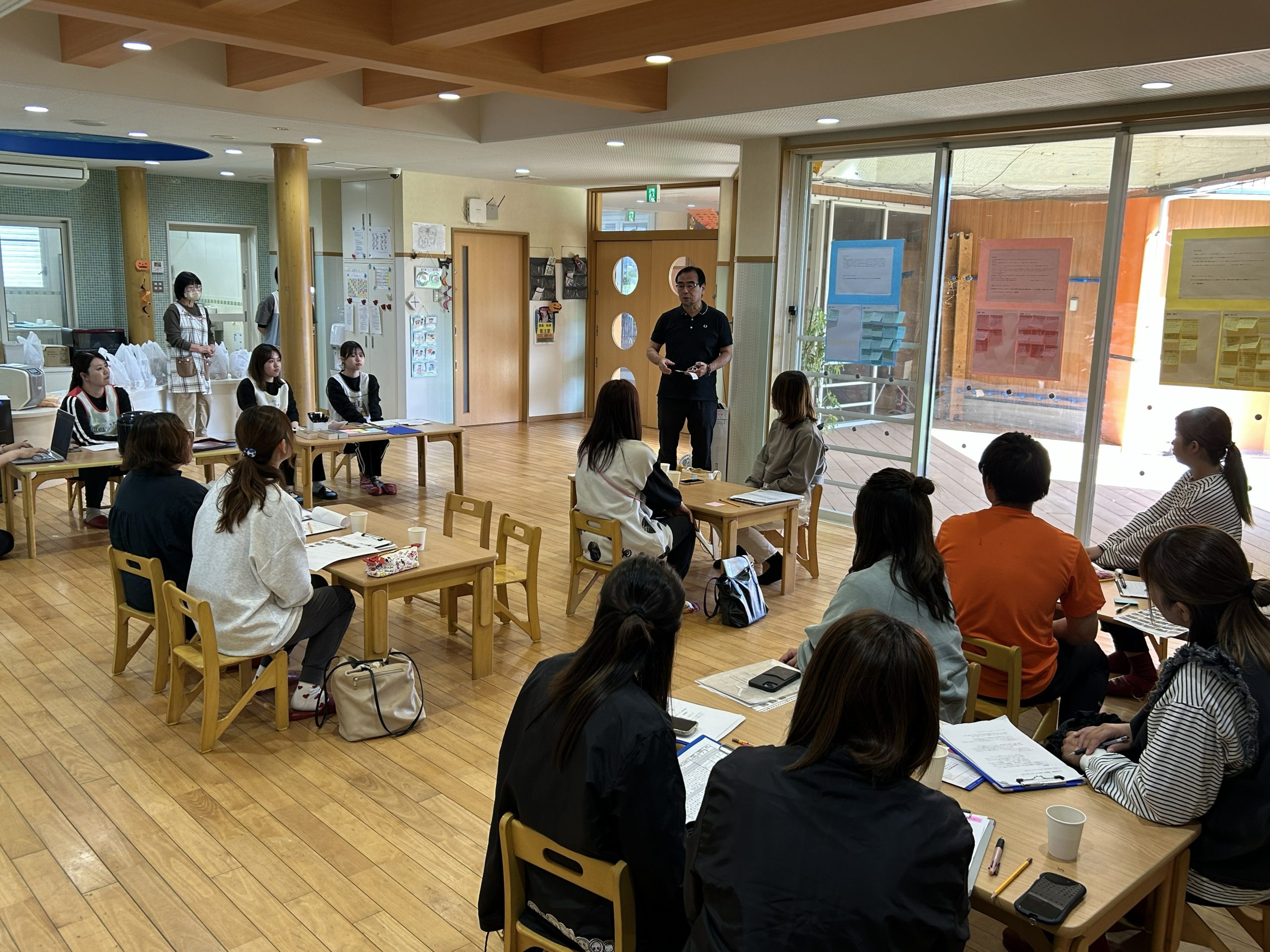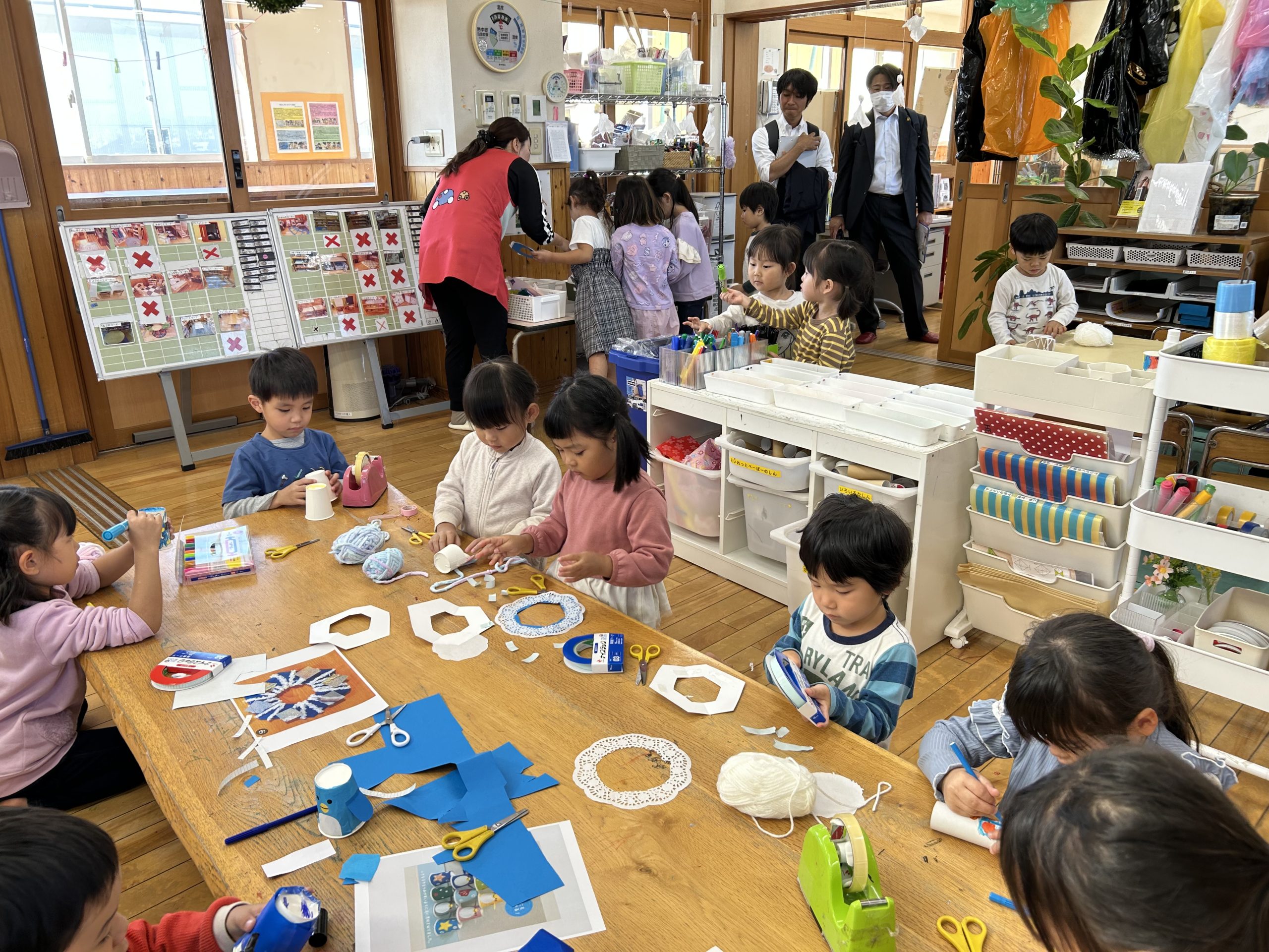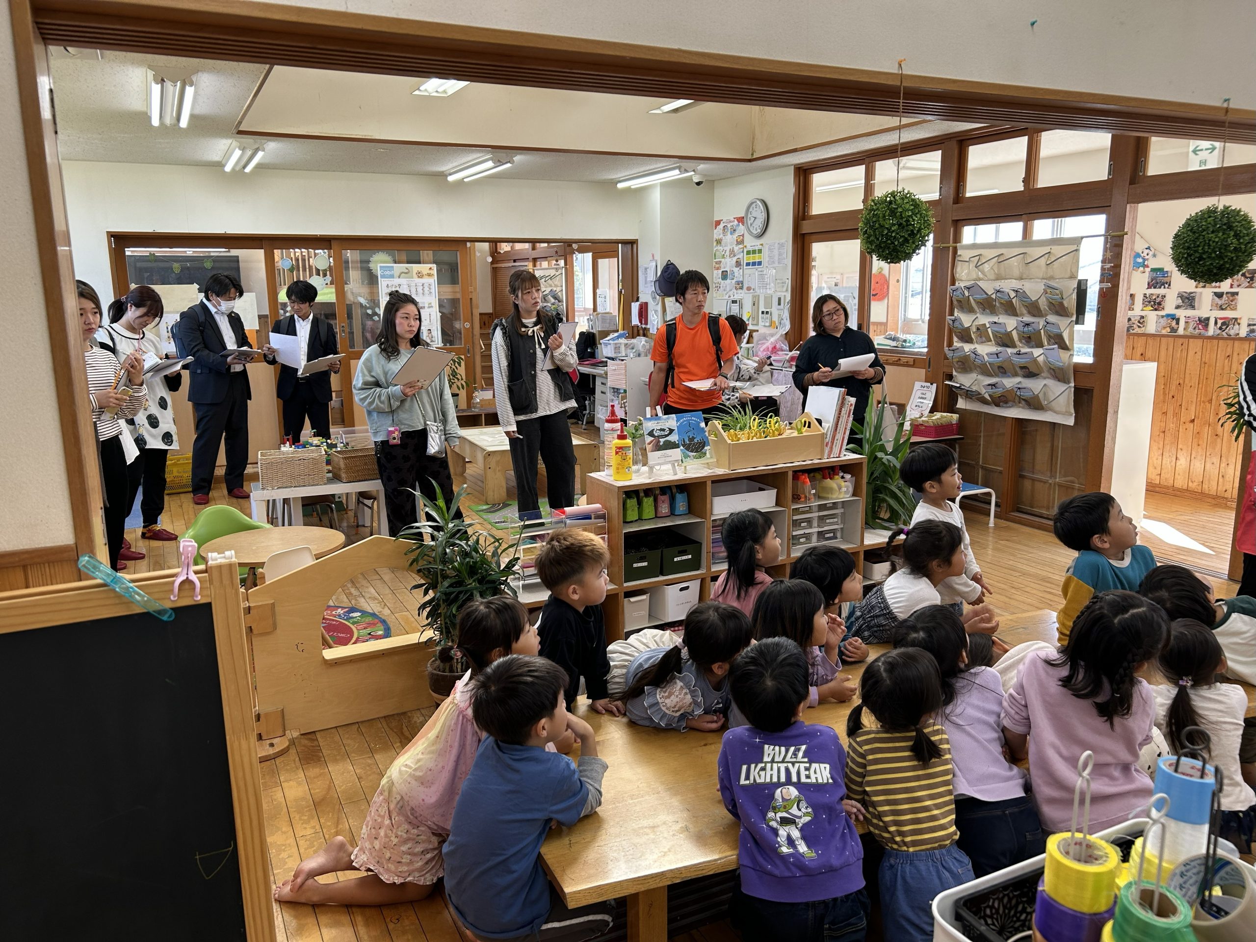 県内6ヶ園の先生と、地域の方、保護者の方に保育を参観していただきました。参観後、公開保育に関する問いを3つ立てて、皆さんに意見を出してもらい、園長がそれについて解説を行いました。