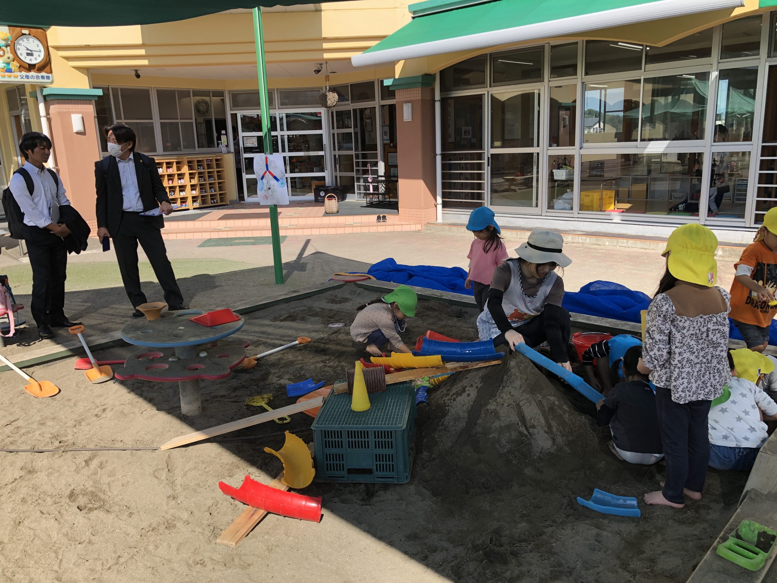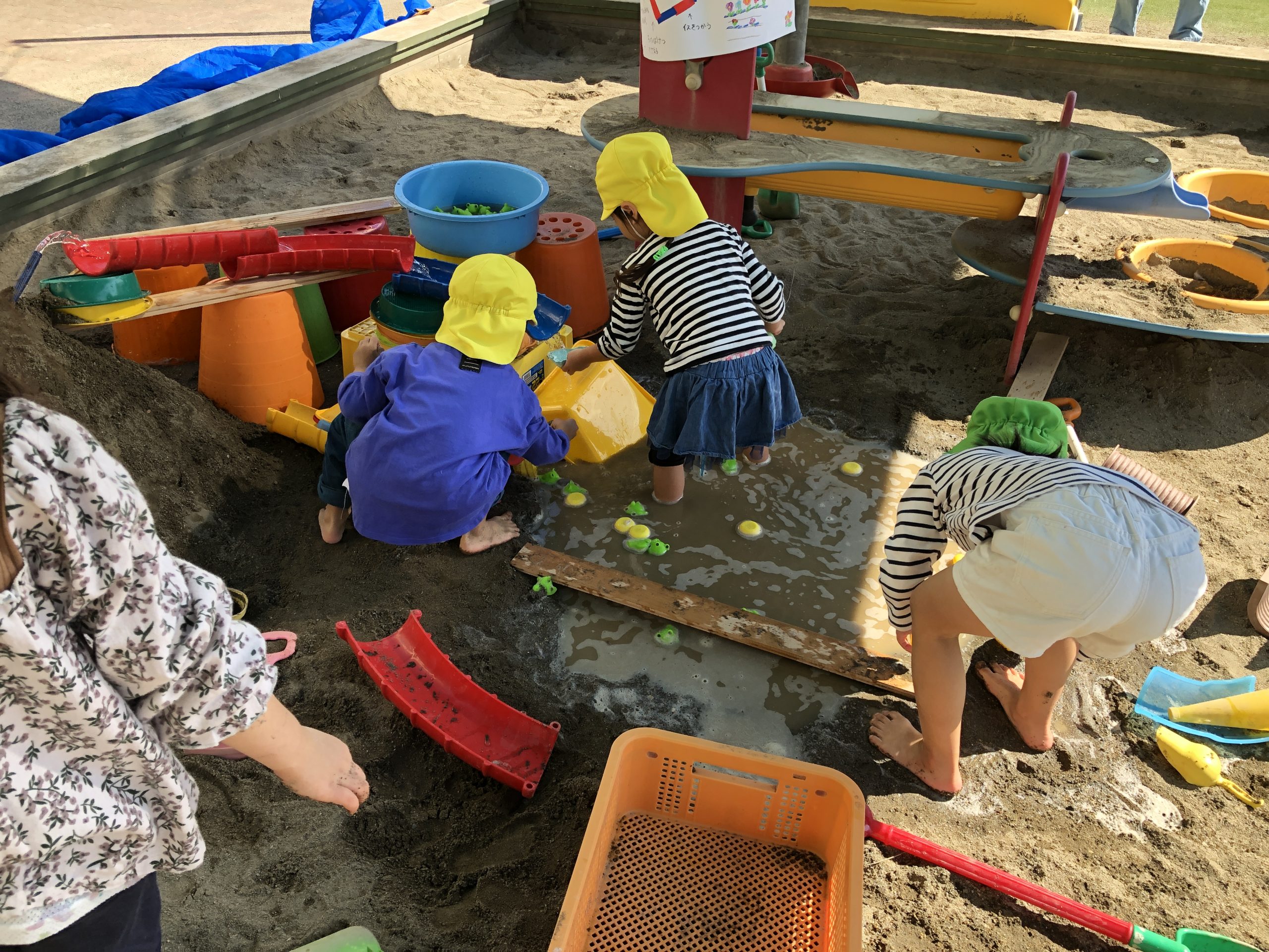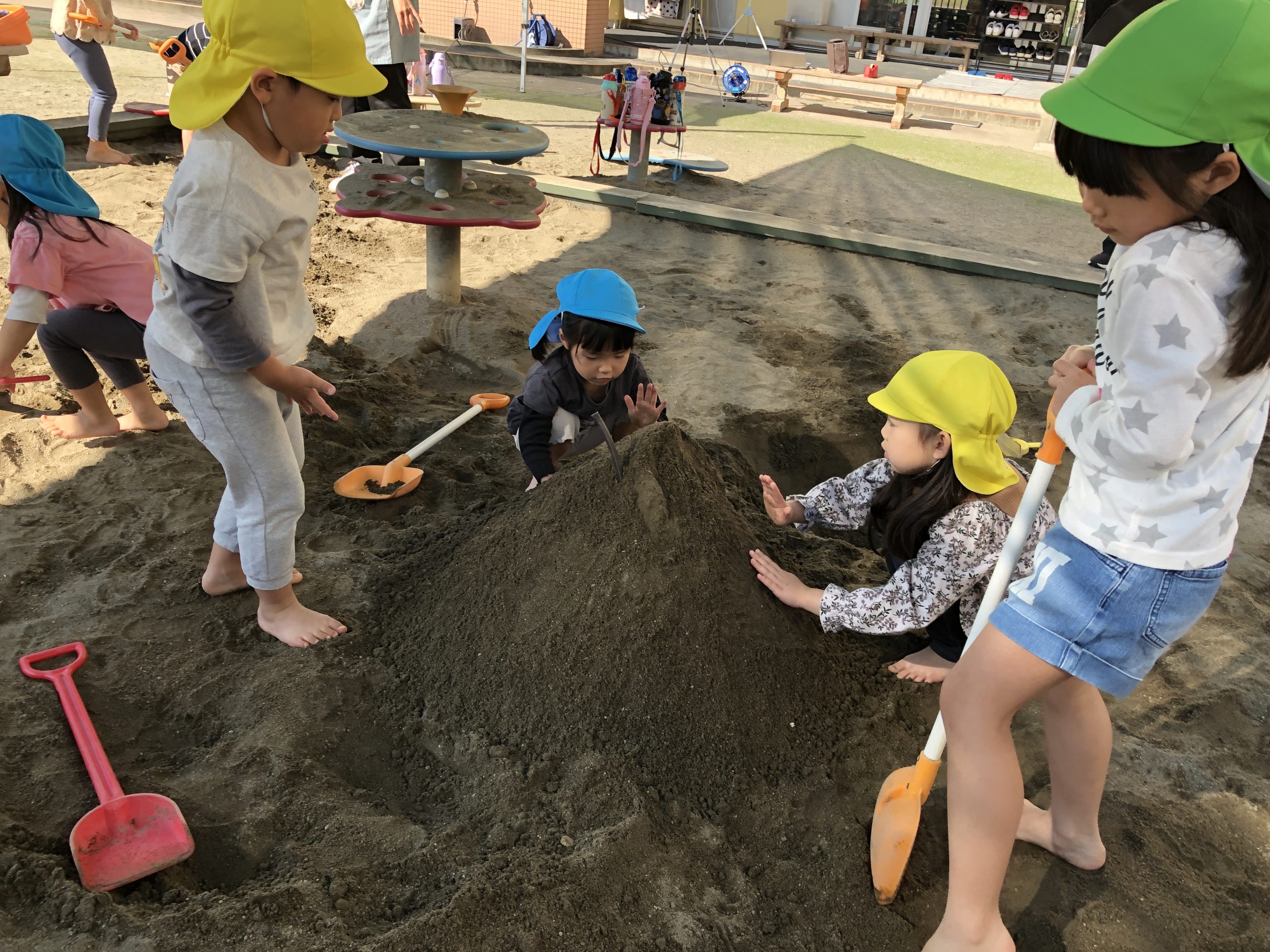 前回、みんなで考えて描いた図案を元に砂場遊びをしました🌞協力して山や池を作ったり、試行錯誤しながら水路を作ったりとみんなで作り上げていましたよ✨次は、お花や動物のお家・庭を作りたいと今後の砂場遊びも楽しみにしている様子でした⭐
