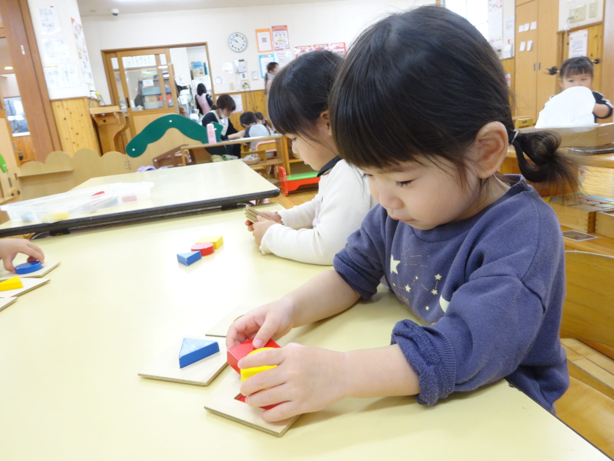 今日は、型はめの玩具で遊びました‼〇・△・▢それぞれの形を見て、正しい場所にブロックをはめる事ができましたよきらきら