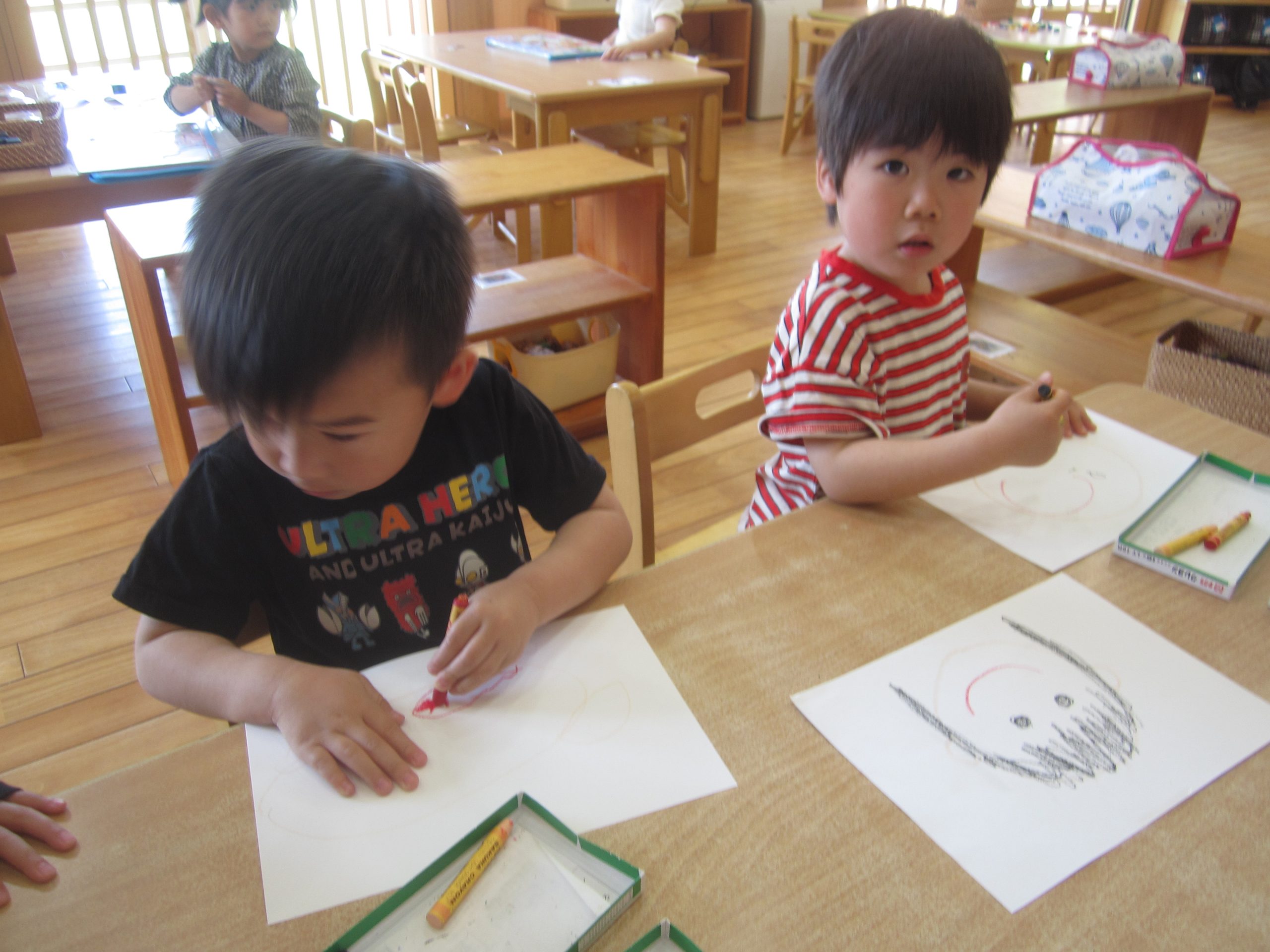 今日は、お絵描きをしました🖍顔のパーツや色を確認しながら上手に描くことができましたよ~😊みんな『ママ描こう!!』『お友だち描いてるよ🎶』と誰かを想像しながら書いていましたよ~🤔💕
