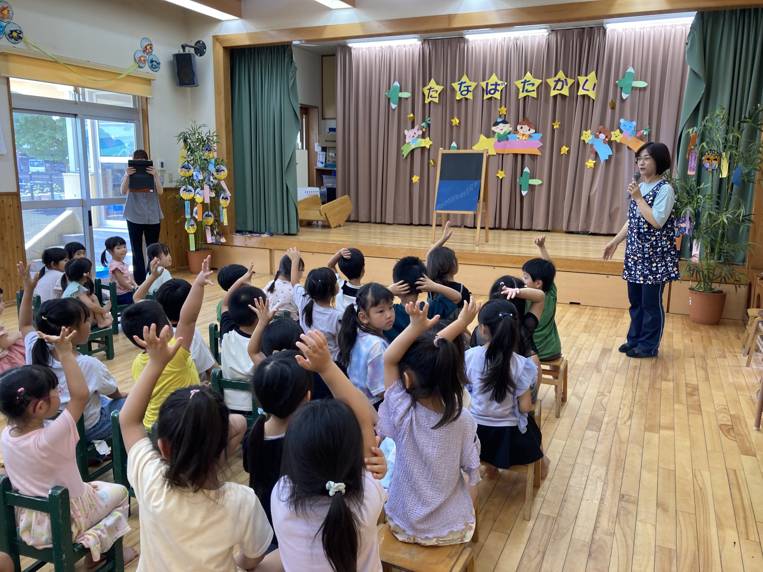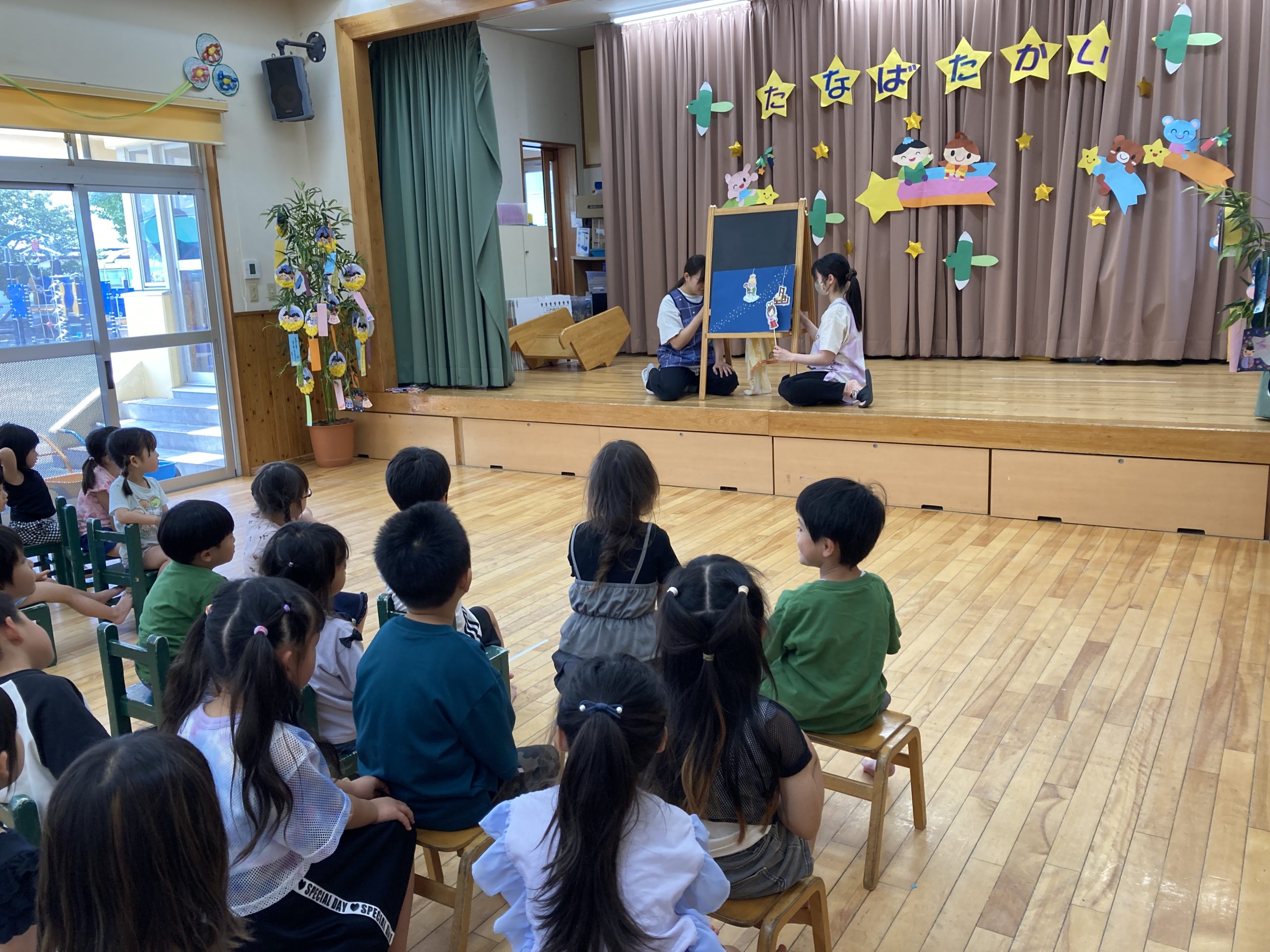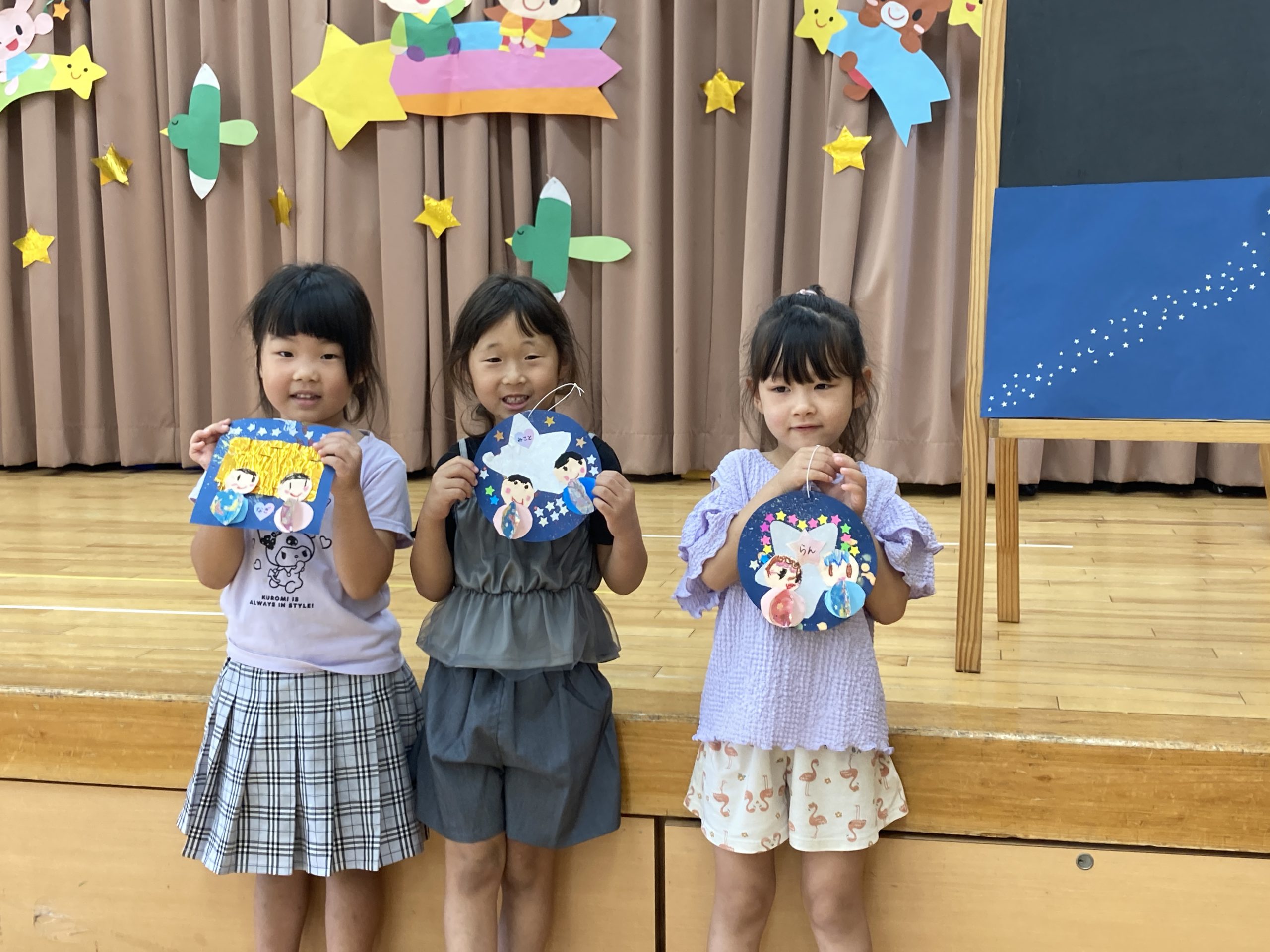 今日は、七夕会🎋に参加しました。たなばたの製作をそれぞれのクラスが紹介したり、七夕の由来についてのペープサートを見ました!みんな楽しんで見ていました😆