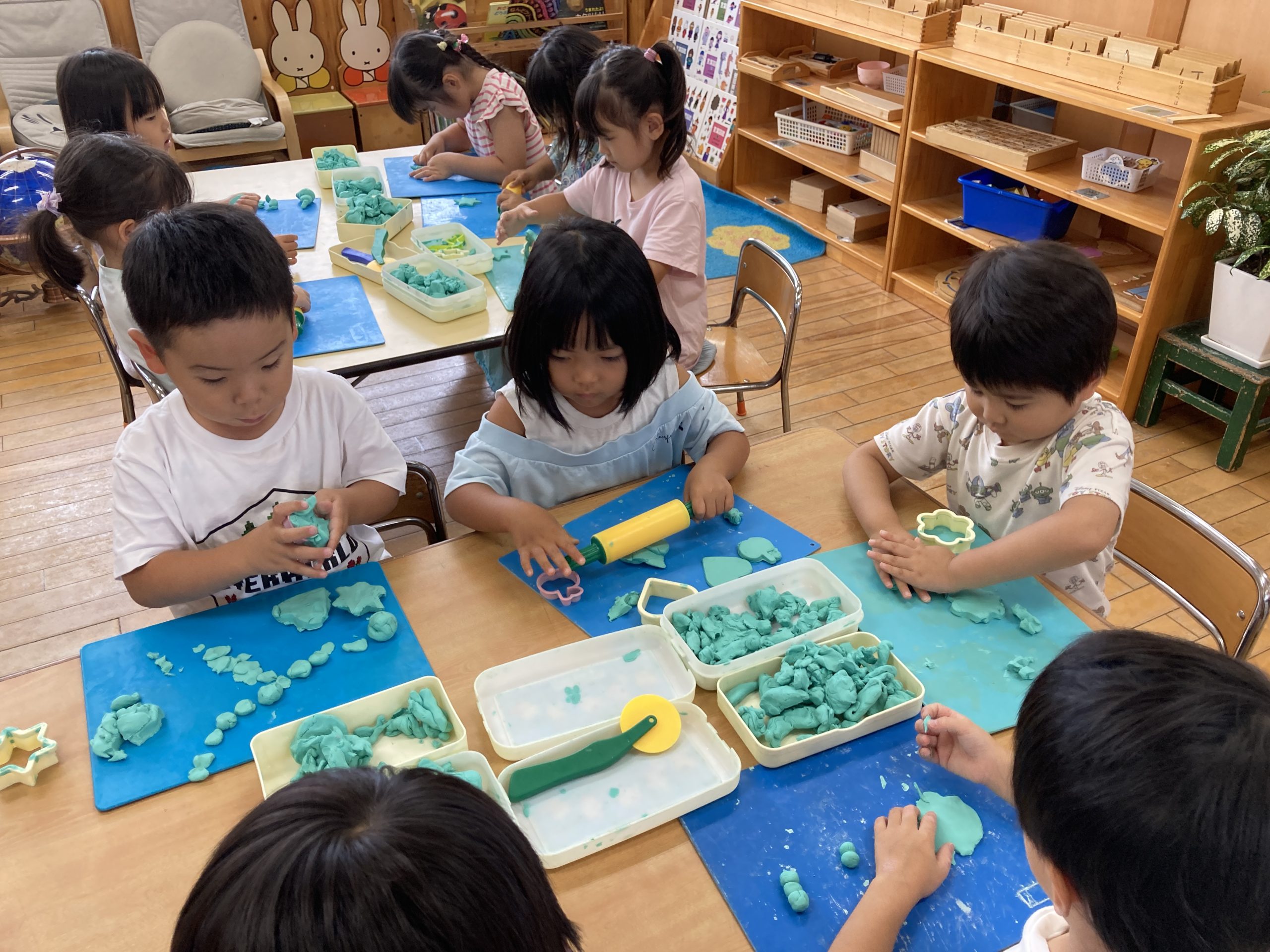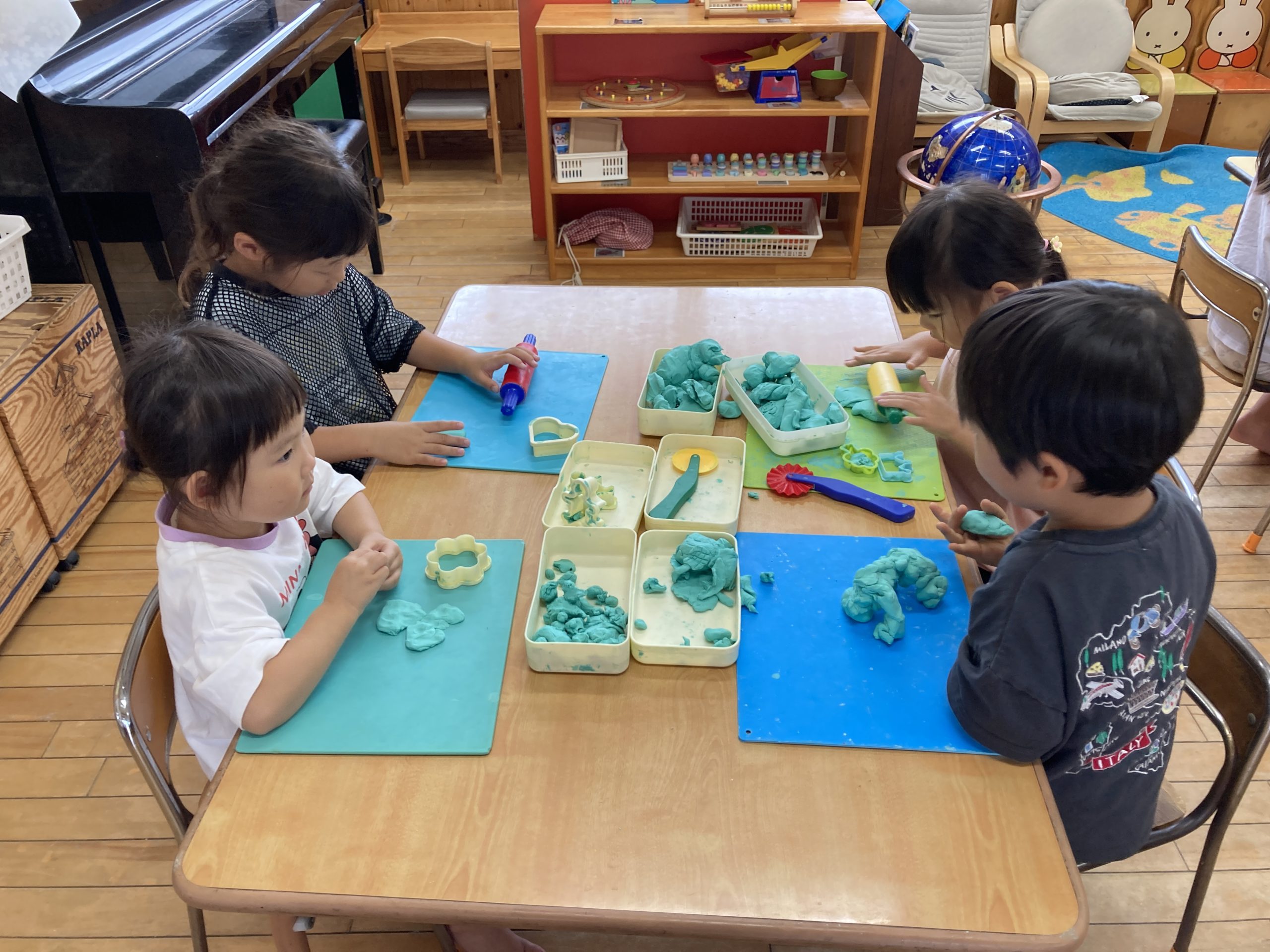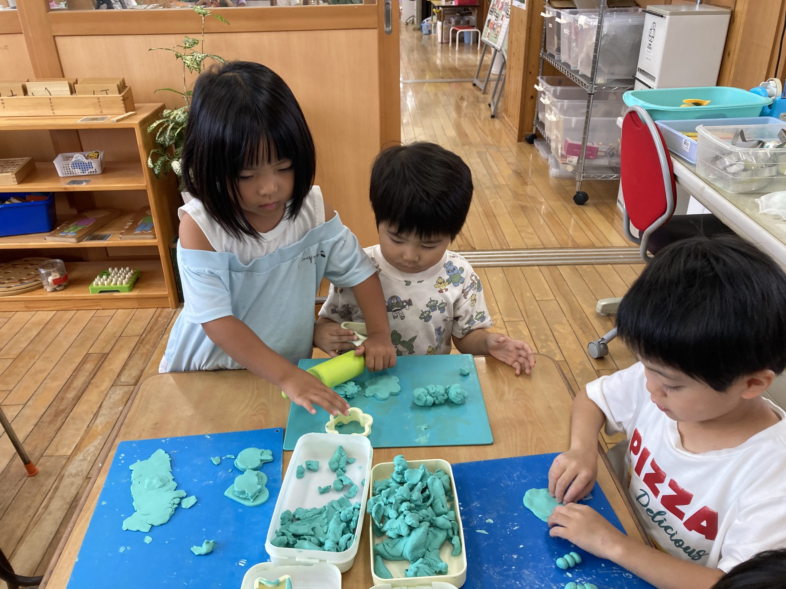 今日は、異年齢グループで粘土をしました。道具と型抜きを使って好きなものを作っていました。道具の使い方がわからない時は、上の学年のお友だちが使い方を教えてあげていました!