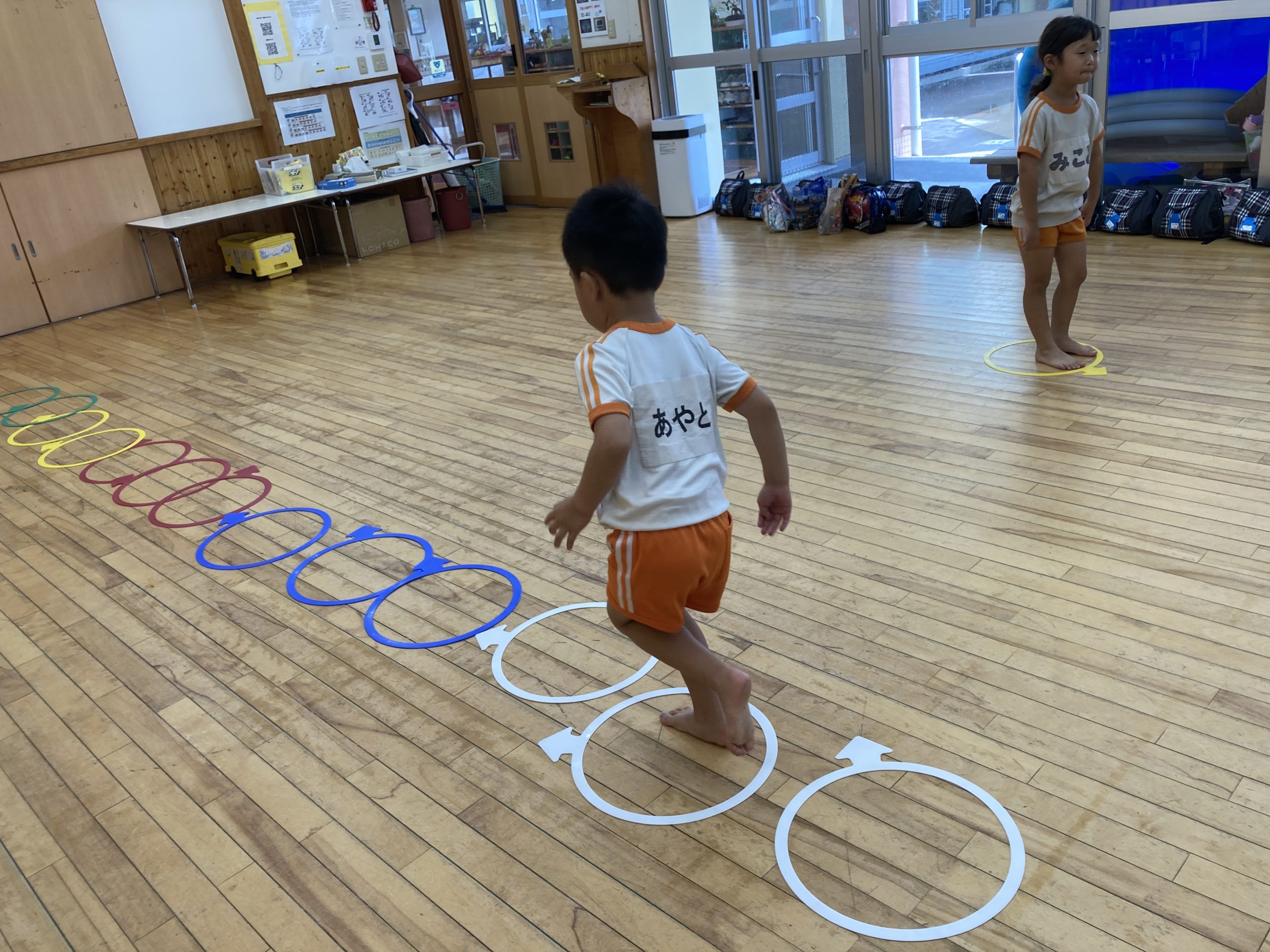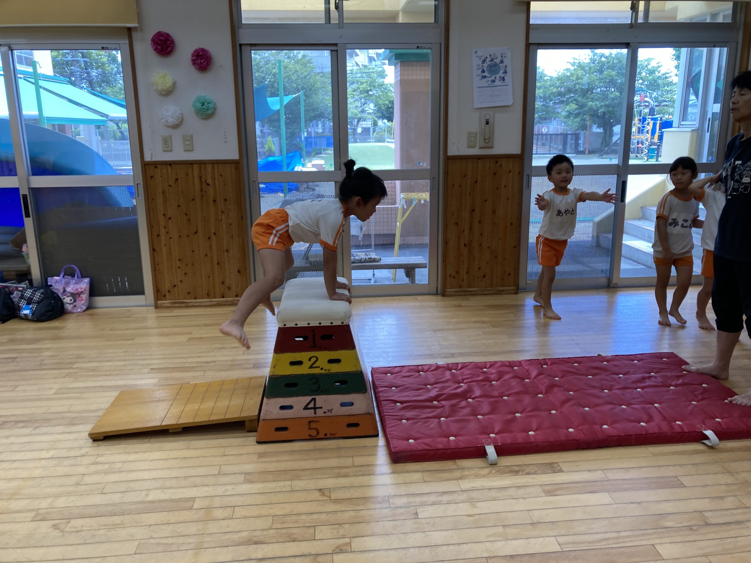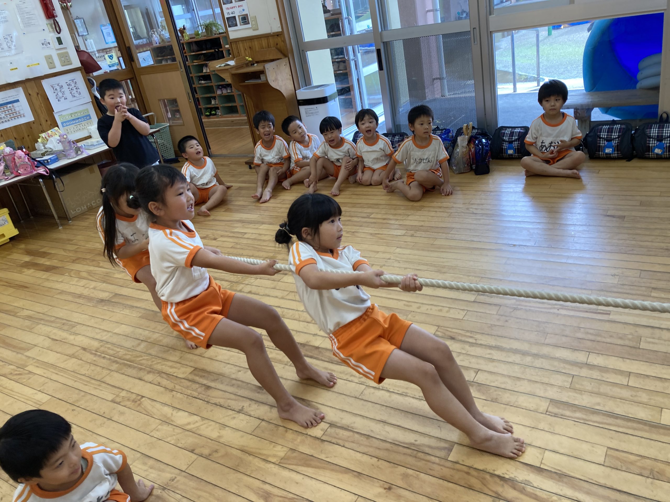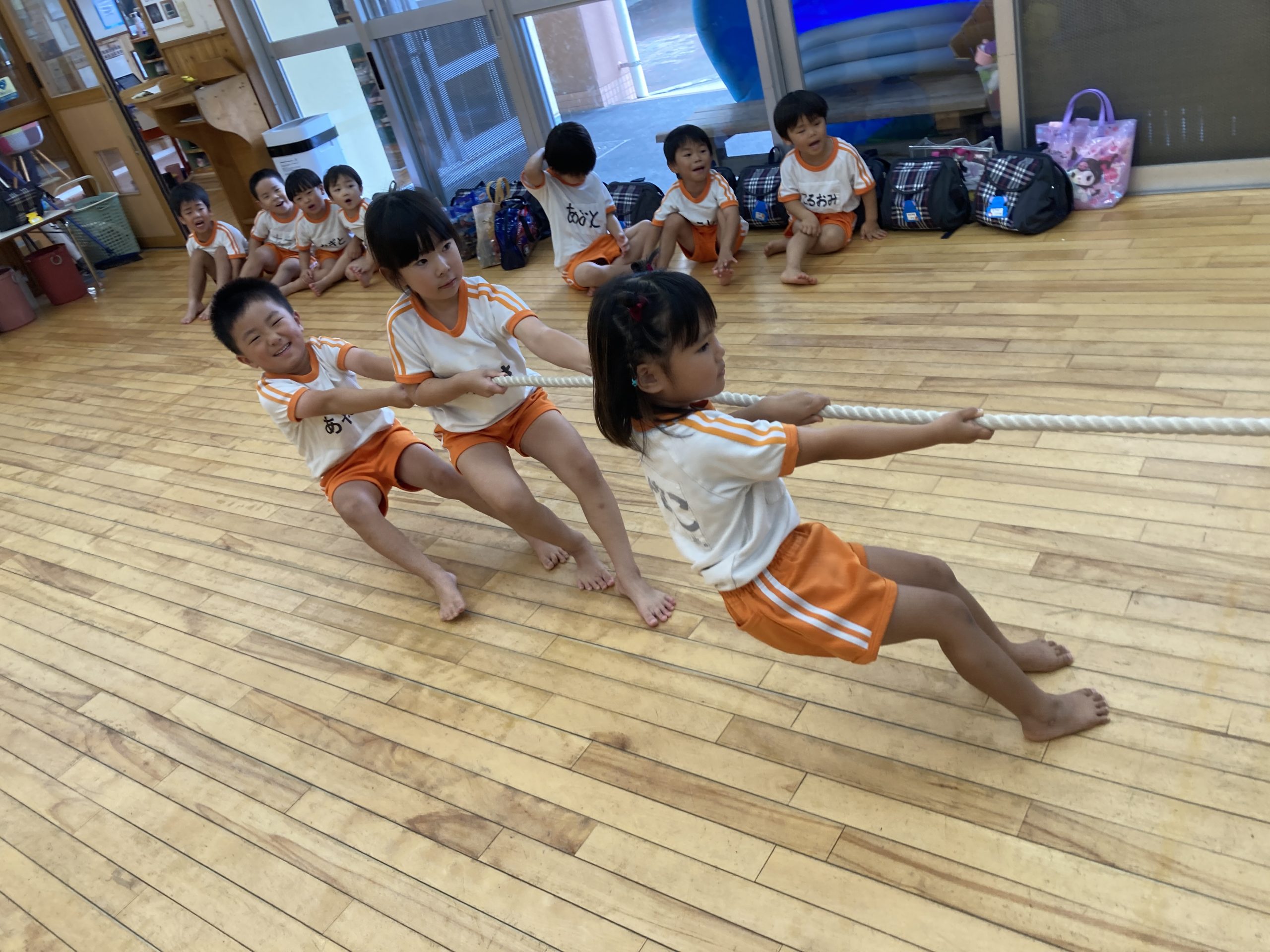 今日は、雨でプールに入らなかったのでホールで体育あそびをしました。跳び箱、ケンパ、綱引きをしました。綱引きはりすぐみさんとも戦って大盛り上がりでした!