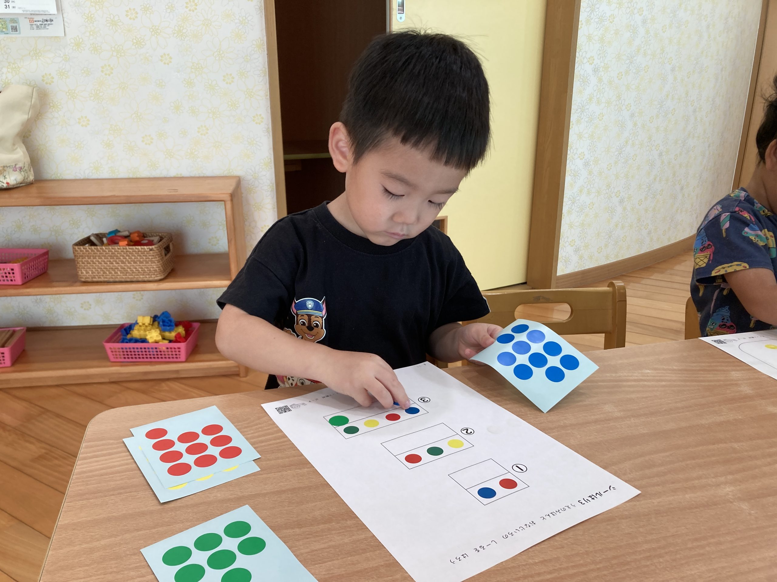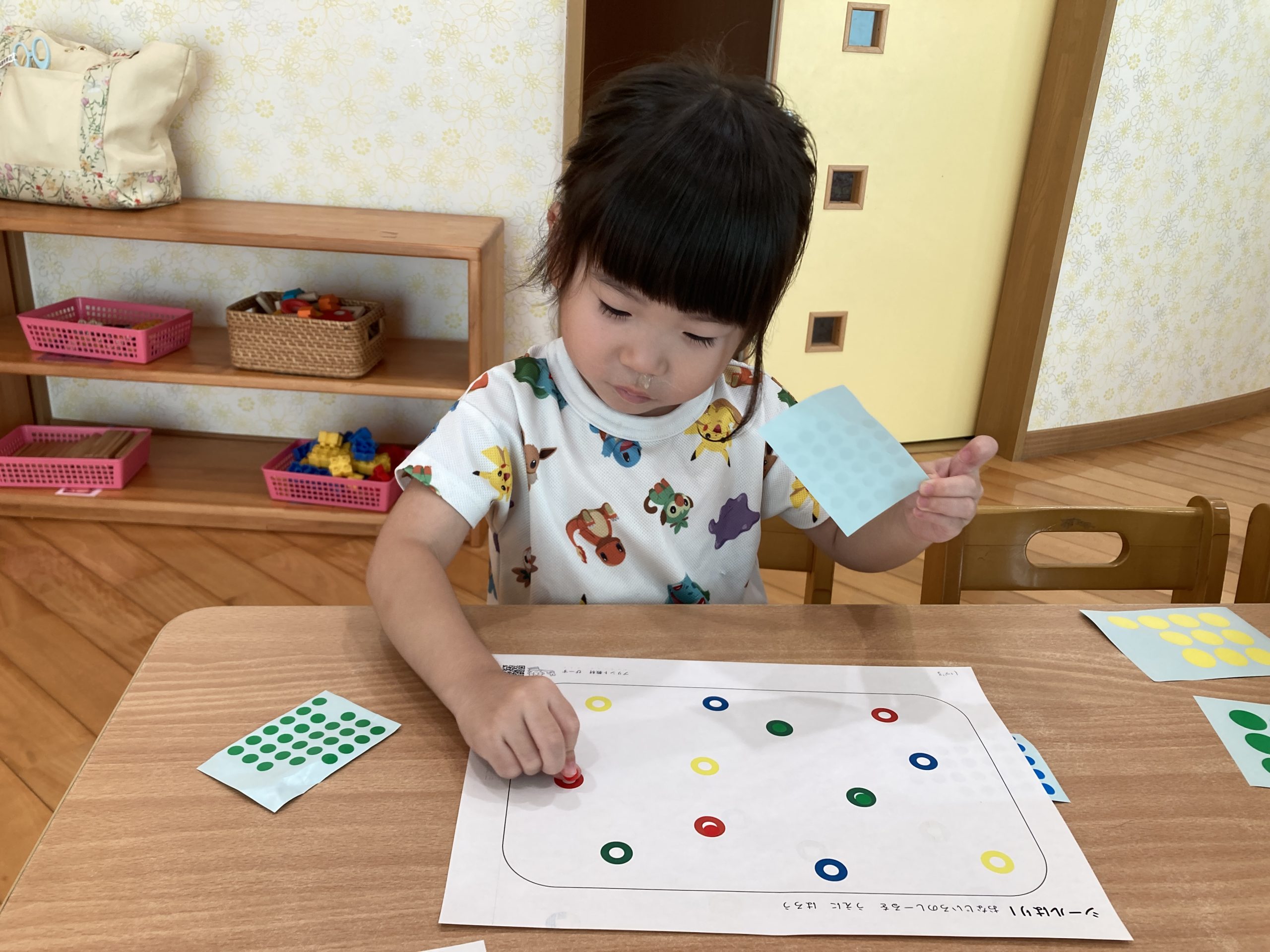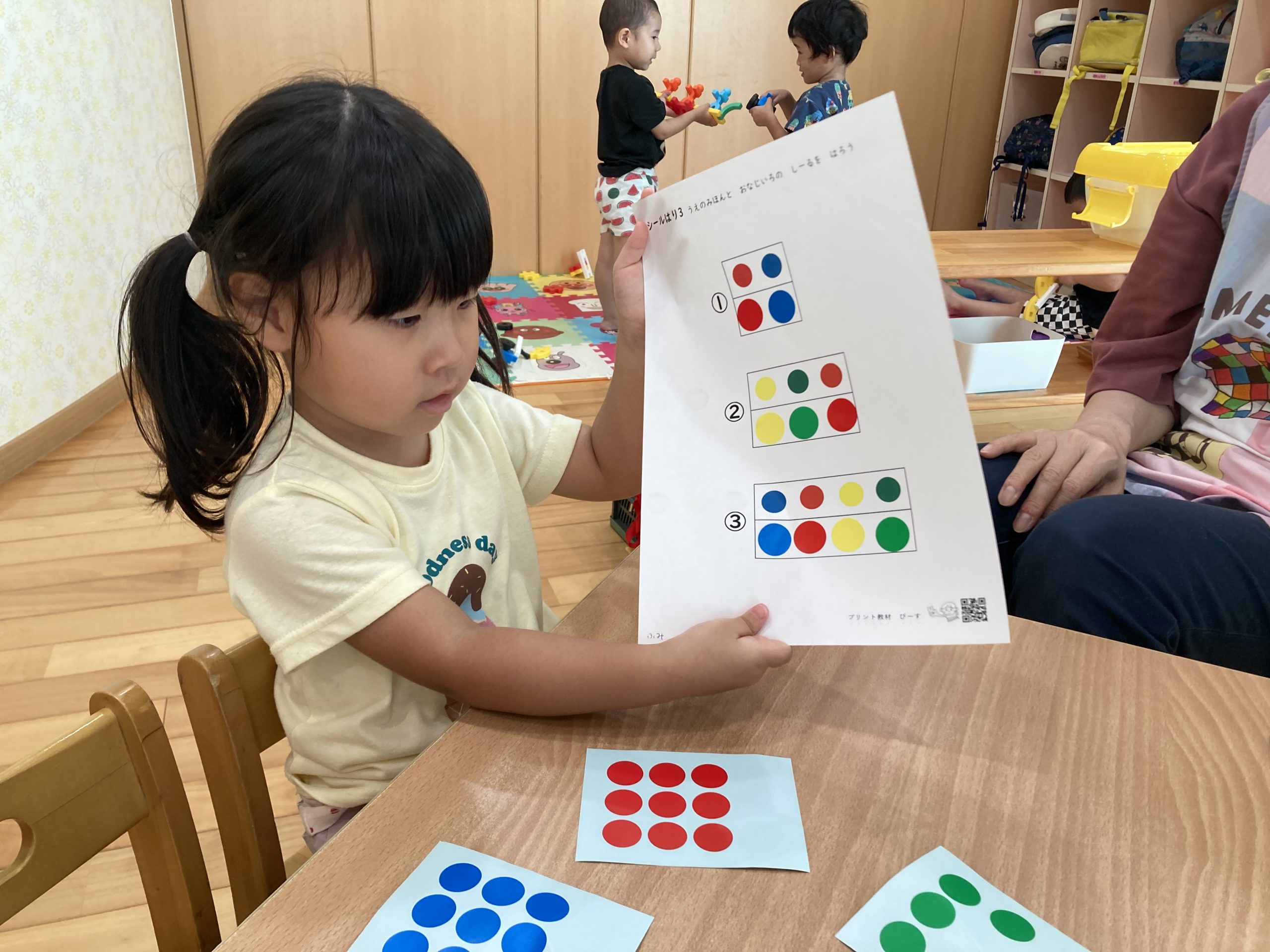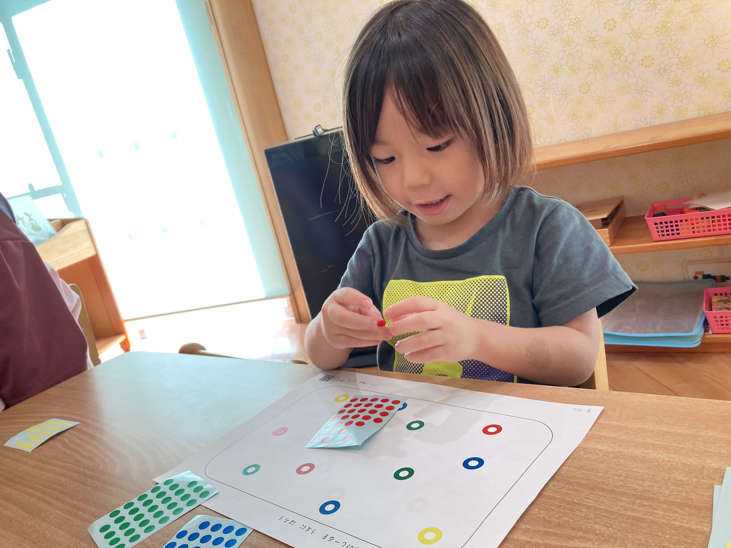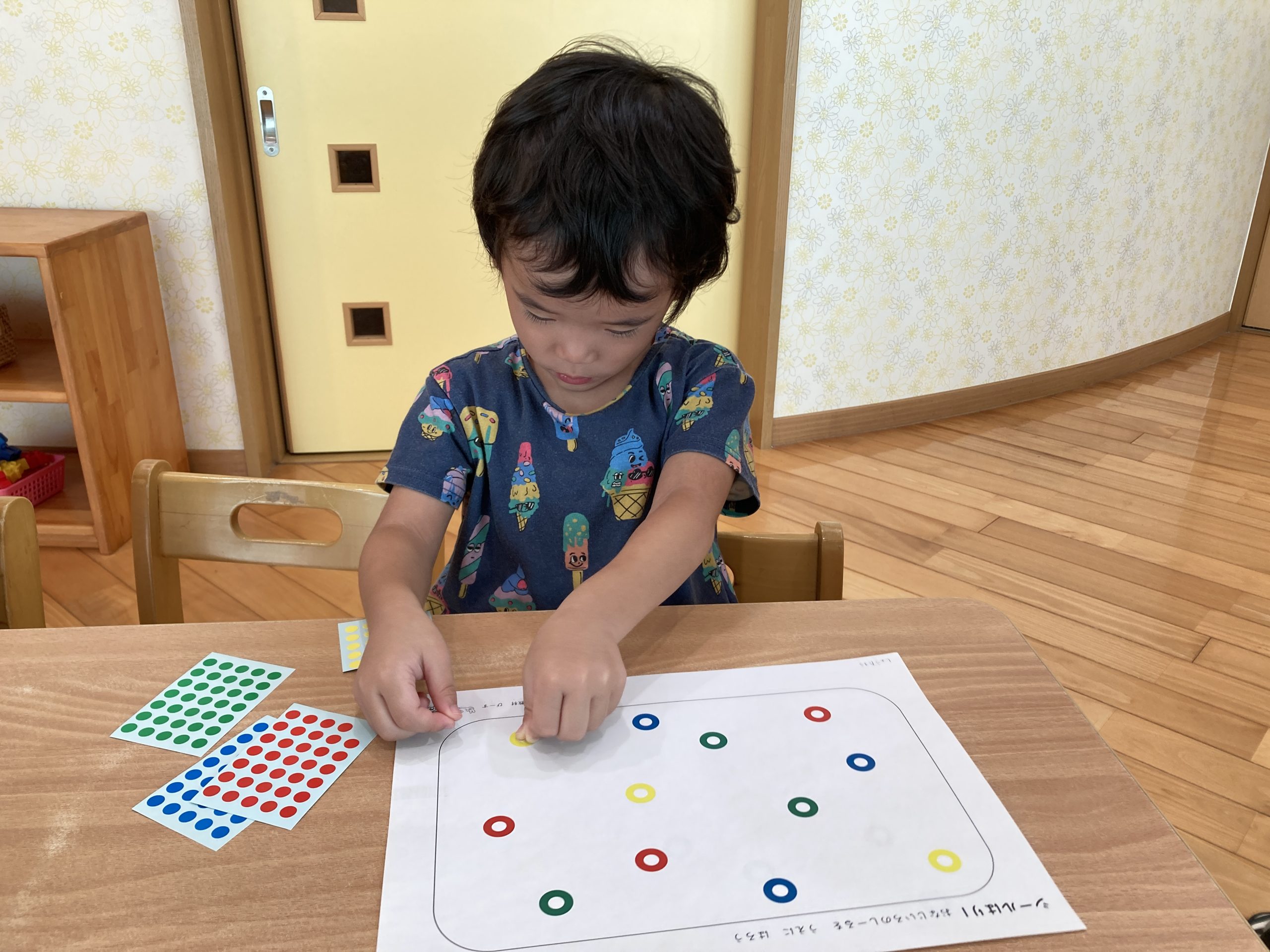 今日は、シール遊びをしました!同じ色のシールを貼ったり、見本を見て同じようにシールを貼ったりしました。みんな上手にシールを貼ることができていましたよ😊✨