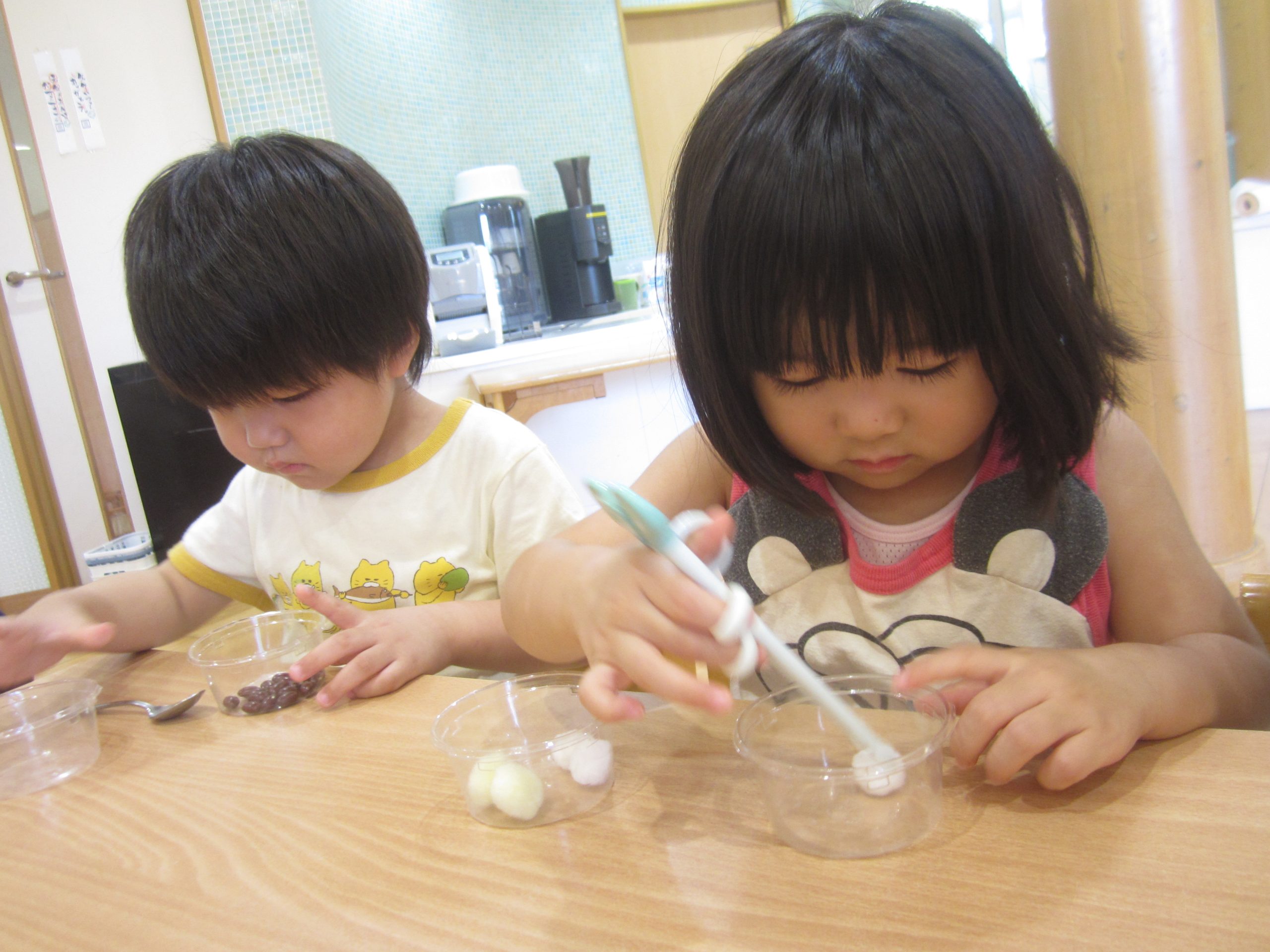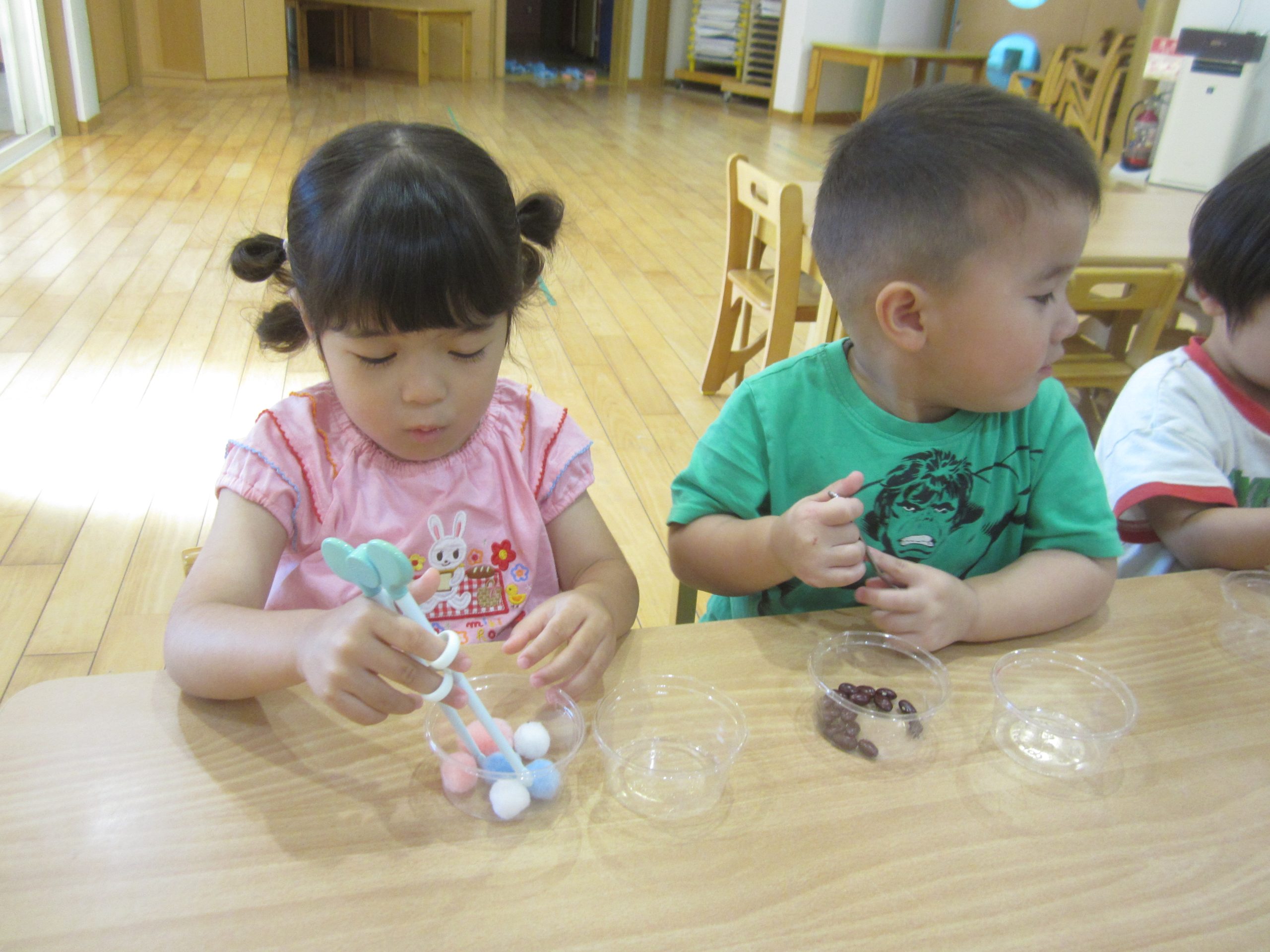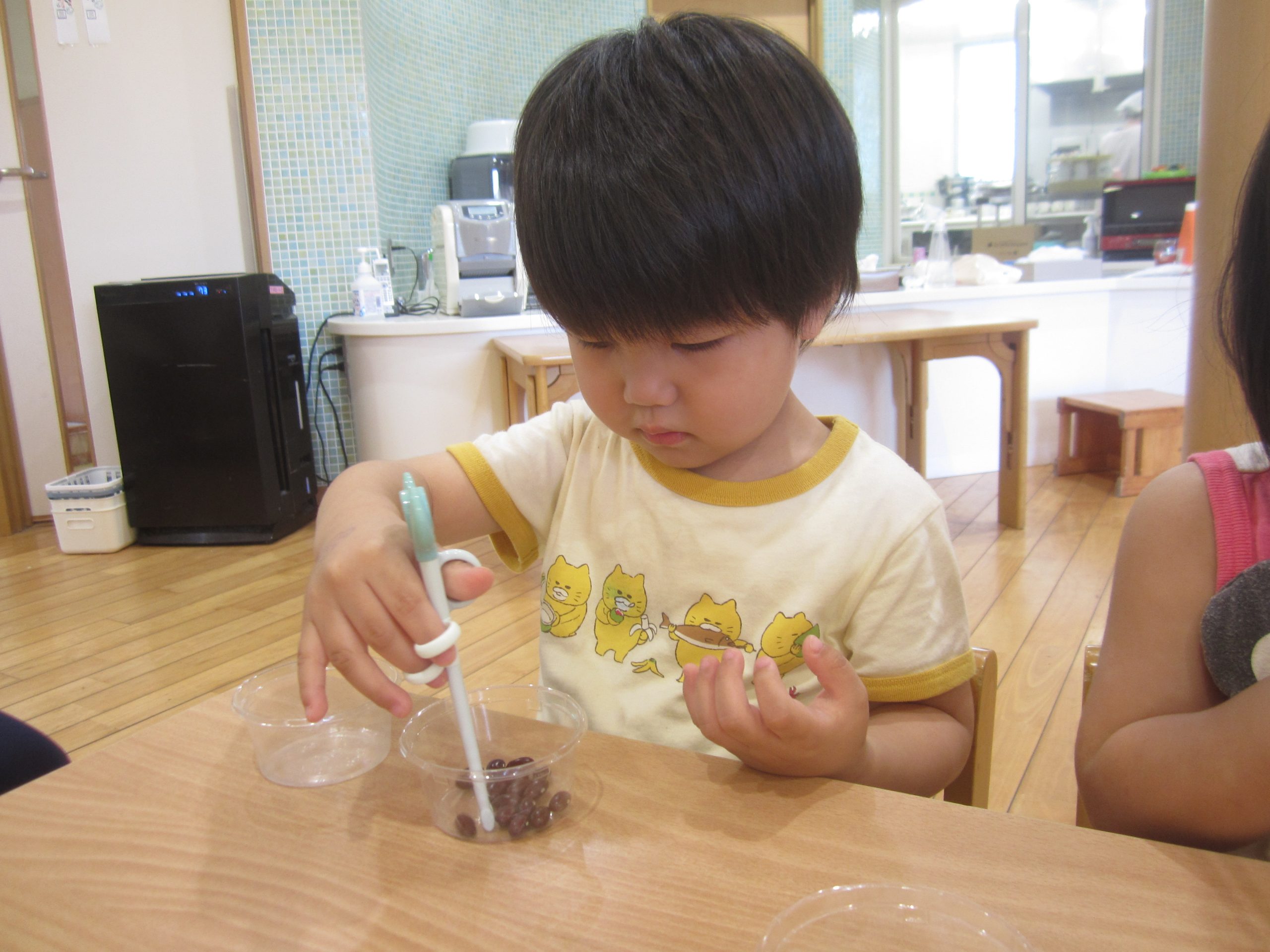 今日は、豆うつしをしました!スプーンやエジソン箸を使って上手に豆をうつすことができていましたよ✨