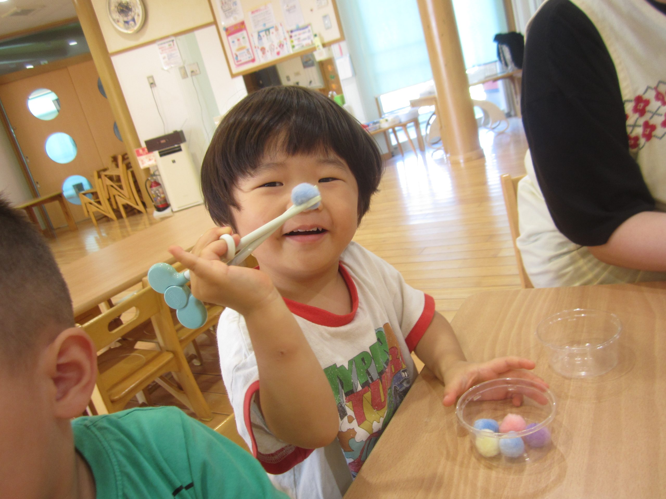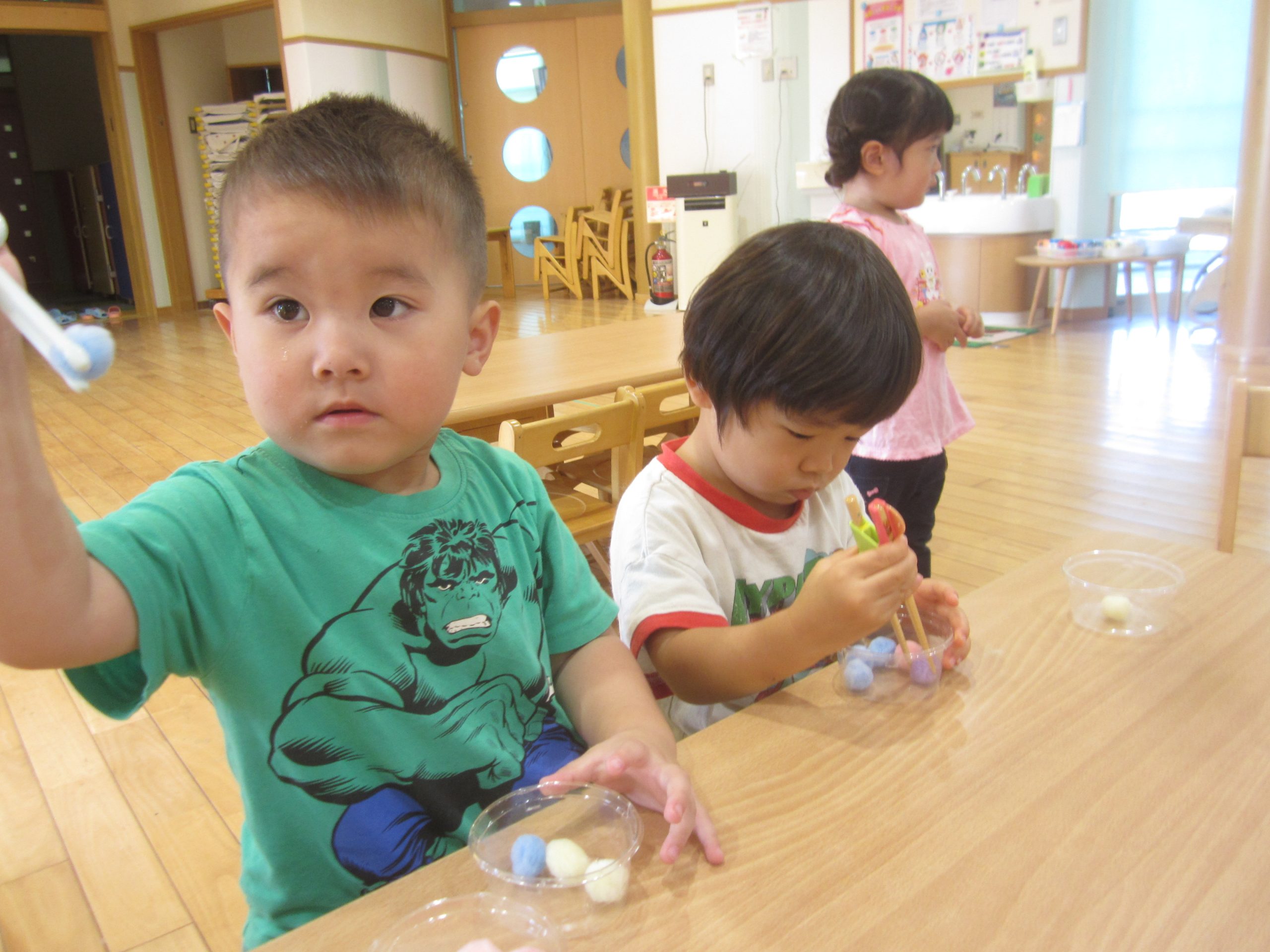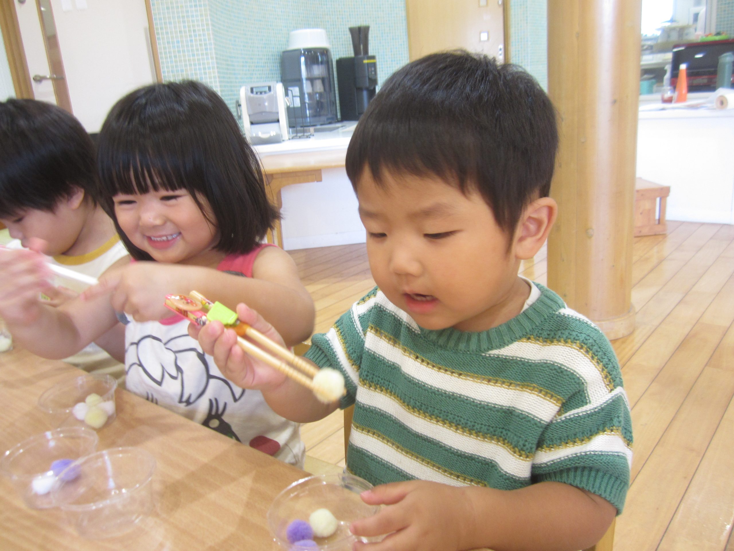 今日は、豆うつしをしました!スプーンやエジソン箸を使って上手に豆をうつすことができていましたよ✨