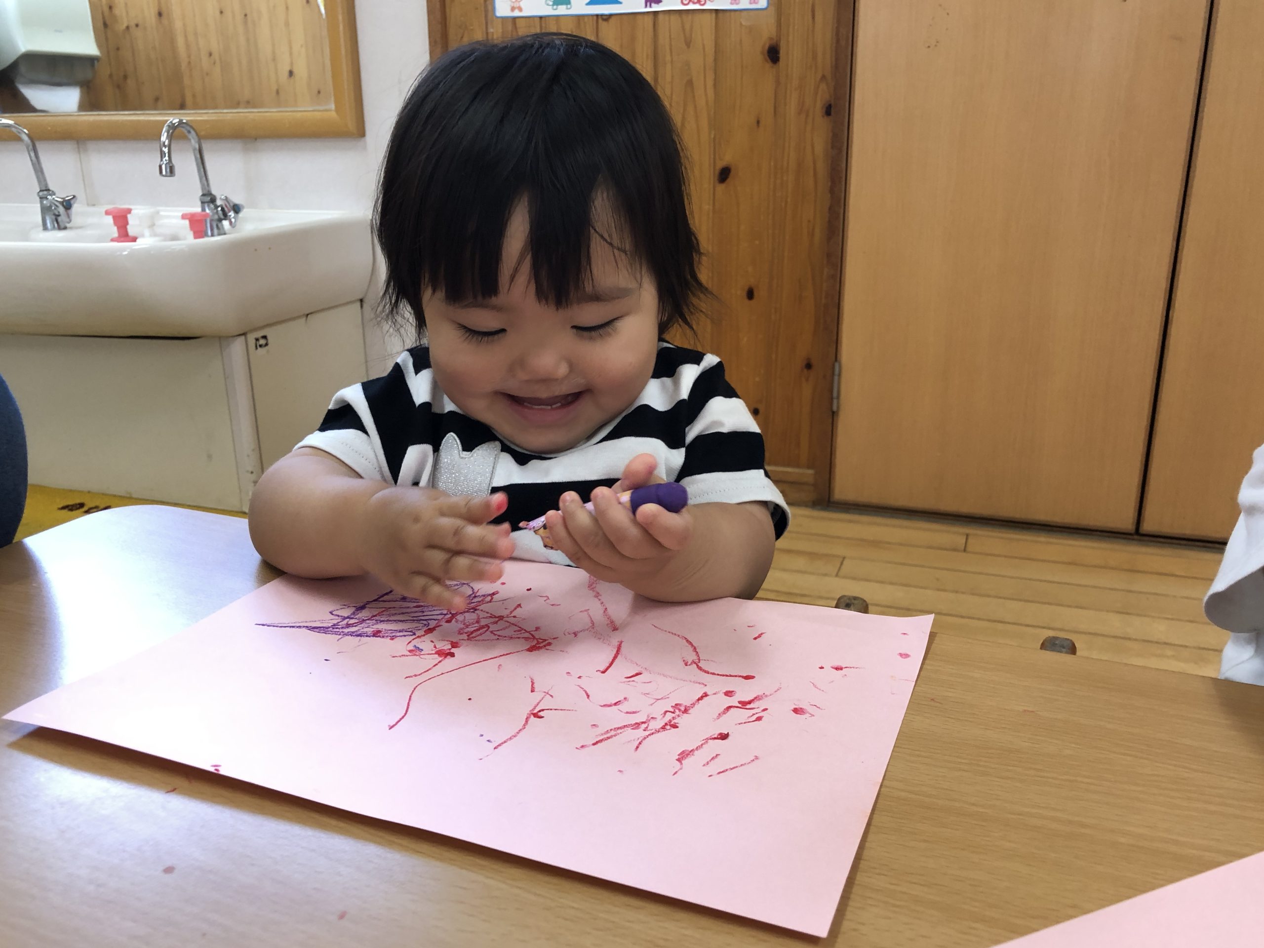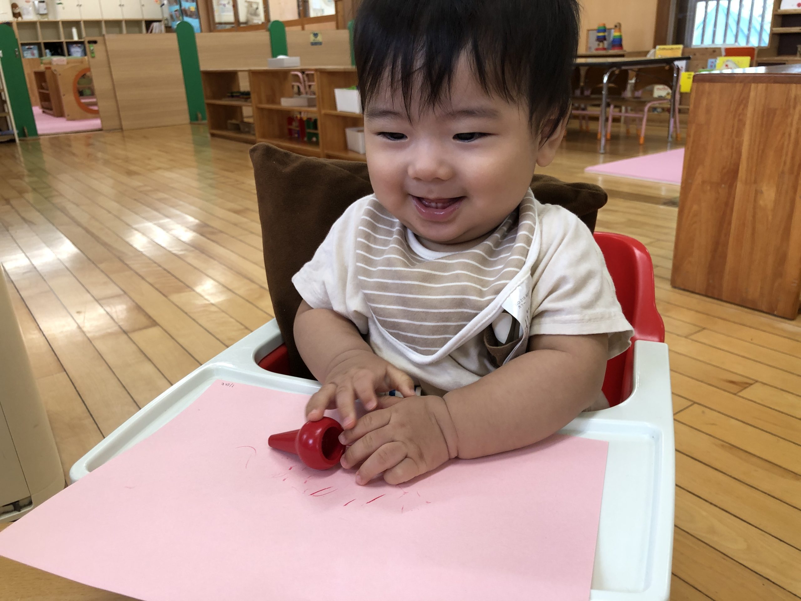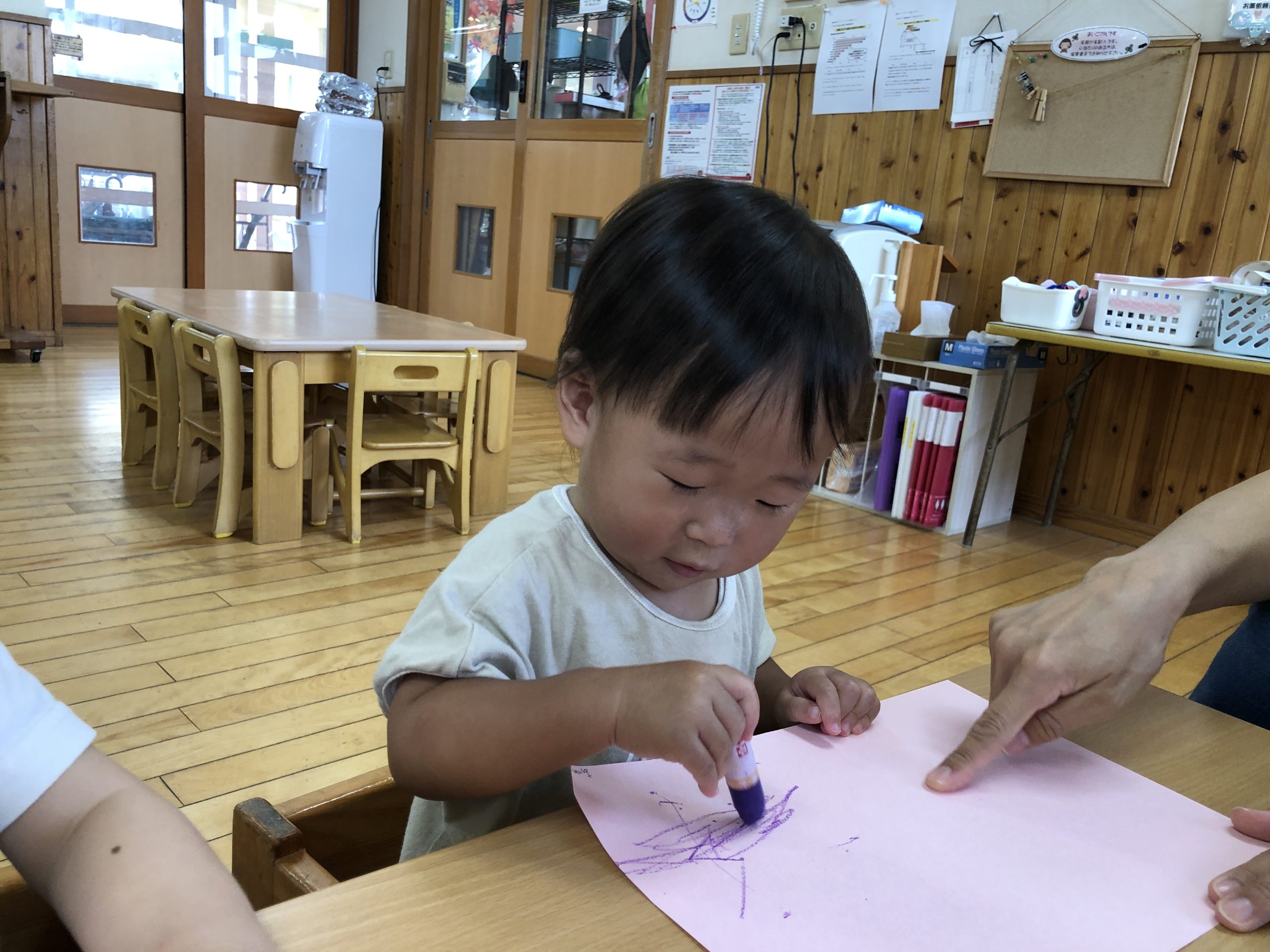 今日は、お絵描きあそびをしました。クレヨンでトントンと叩くようにしたり、腕を左右に動かして線を描いたりとなぐり描きを楽しんでいましたよ☆彡後半は、ホールでリズムやボールあそびをして過ごしました。
