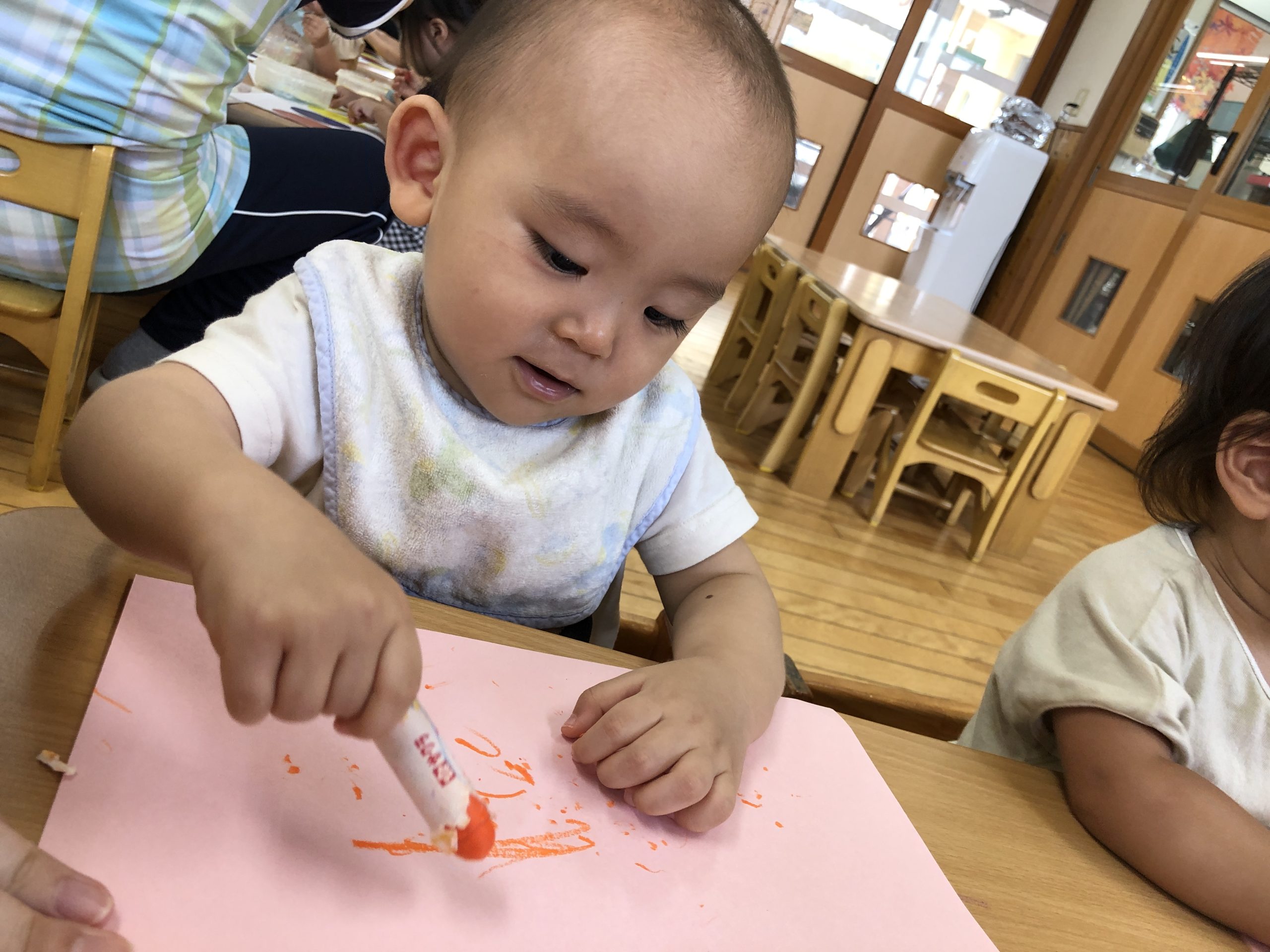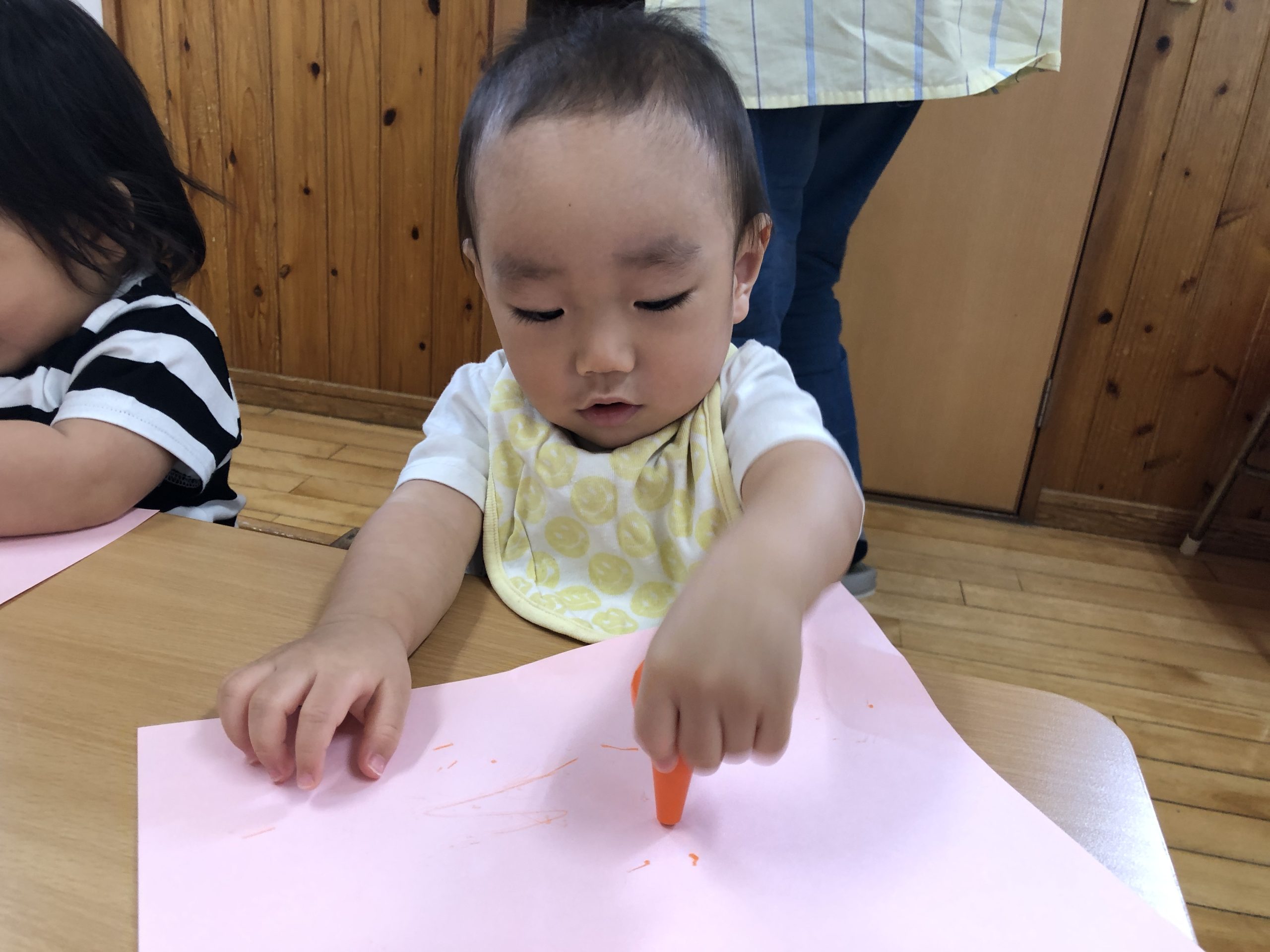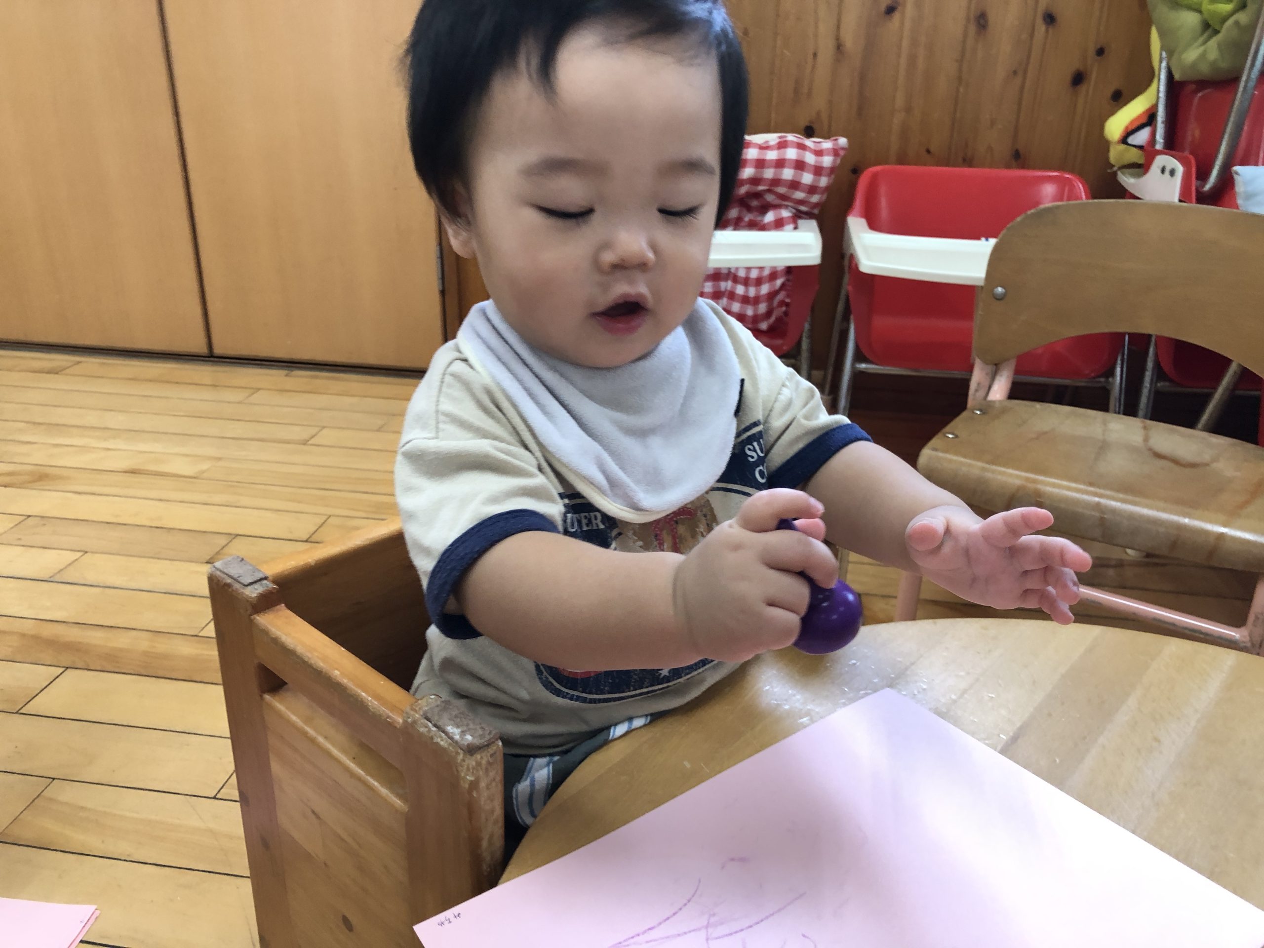 今日は、お絵描きあそびをしました。クレヨンでトントンと叩くようにしたり、腕を左右に動かして線を描いたりとなぐり描きを楽しんでいましたよ☆彡後半は、ホールでリズムやボールあそびをして過ごしました。