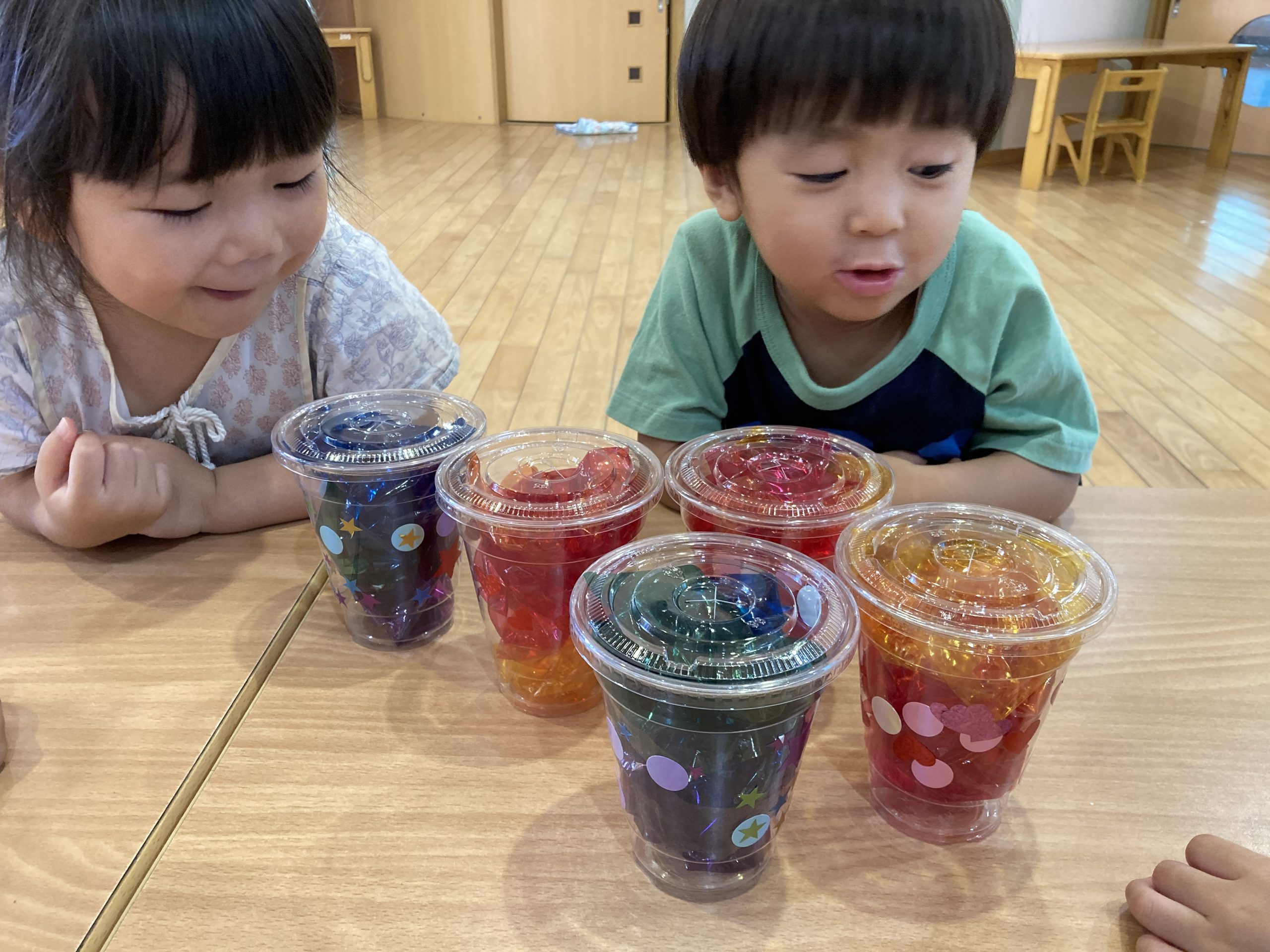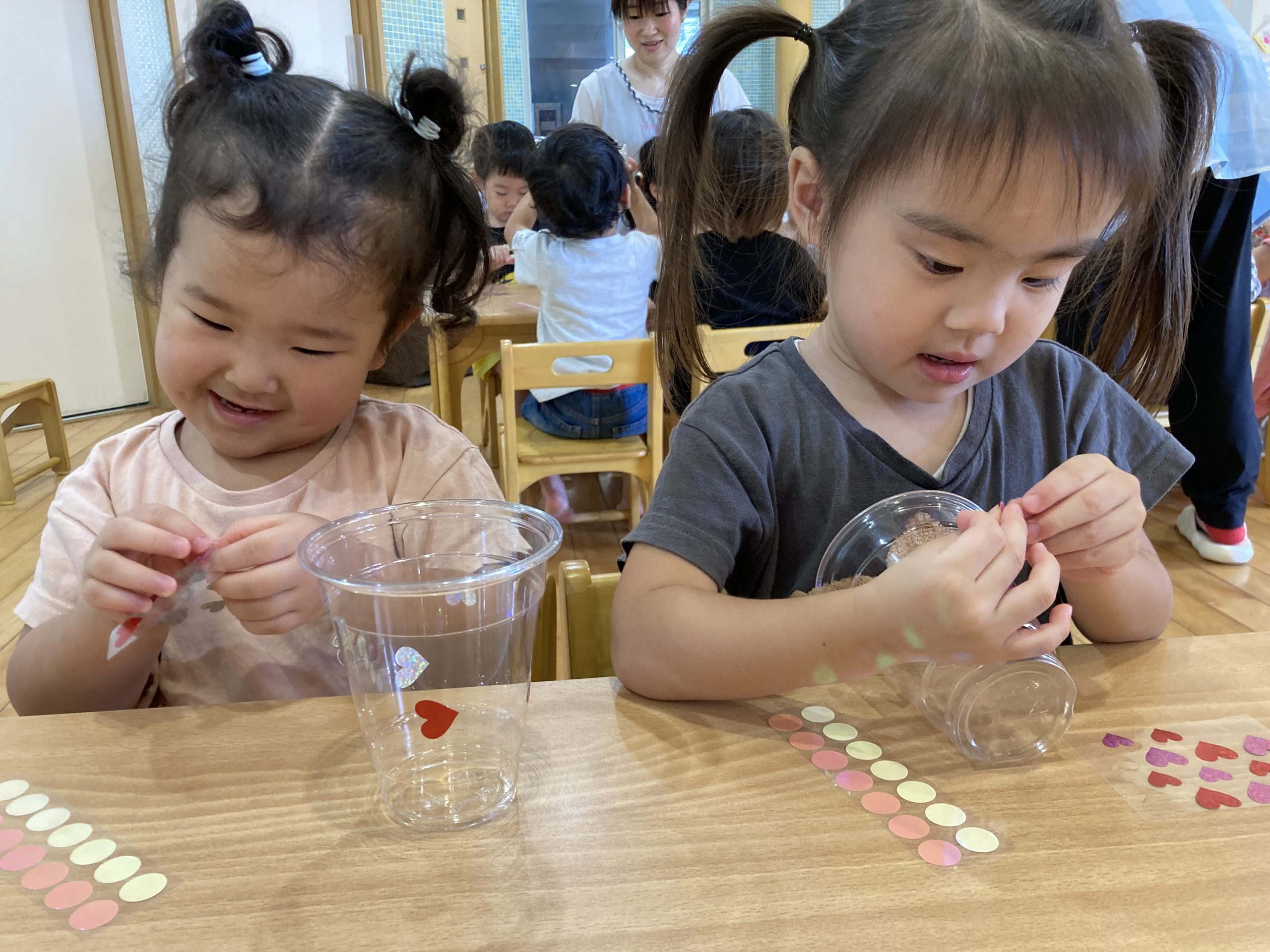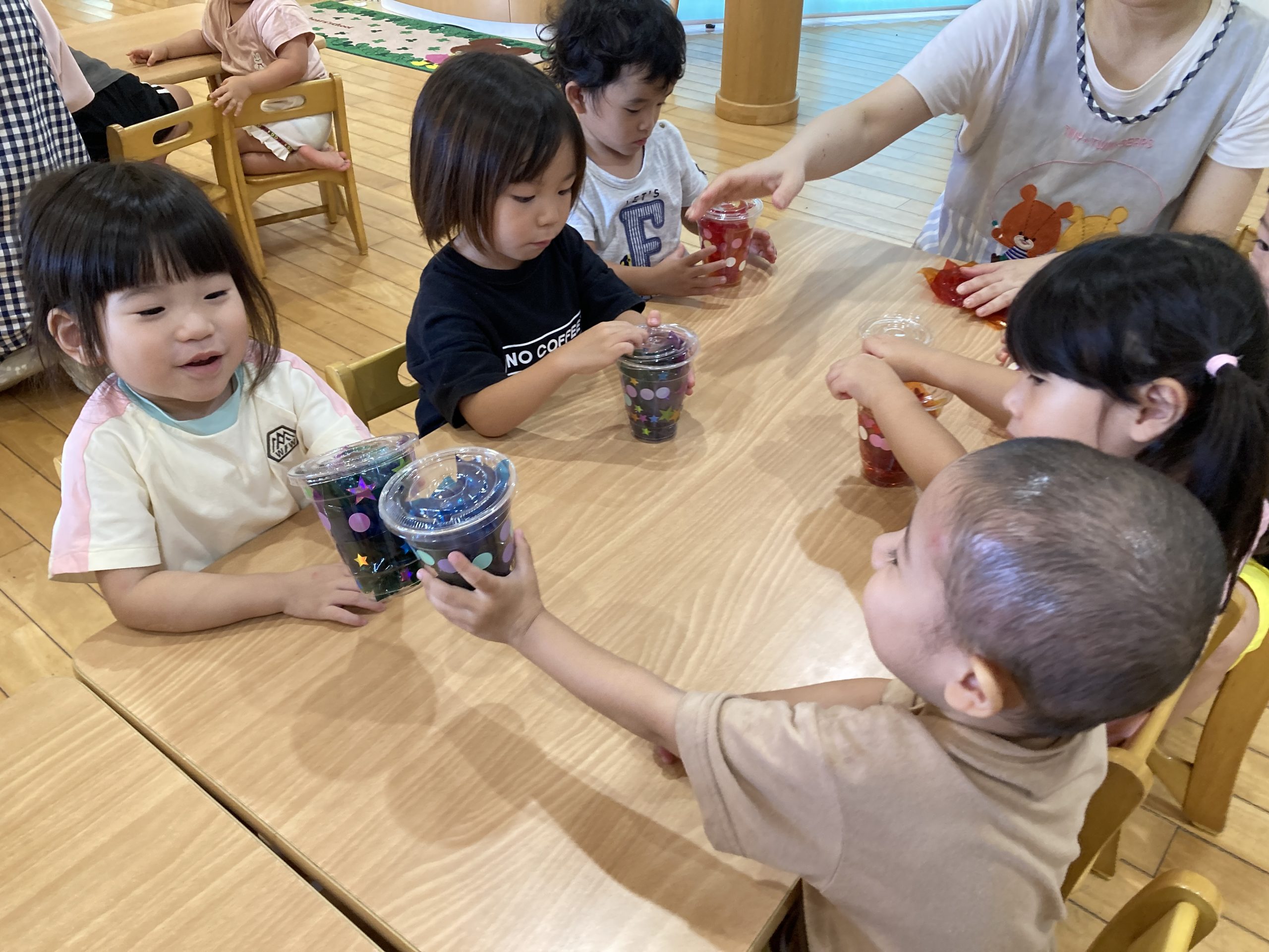 今日は、秋祭りごっこで使う商品のジュース作りに挑戦しました🍹💖青系と赤系のシールをそれぞれ選びながら、可愛いジュースが出来上がりましたよ⭐️