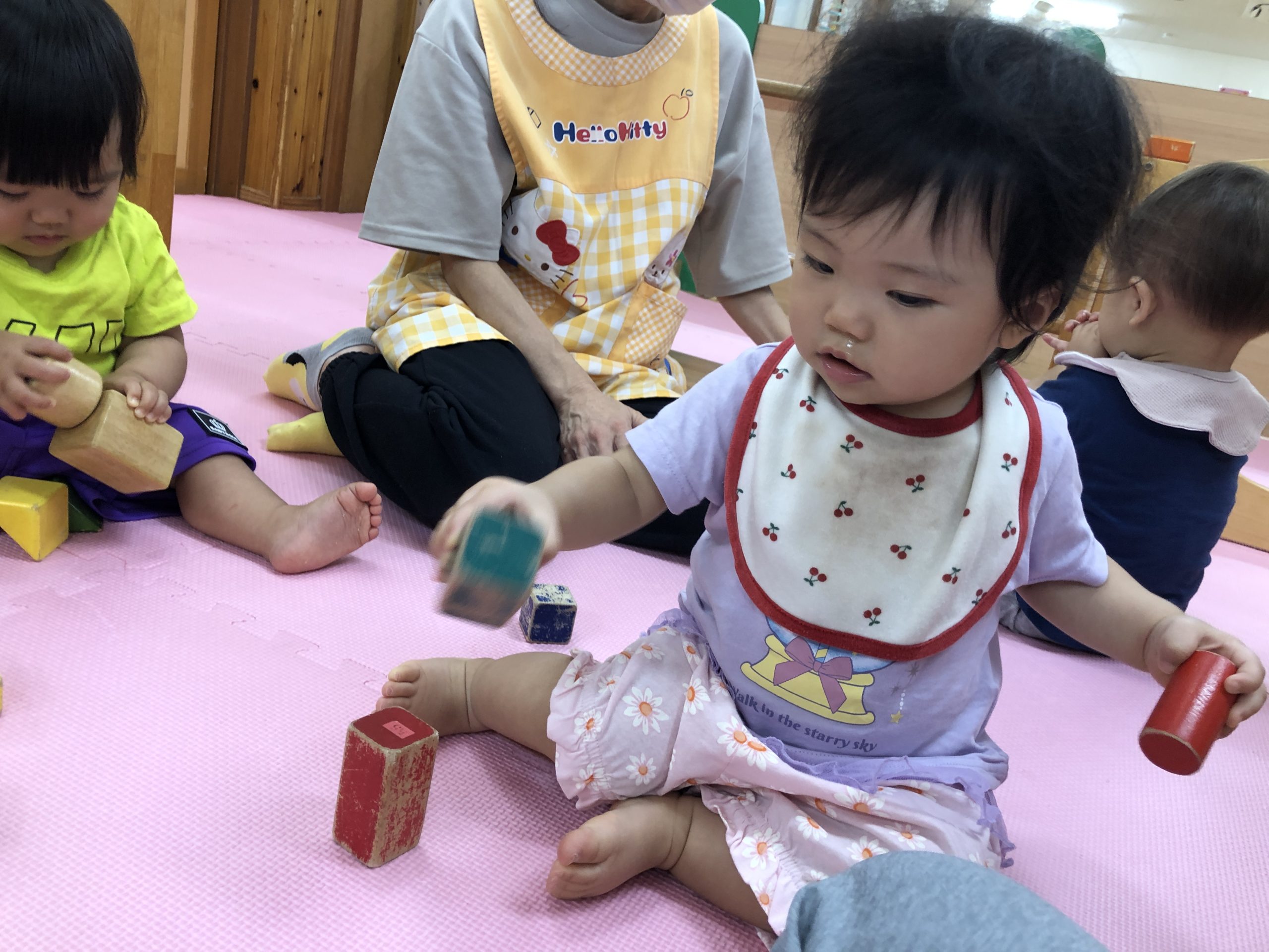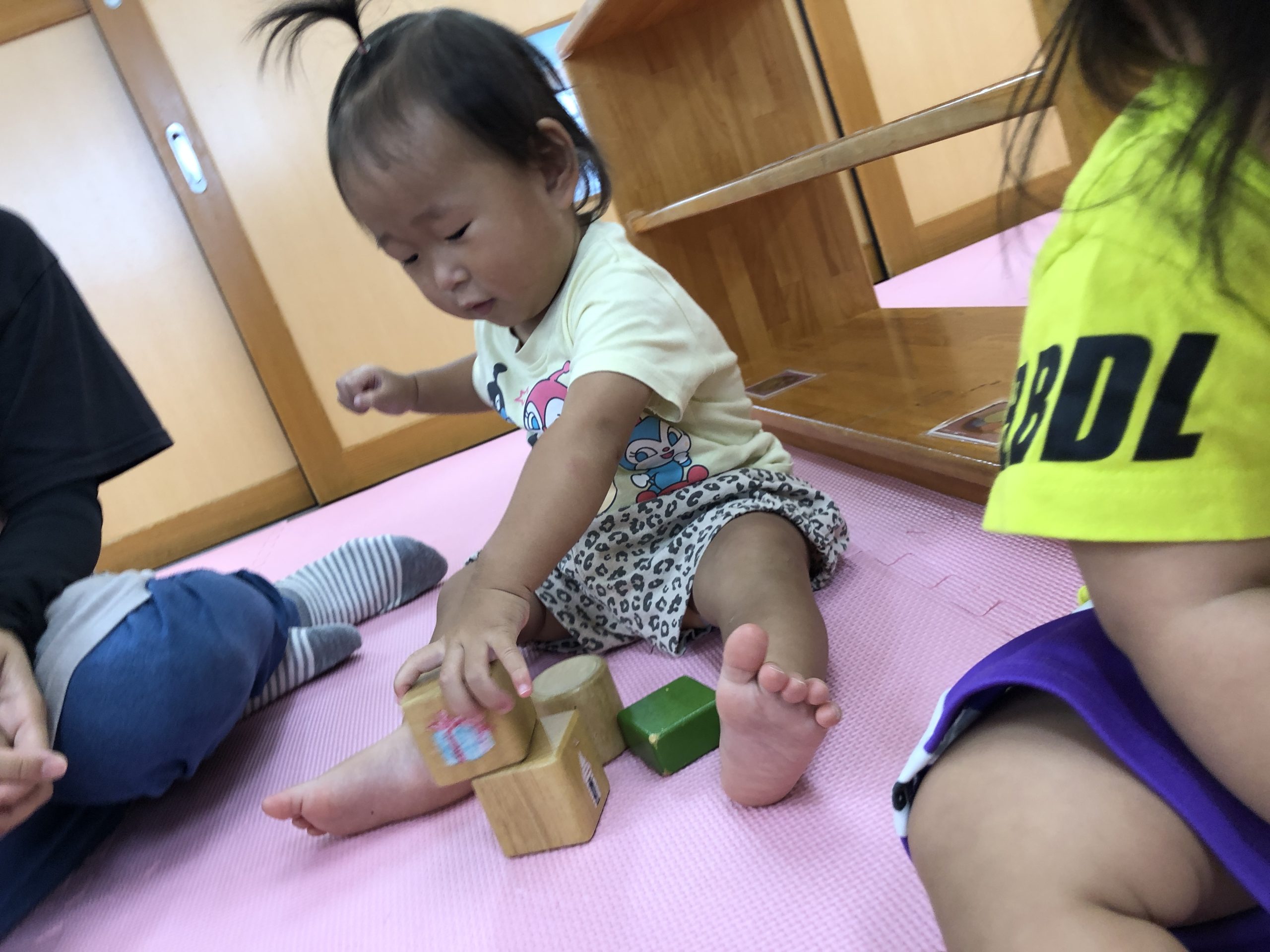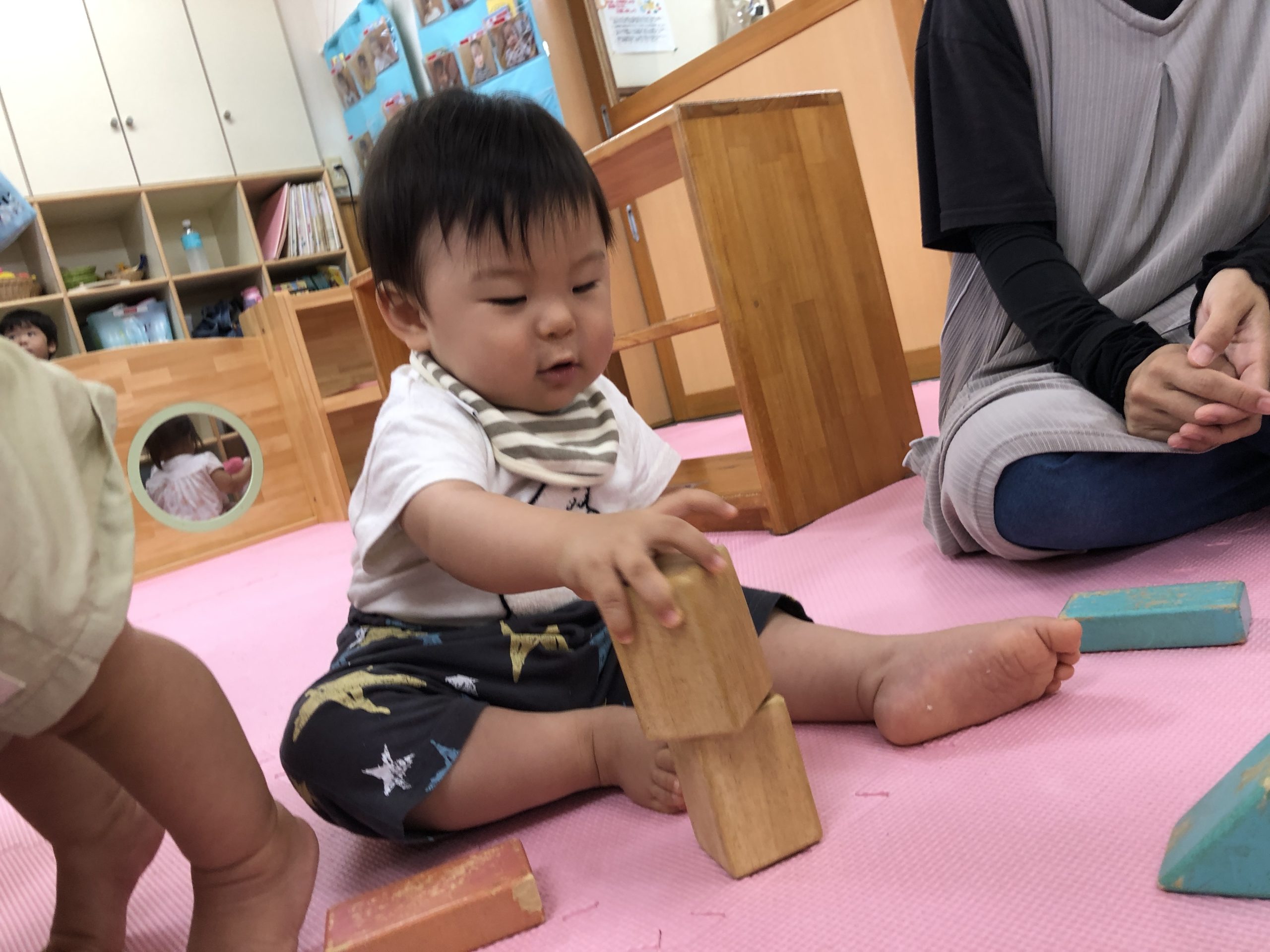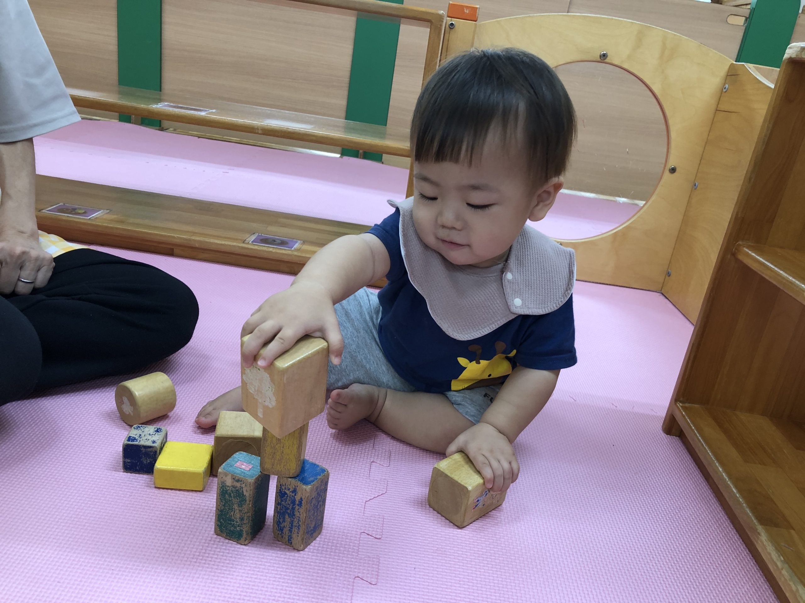 今日は、積み木あそびをしました。大きな積み木や小さな積み木を1〜2個重ねてみたり、取ってみたり😄かち合わせて音を楽しんでいましたよ♫