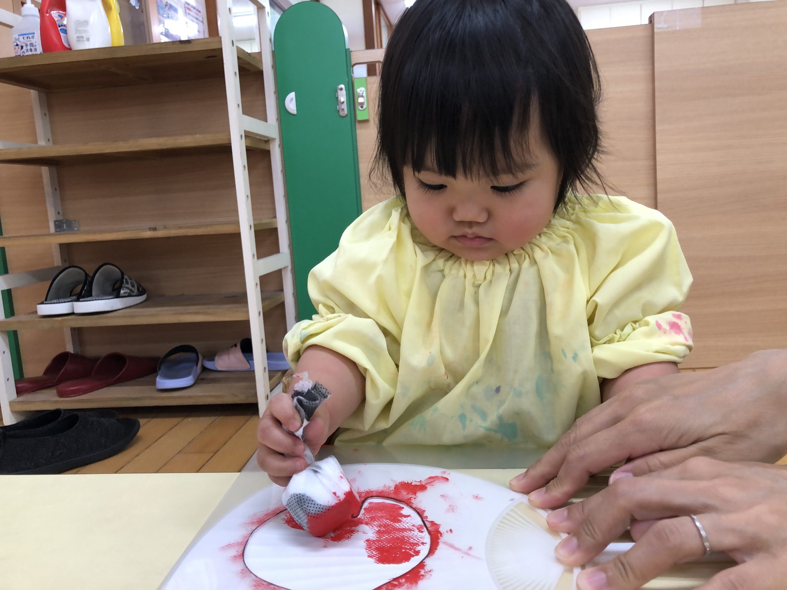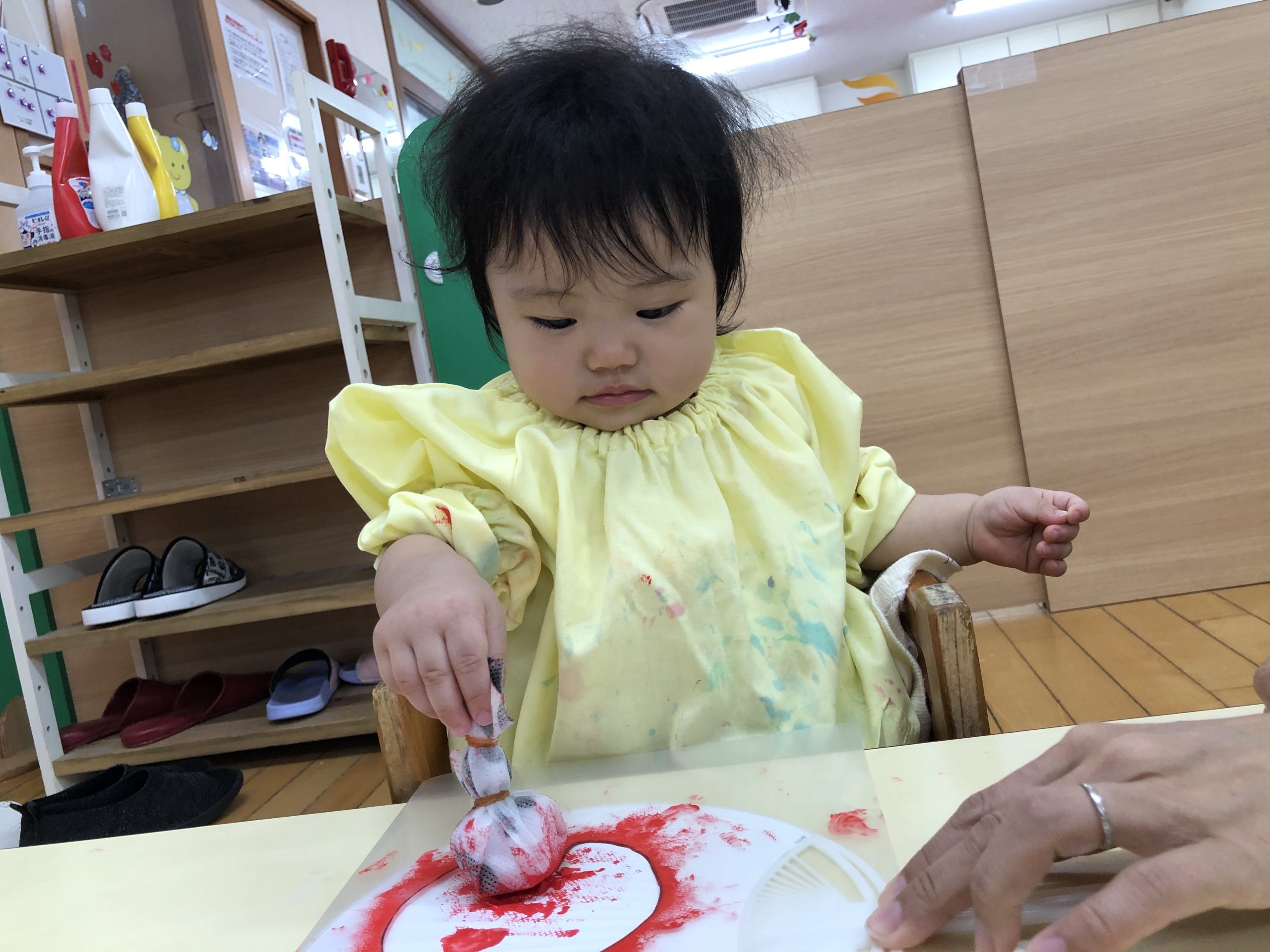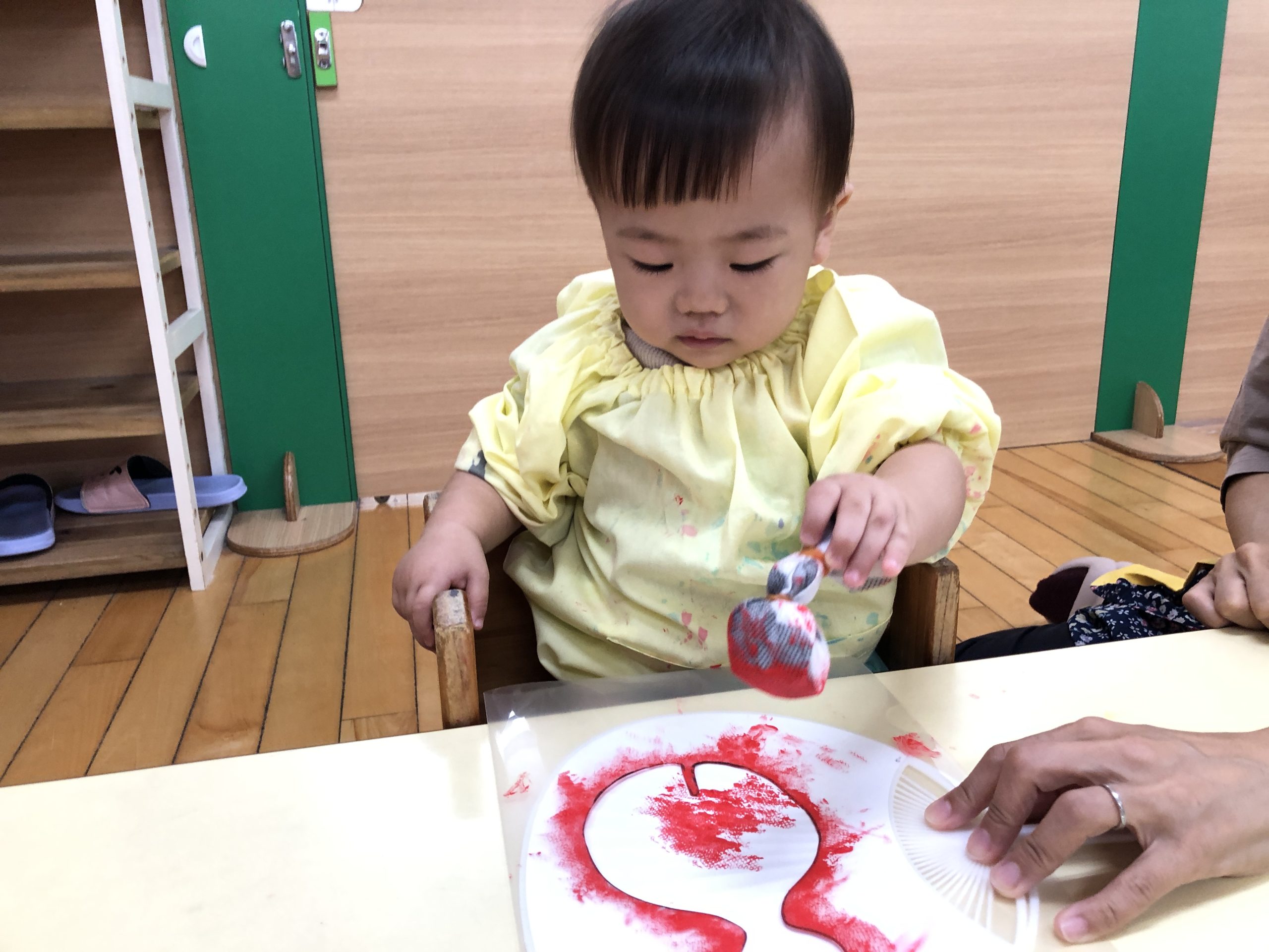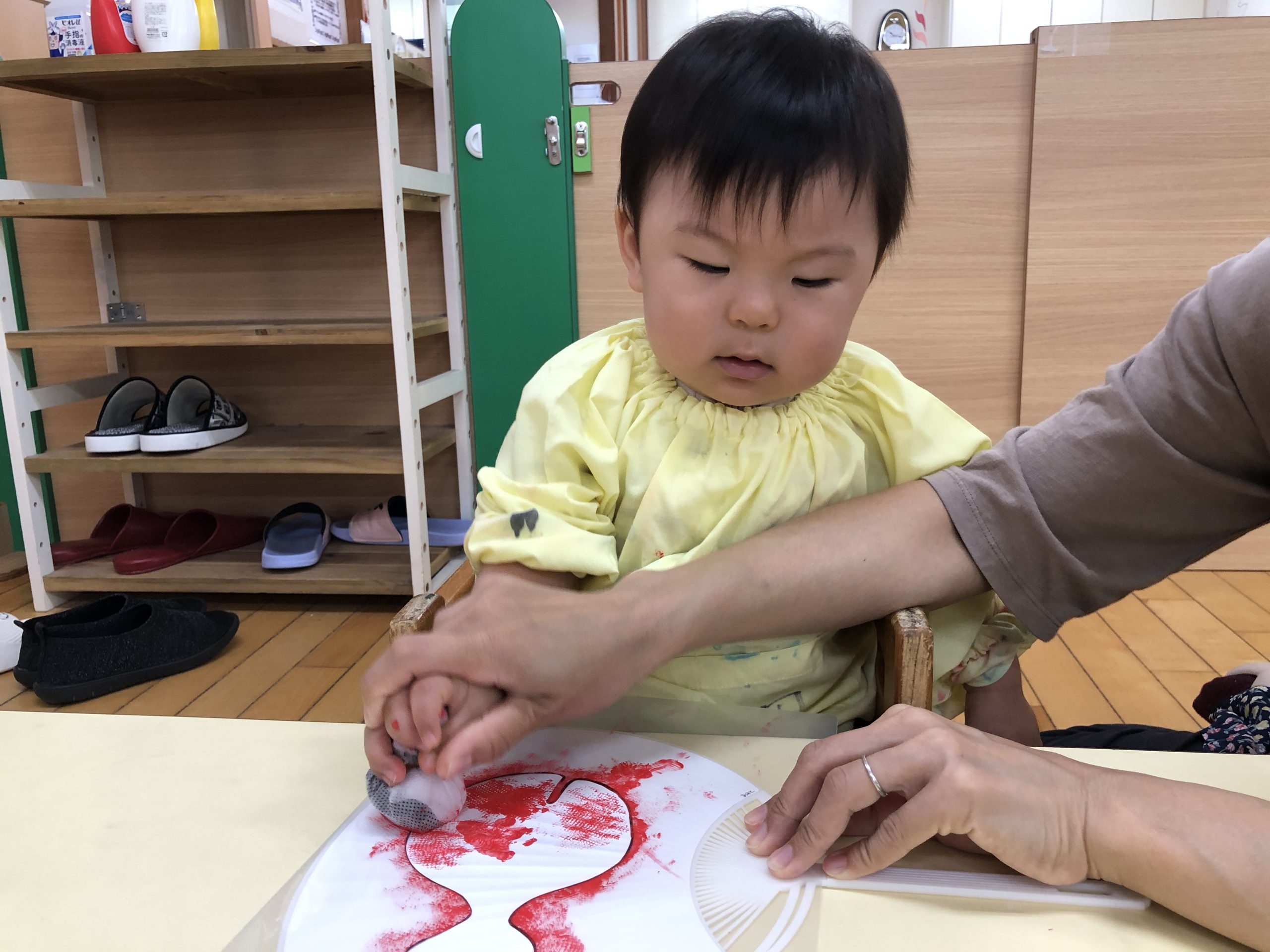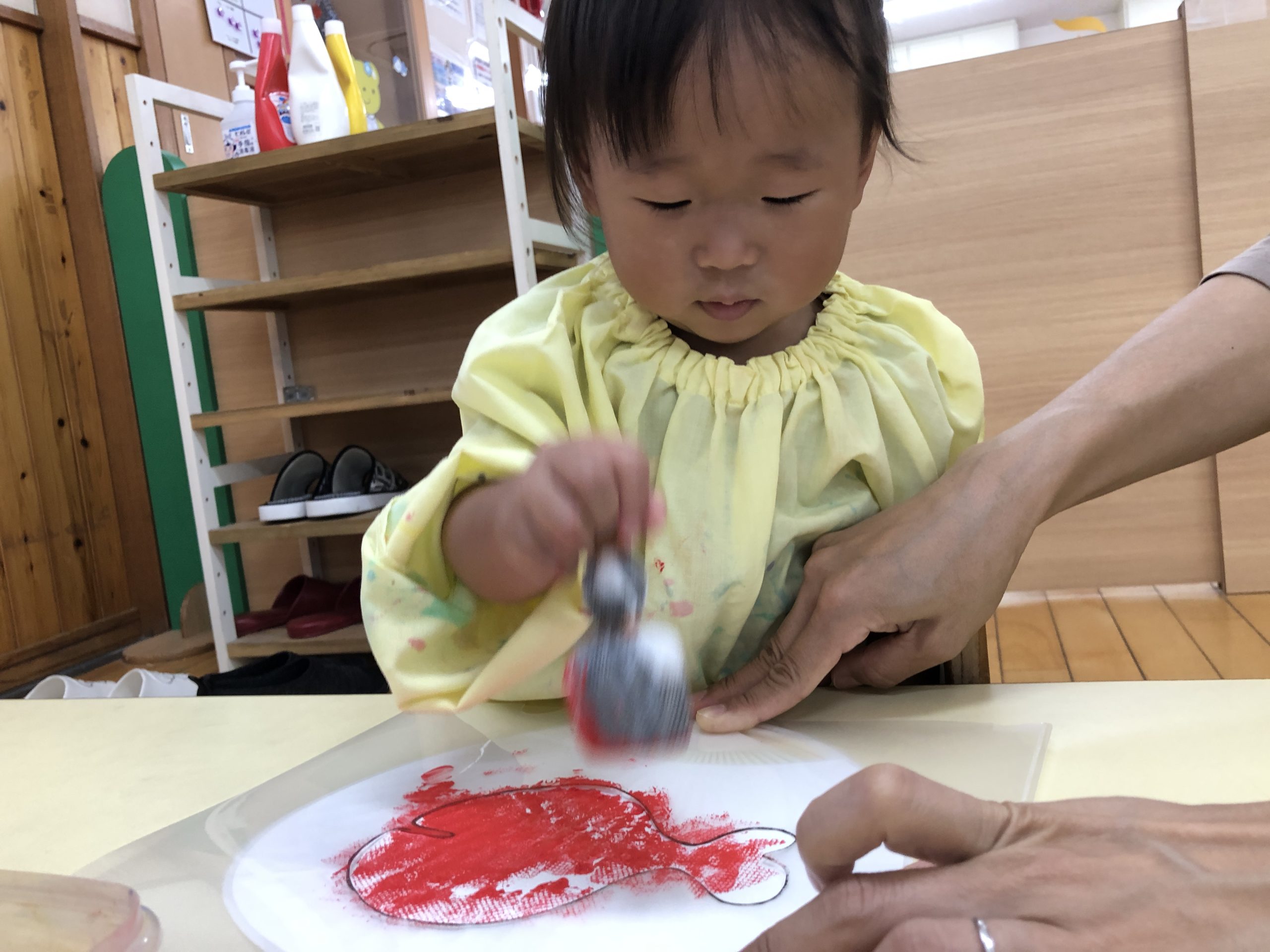 今日は、スタンプあそびをしました。ポンポンに絵の具をつけてうちわに“きんぎょ”、画用紙に“おつきみ”をつくりました🎶型枠の中を「ぽんぽん♪」と押して色付けしましたよ☆彡