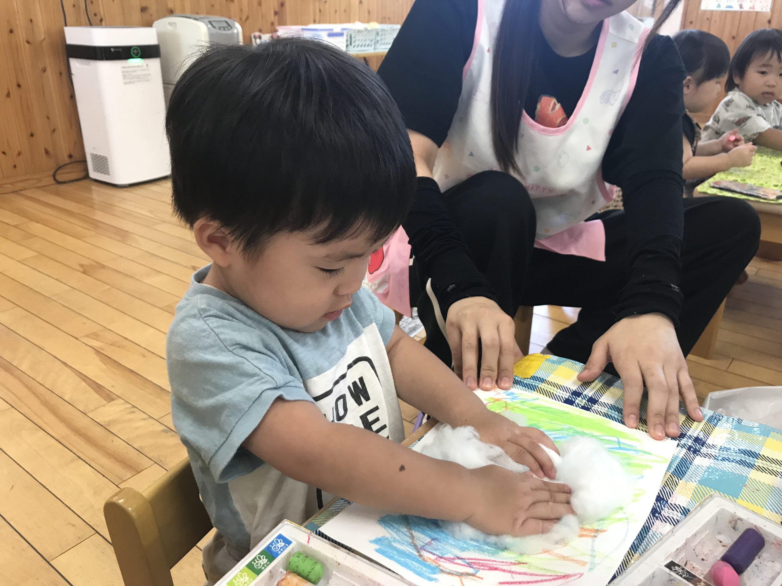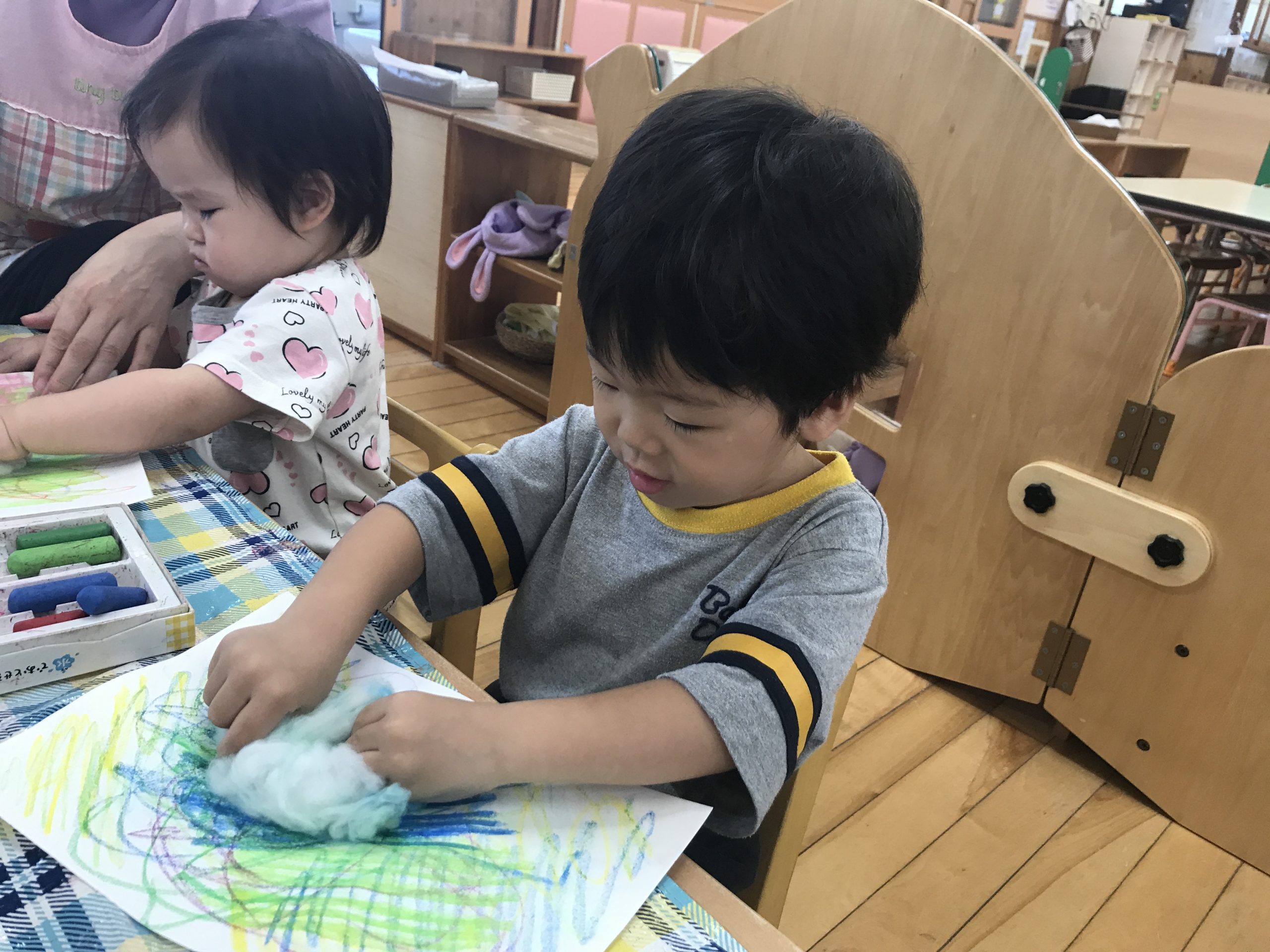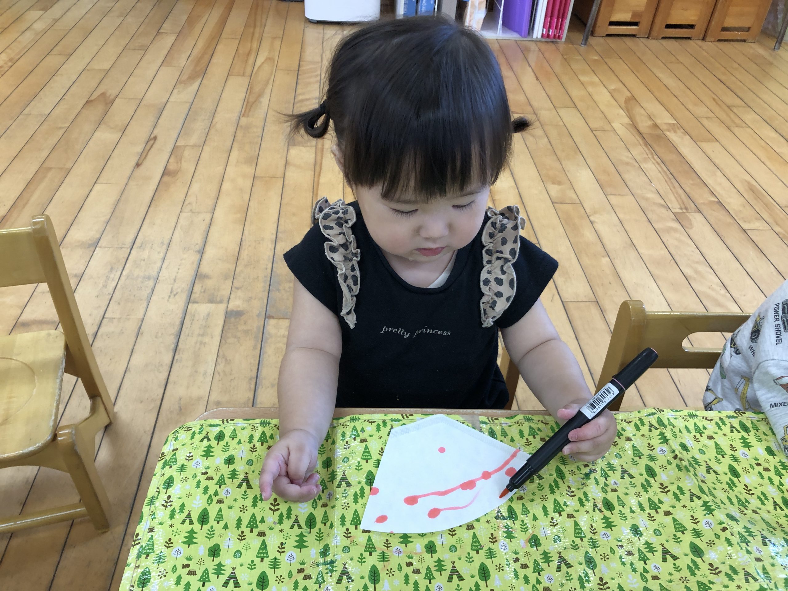 今日は秋祭りごっこの商品の製作をしました!コーヒーフィルターでにじみ絵をしたり、お絵描きをして綿をこすって色をつけたりしましたよ🎵