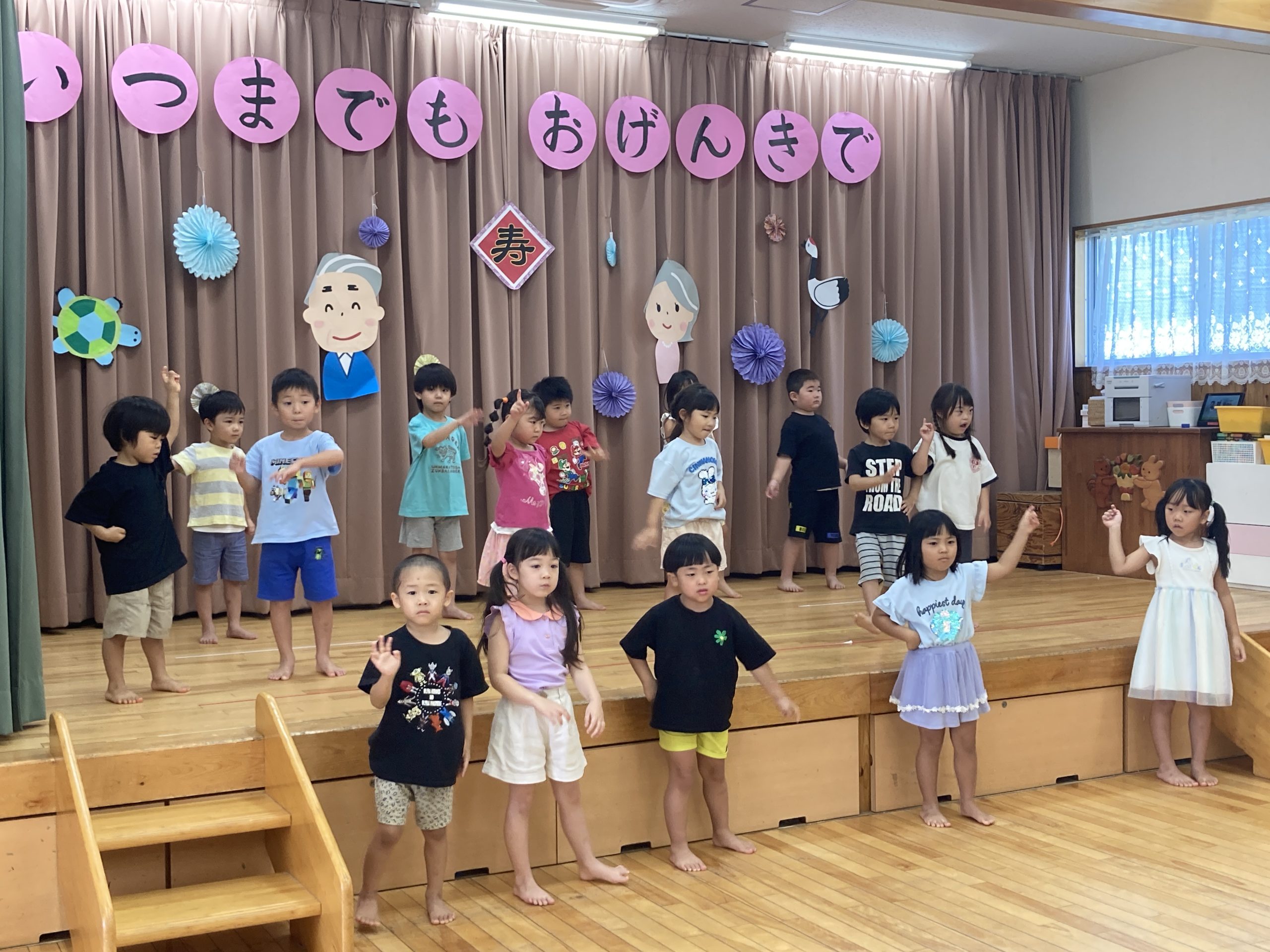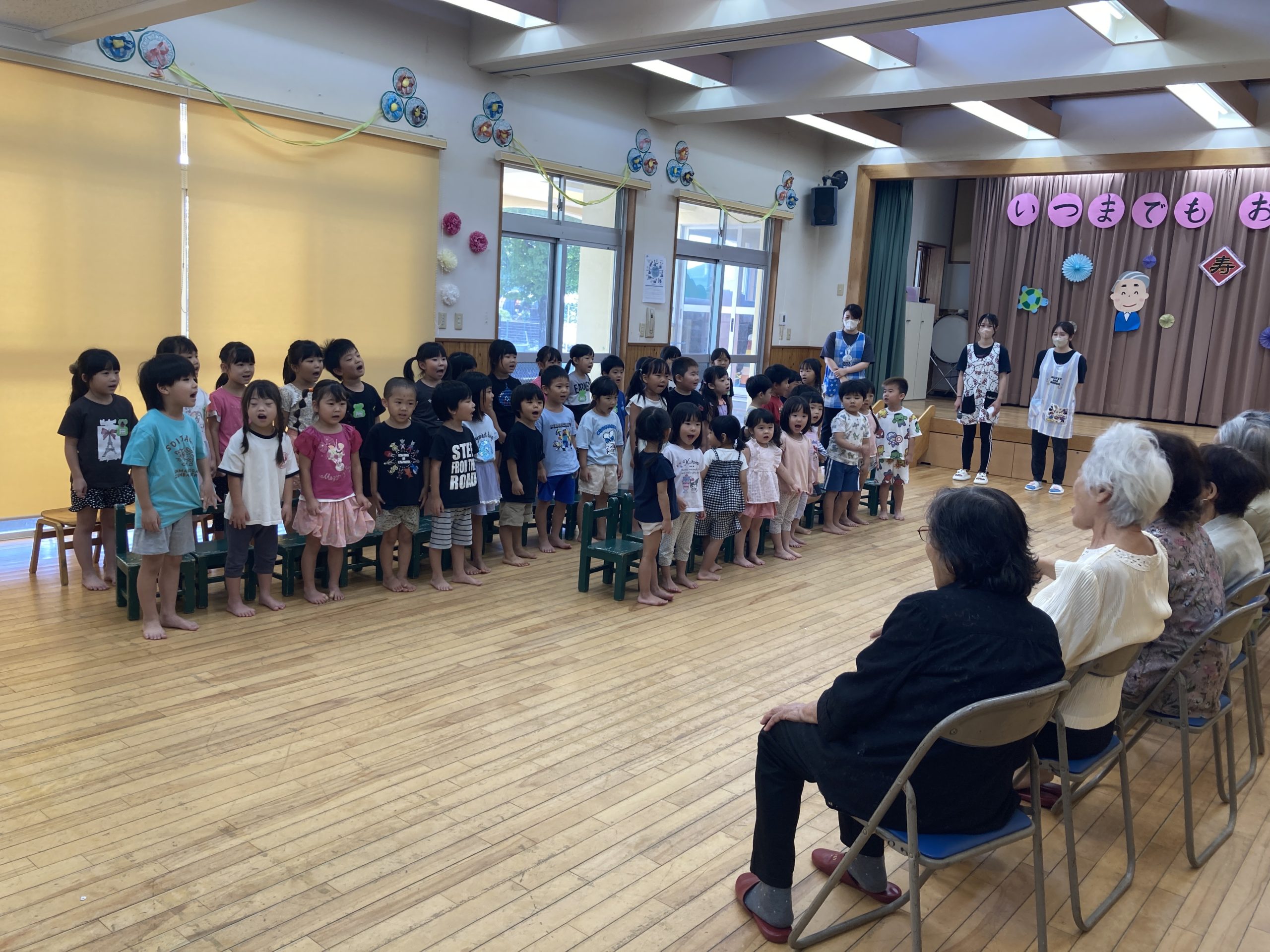 今日は敬老会に参加しました。ダンス発表では、「ドキドキする〜🥺」と緊張気味のりす組さんでしたが、練習通り楽しそうに踊ることができました✨最後にはおじいちゃんおばあちゃんの膝に乗せてもらい嬉しそうにしていました💖