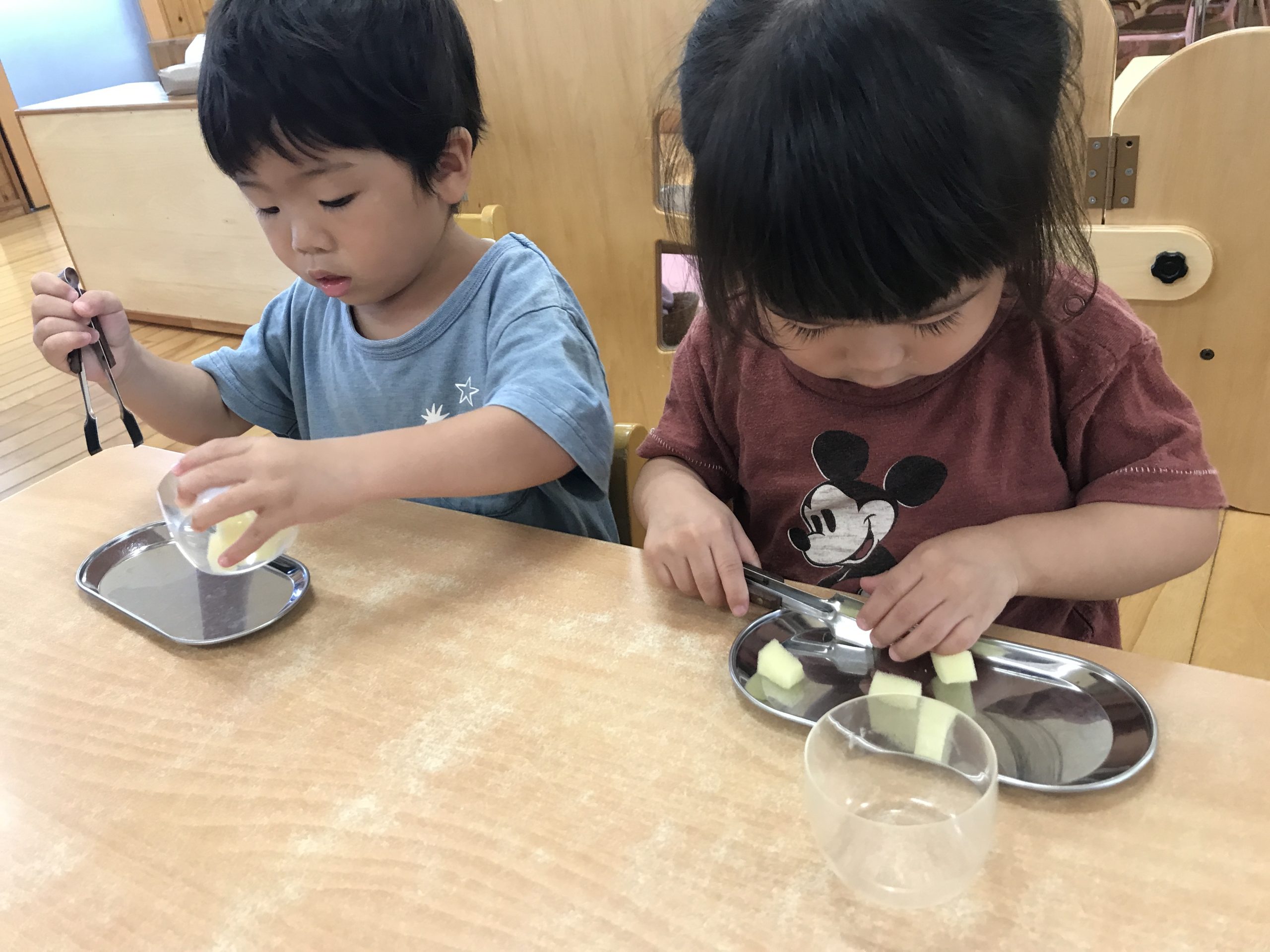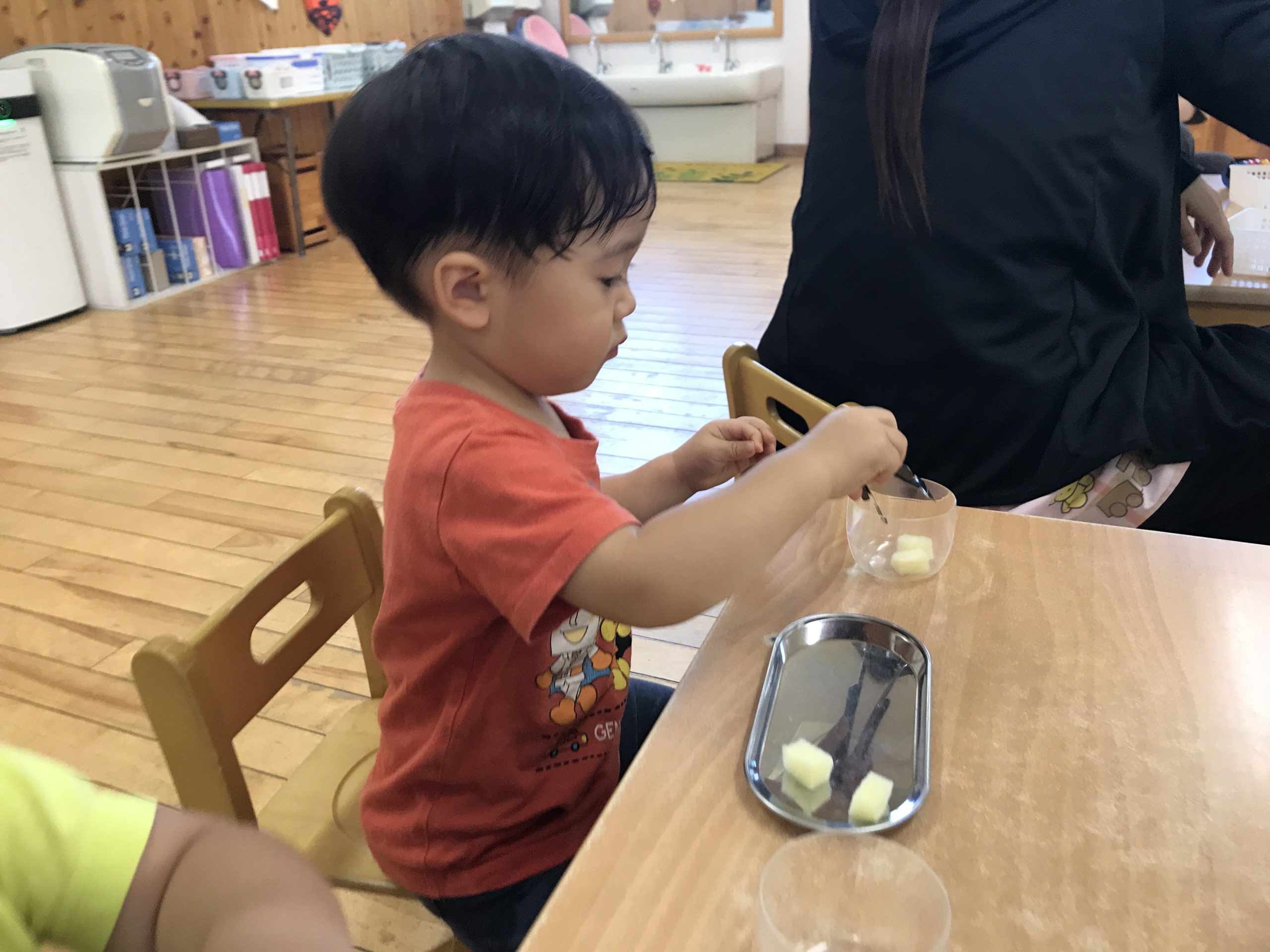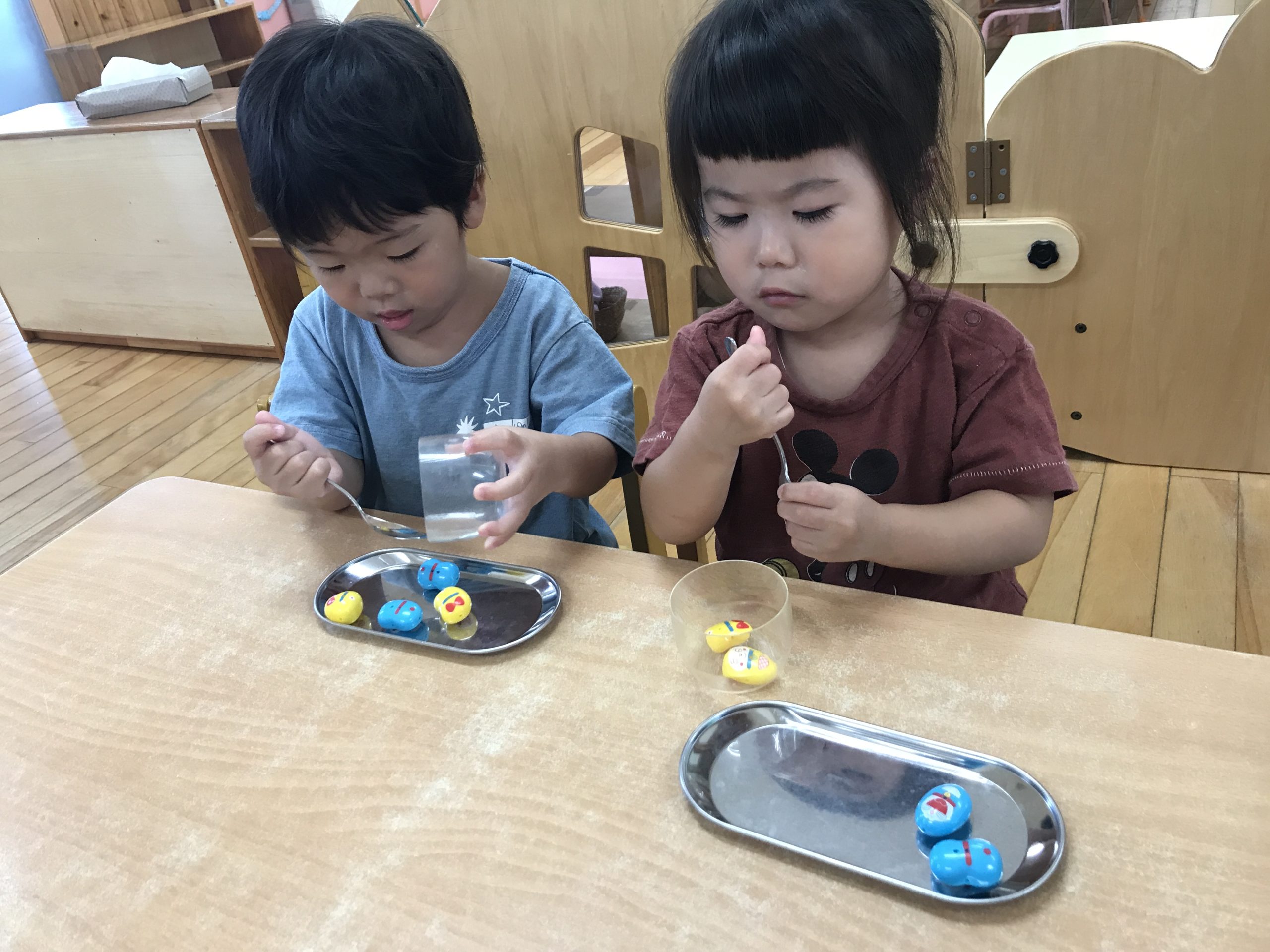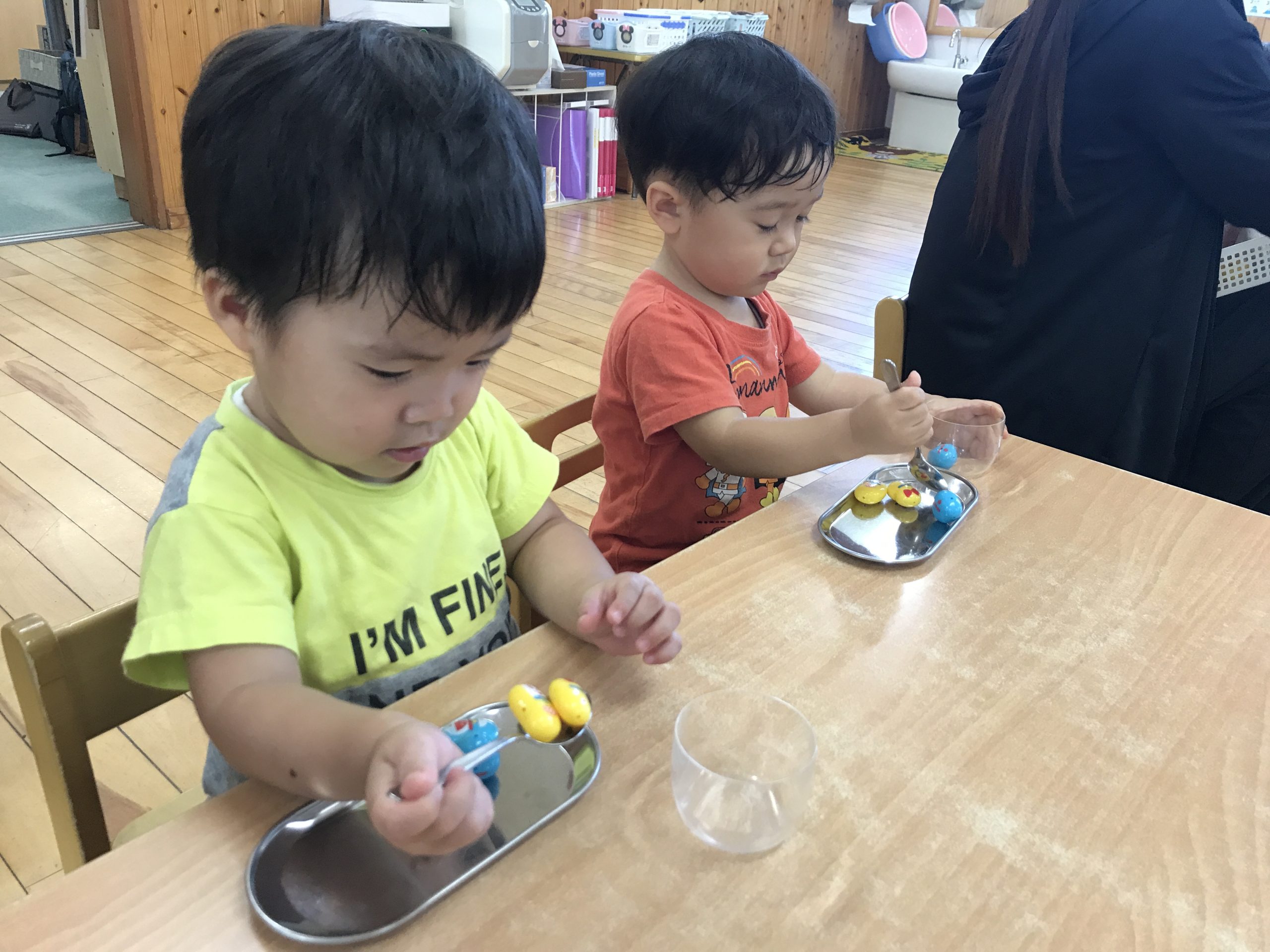今日は①②グループ合同で、豆うつしをしました🎶上手にスプーンを持ってうつすことができていましたよ😊