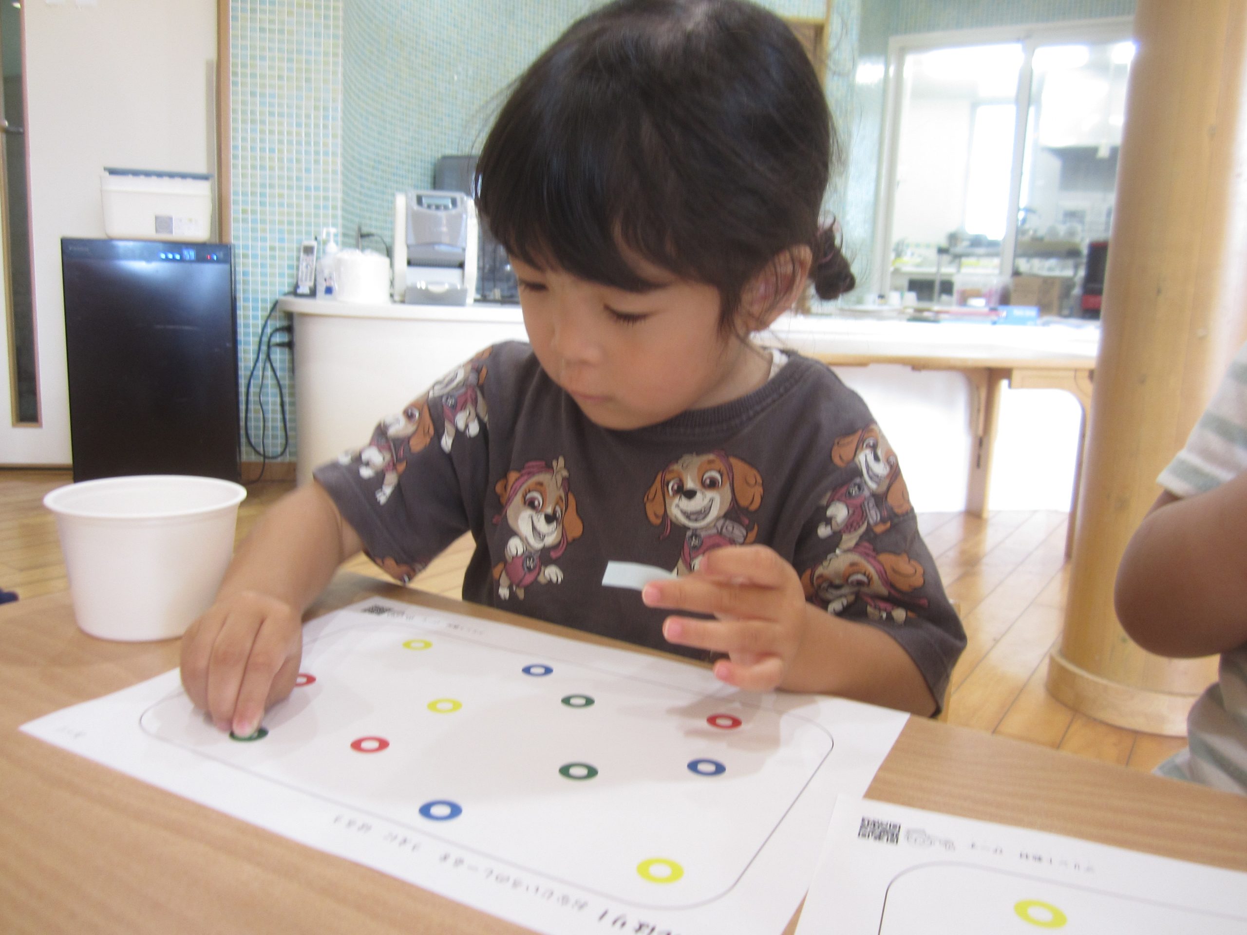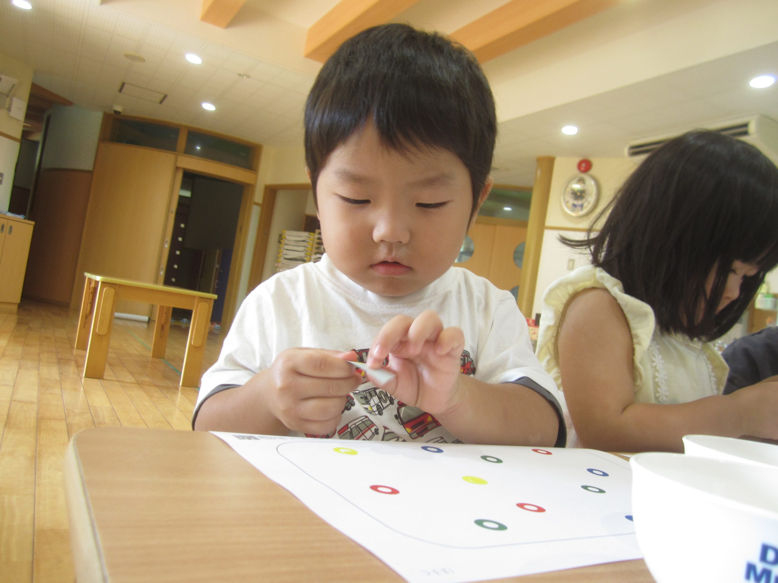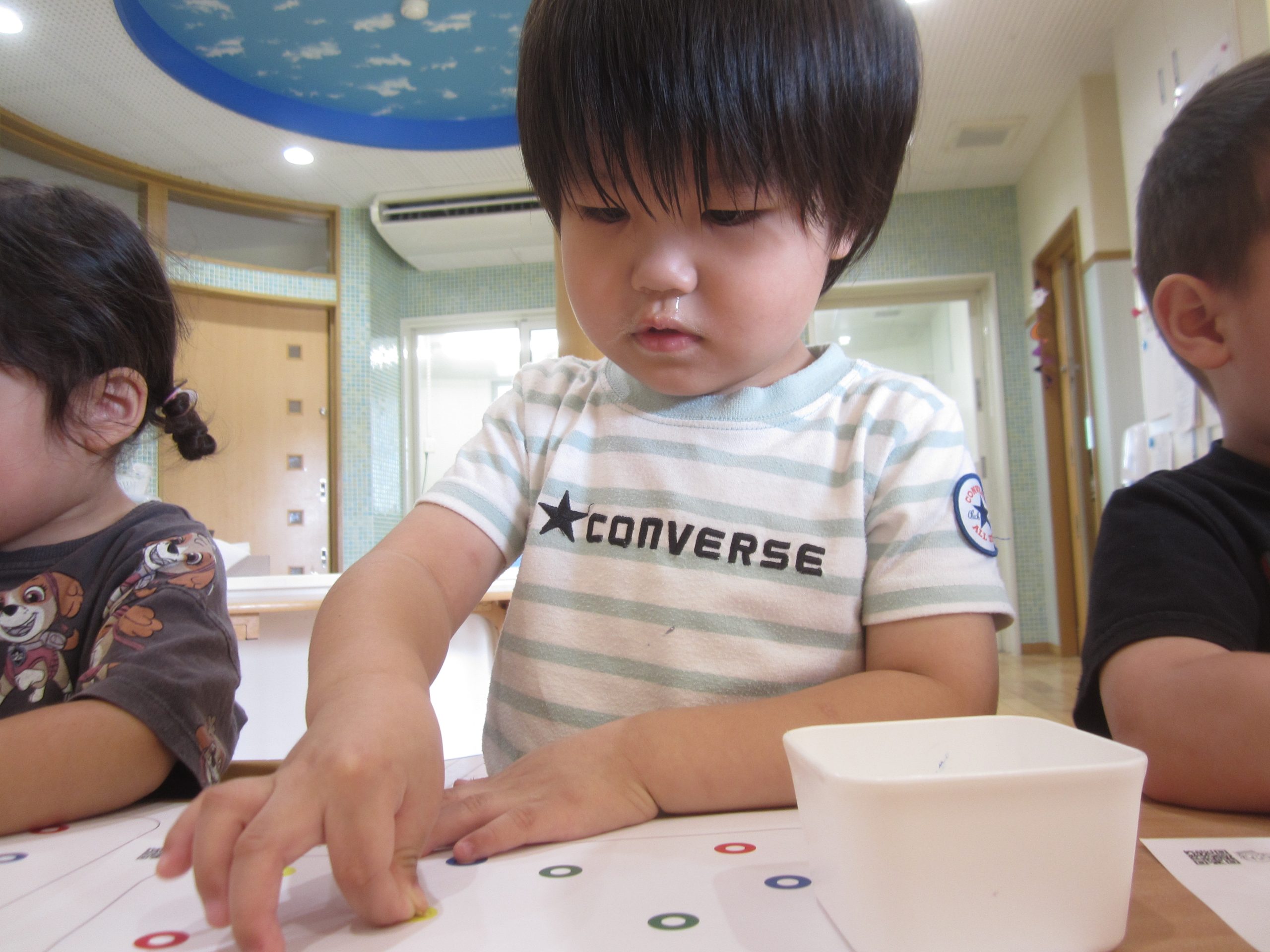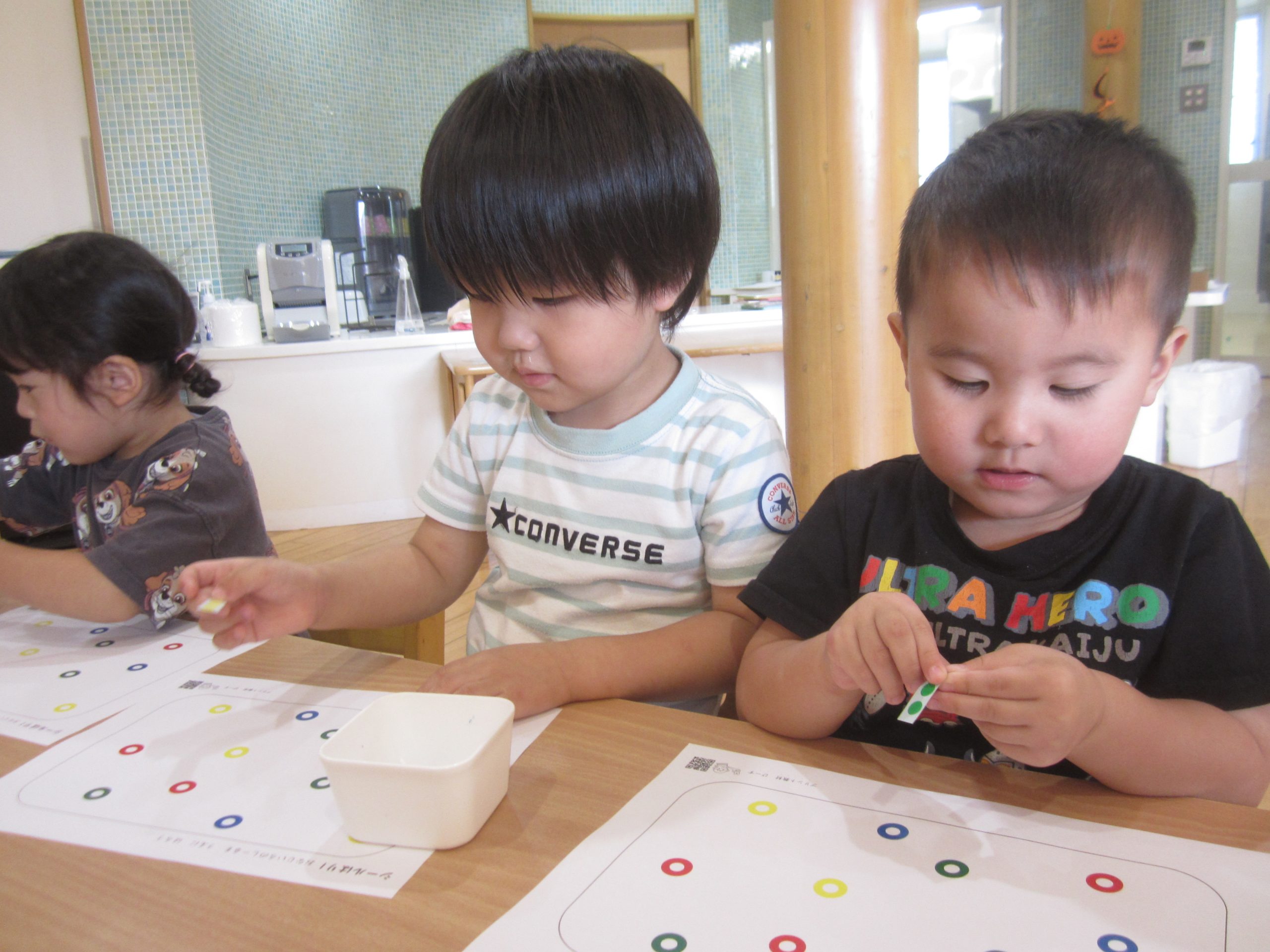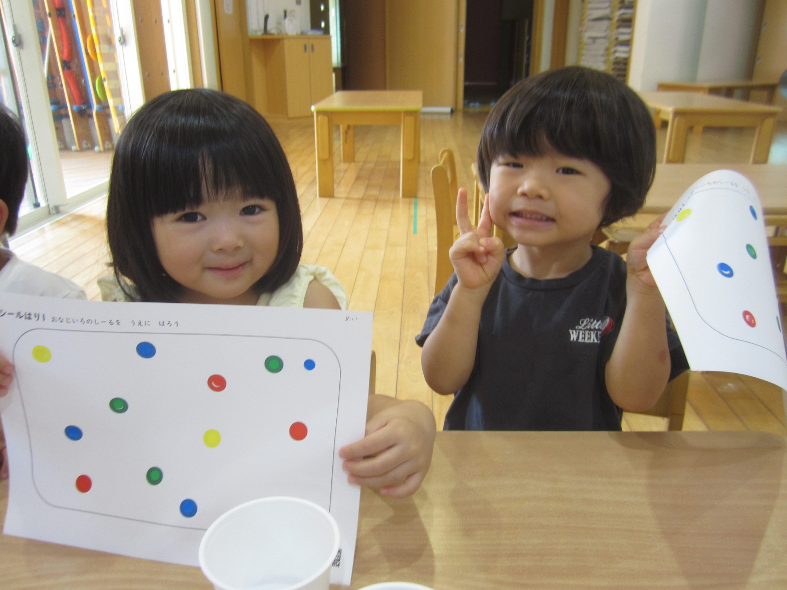 今日は、シール遊びをしました。同じ色のところや見本と同じ通りにシールを貼りました!みんな上手に貼ることができていましたよ✨