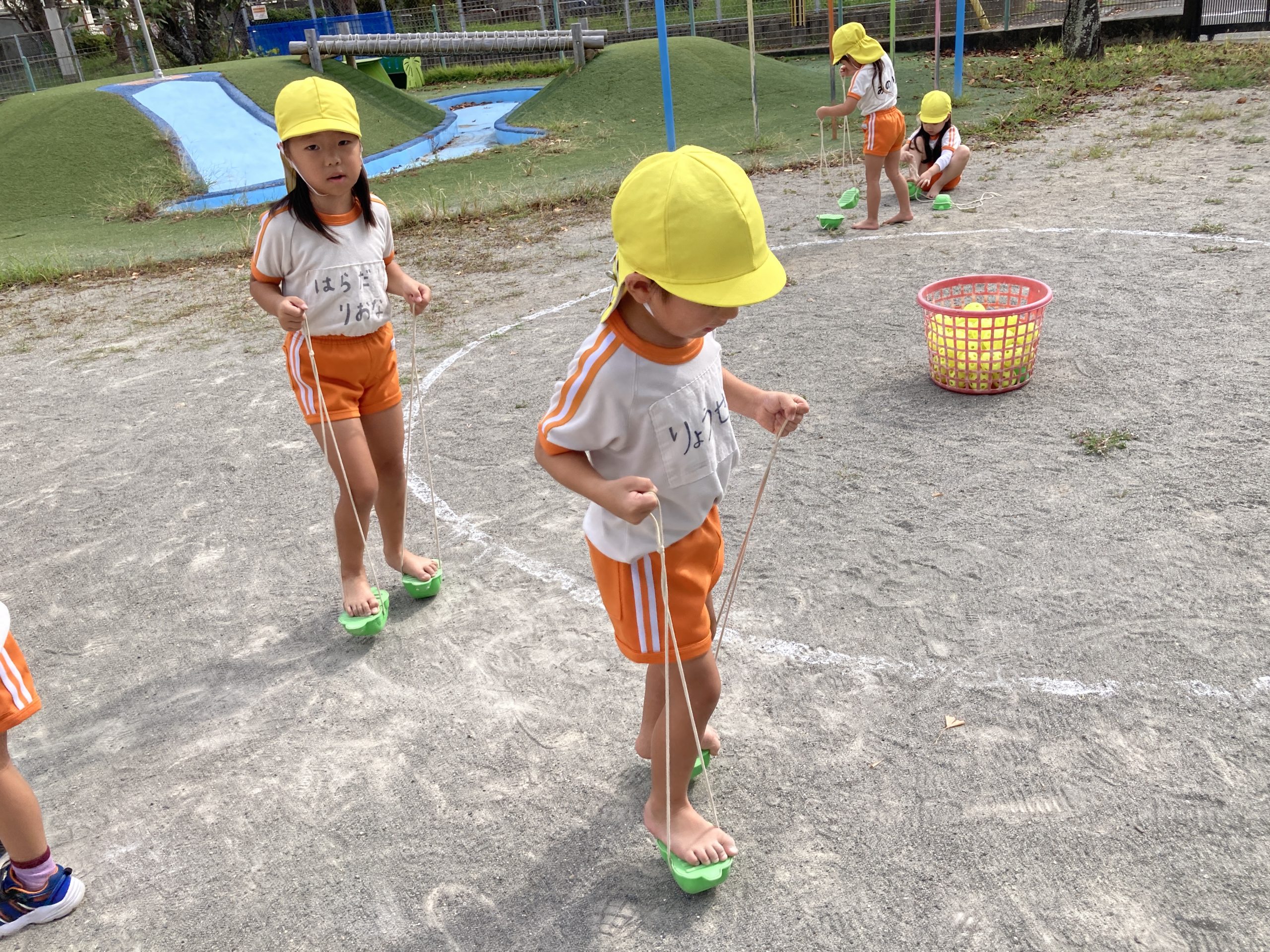 今日は体育遊びで縄跳びやうんてい、ボール入れ、中当て、登り棒、パカパコなどいろいろな遊びをしました!ボール入れでは一生懸命カゴに投げ入れていました🎾