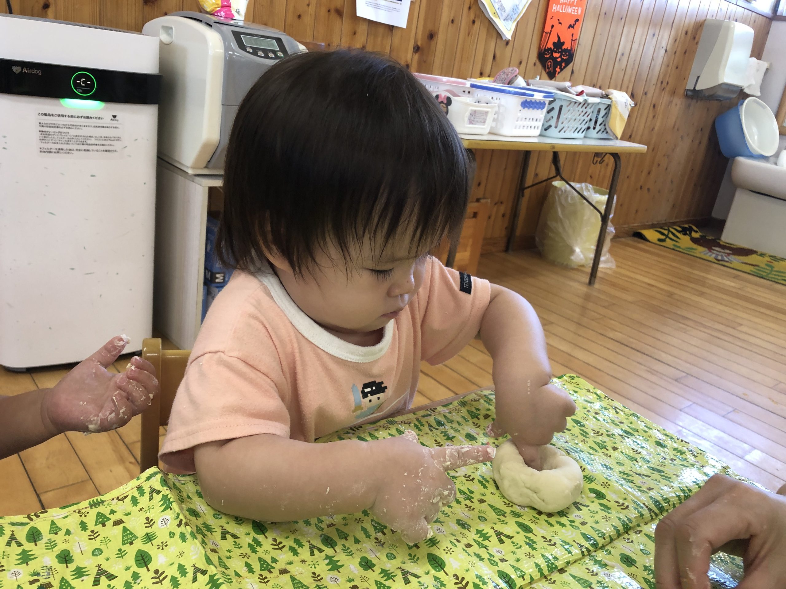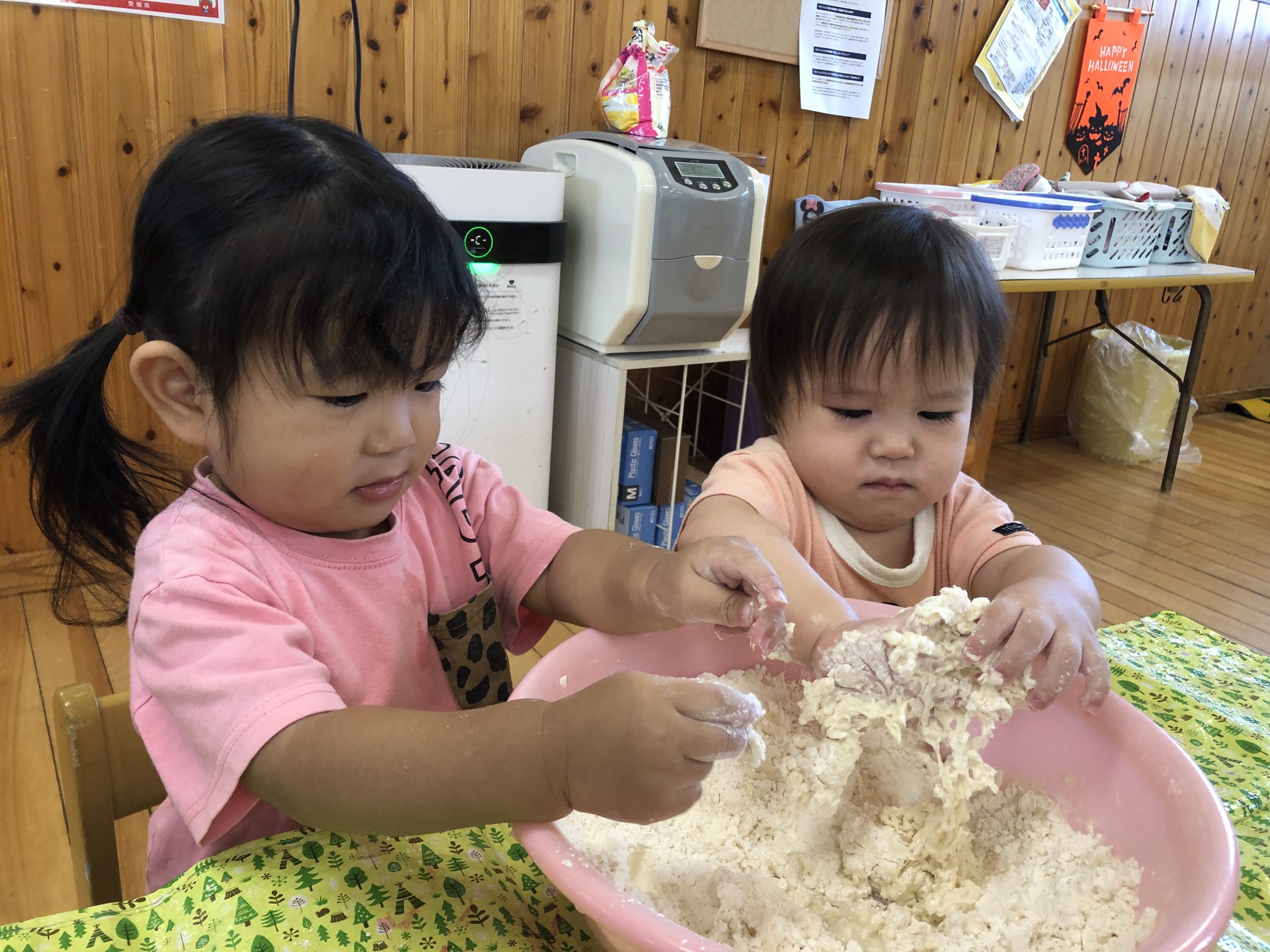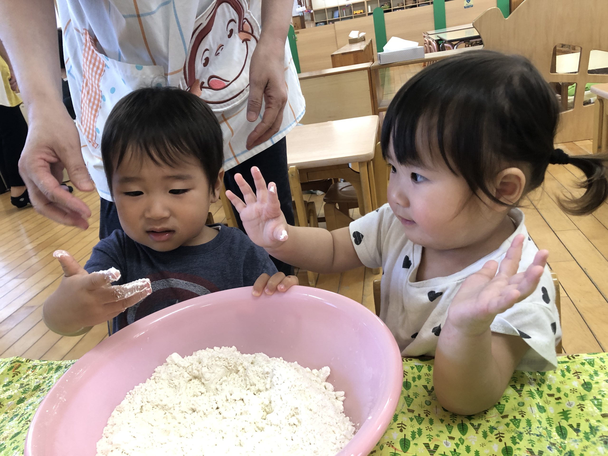 今日は小麦粉粘土遊びをしました!サラサラとベトベトの感触の違いを触って確かめましたよ🎵