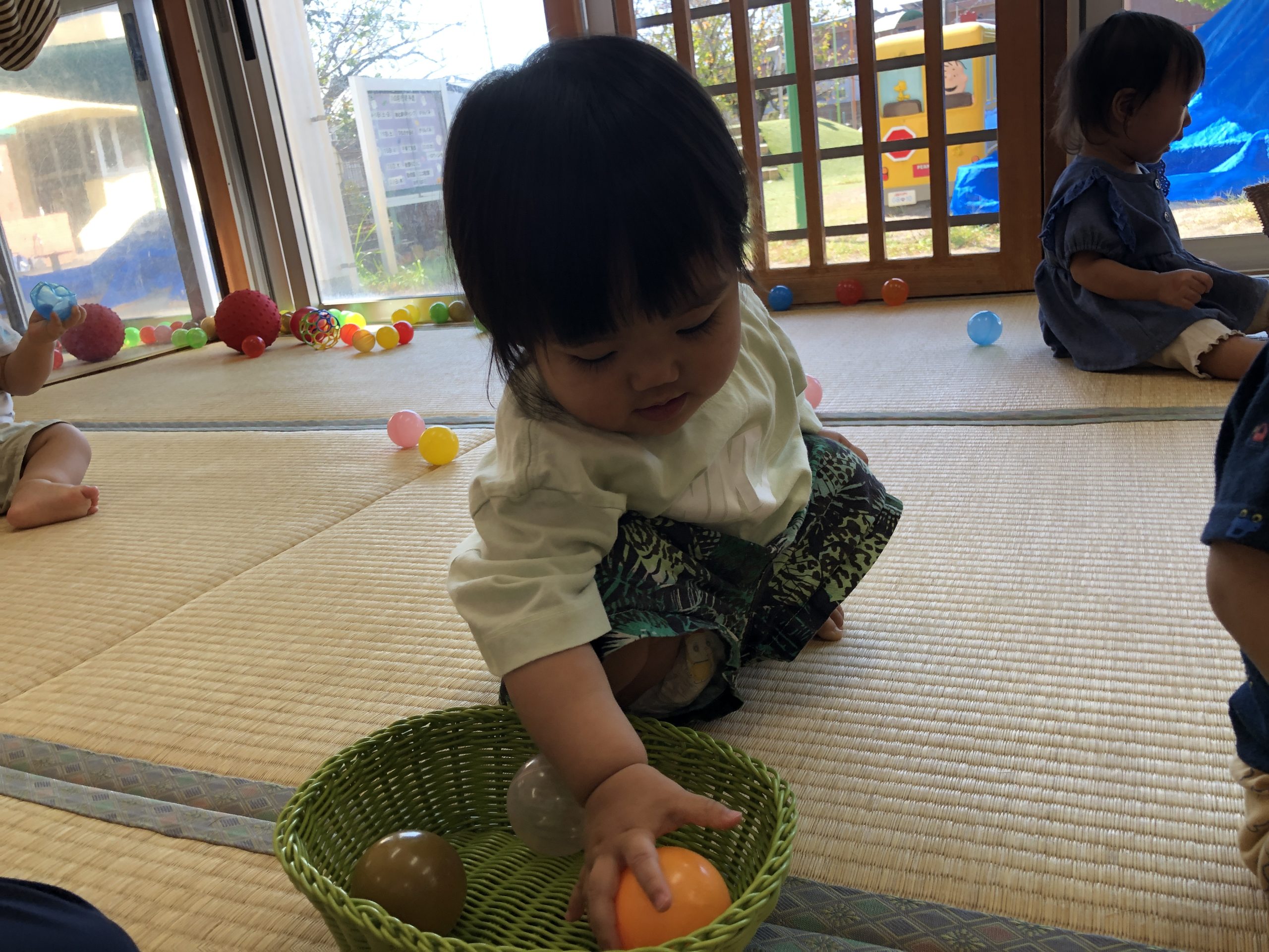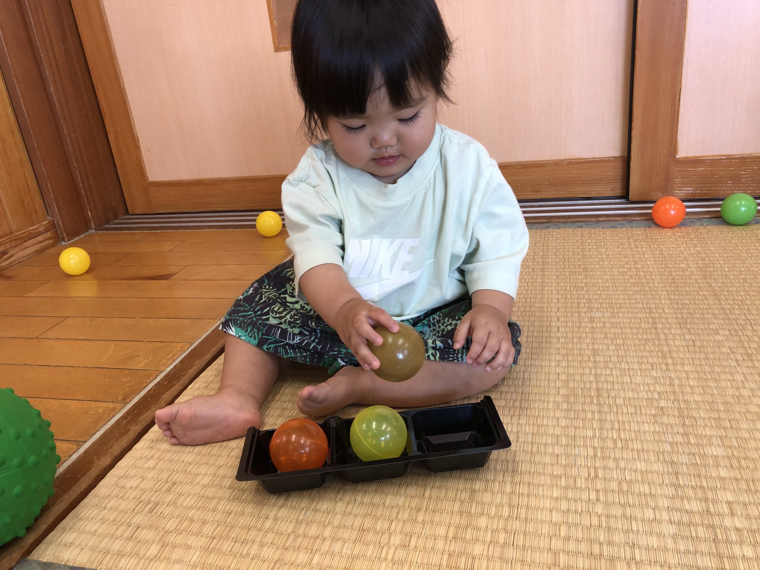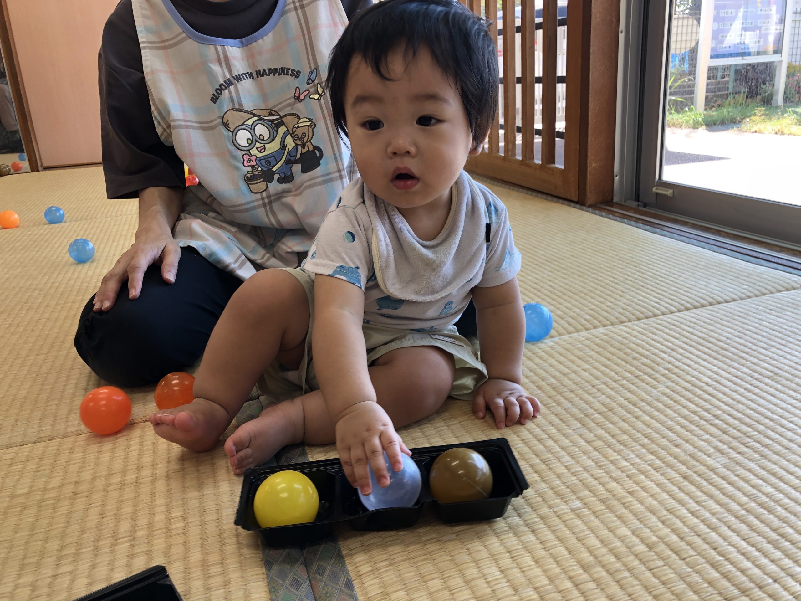 今日は、ボールを使って数の認知あそびをしました。容器にボールを出し入れするときに「いち~、に~、・・・」と数をかぞえて知らせていきました☆彡何度も出し入れを楽しんでいました♬