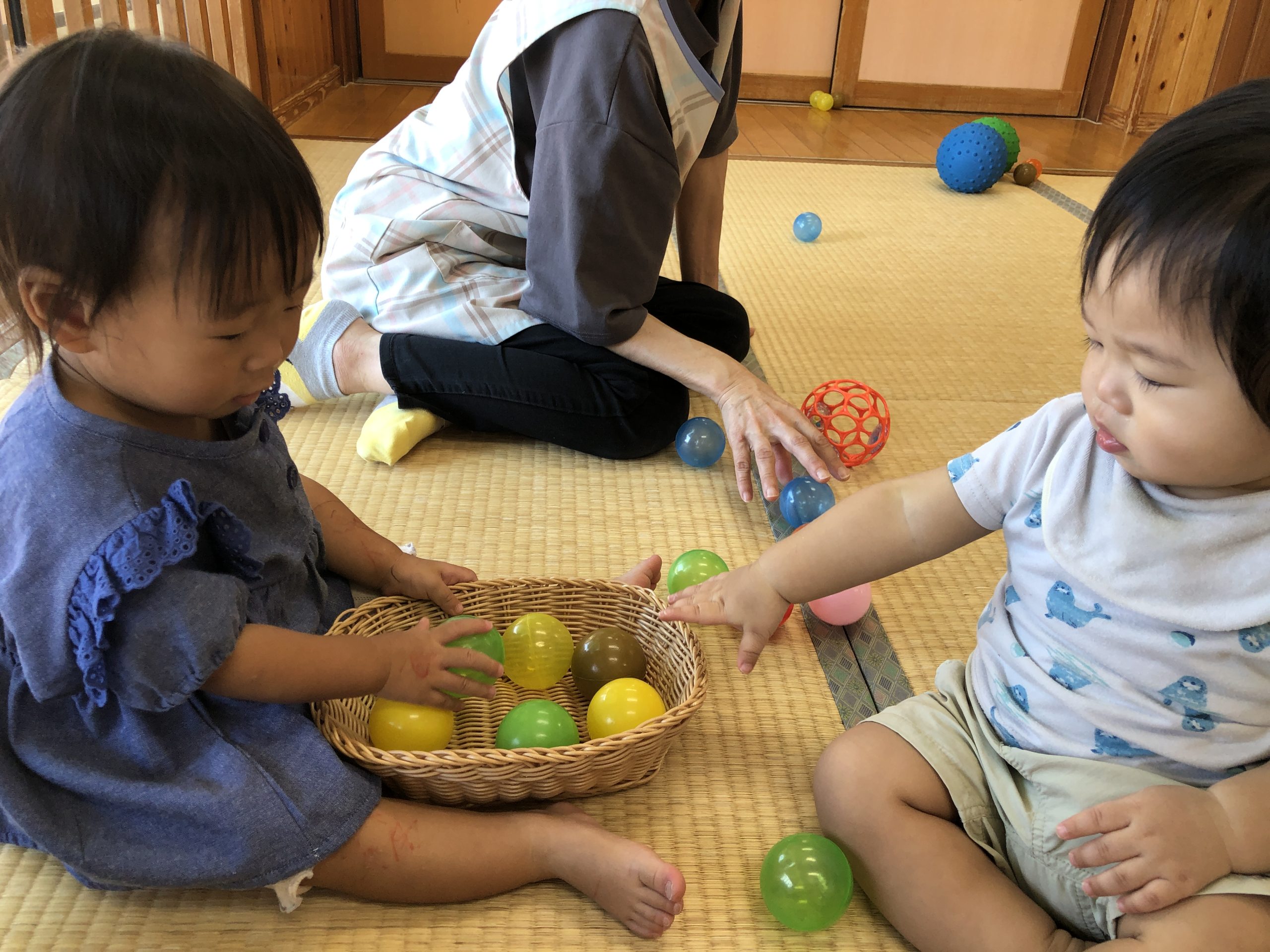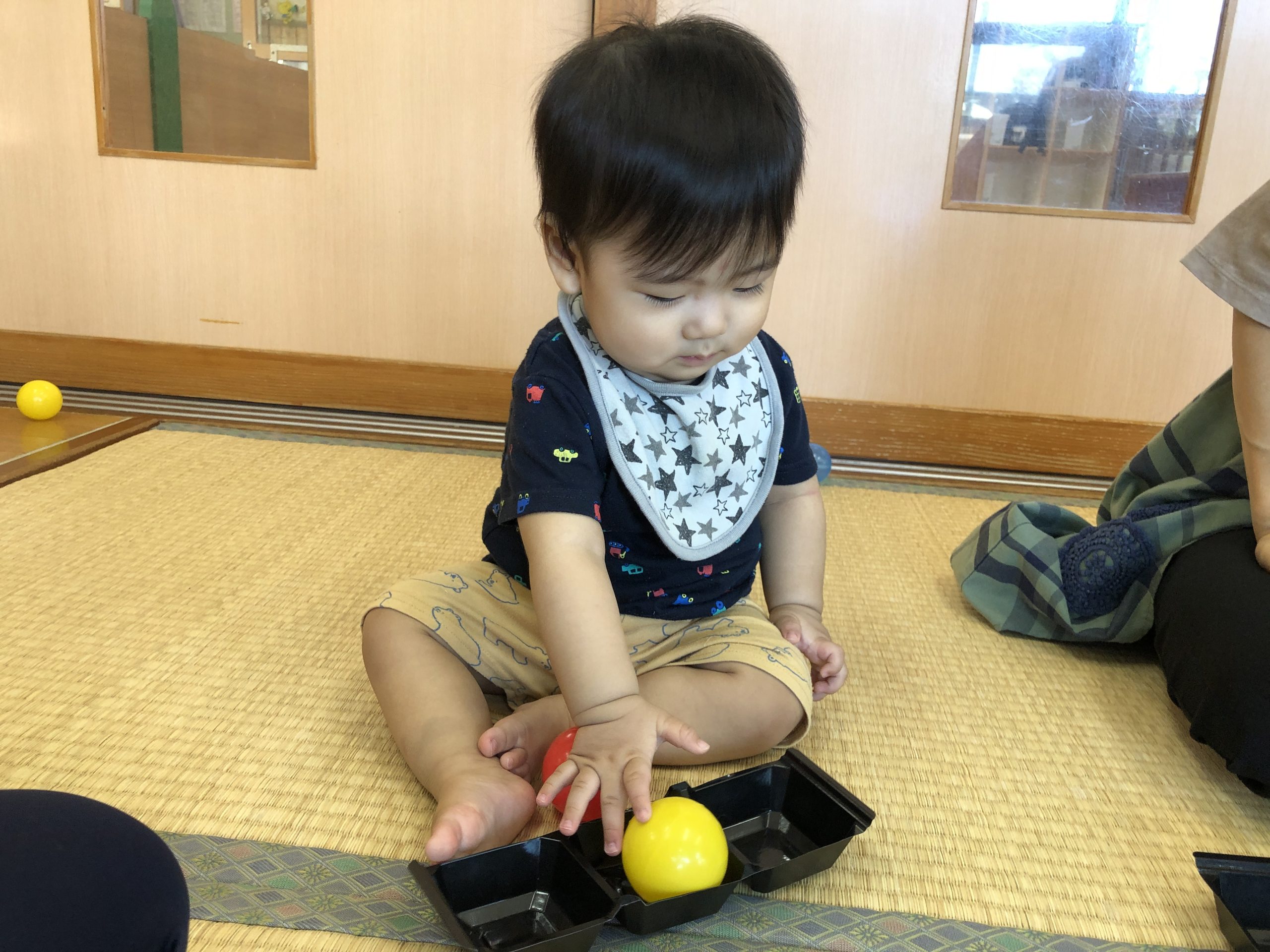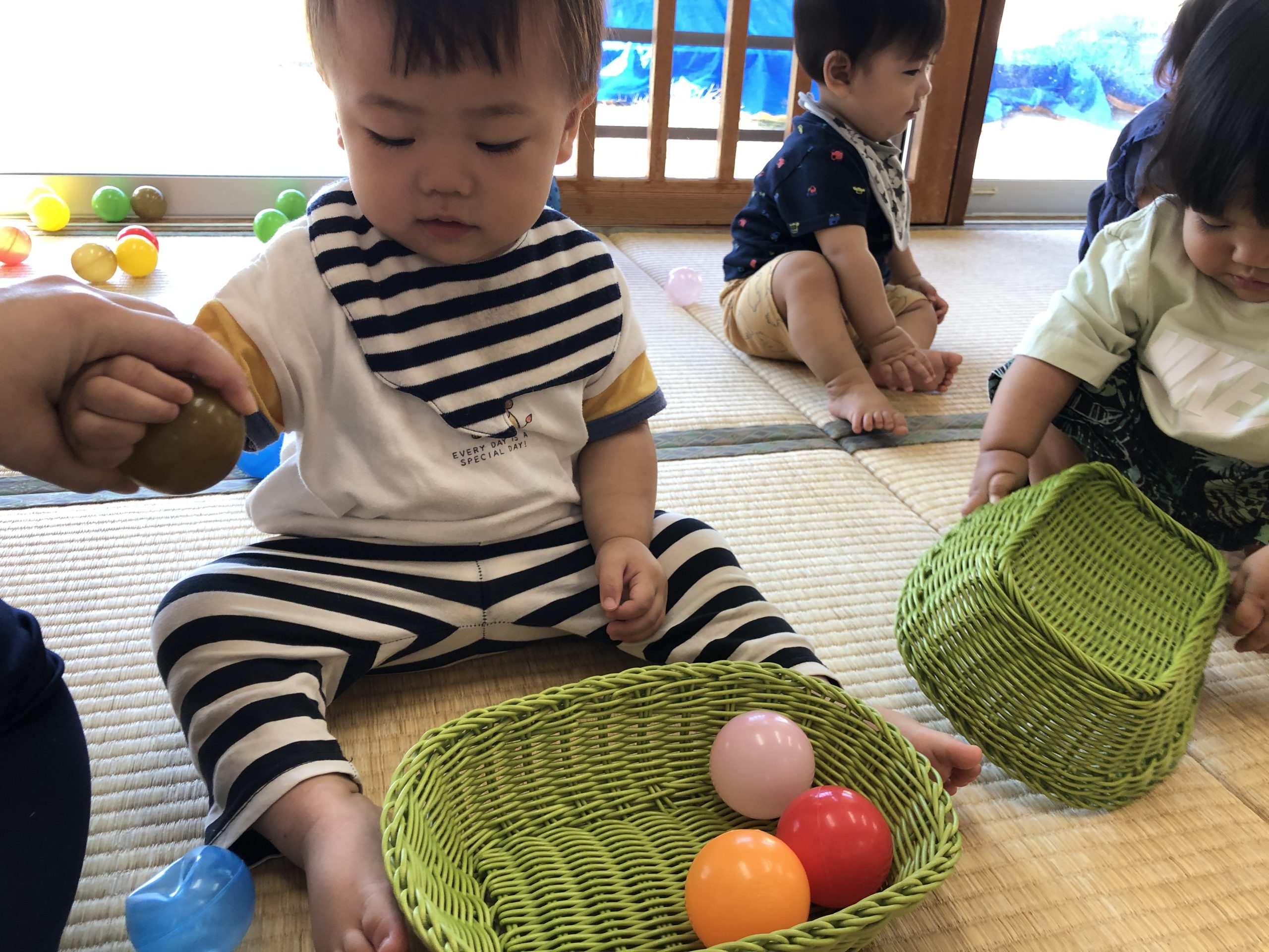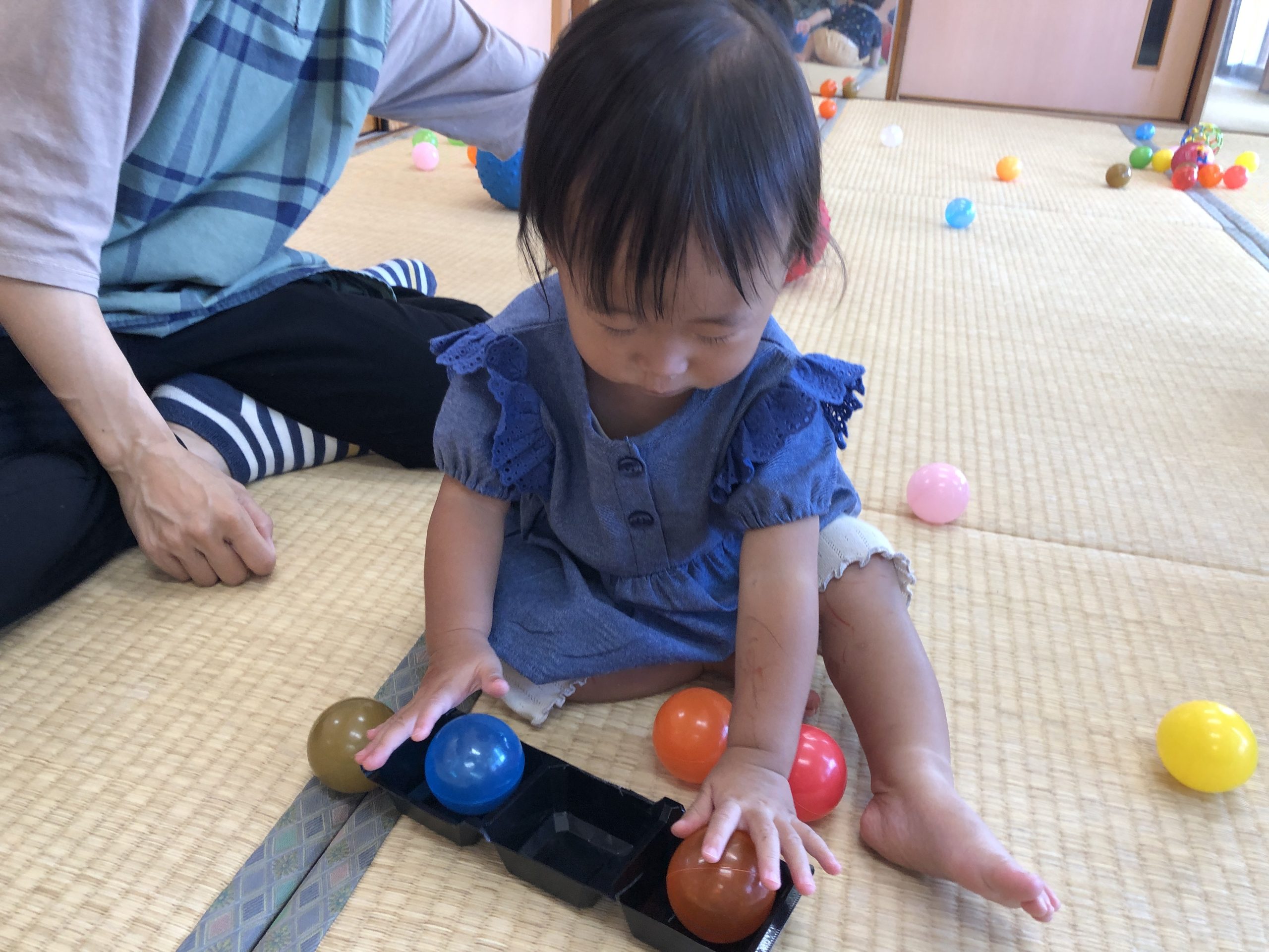 今日は、ボールを使って数の認知あそびをしました。容器にボールを出し入れするときに「いち~、に~、・・・」と数をかぞえて知らせていきました☆彡何度も出し入れを楽しんでいました♬