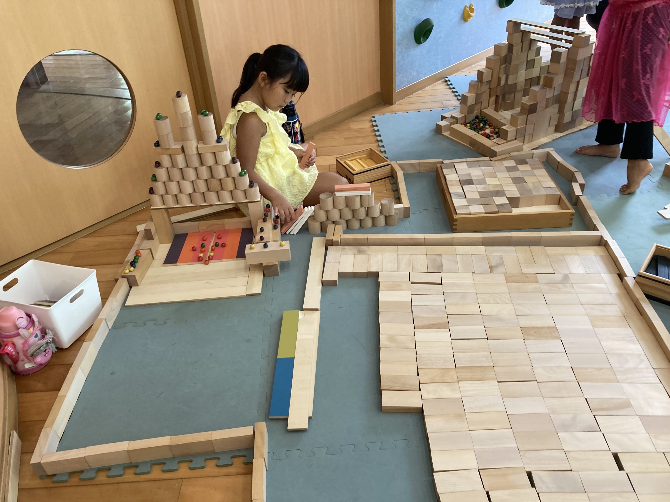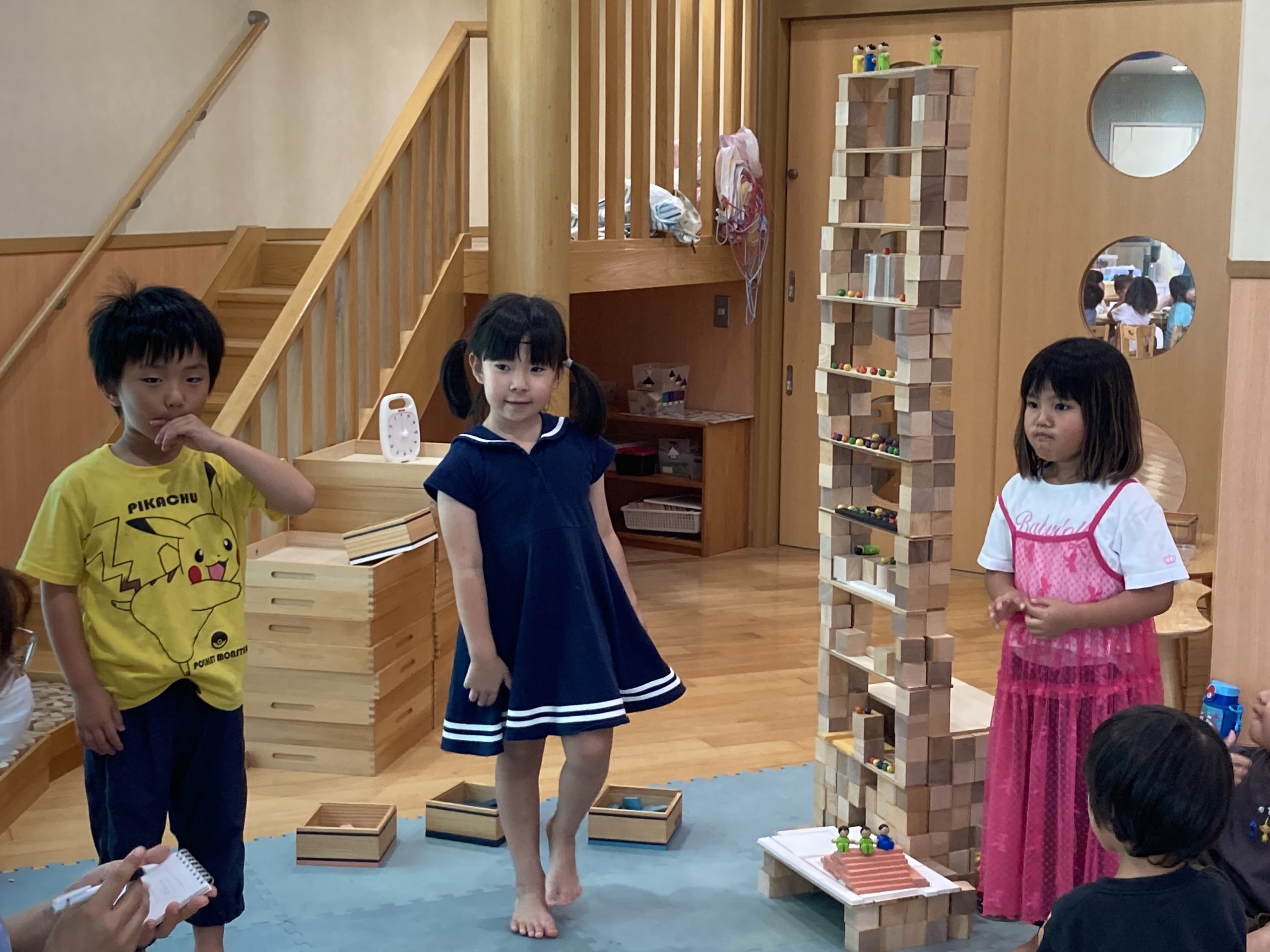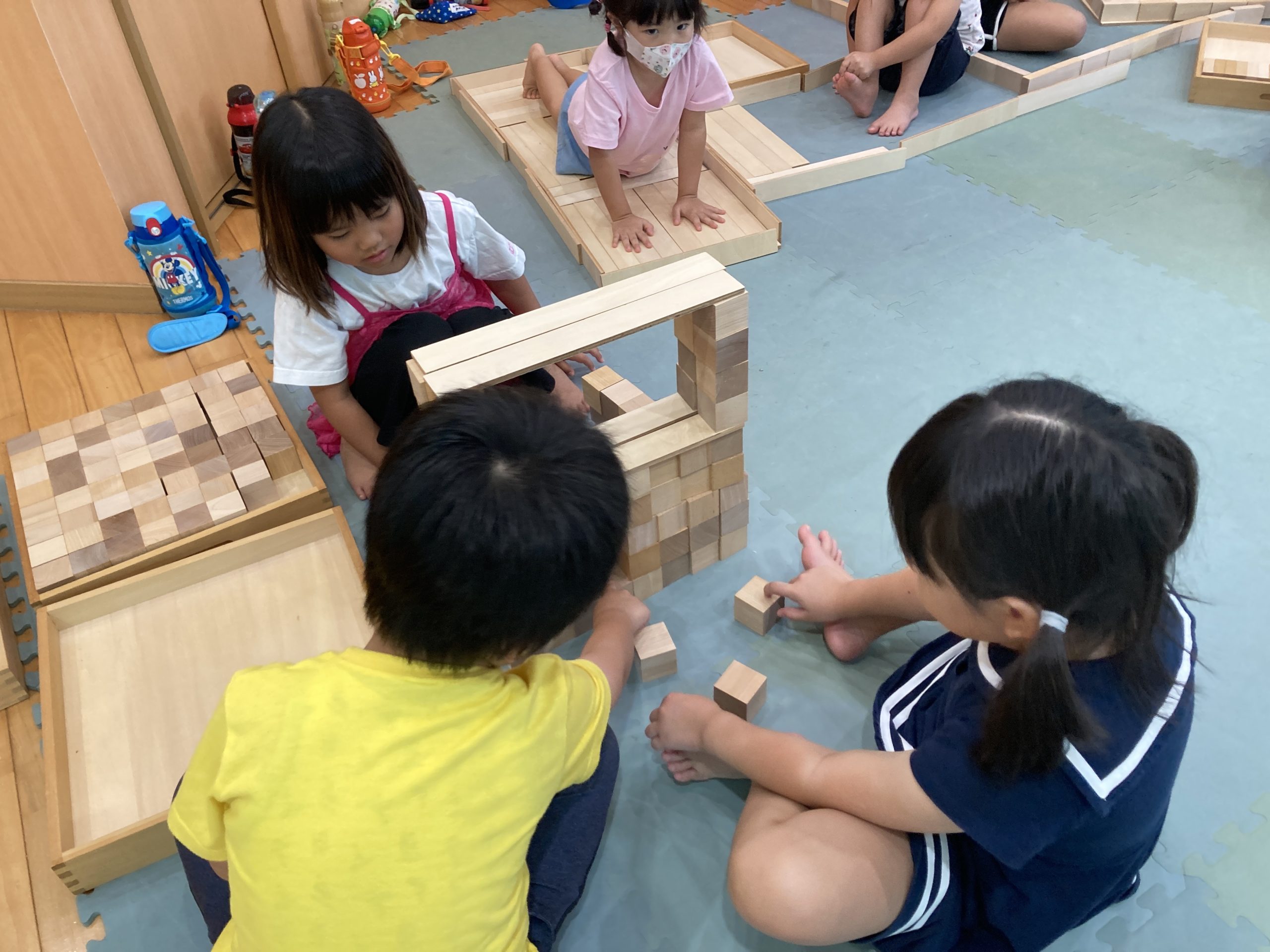 今日は、りす、きりんぐみ合同で積み木遊びをしました。サークルタイムでつくりたいものを決めて取り組みました。ホテルや家をつくり、最後に発表してもらいました。