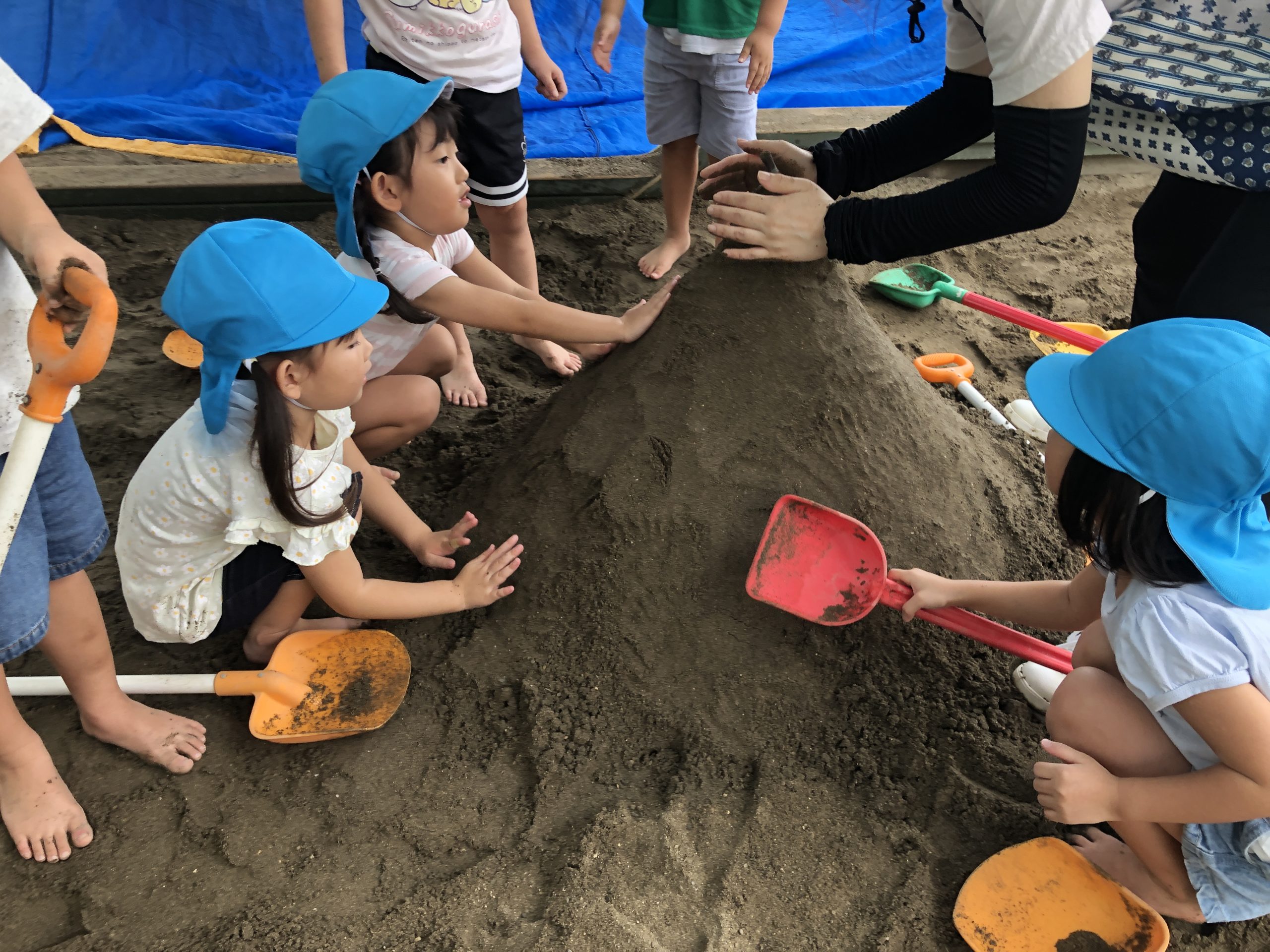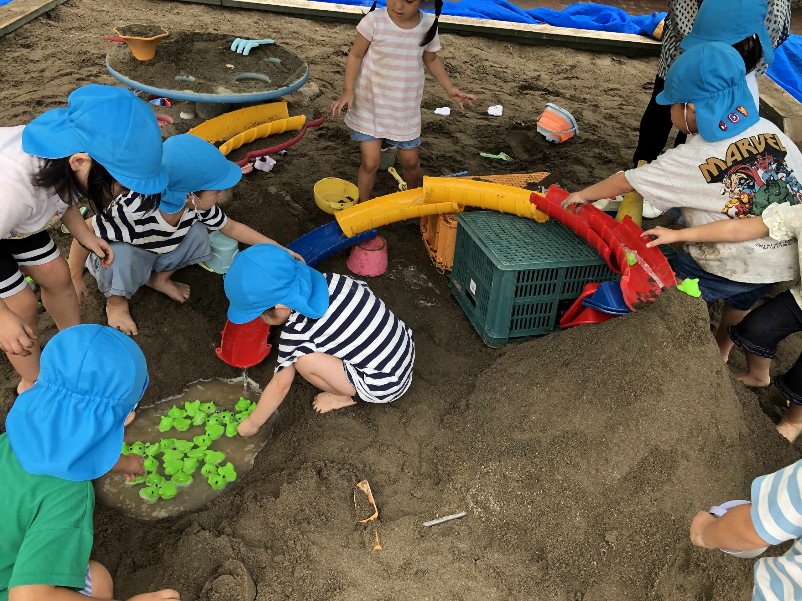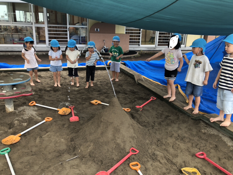 今日は、泥遊びをしました☀️お山の中にホースを入れ火山を作りました🌋3・2・1の合図で水が噴射!!トンネルが出来ると嬉しそうに通っていましたよ😆その後は、お山から水路を作りカエルの池を作りました🐸水が溜まるとカエルではなくつきぐみのお友達が池に入って楽しんでいましたよ〜😂🎶