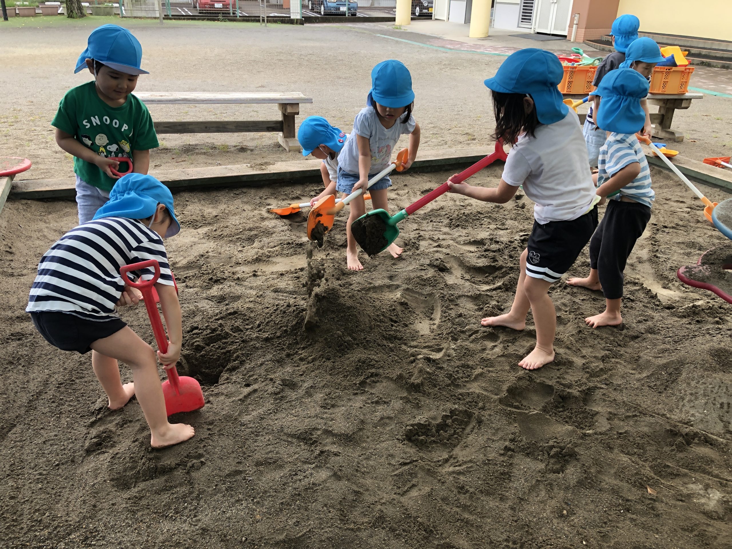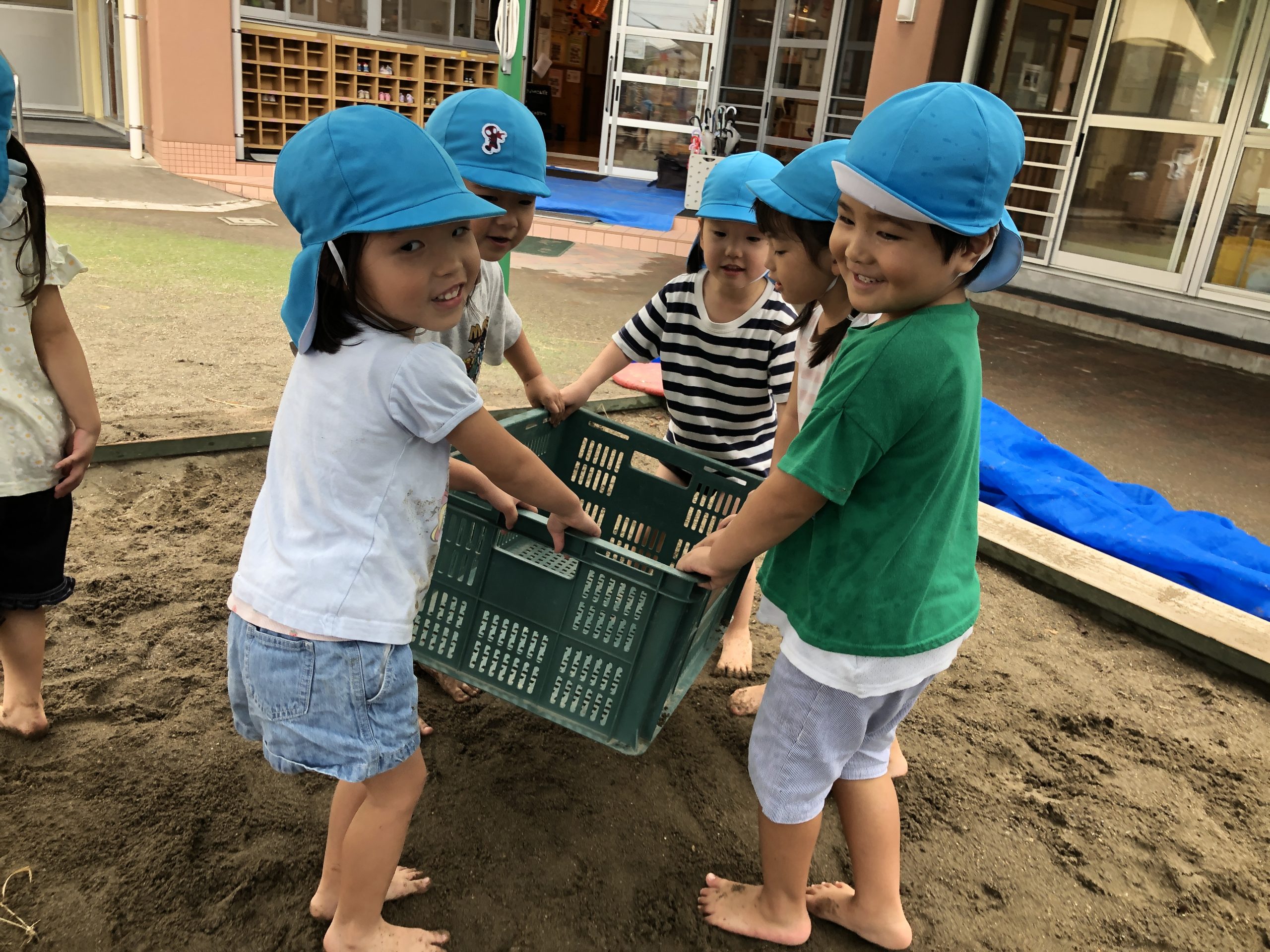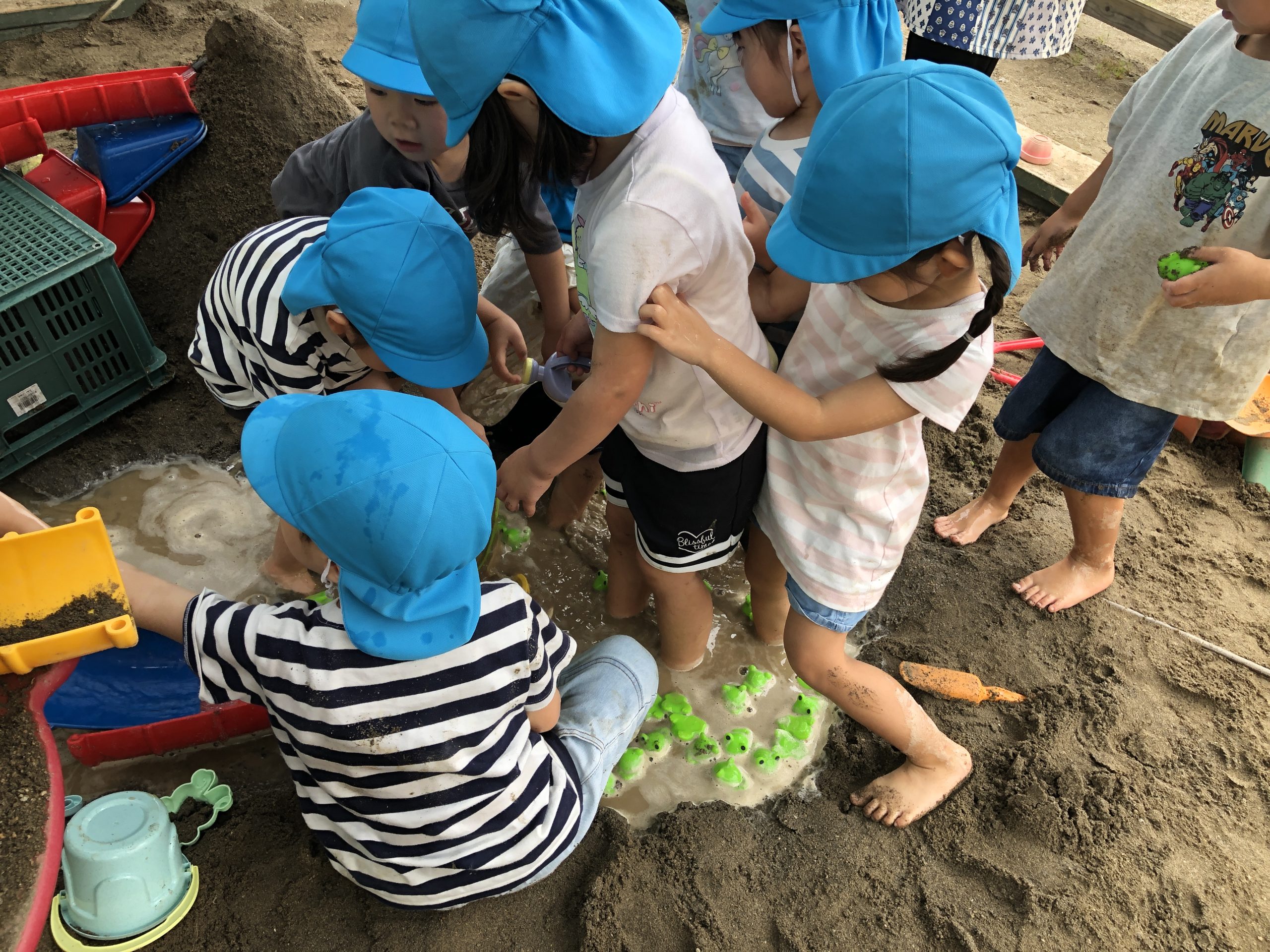 今日は、泥遊びをしました☀️お山の中にホースを入れ火山を作りました🌋3・2・1の合図で水が噴射!!トンネルが出来ると嬉しそうに通っていましたよ😆その後は、お山から水路を作りカエルの池を作りました🐸水が溜まるとカエルではなくつきぐみのお友達が池に入って楽しんでいましたよ〜😂🎶