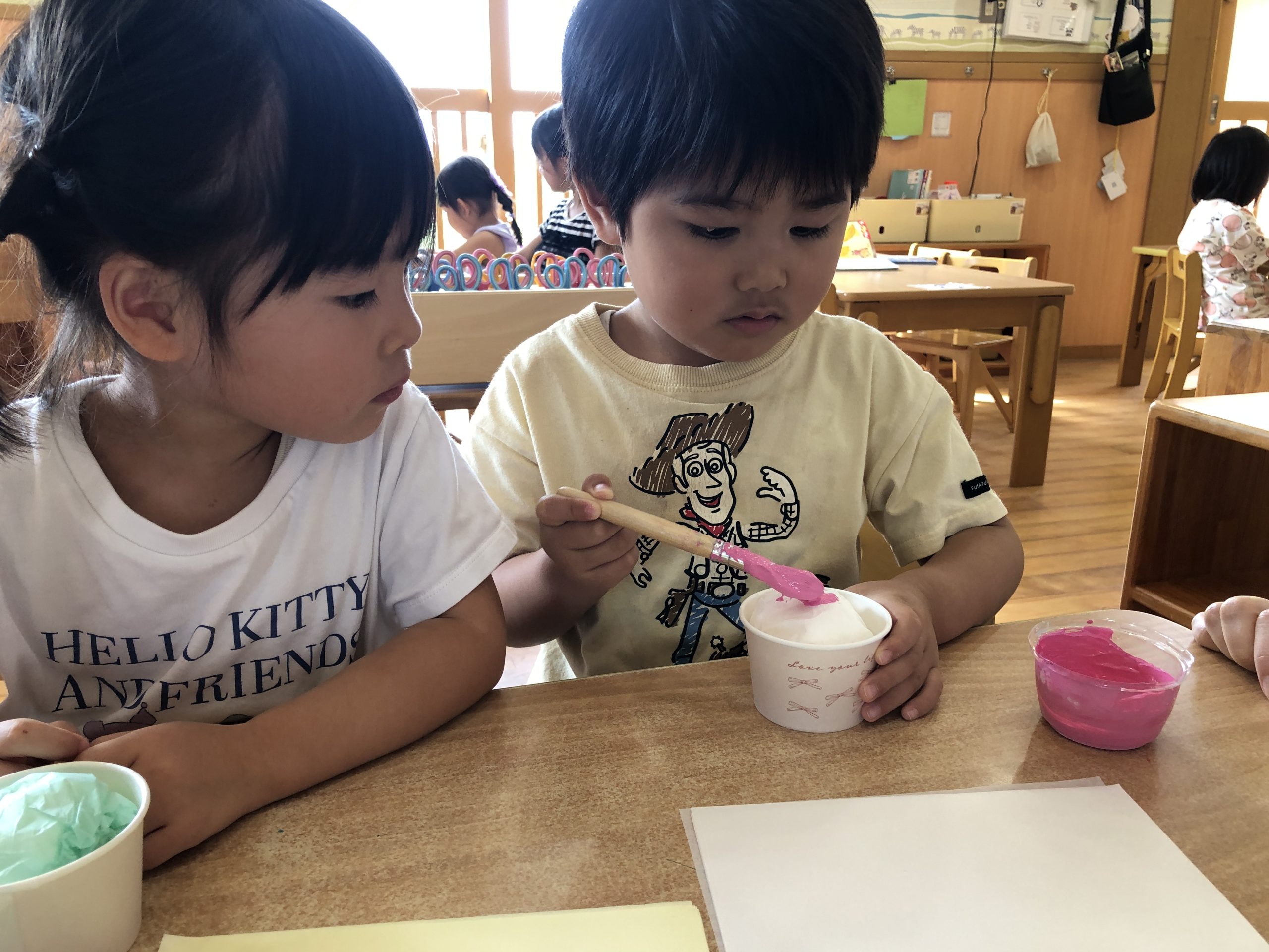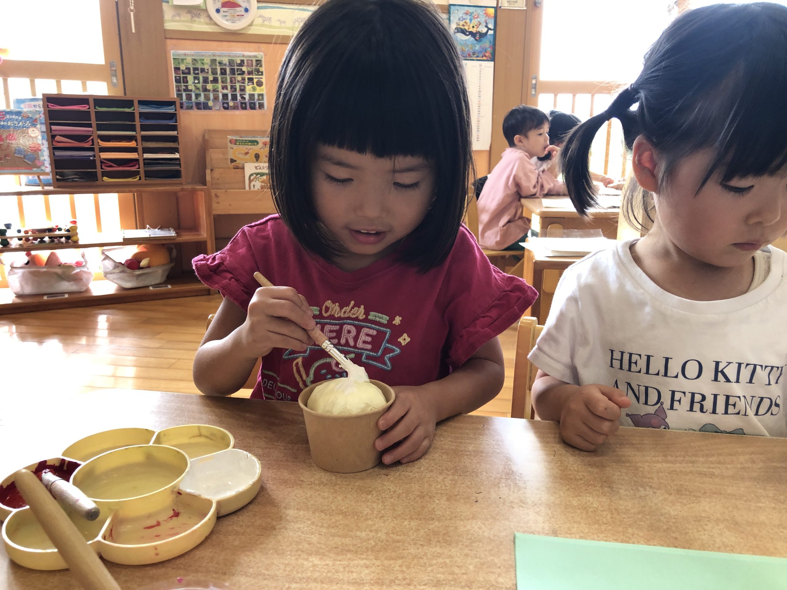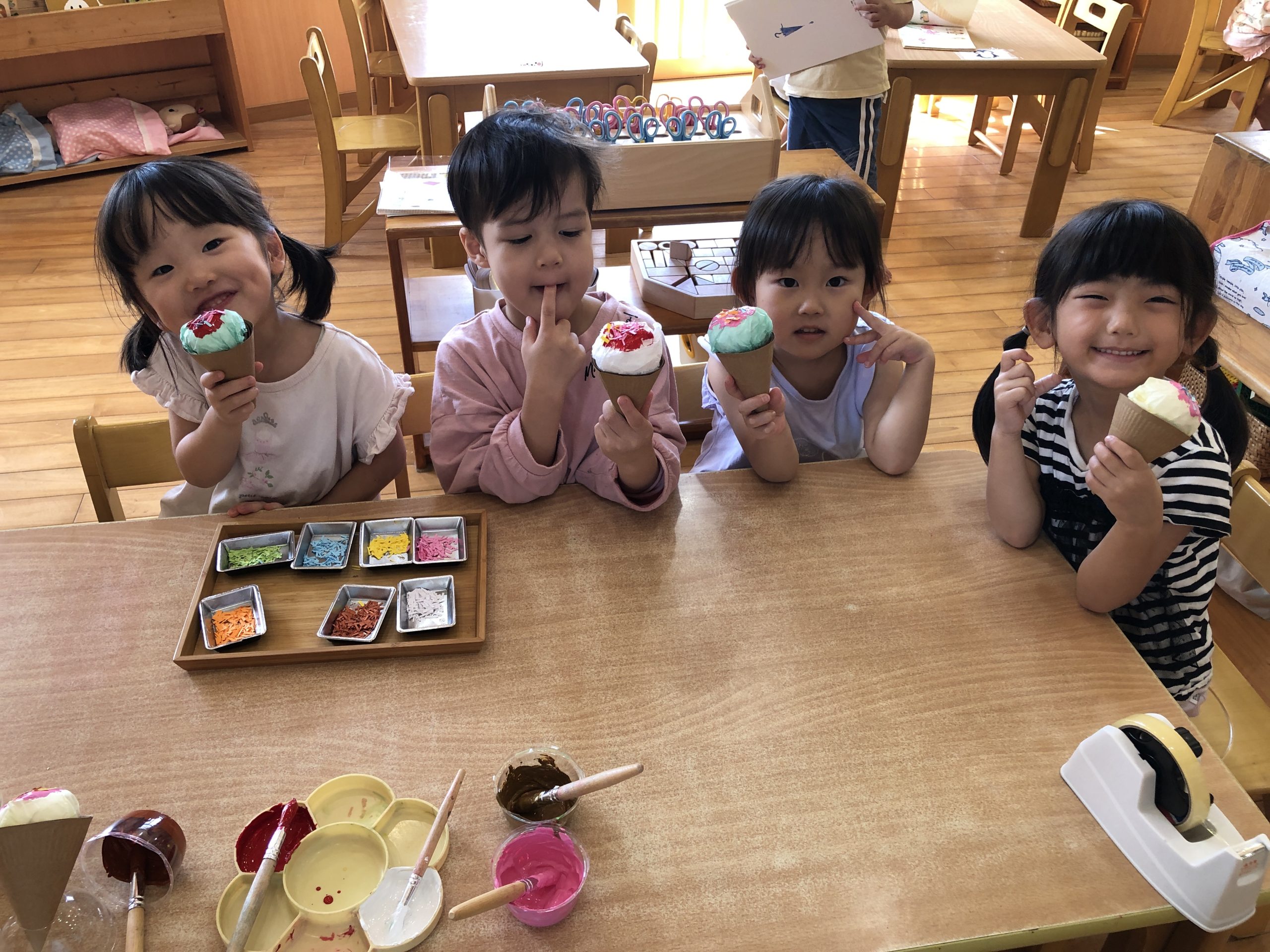 今日は、秋祭りごっこ商品のアイスクリームを作りました🍨好きな色のお花がみやトッピングを自分で選びオリジナルアイスが完成しましたよ💖