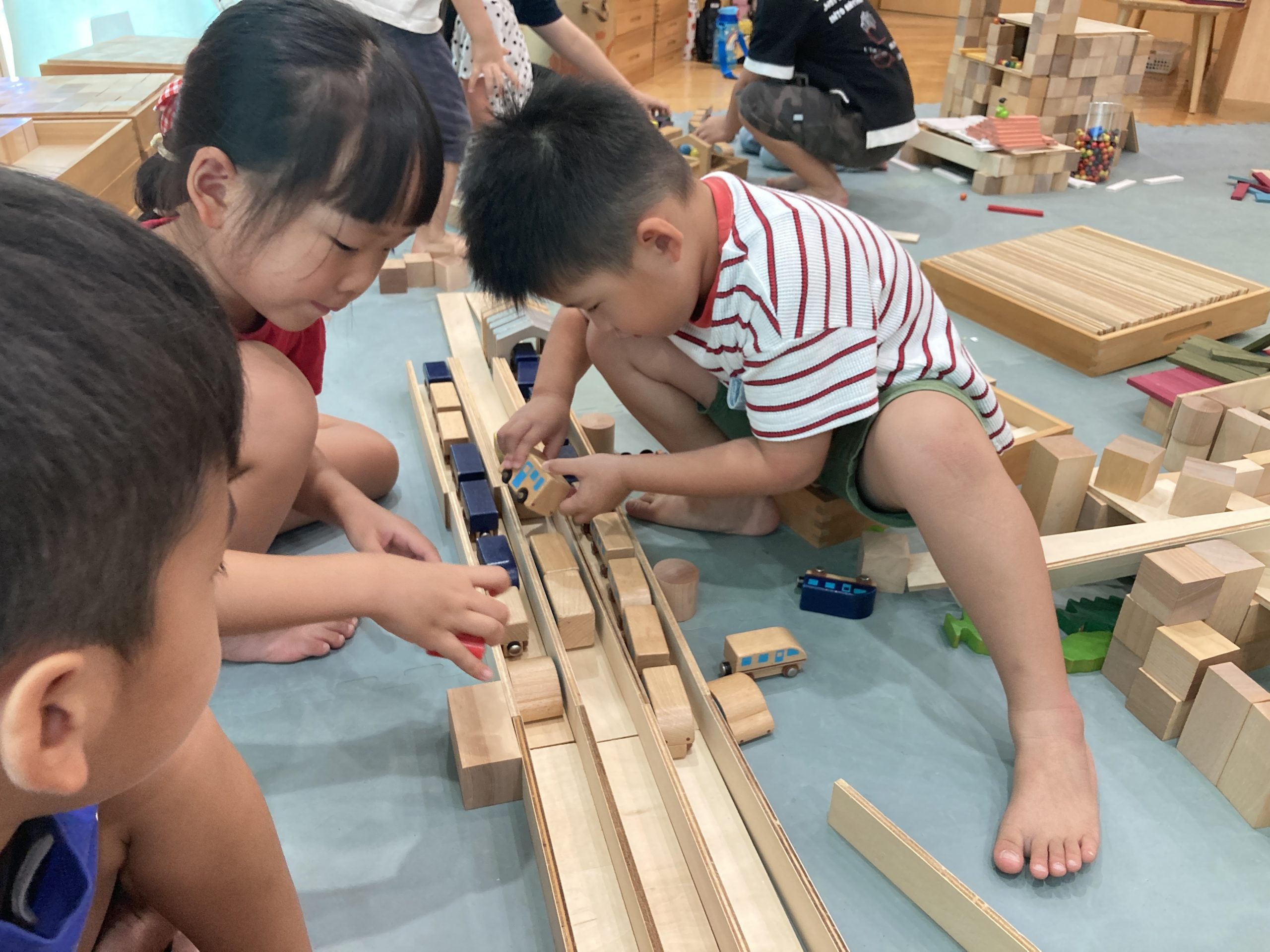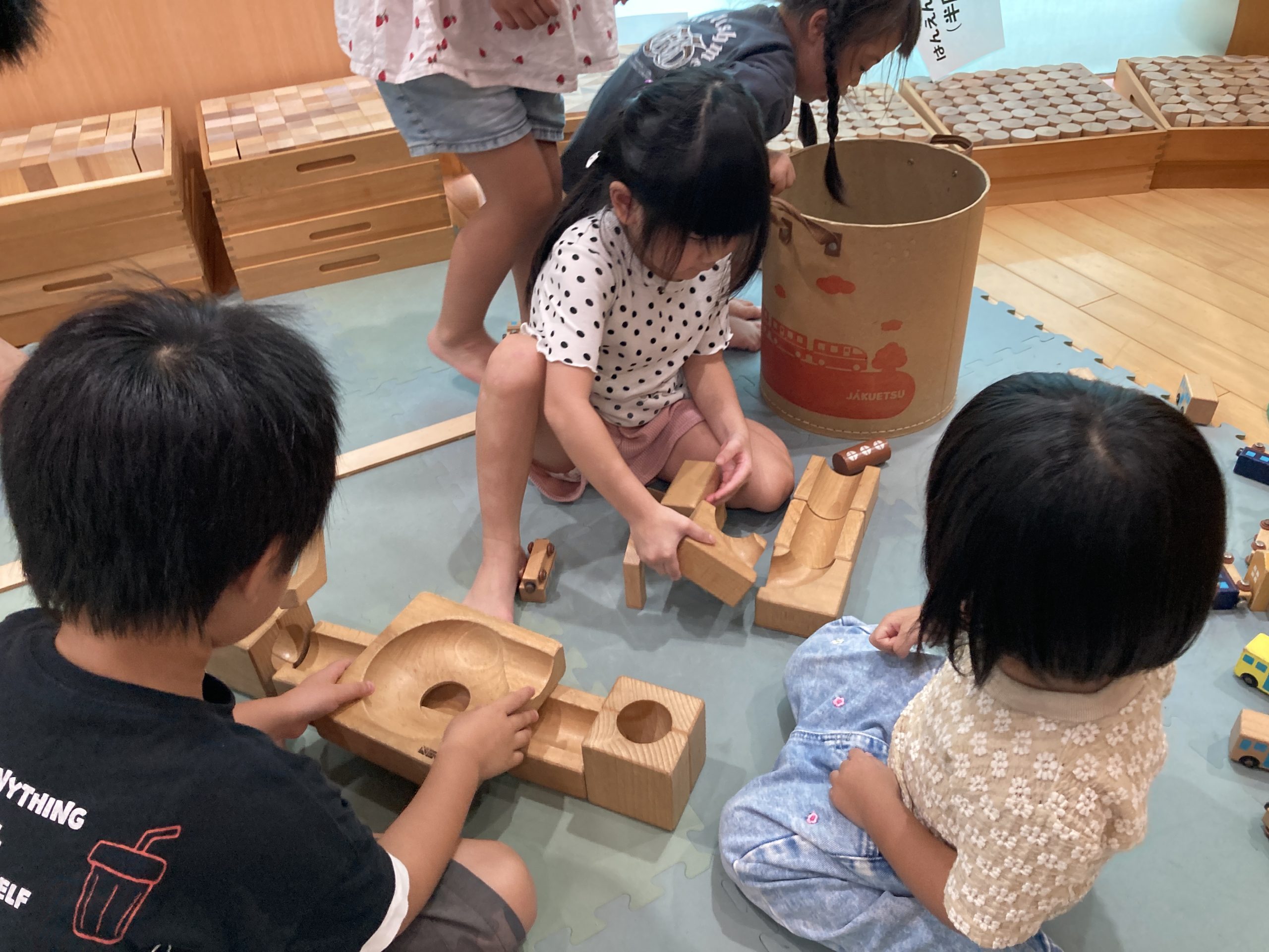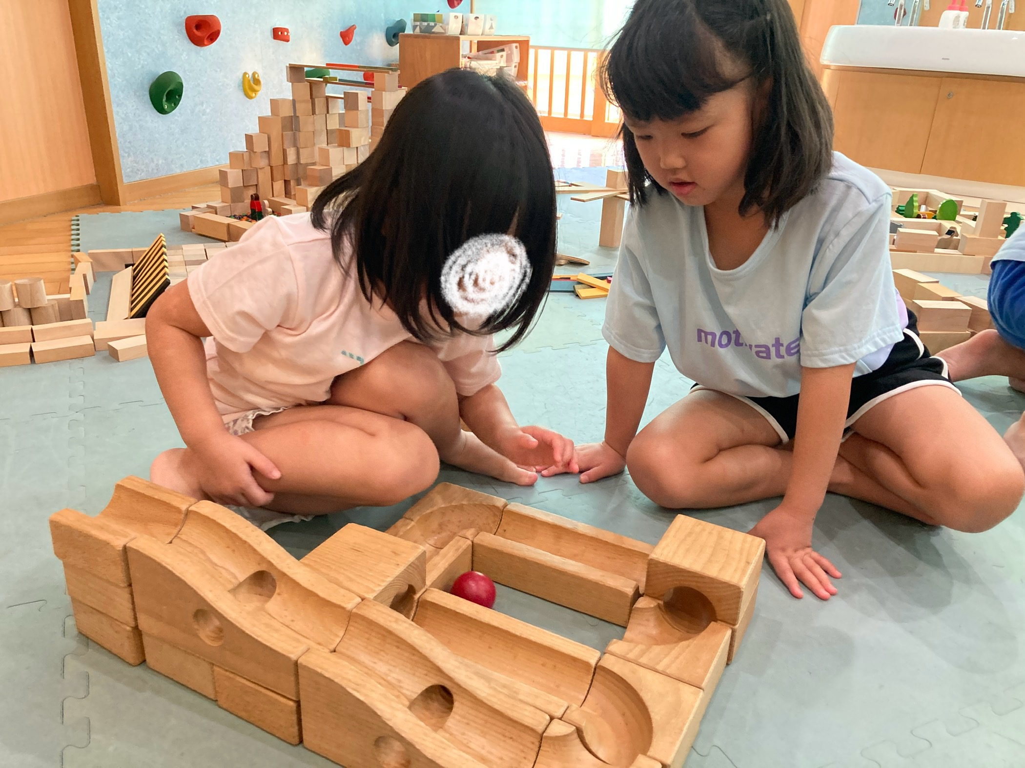 今日は積み木遊びをしました。先週りすきりんぐみさんが作った積み木に道路やクーゲルバーンを繋げて遊びました🚗