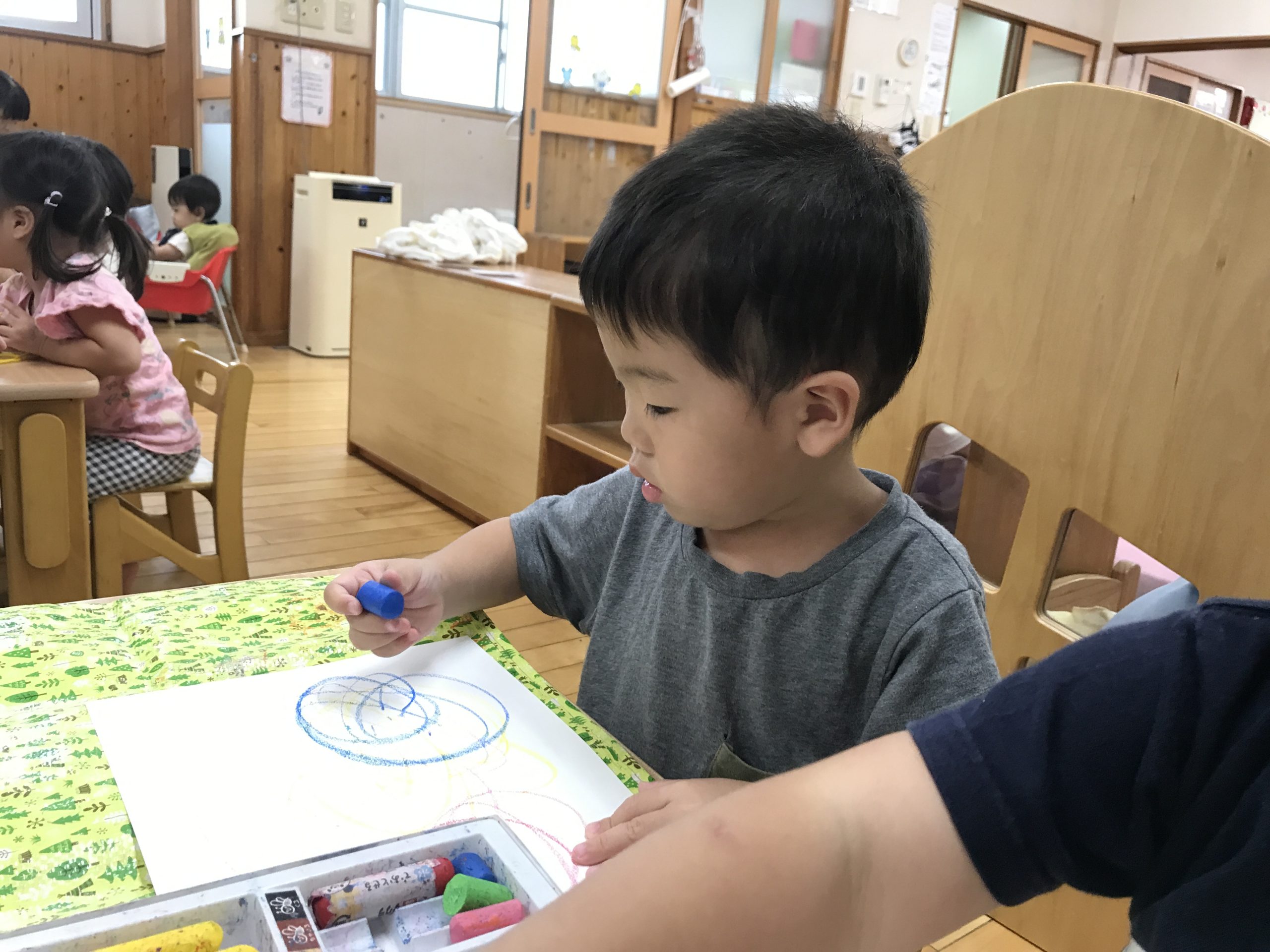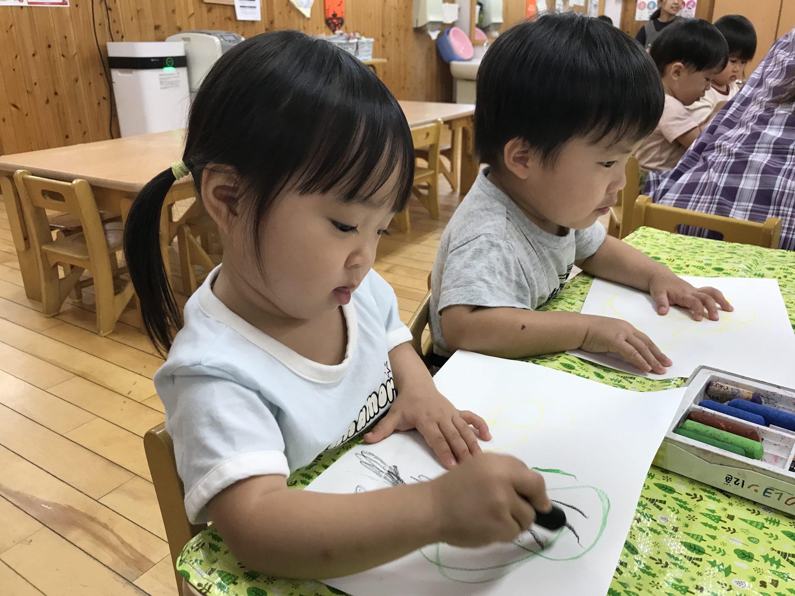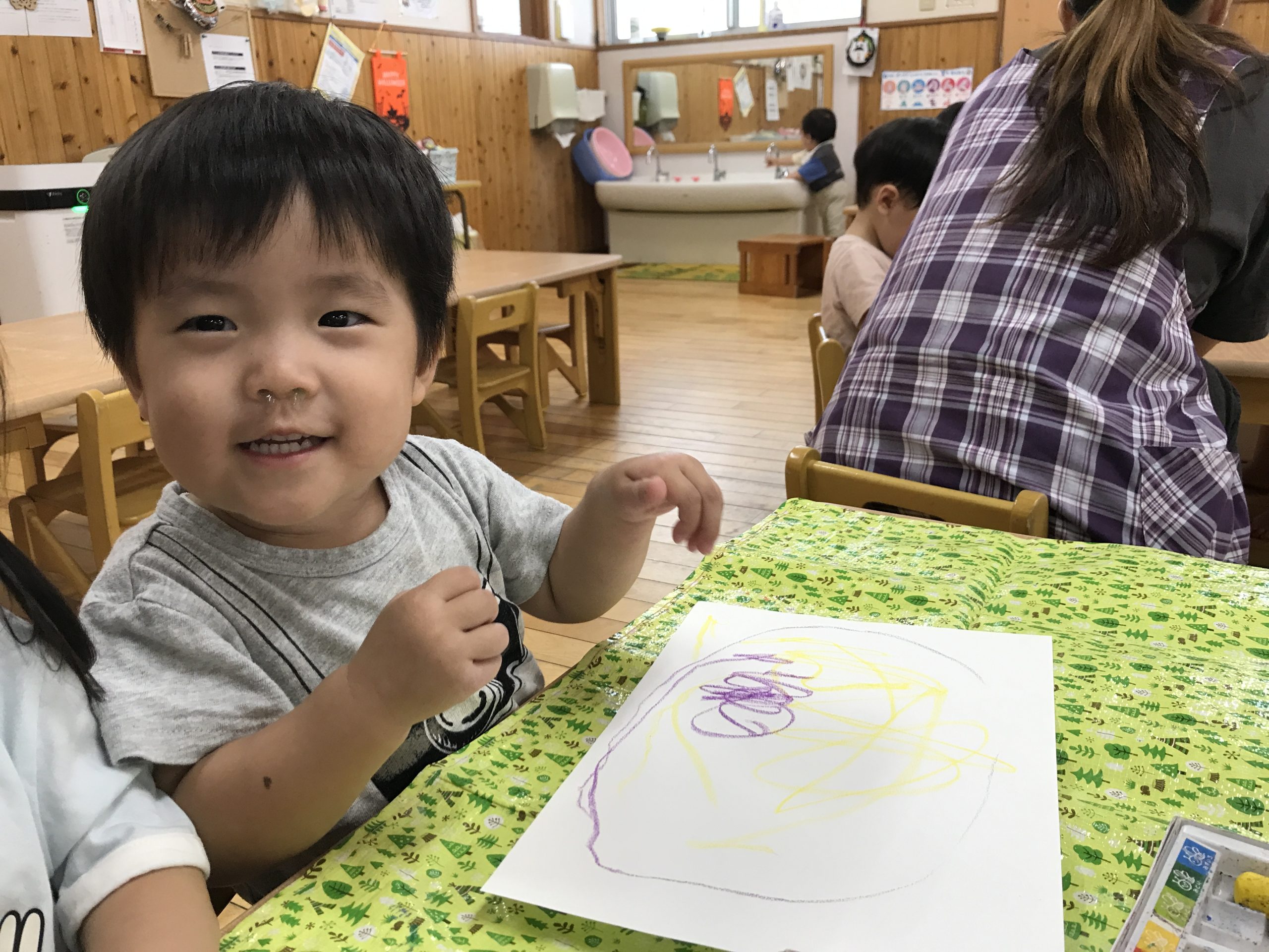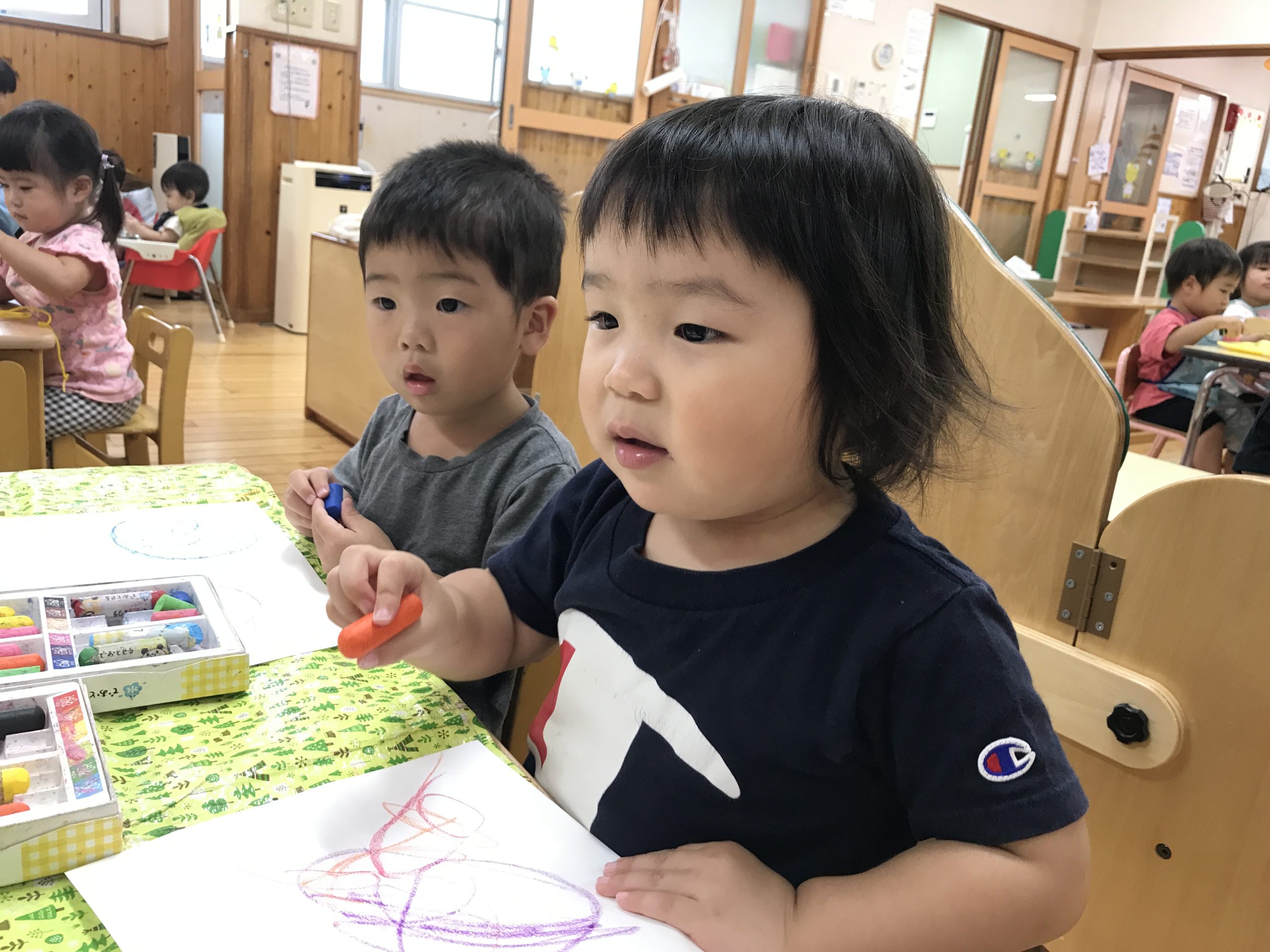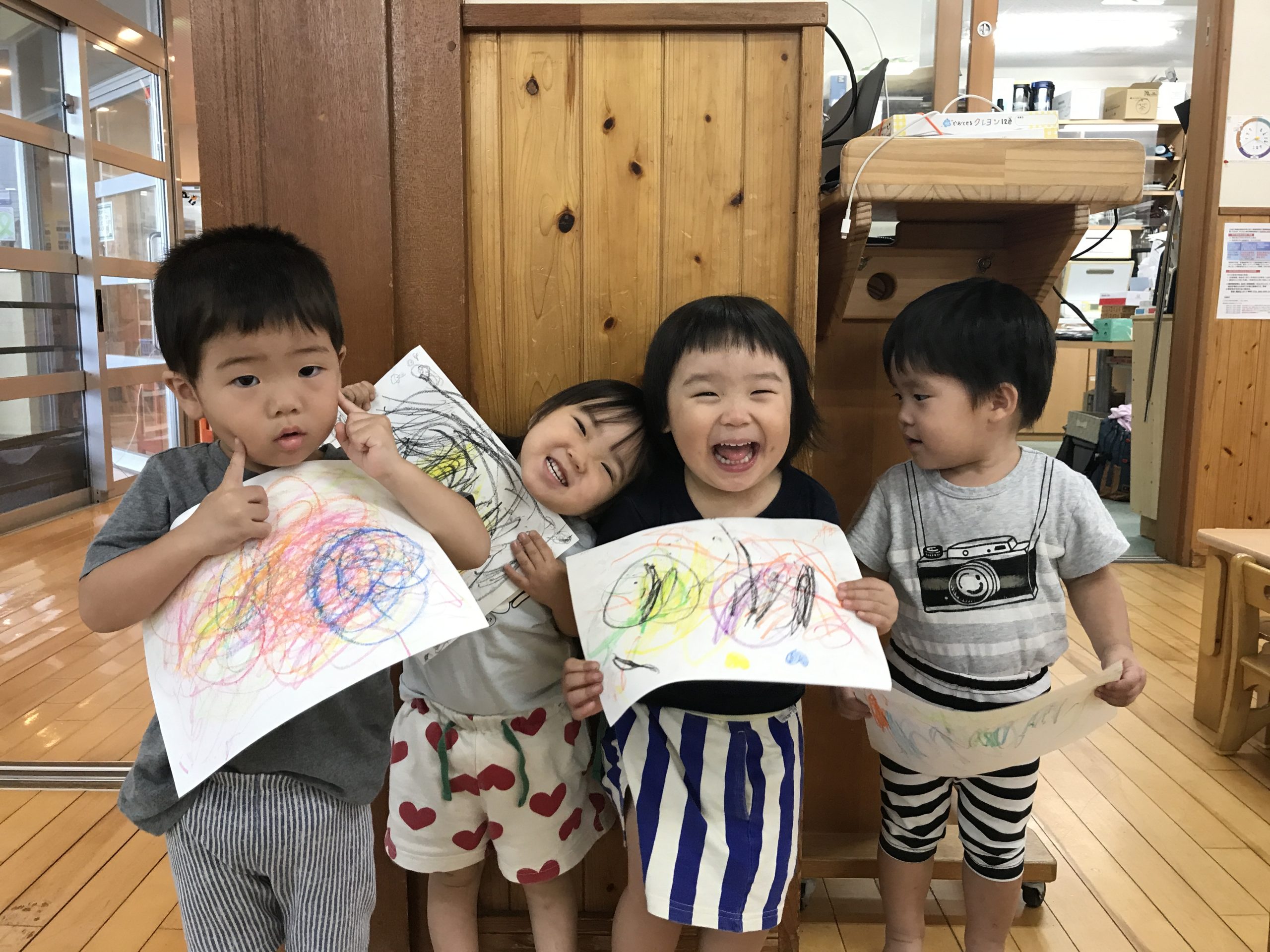 今日はお絵描きをしました✨好きな色のクレヨンを使って紙いっぱいにのびのびと絵を描いていましたよ😊