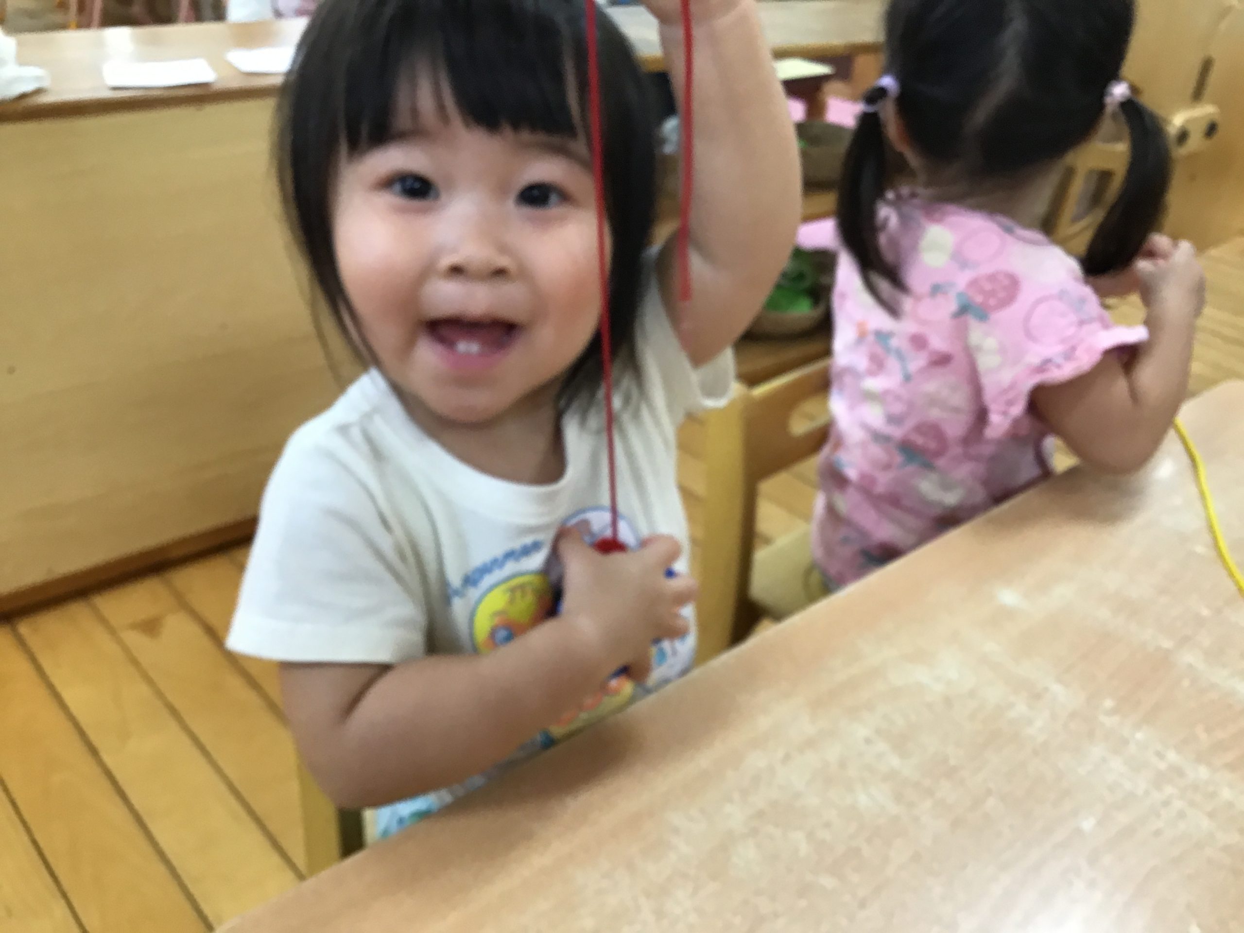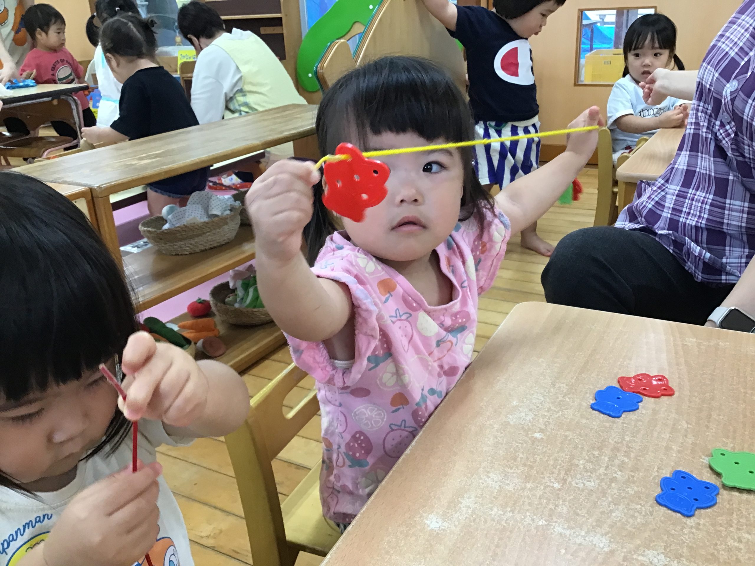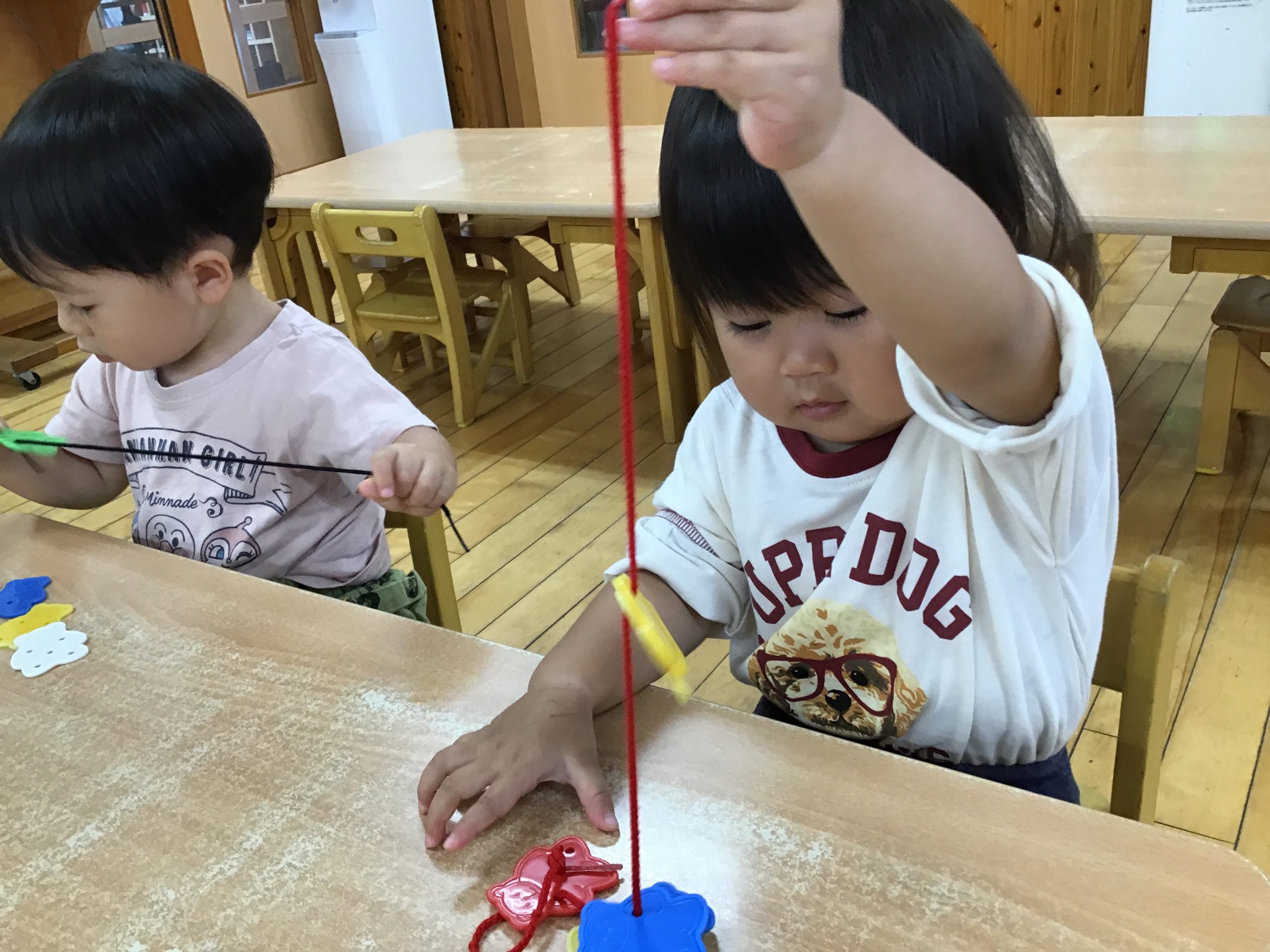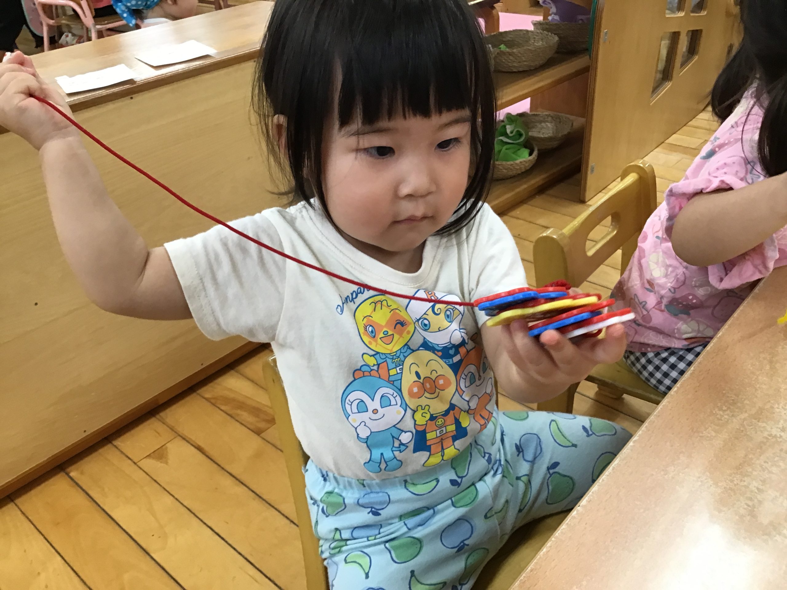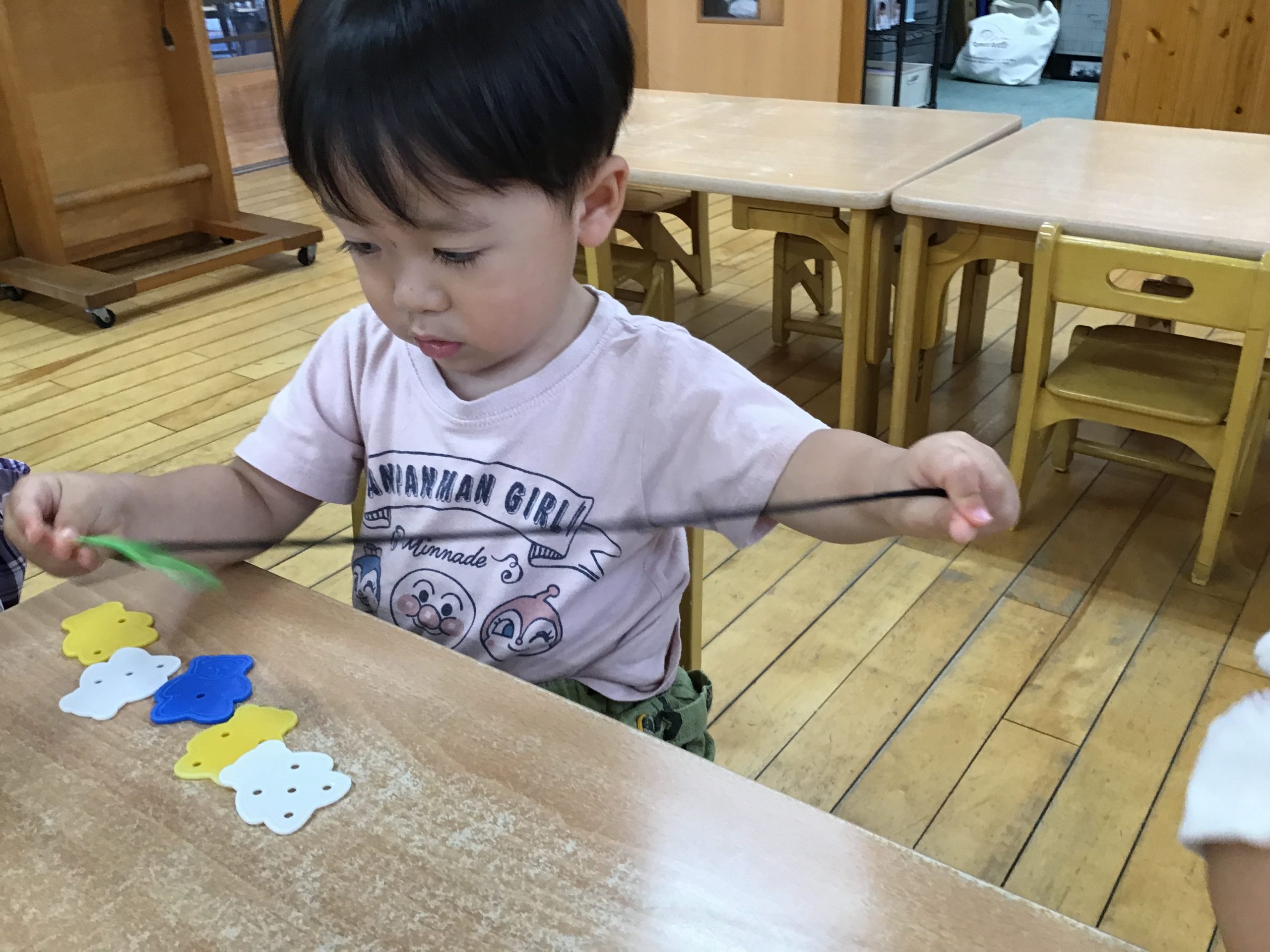 今日は、ひも通しをしました✨保育者のお手本を見た後、とっても上手に通すことができていましたよ‼︎