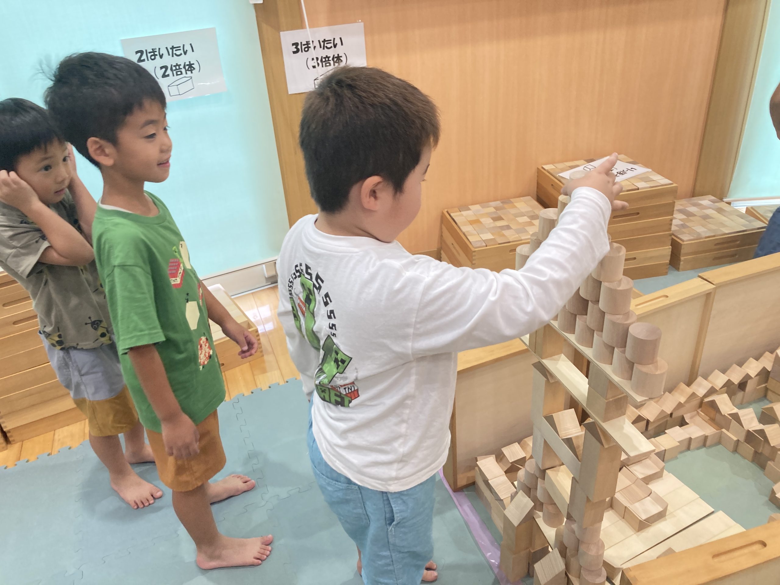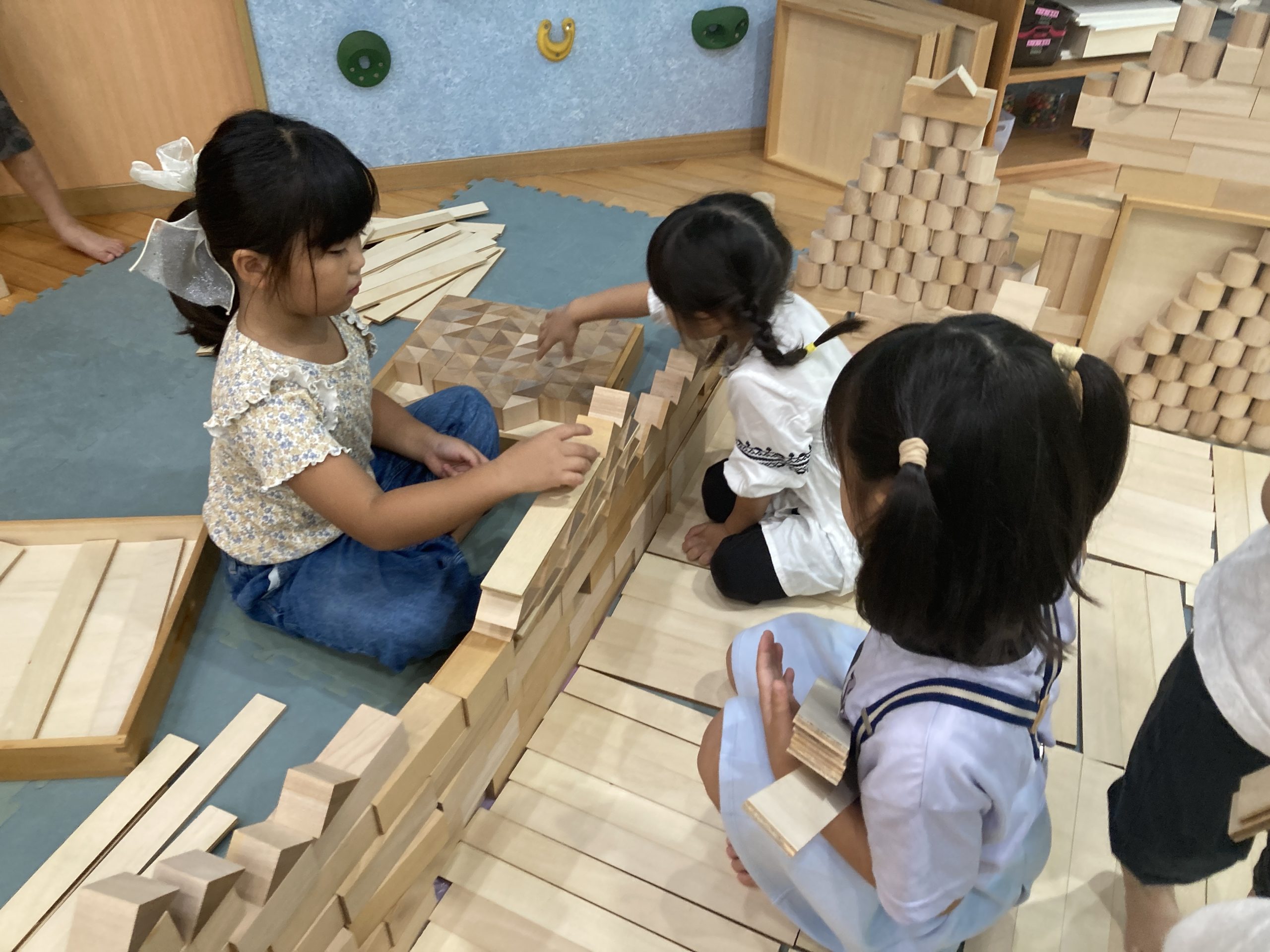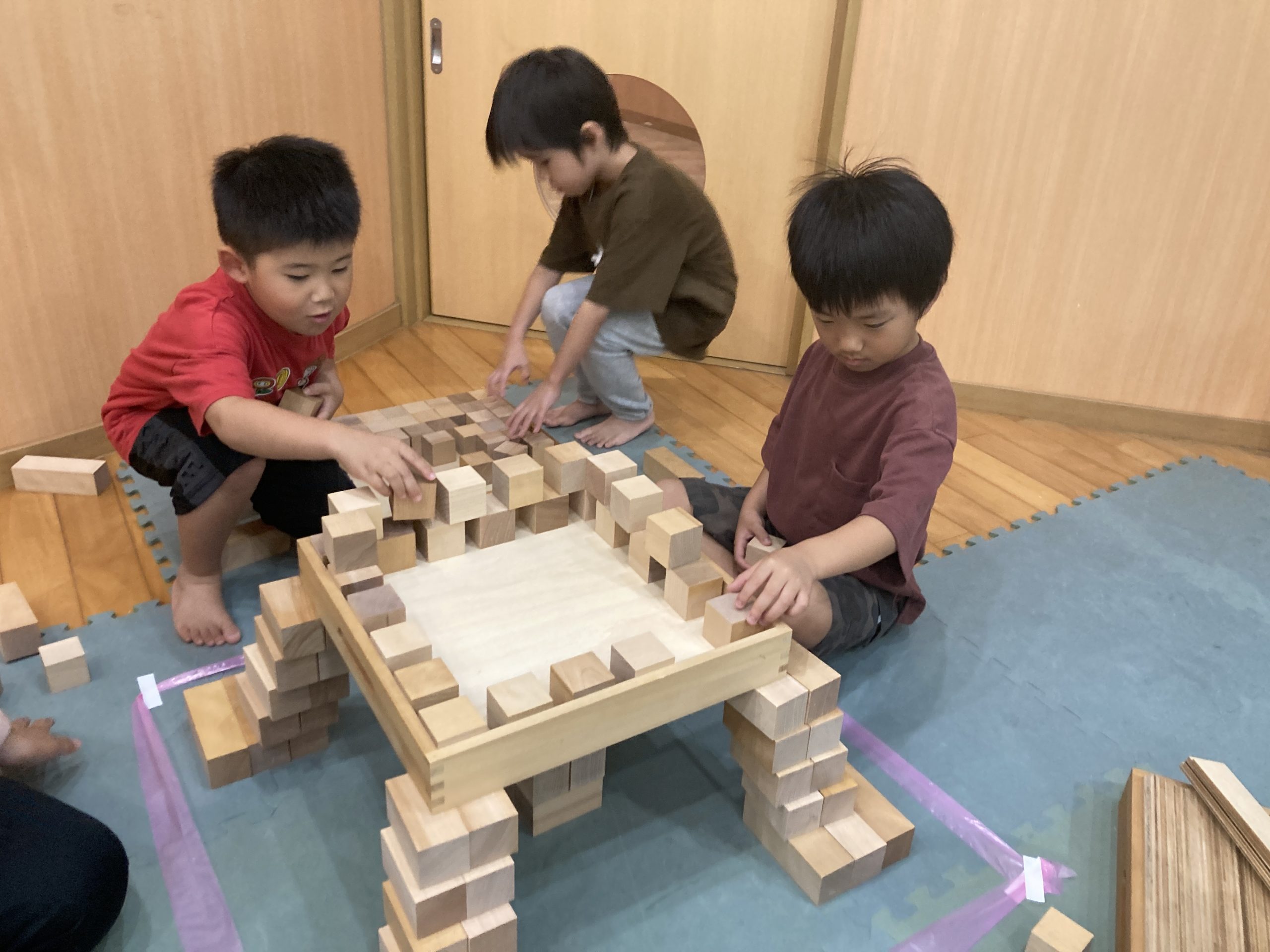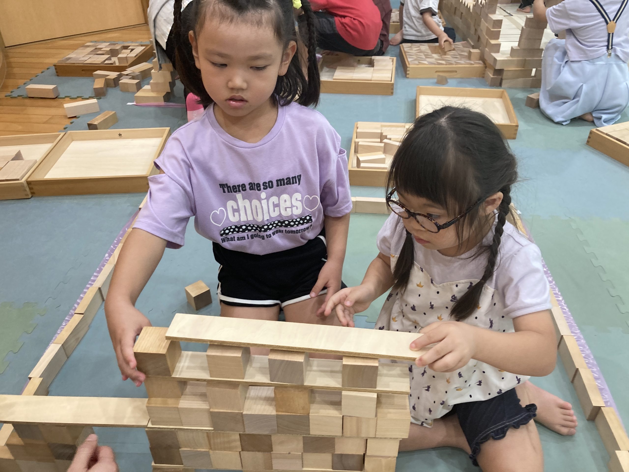 今日は積み木で遊びました。お城やお家、ホテル、東京タワーなど、作りたいものをお友達と一緒に作りました🗼バランスを考えながら高く積んだり自分たちが入れるくらい大きく作ったり楽しそうに作っていました🏰✨