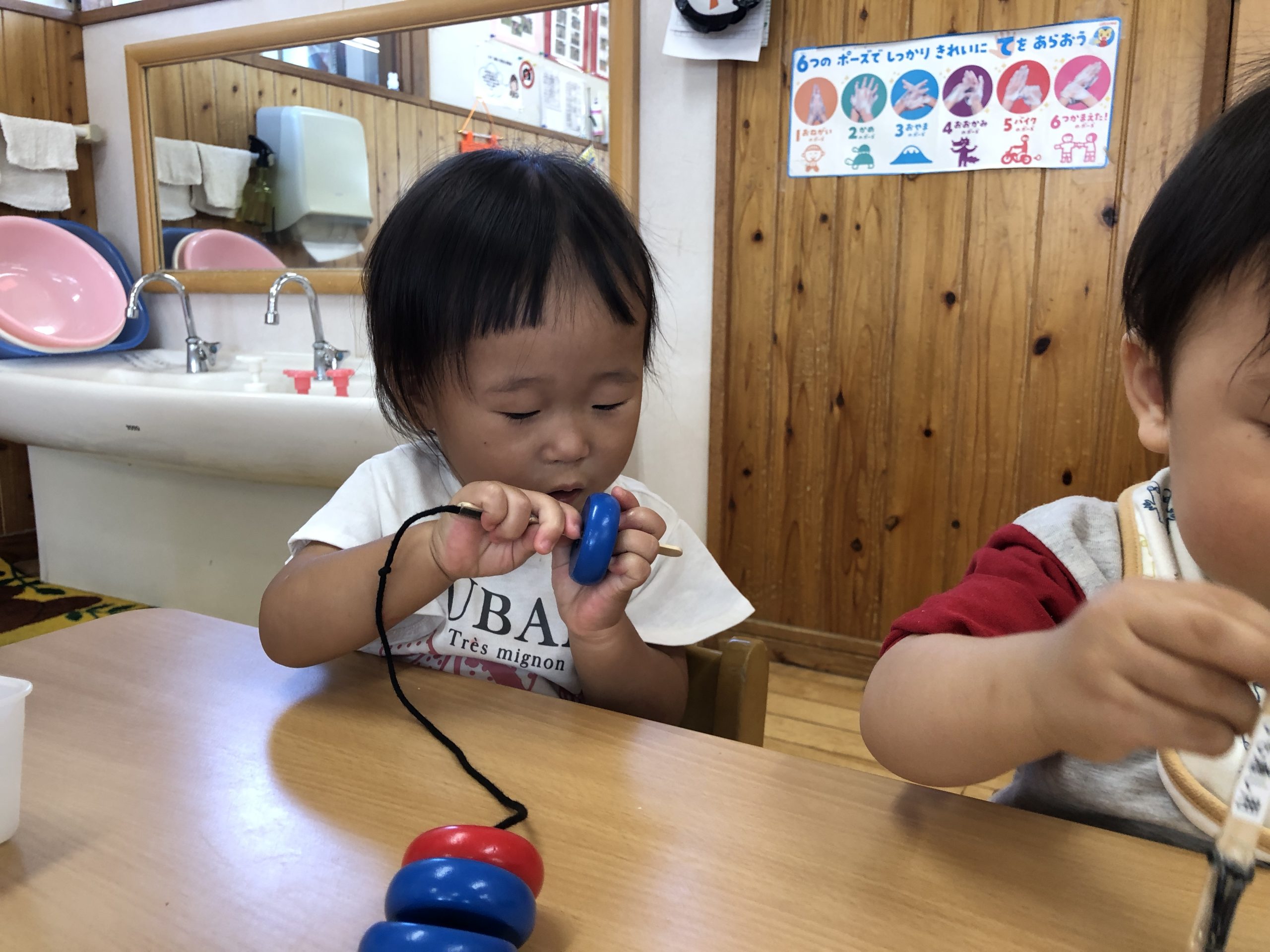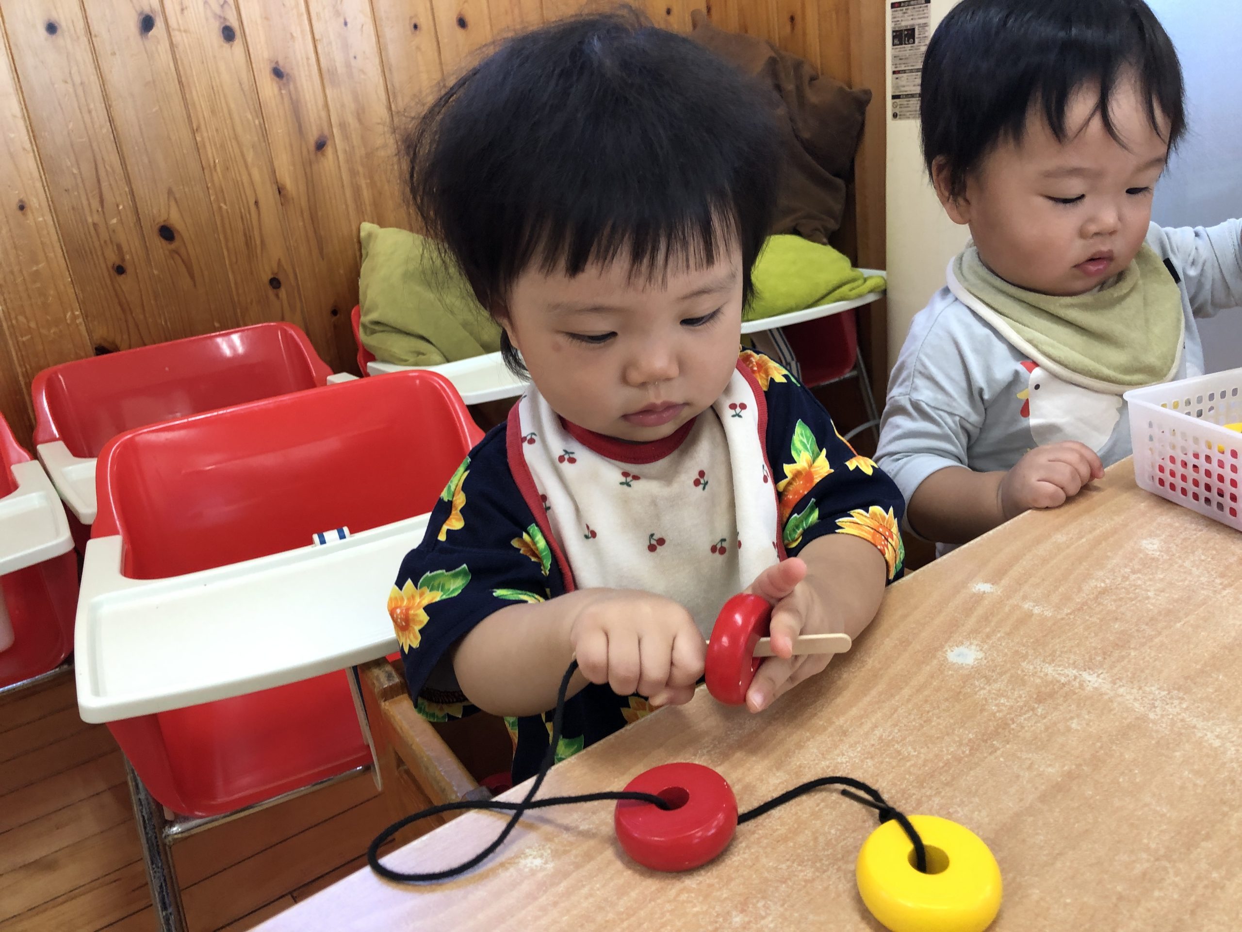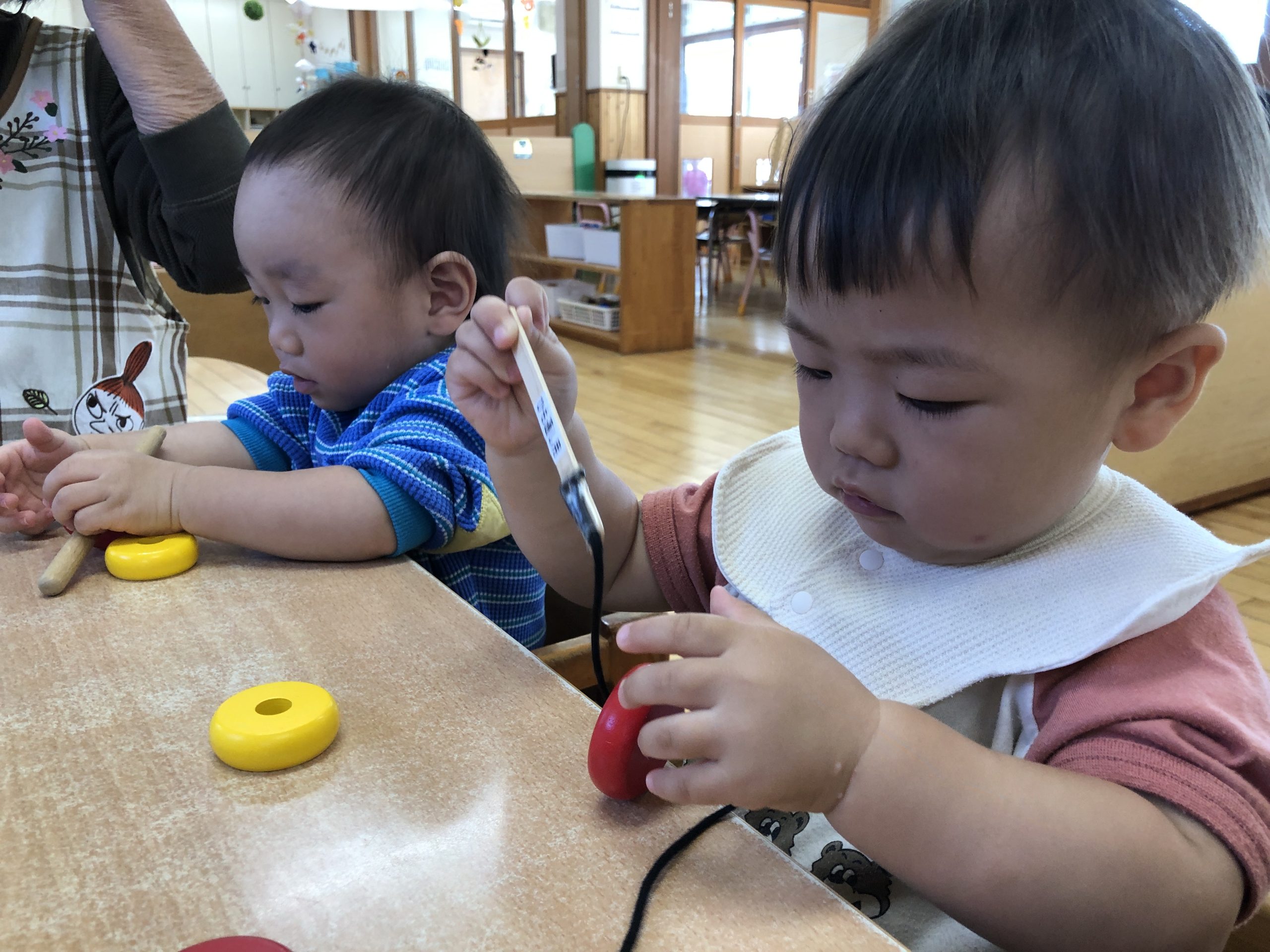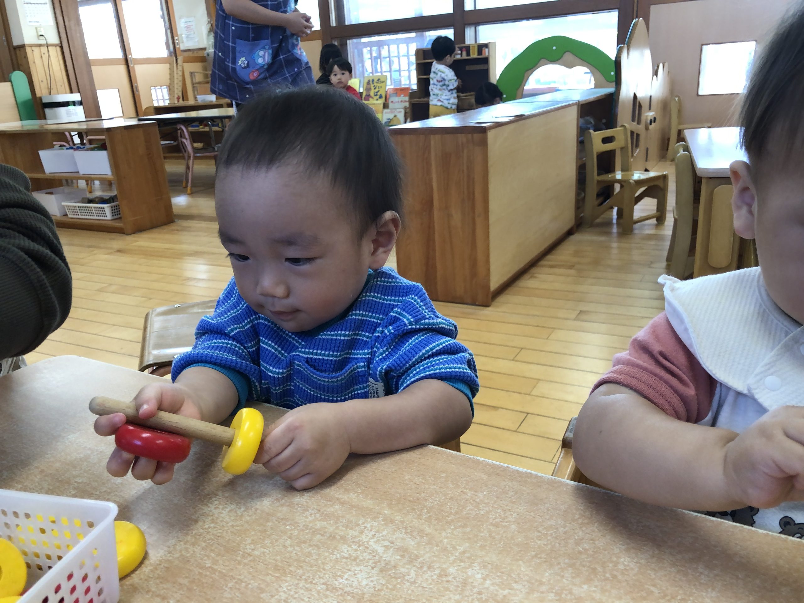 今日は、棒・紐通しおもちゃであそびました。輪っかを通すことは分かって、一生懸命通そうと挑戦していました♬上手く棒や紐のついたスティックに通ると嬉しそうにしていましたよ☆彡