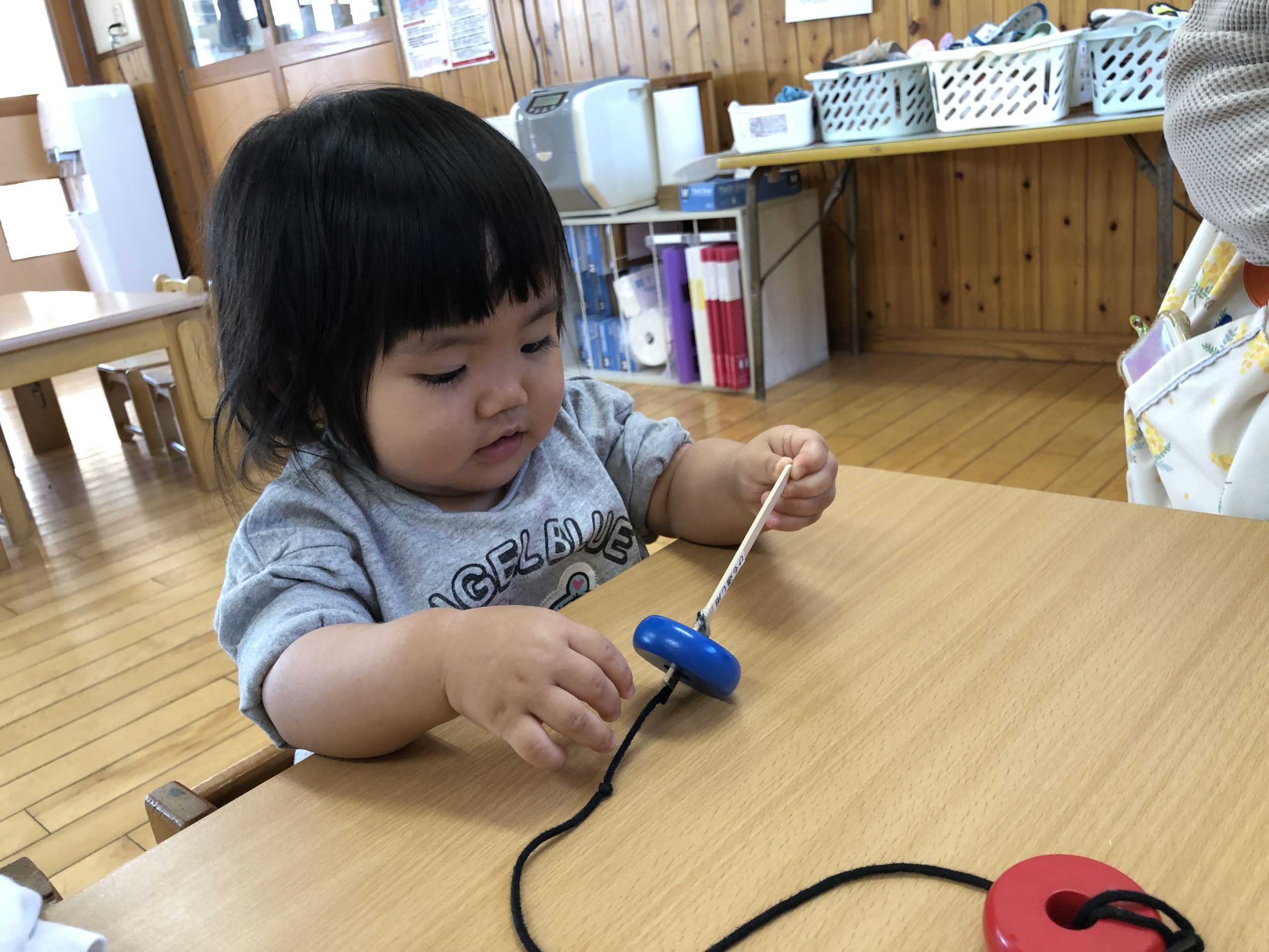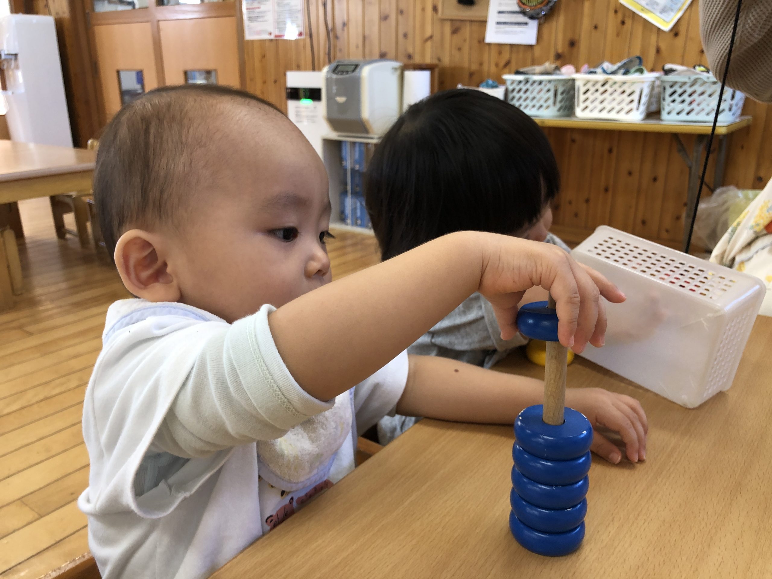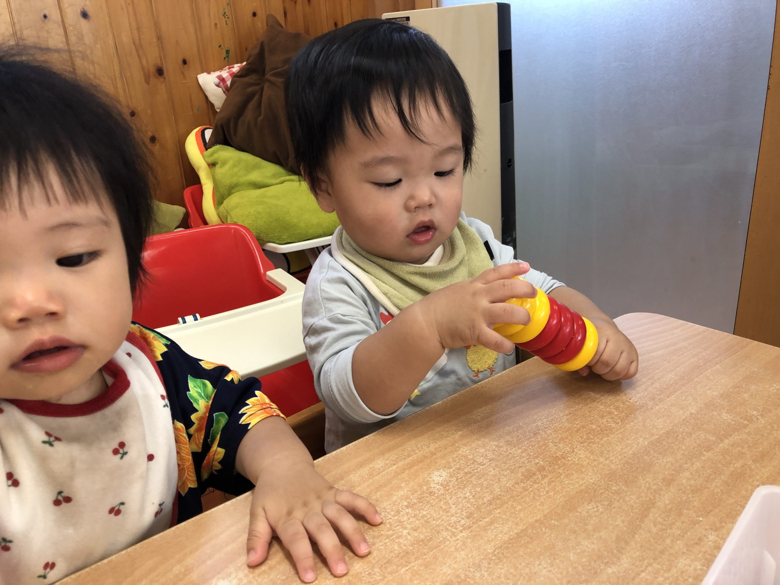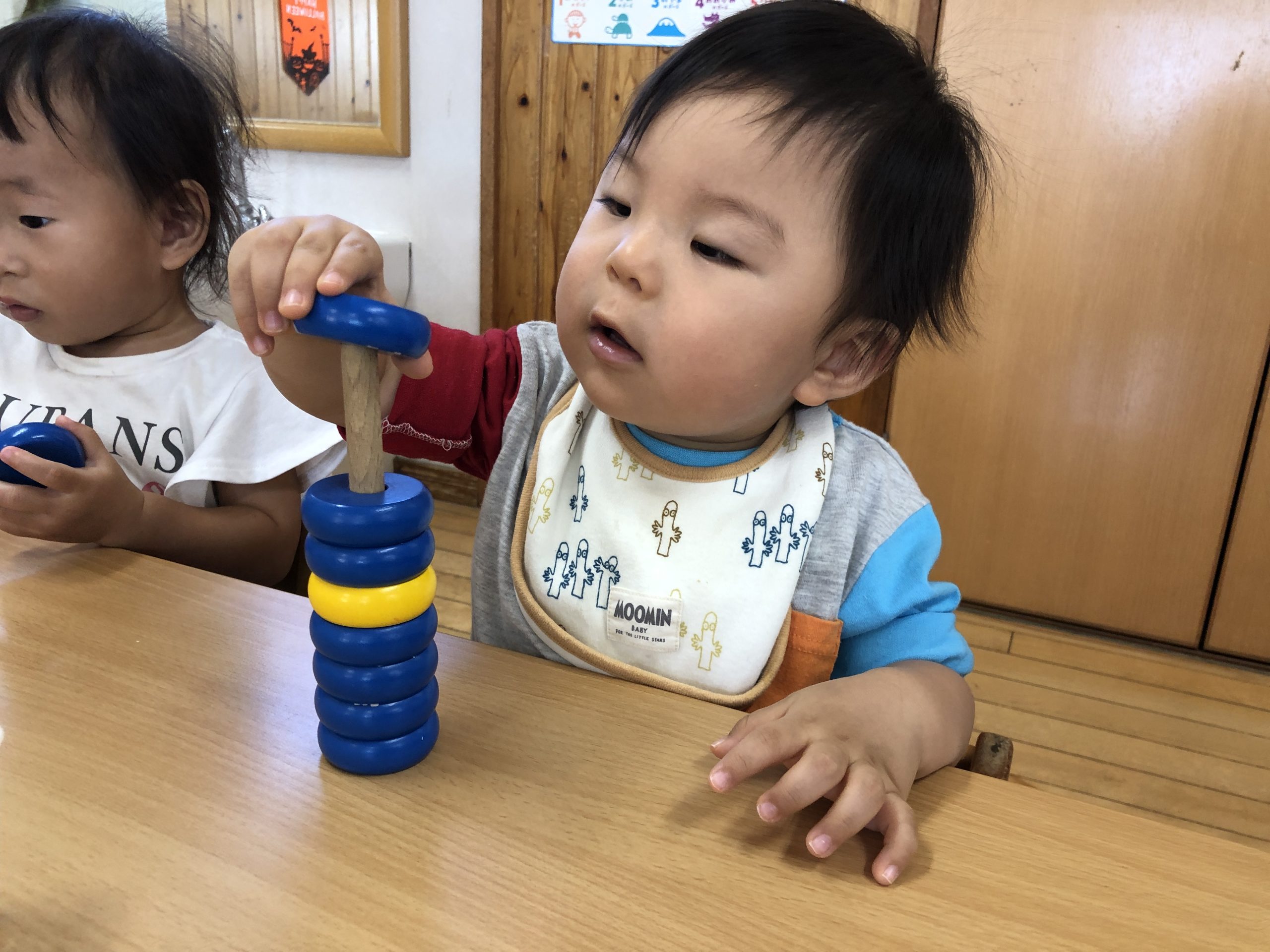 今日は、棒・紐通しおもちゃであそびました。輪っかを通すことは分かって、一生懸命通そうと挑戦していました♬上手く棒や紐のついたスティックに通ると嬉しそうにしていましたよ☆彡