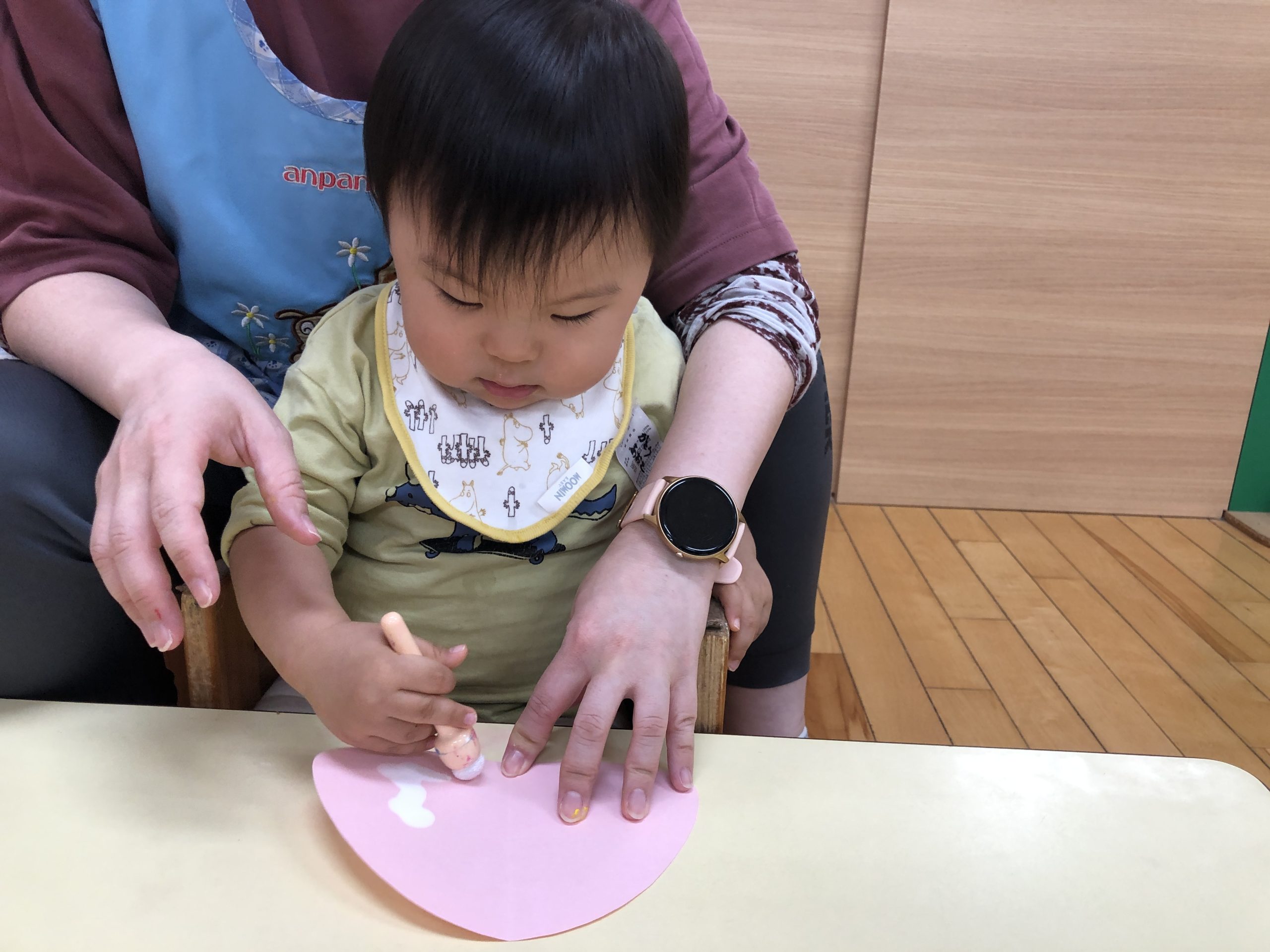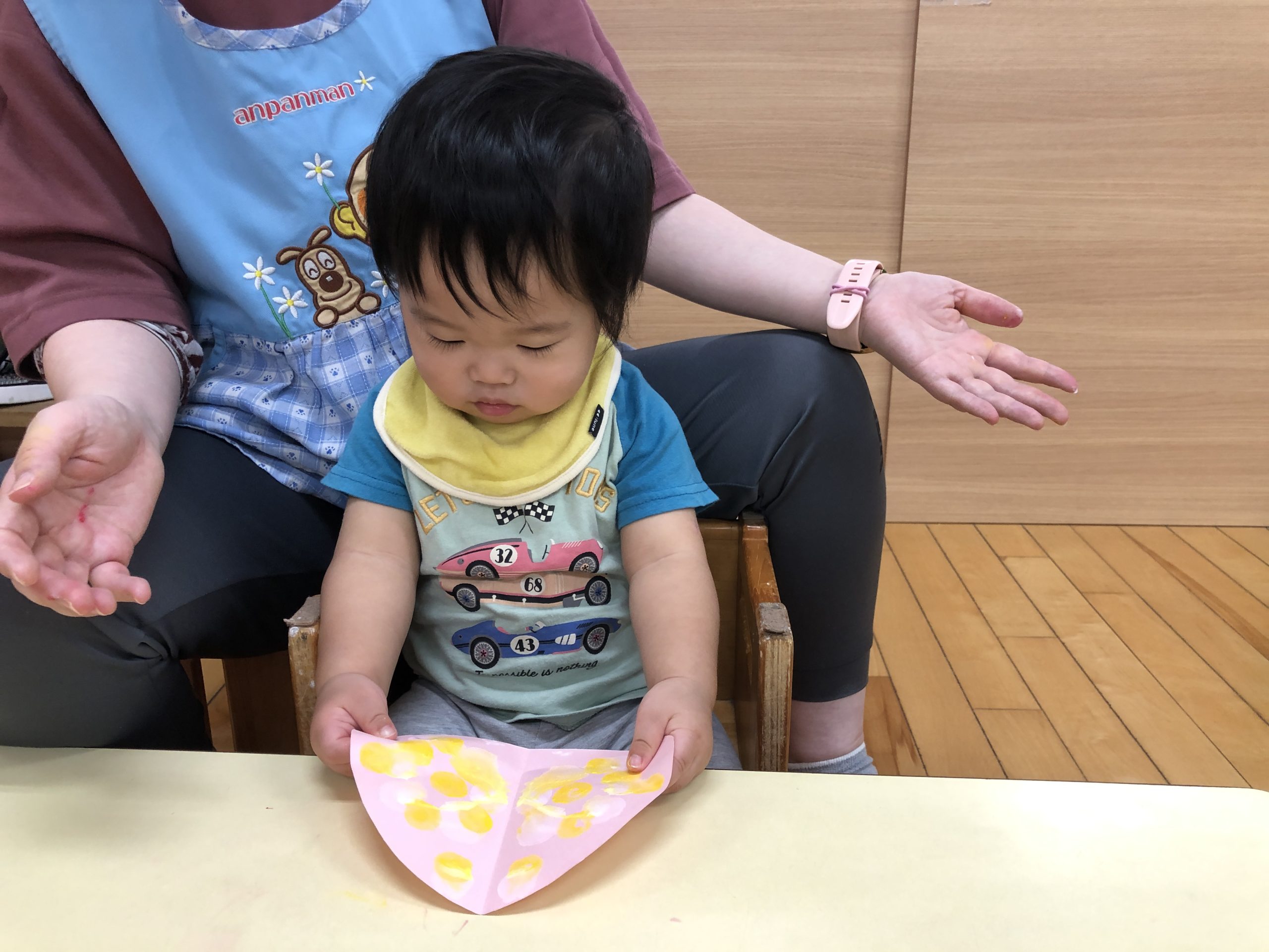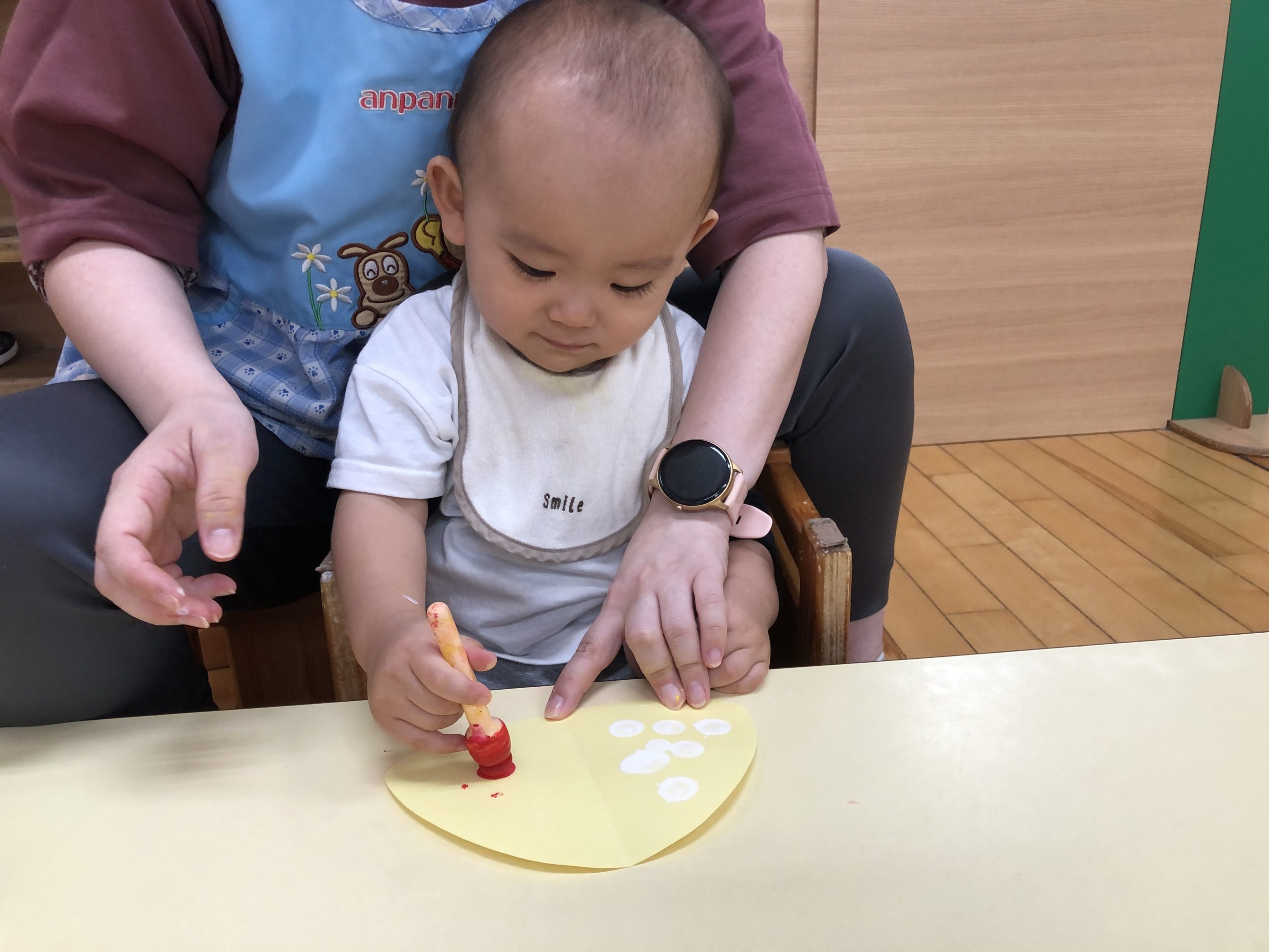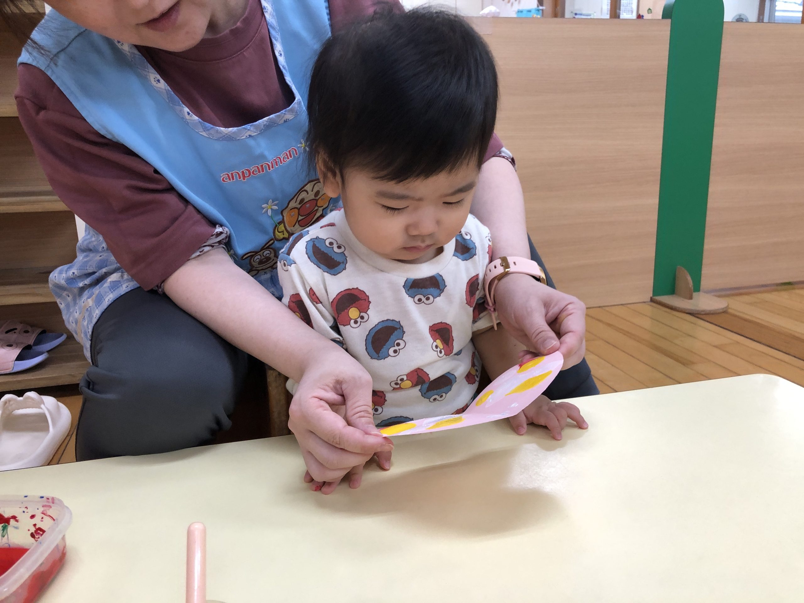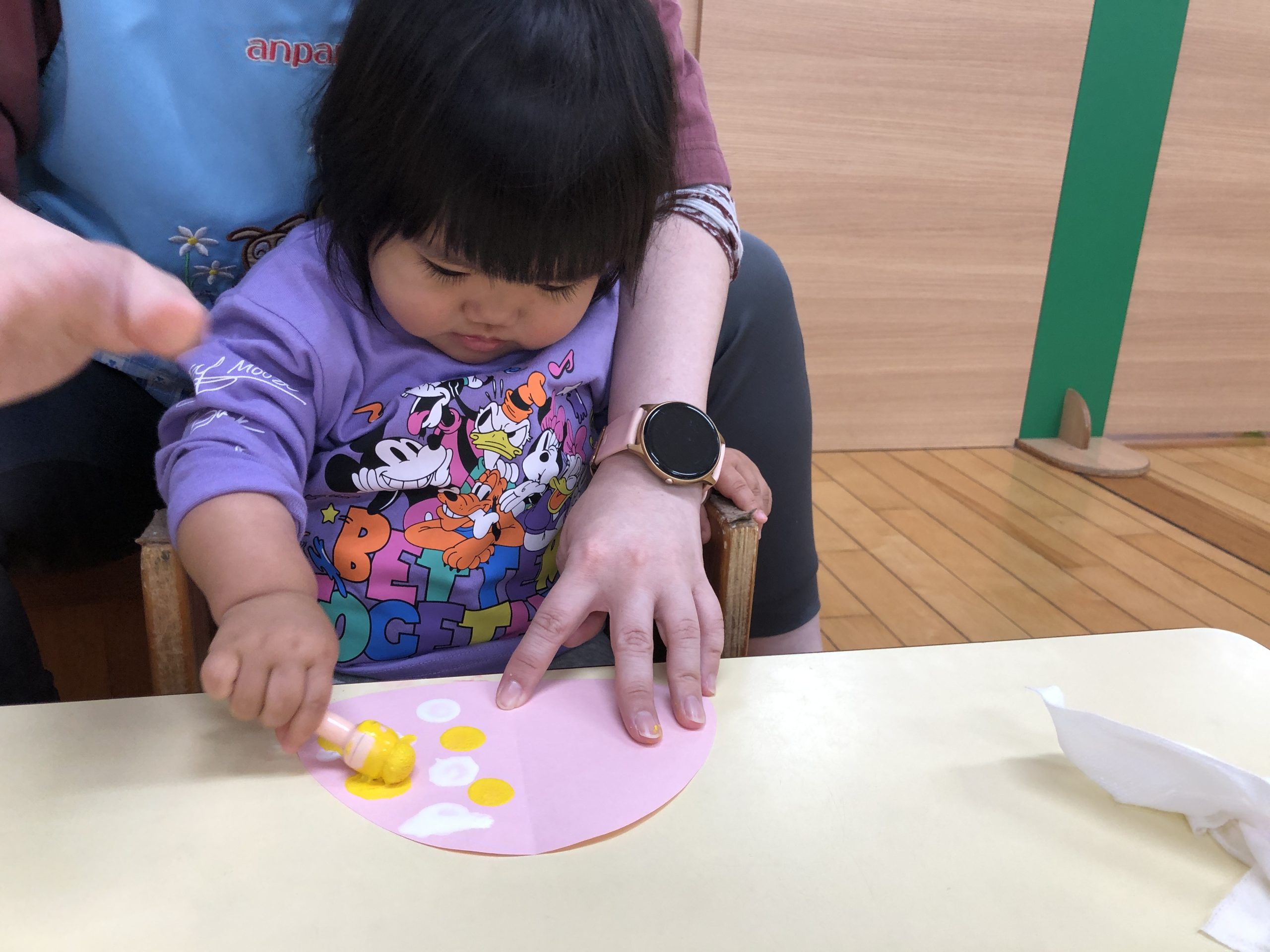 今日は、絵の具を使ってデカルコマニーあそびしました。スタンプ棒でポンポン押して絵の具を付けるのを楽しんだり、画用紙を閉じて開いて模様の変化をみましたよ☆彡