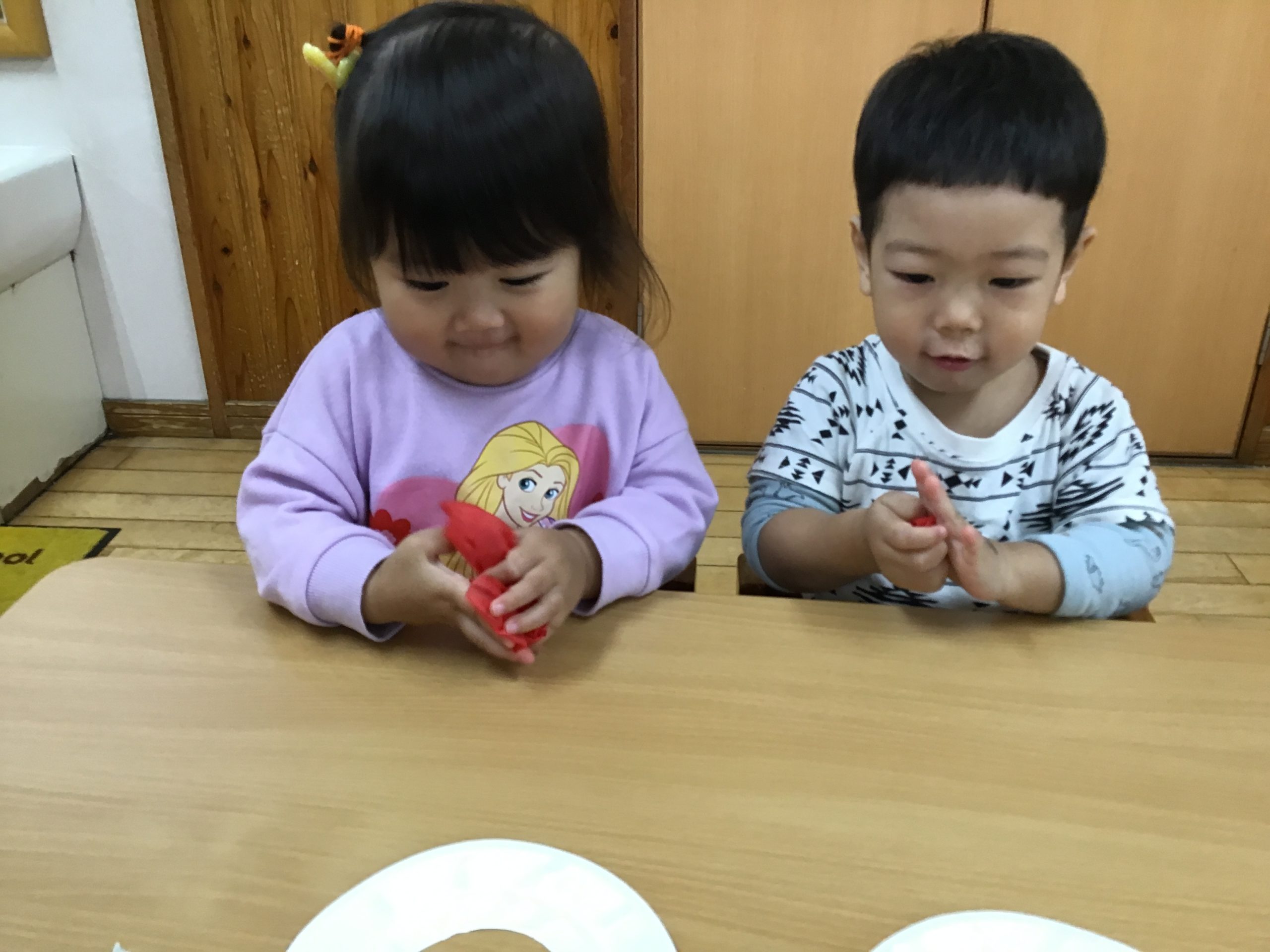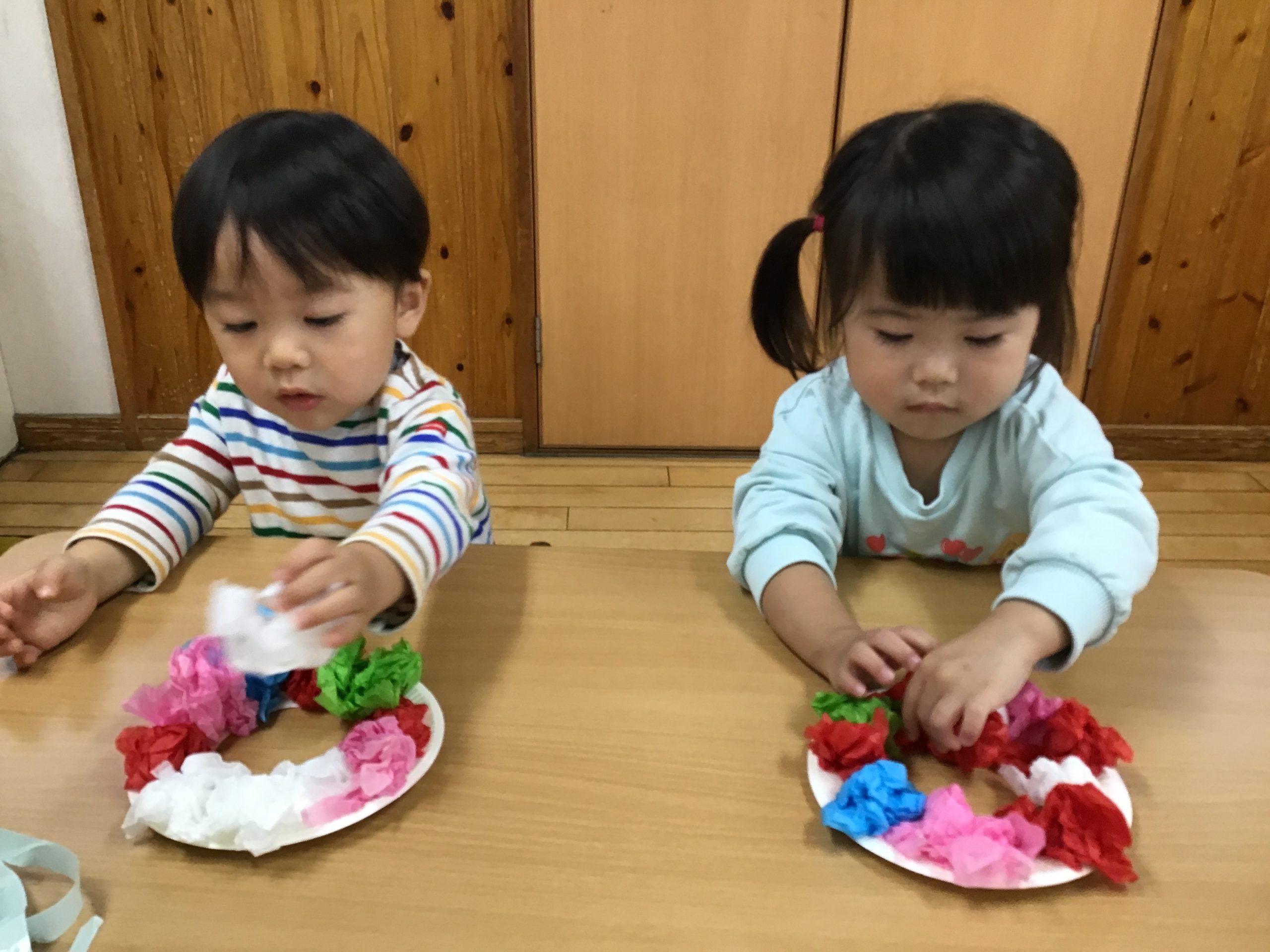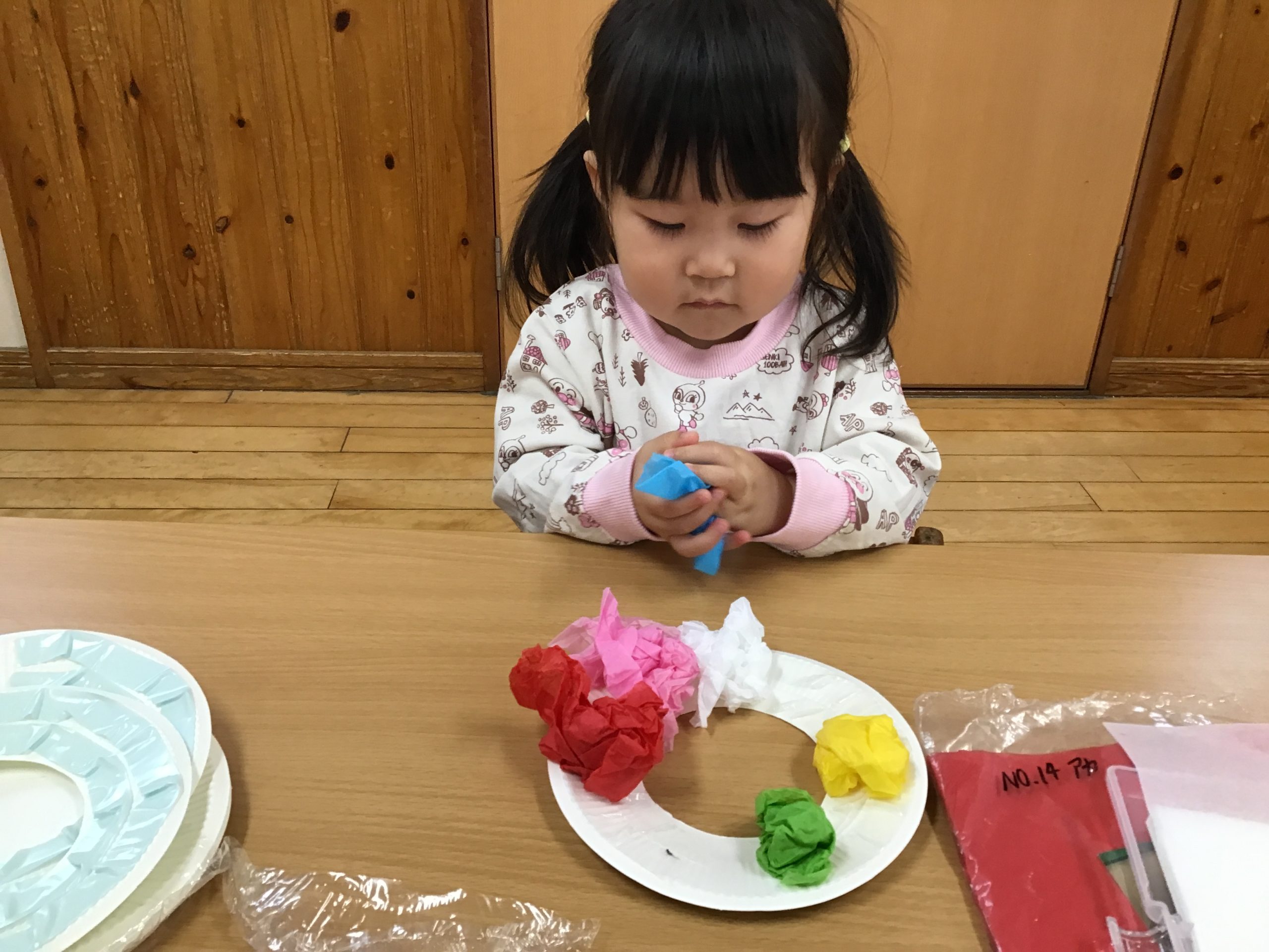今日は、クリスマス製作をしました✨好きな色の花紙を手で丸めて、紙皿に貼って、リースを作りました〜😊