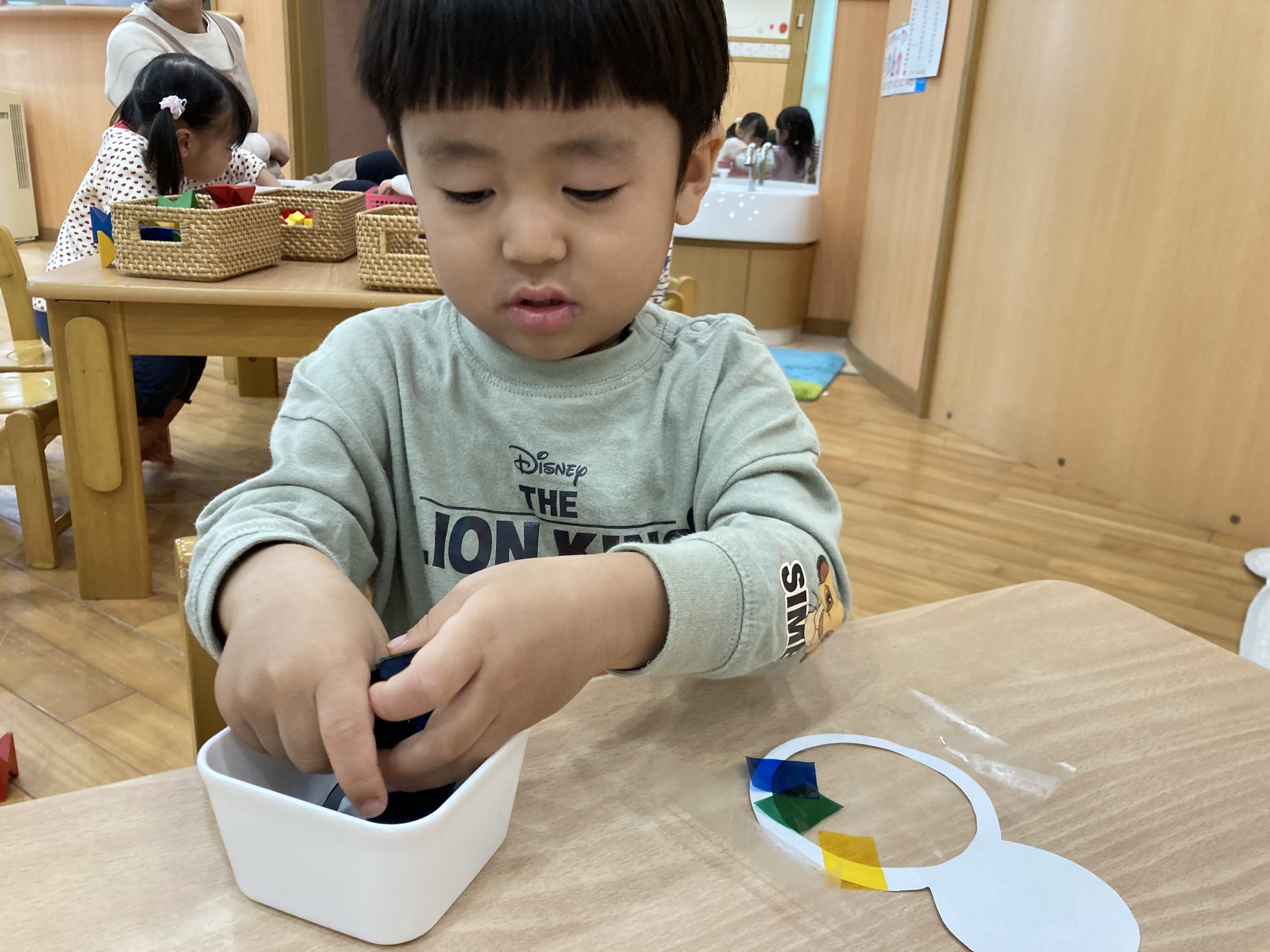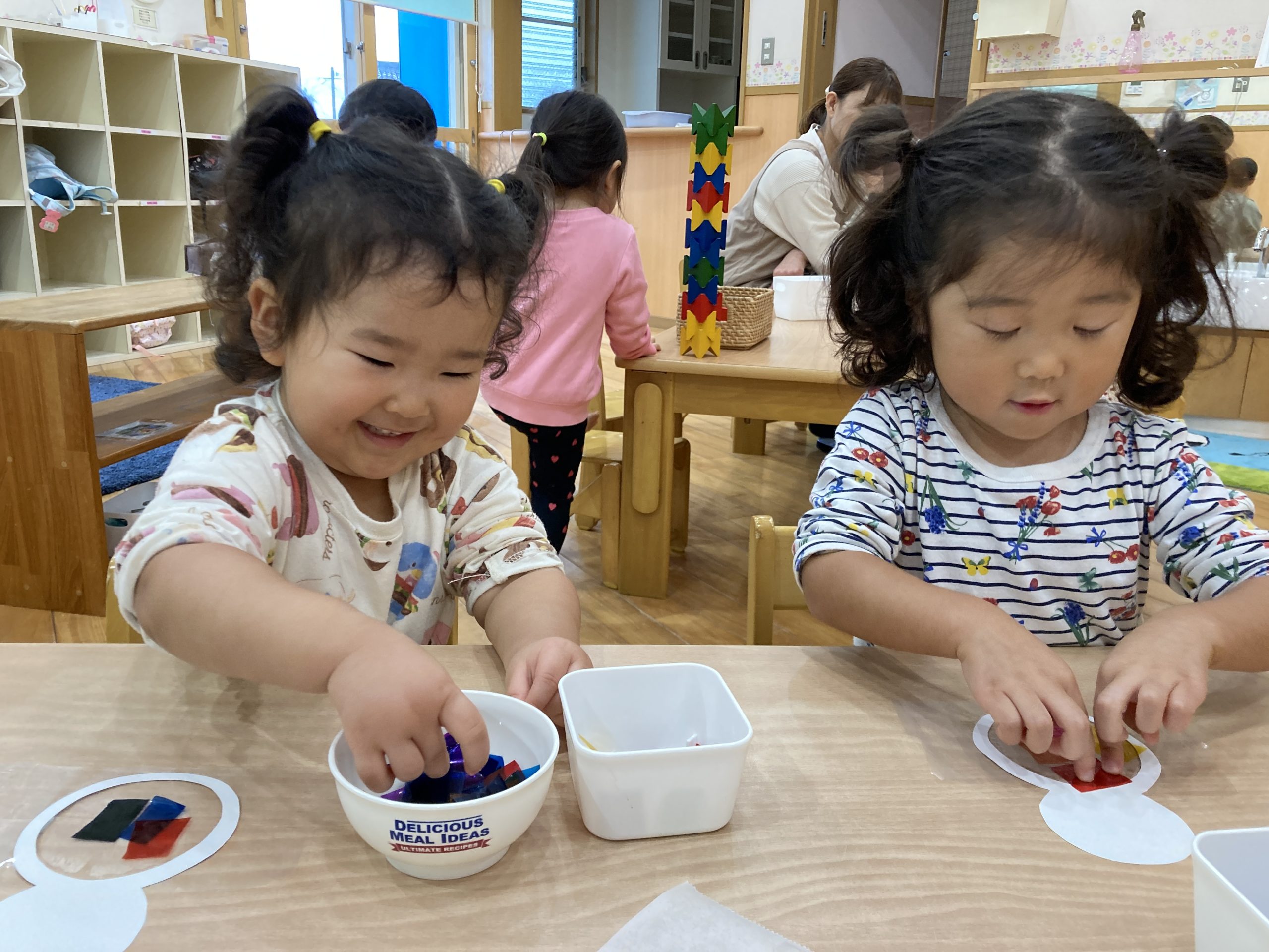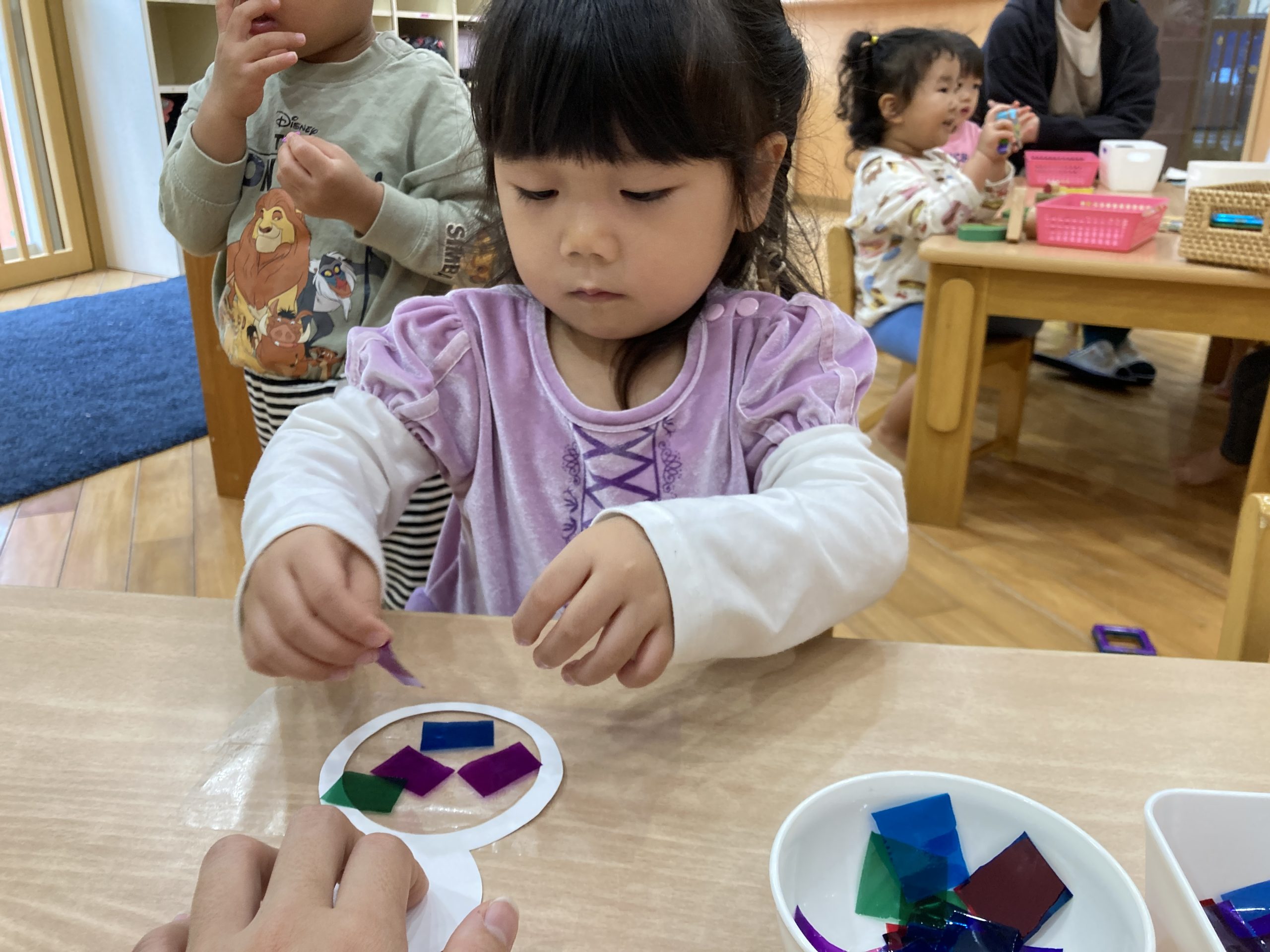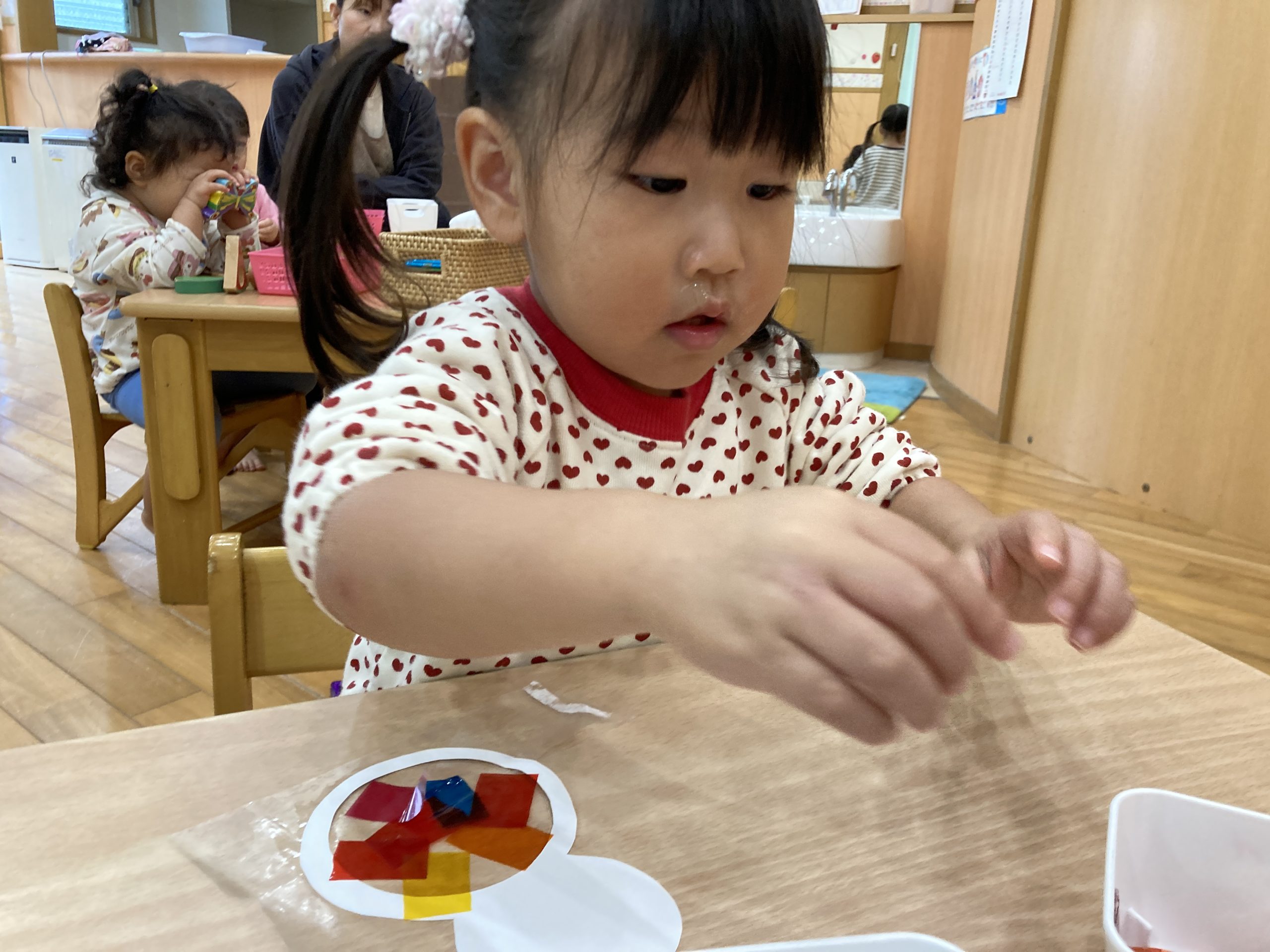 今日は、昨日のクリスマスの製作の続きをしました🎅✨雪だるまの台紙にカラーセロハンをペタペタと貼り付けました❄カラフルな雪だるまが出来上がっていましたよ🎶