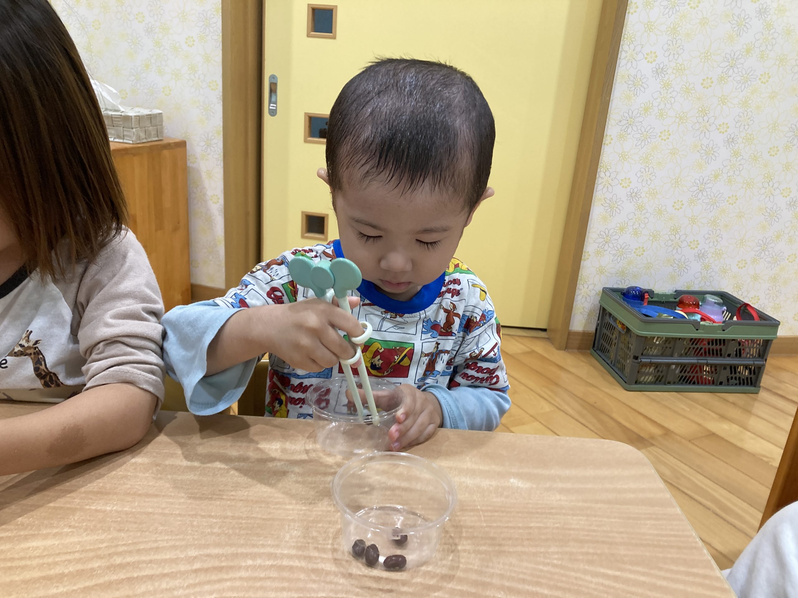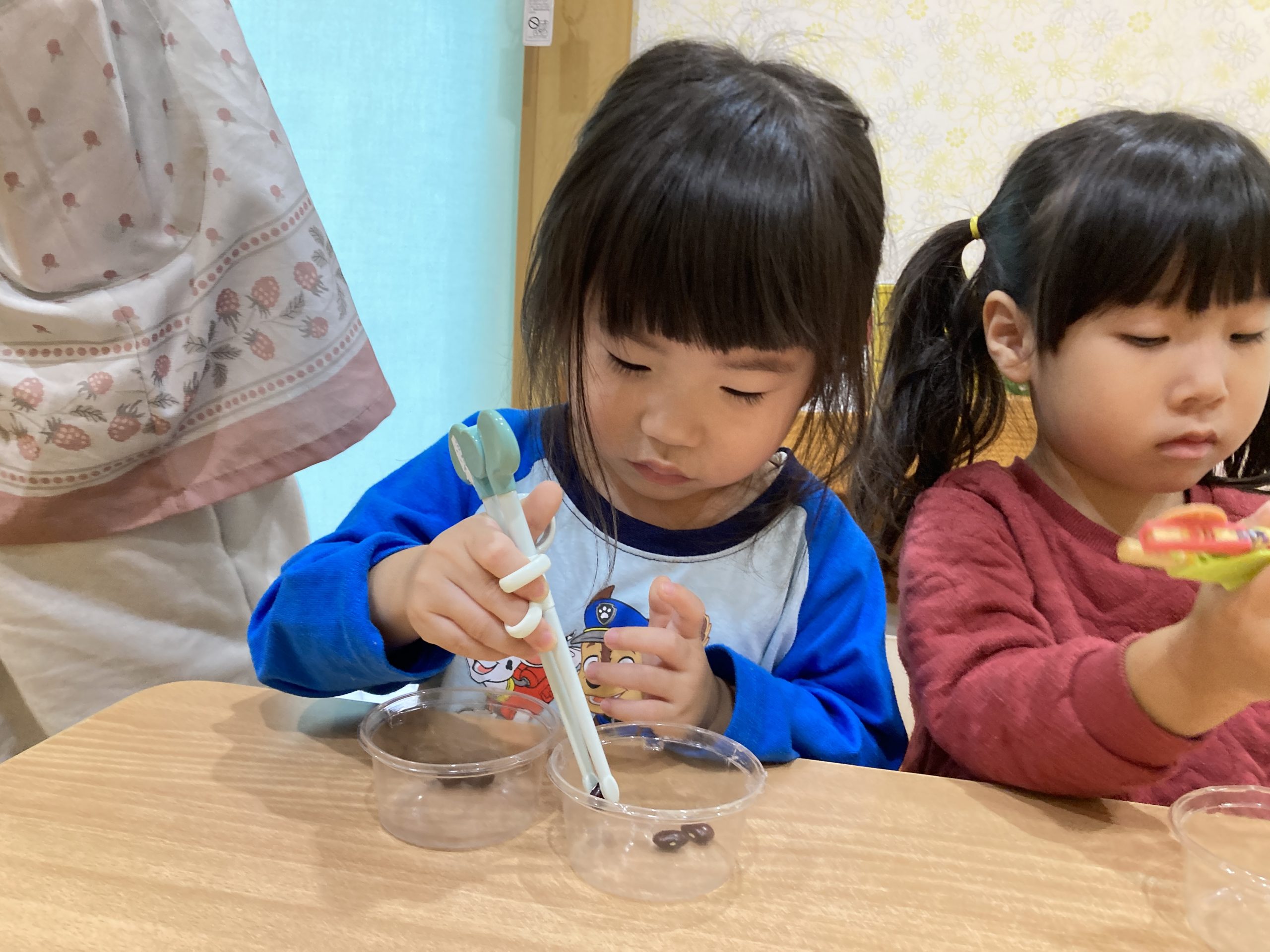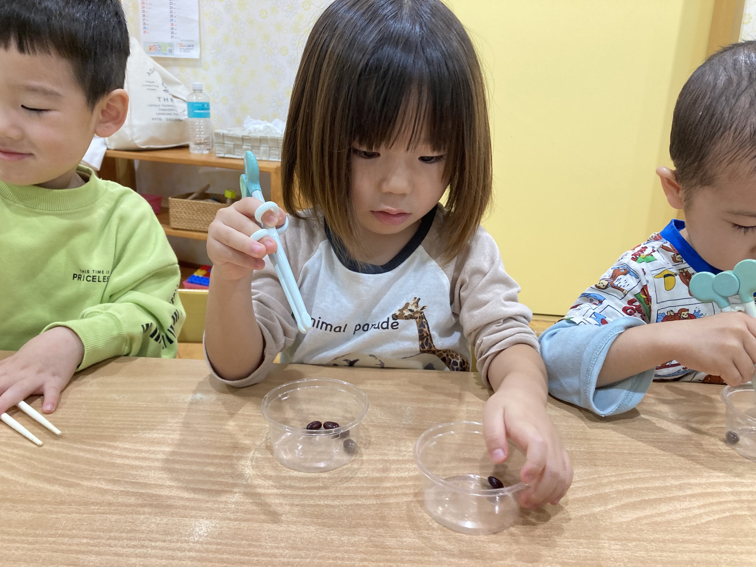 今日は、豆うつしをしました!アンパンマンのお箸やエジソン箸を使って、スポンジや豆をうつす練習をしました。みんな集中して取り組み、上手に豆をうつすことができていましたよ🐰✨