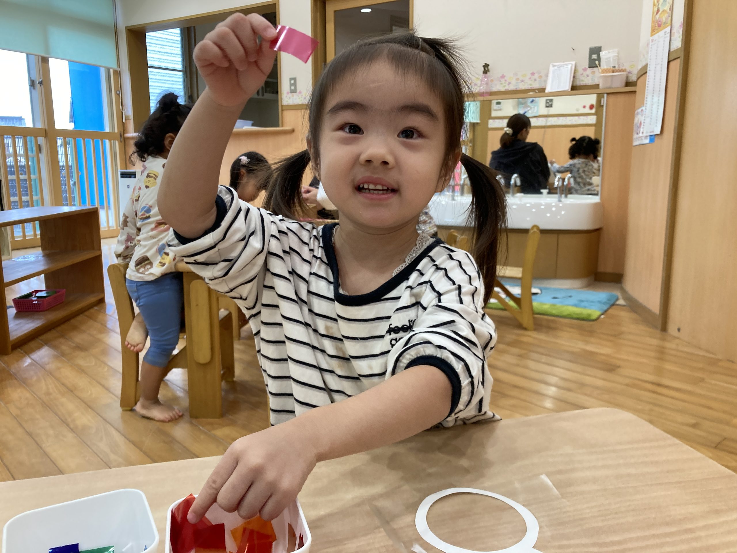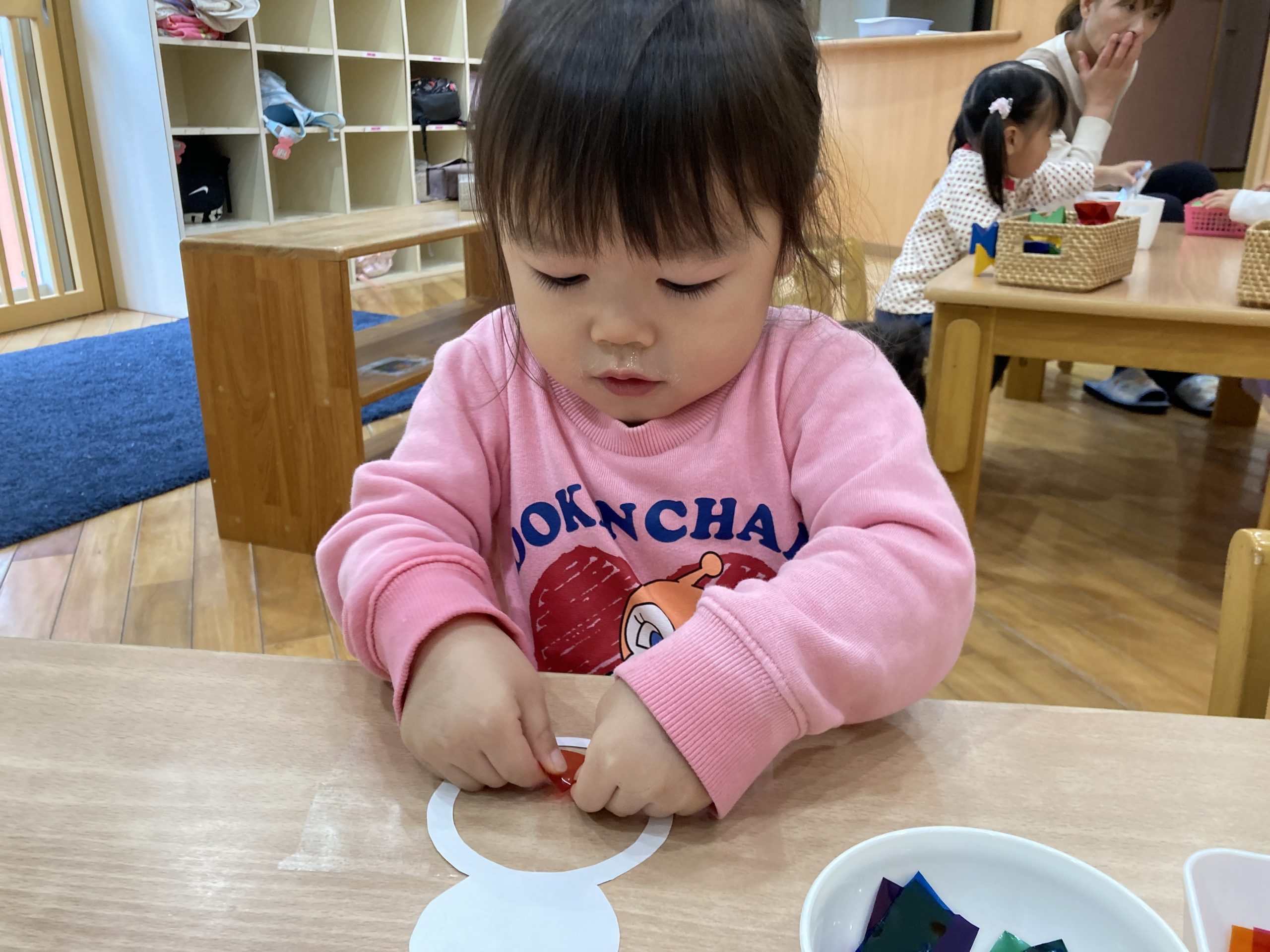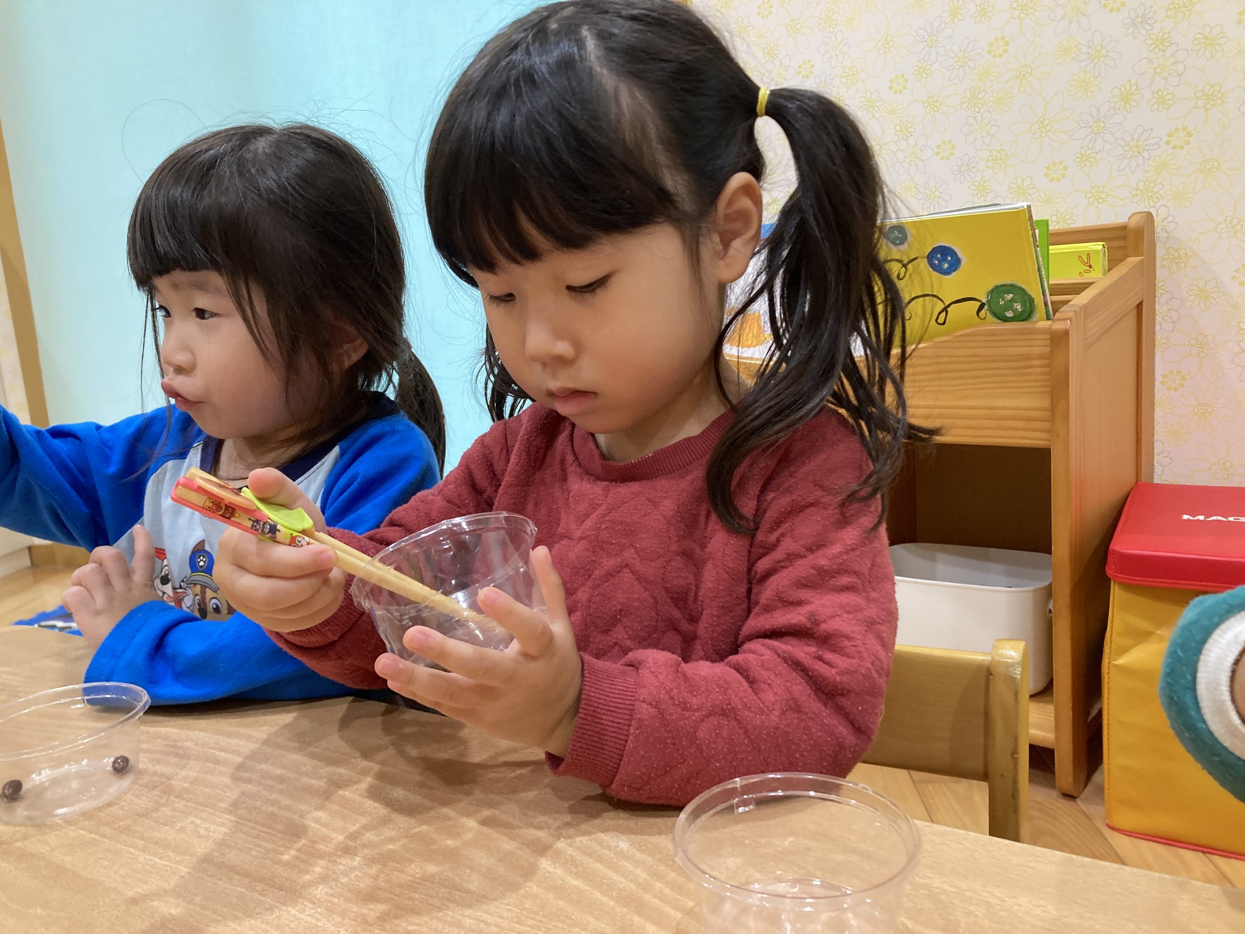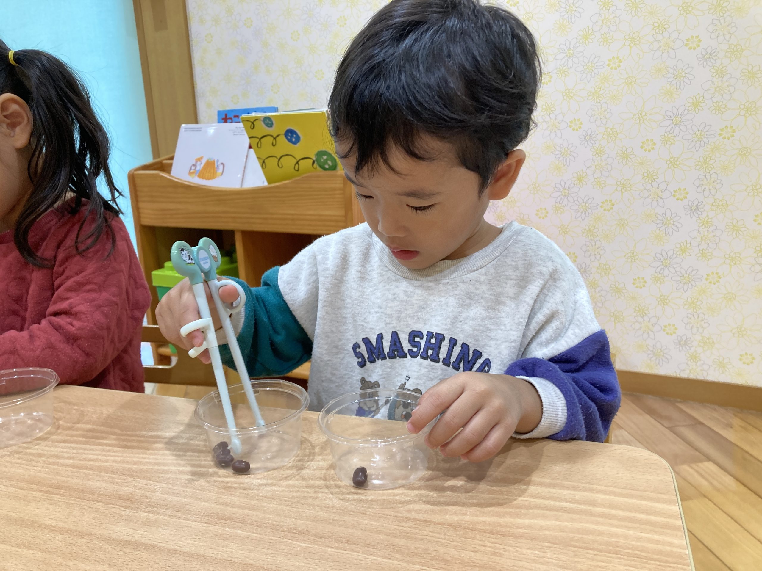 今日は、豆うつしをしました!アンパンマンのお箸やエジソン箸を使って、スポンジや豆をうつす練習をしました。みんな集中して取り組み、上手に豆をうつすことができていましたよ🐰✨