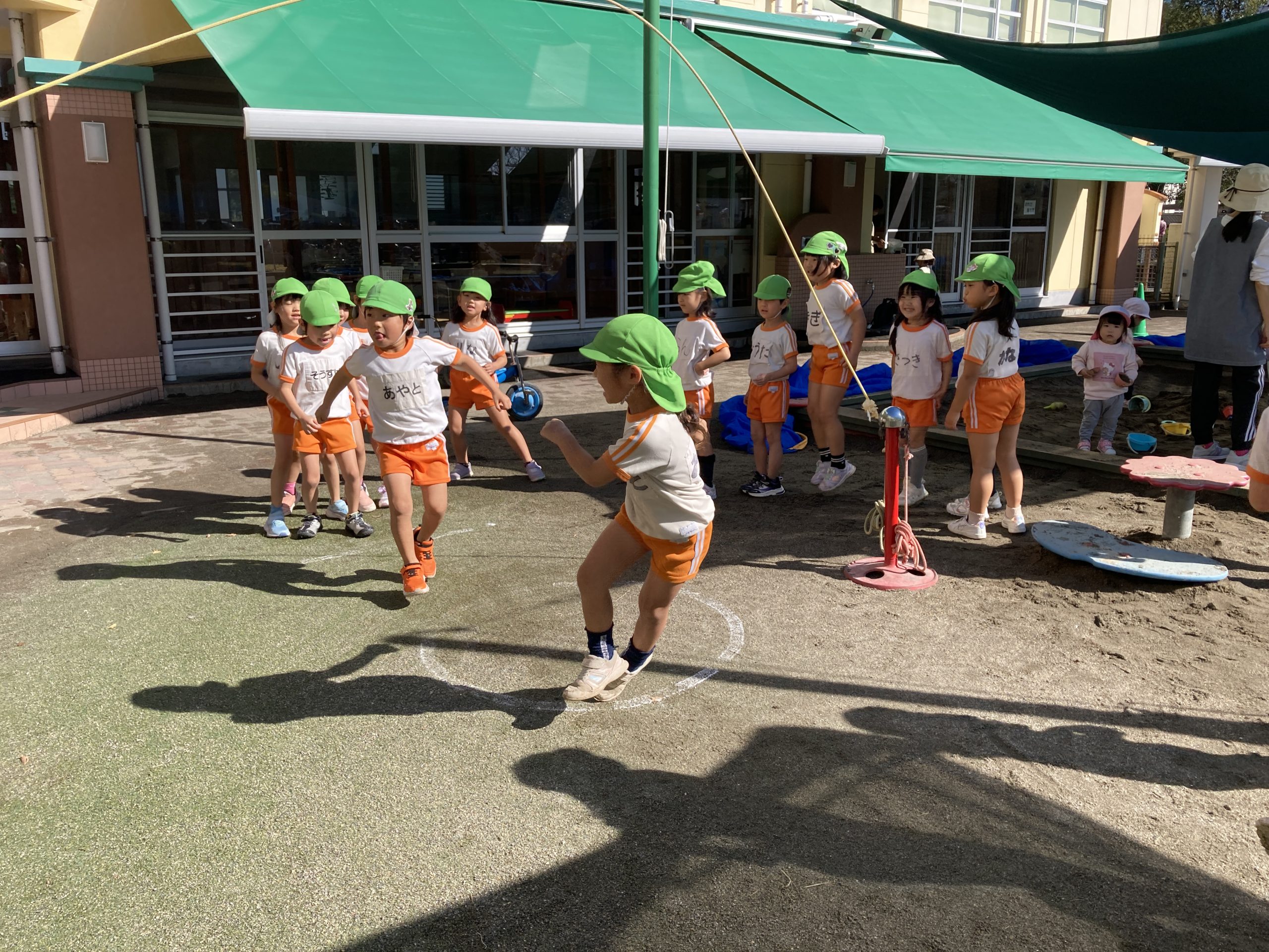 今日は、体育遊びで長縄、縄跳び、ホッピング、中あてをしました。長縄では7人連続で跳べるようになっていました。