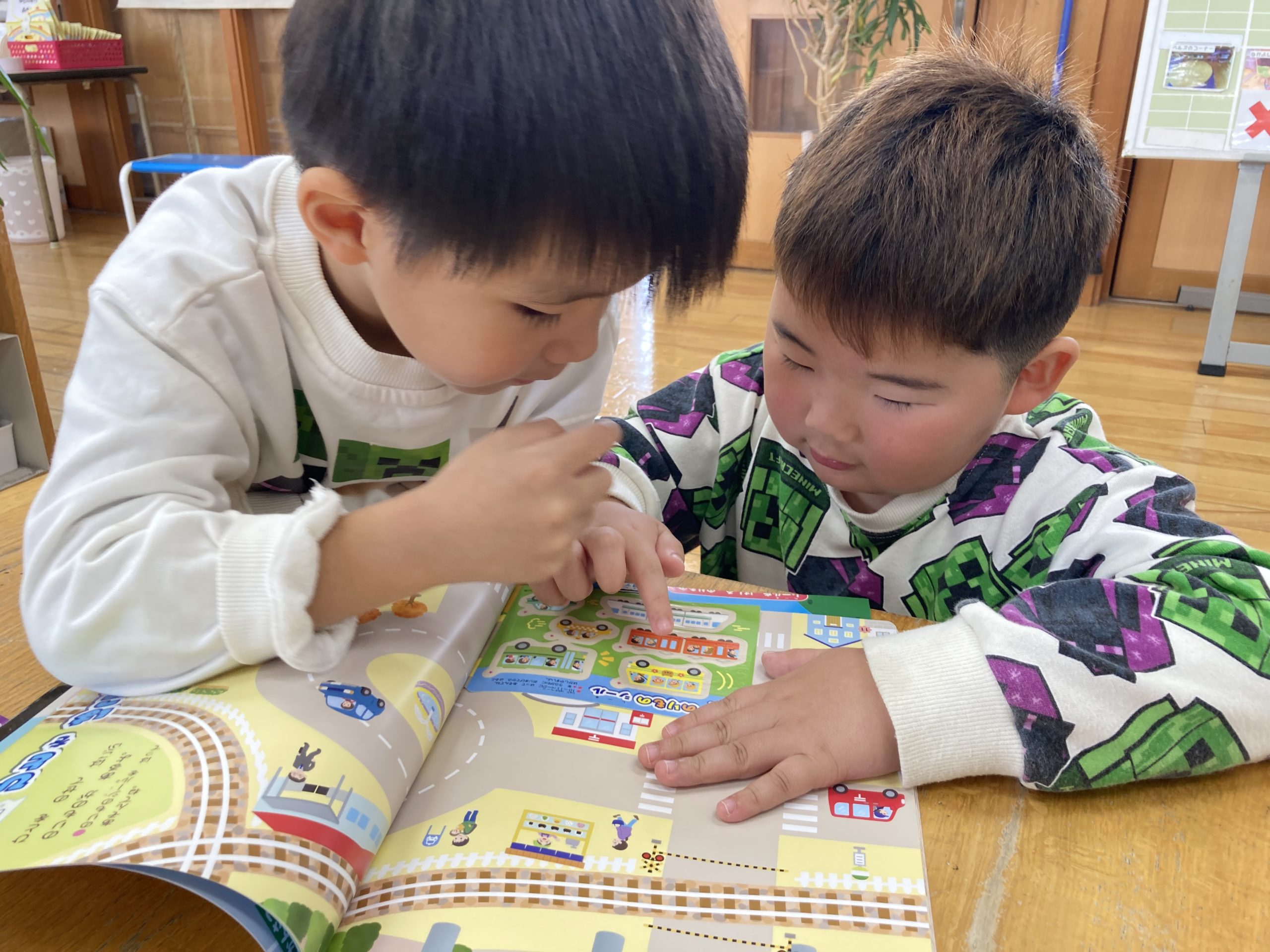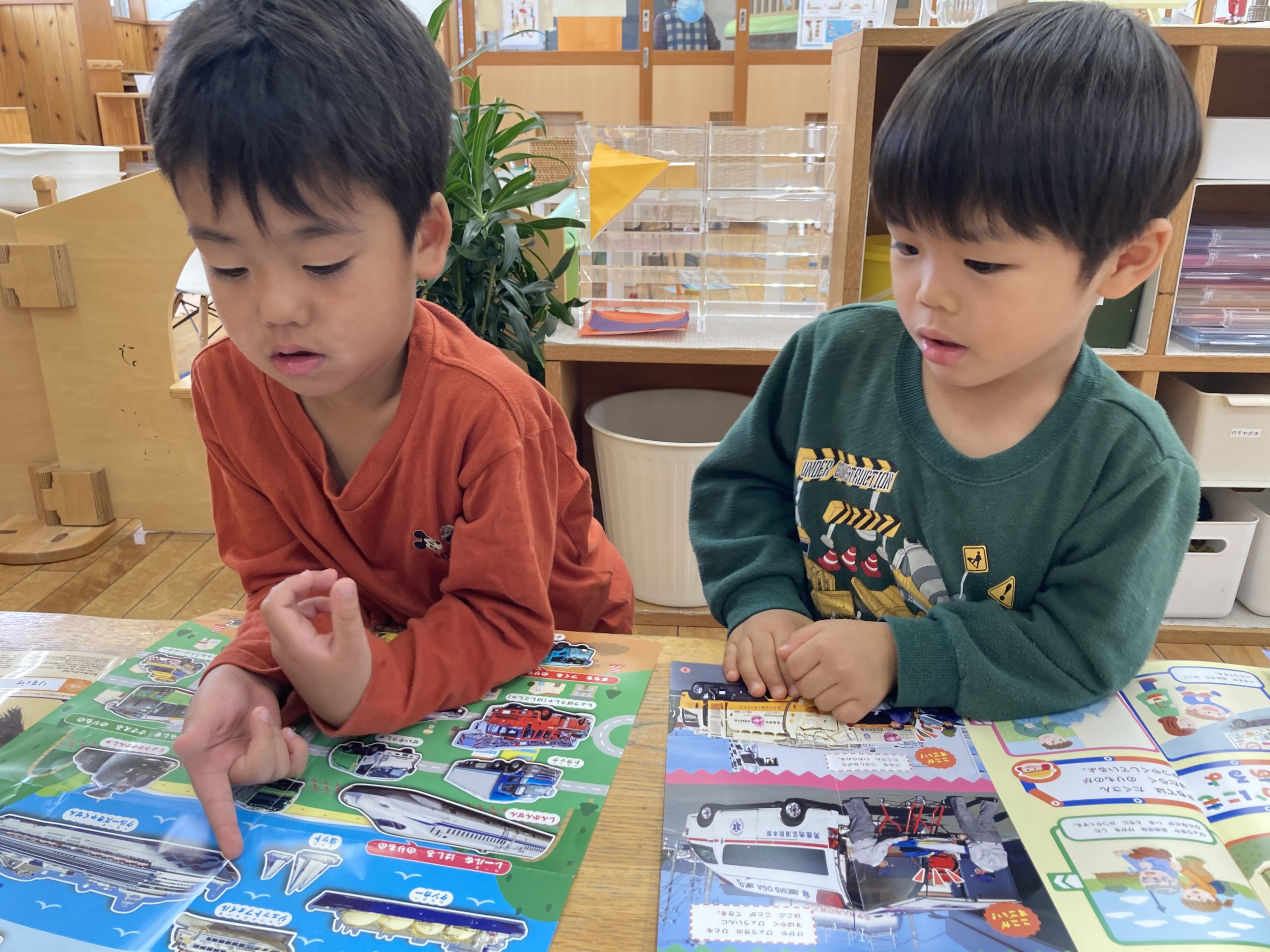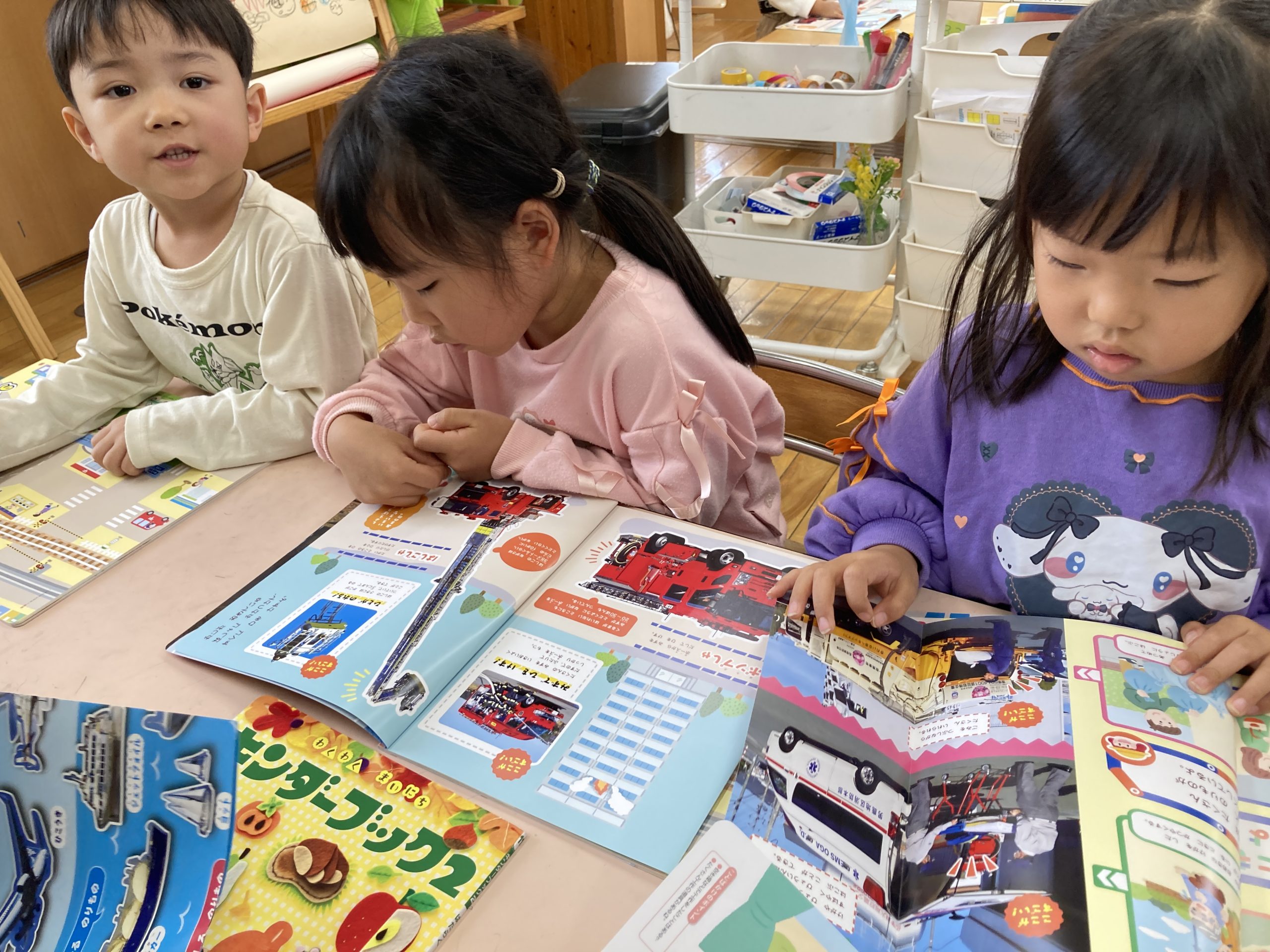 今日は、11月号の月刊絵本を見ました。身近な乗り物についてのお話で、消防車や救急車、ゴミ収集車、移動販売車など、どんな役割があるのかを知ることができました。