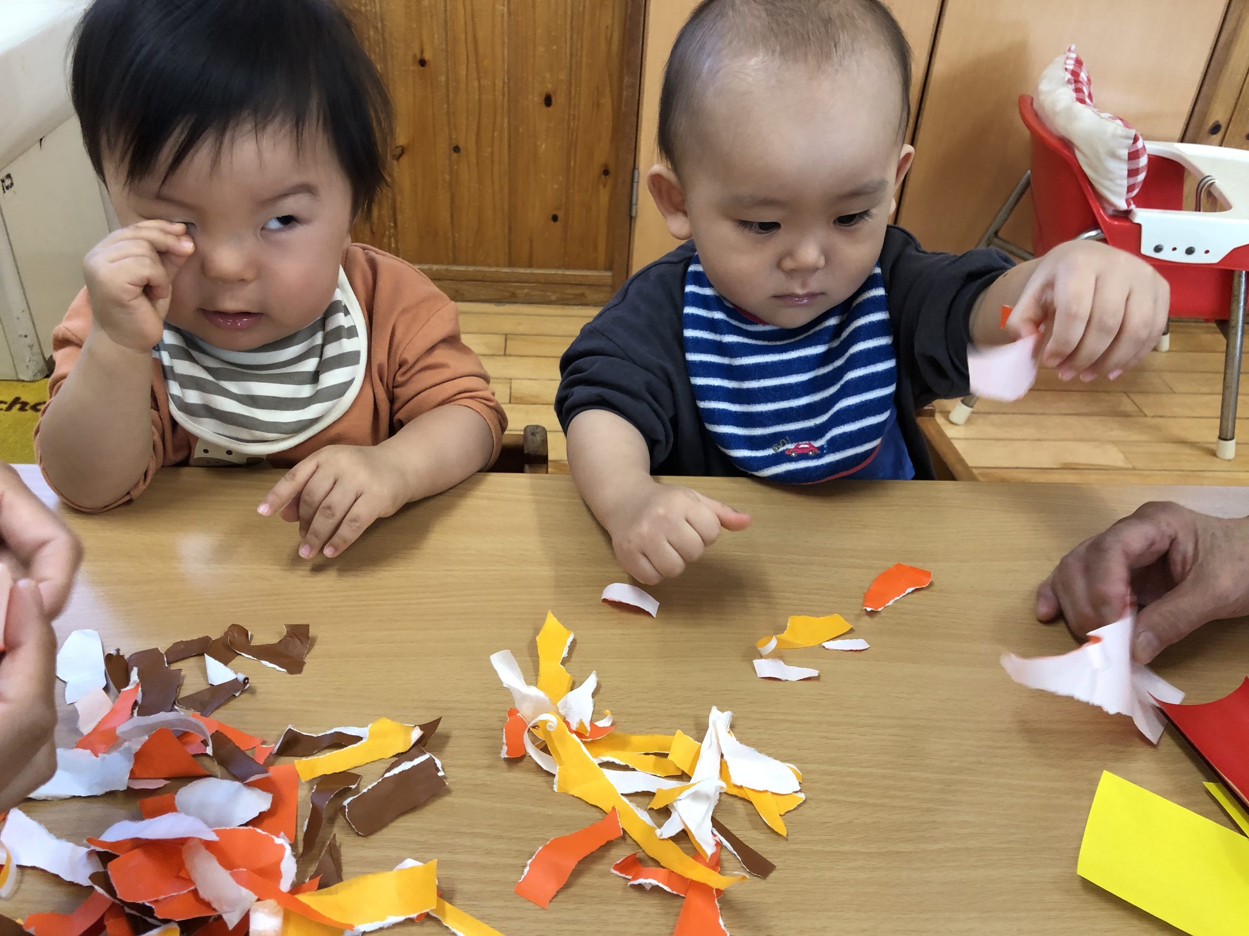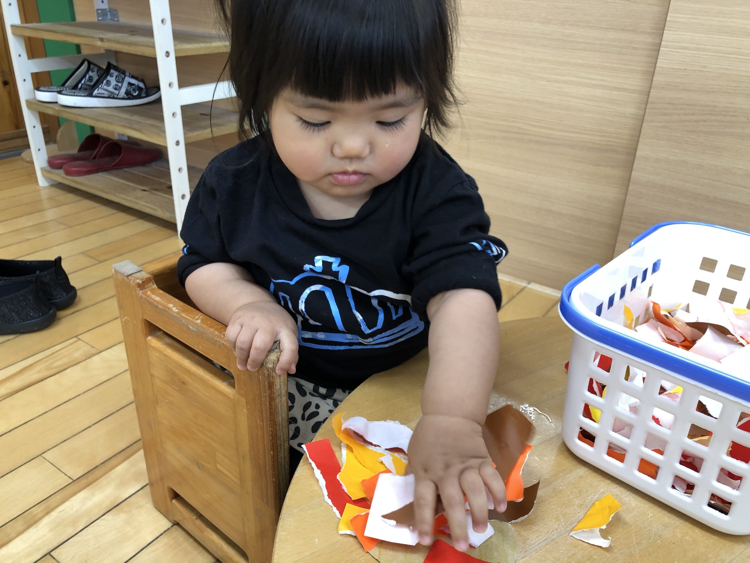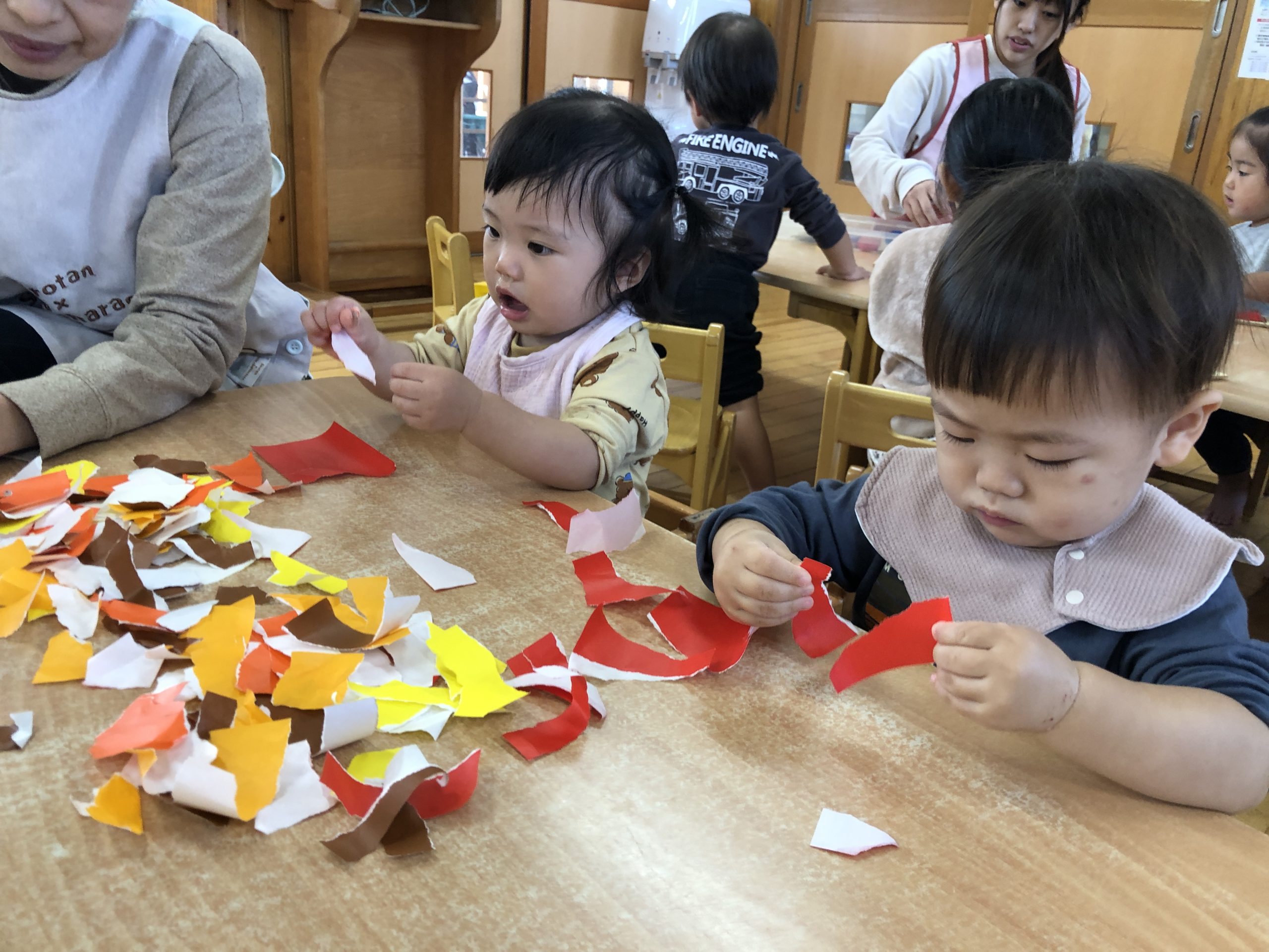 今日は、ちぎりあそびをしました。色いろの折り紙を破りましたよ。切れ目をいれると上手に破いてたくさん楽しんでいましたよ。破いた折り紙は~両面テープを貼った画用紙にペタペタ!みのむしの体になりました☆
