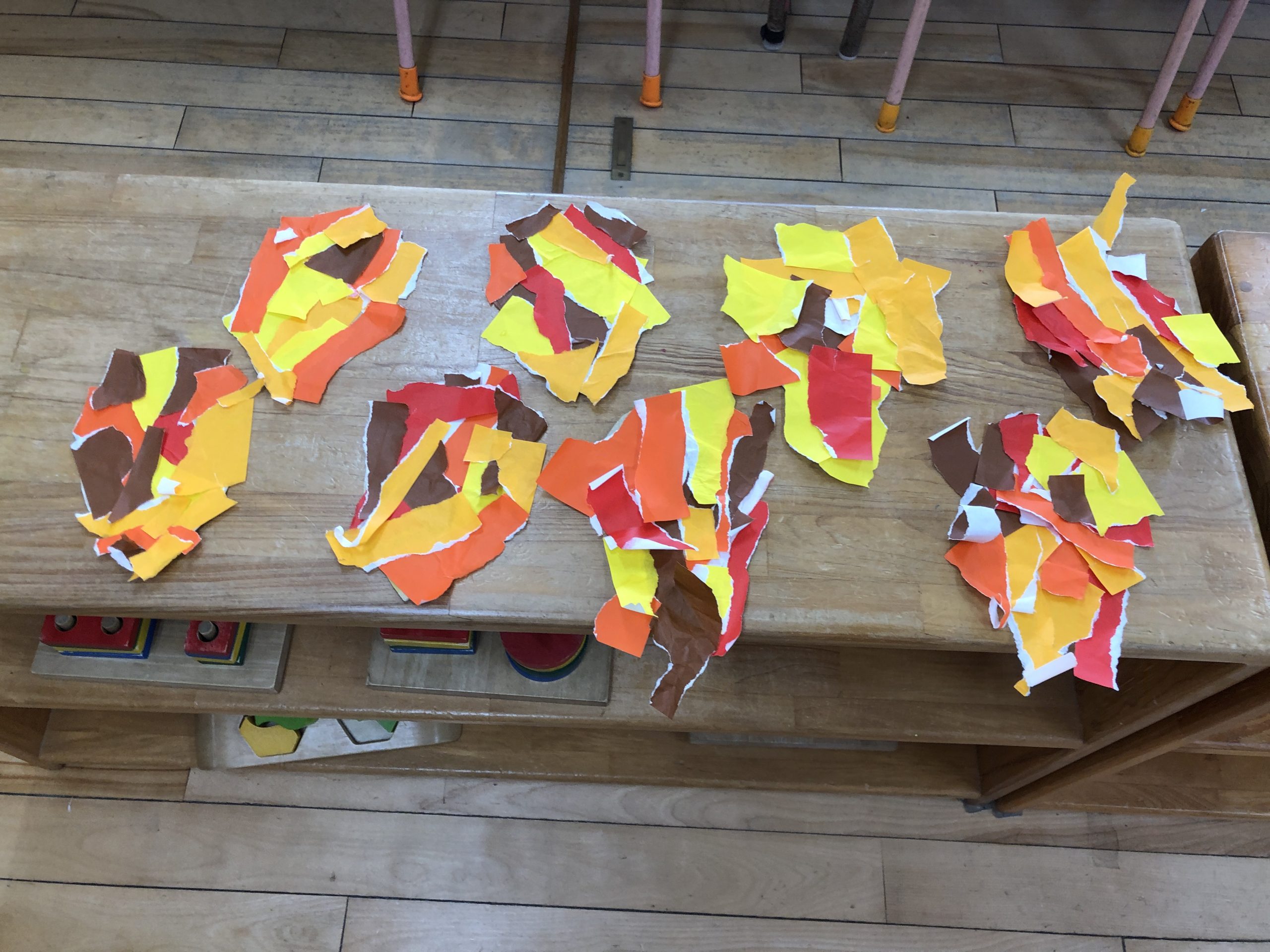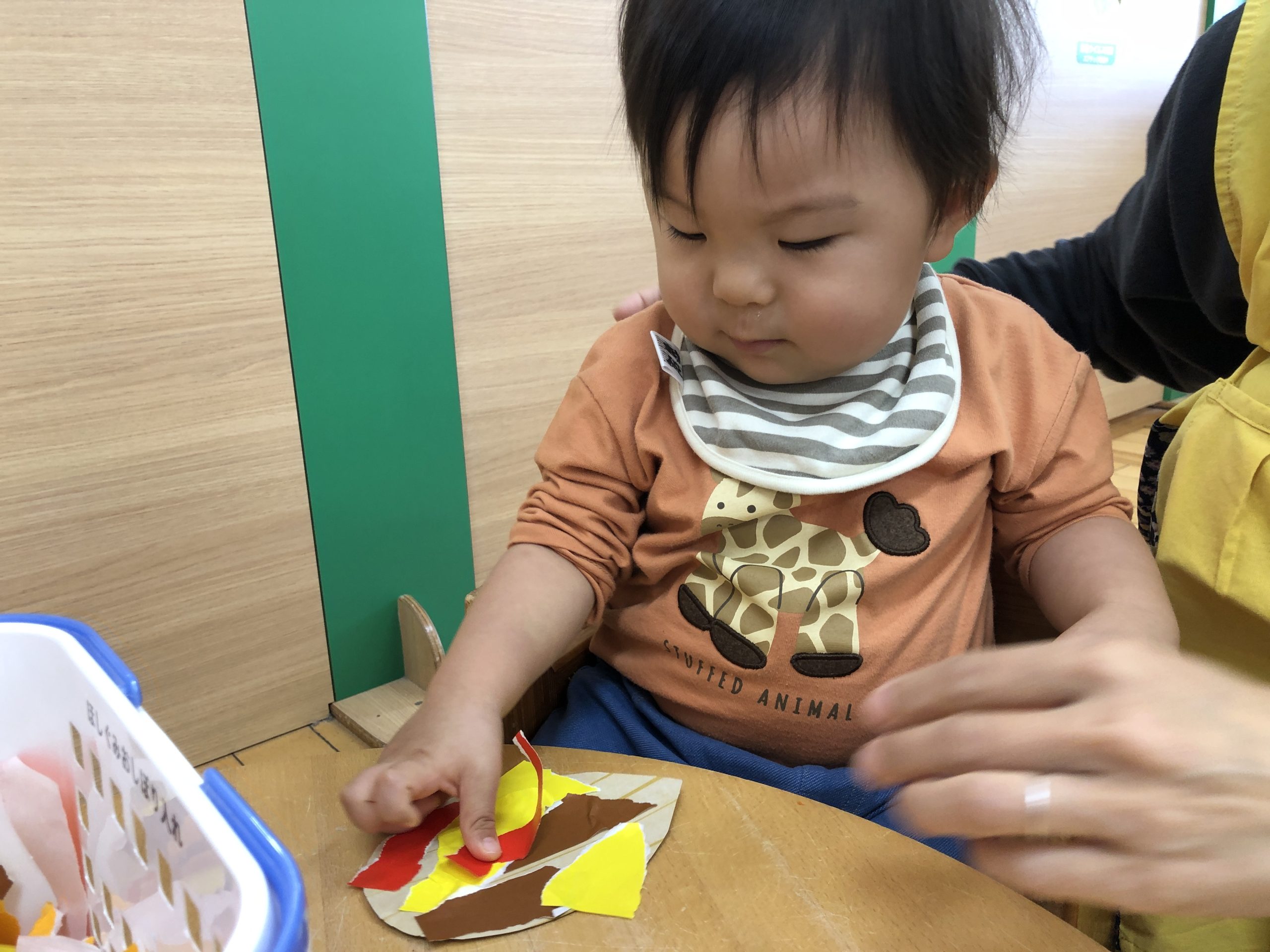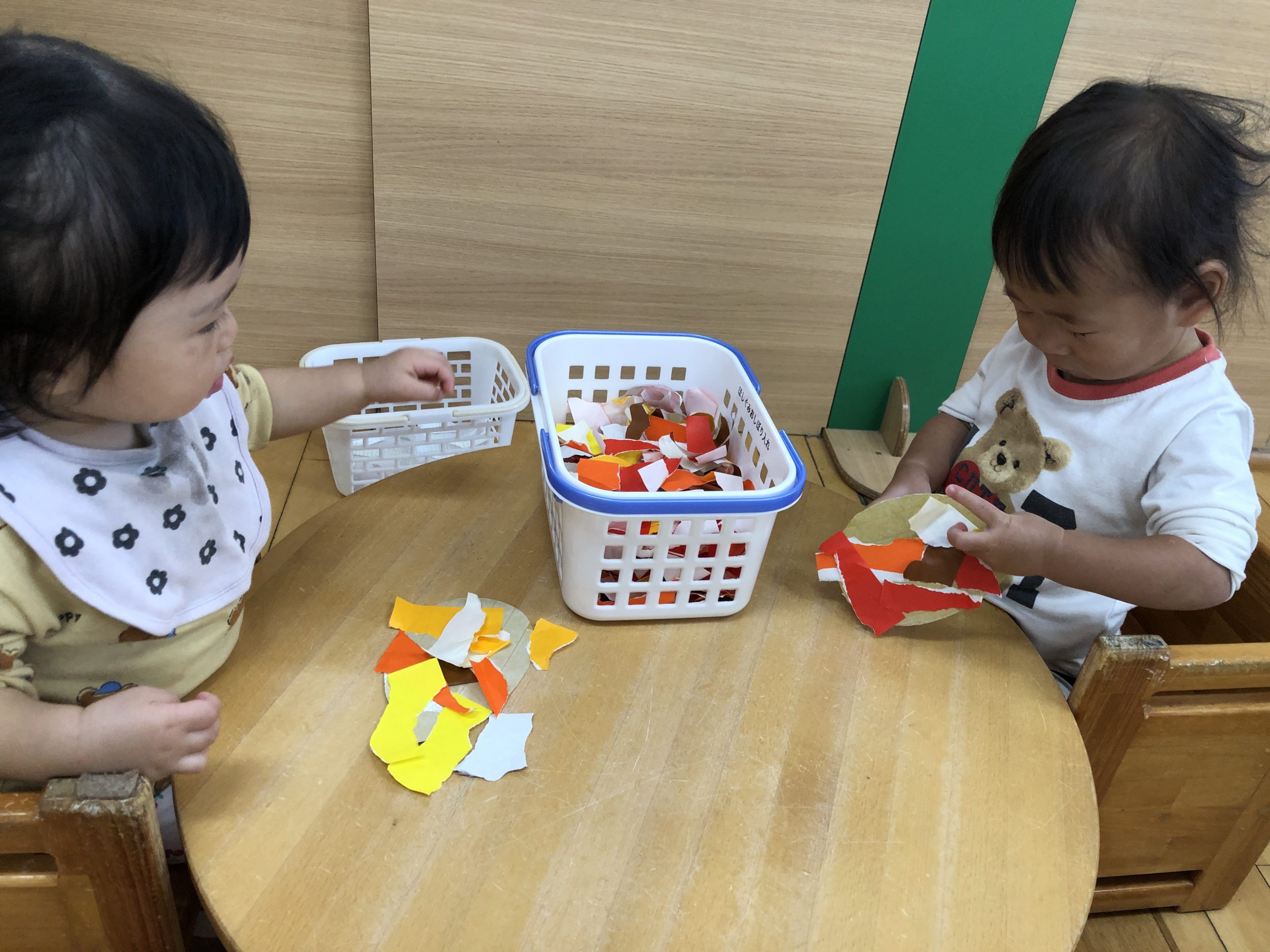 今日は、ちぎりあそびをしました。色いろの折り紙を破りましたよ。切れ目をいれると上手に破いてたくさん楽しんでいましたよ。破いた折り紙は~両面テープを貼った画用紙にペタペタ!みのむしの体になりました☆