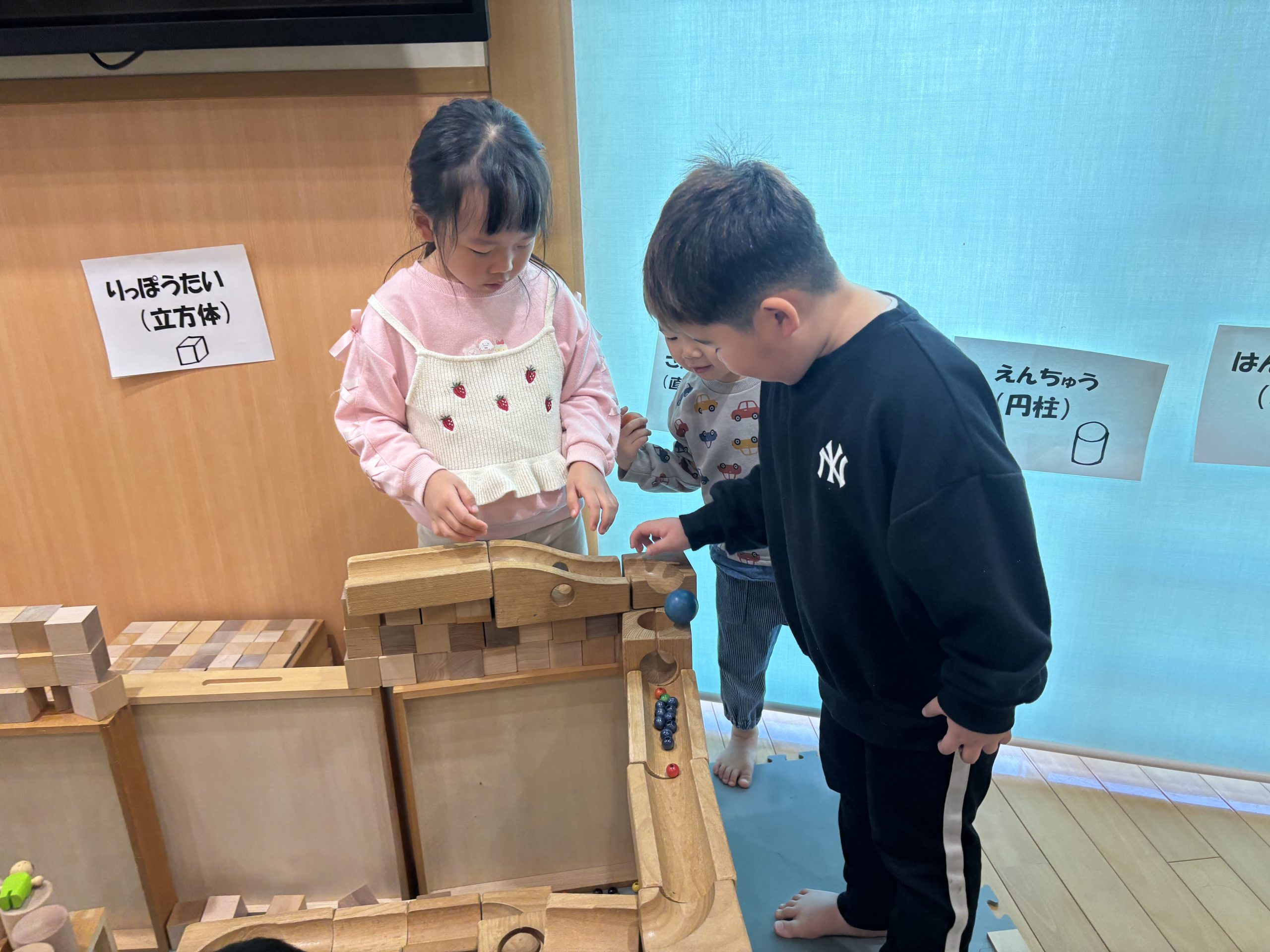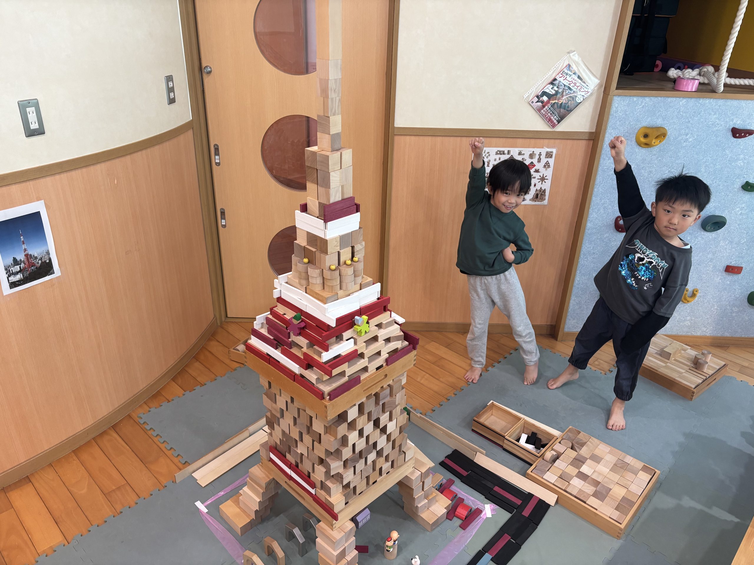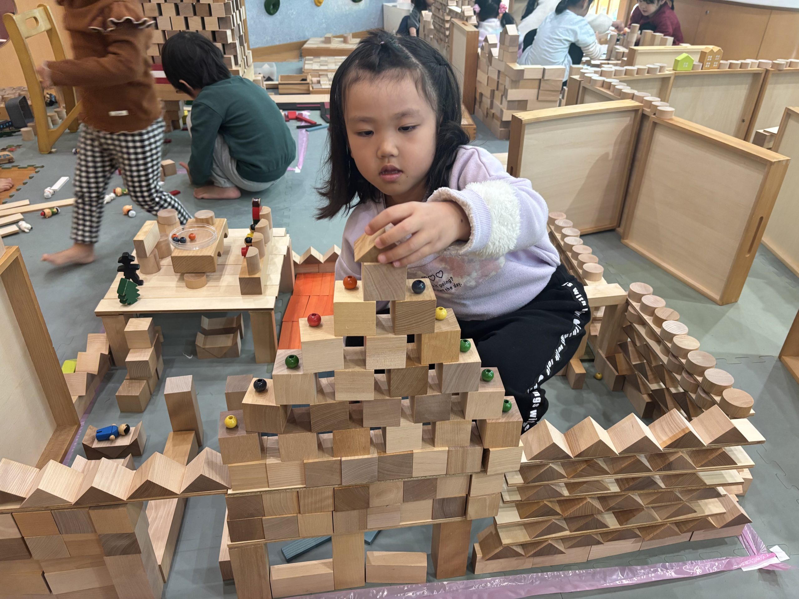今日は積み木遊びの続きをしました。ホテル、お家、お城、東京タワーが完成しました🏠✨積み木の他にも色付きのカプラや人形、色玉を使ってそれぞれお友達と協力して楽しそうに作っていました⭐️