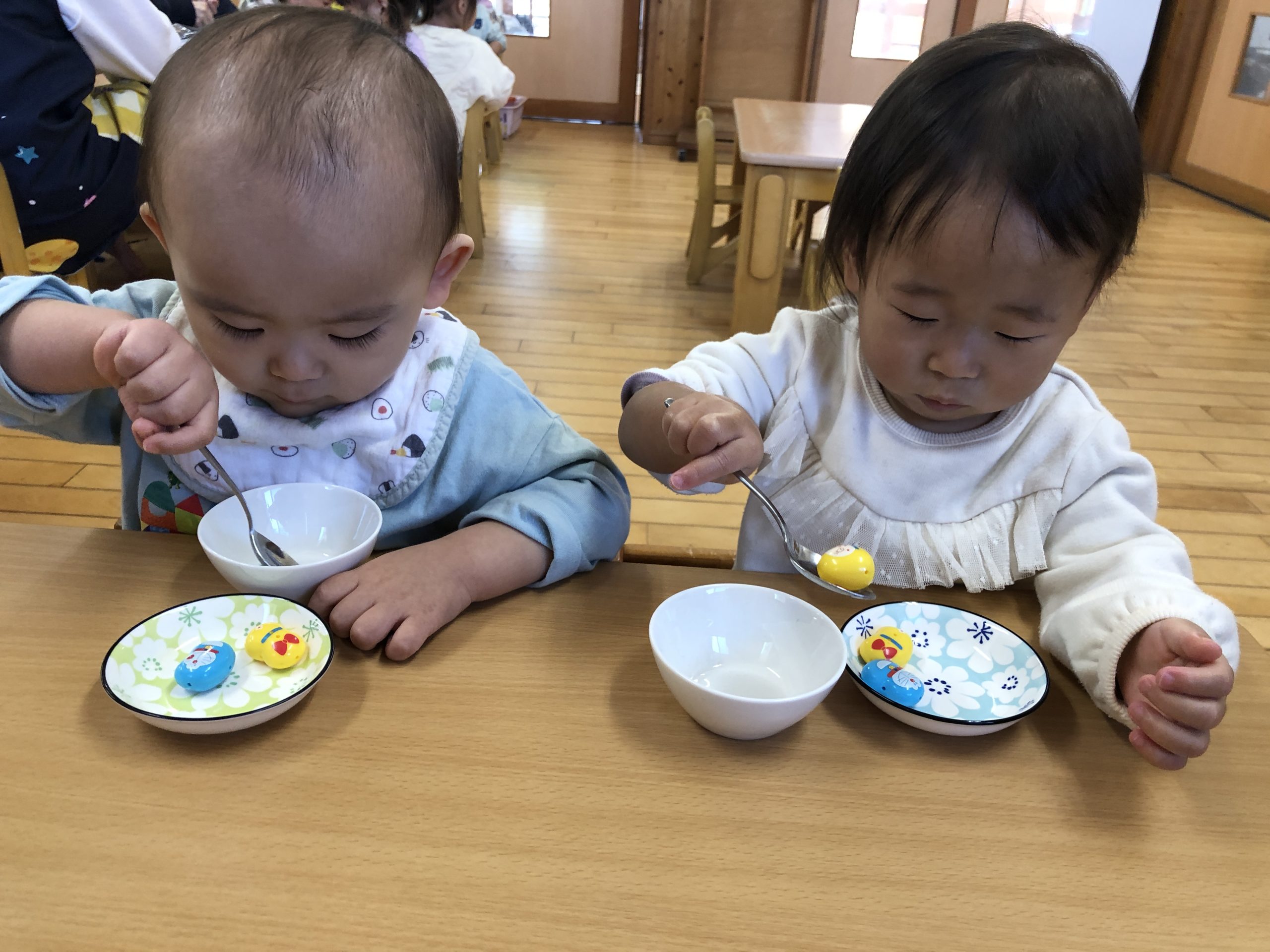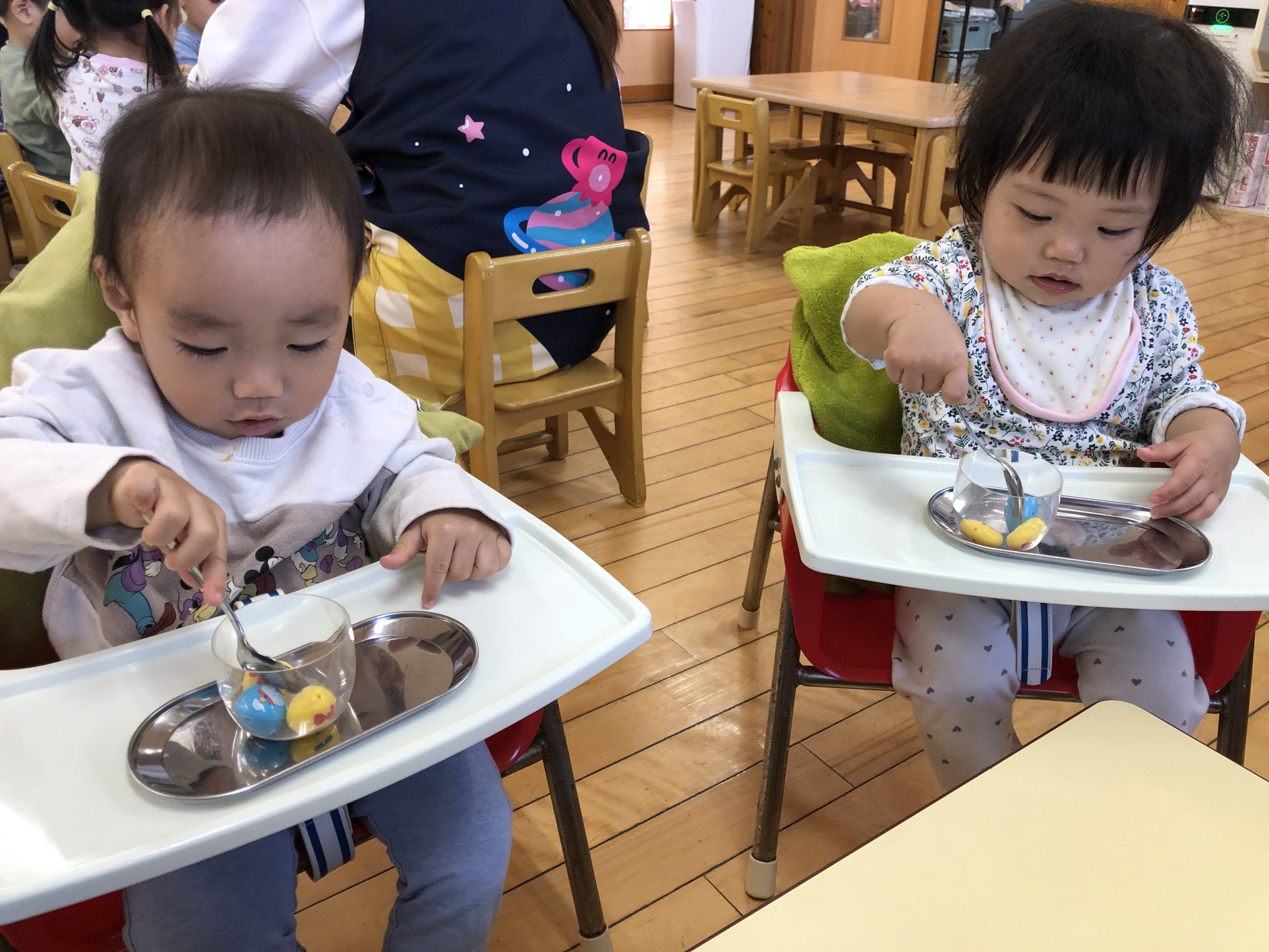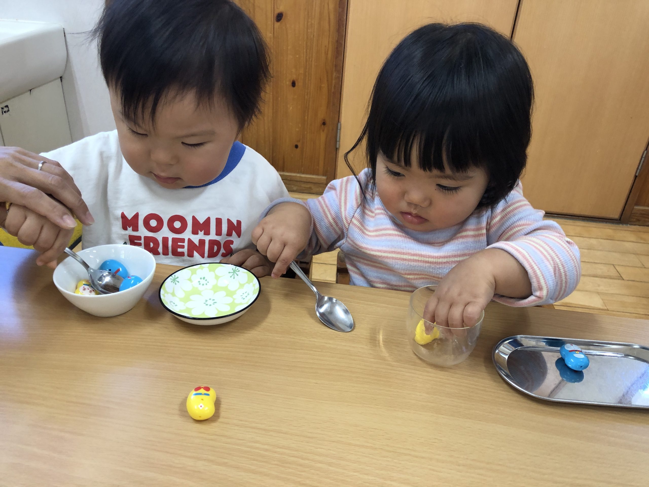 今日は、豆うつしあそびをしました。指先で豆を摘まんでペットボトルに入れたり、スプーンを使ってドラえもん豆をすくってみたりと何度も挑戦していました♬