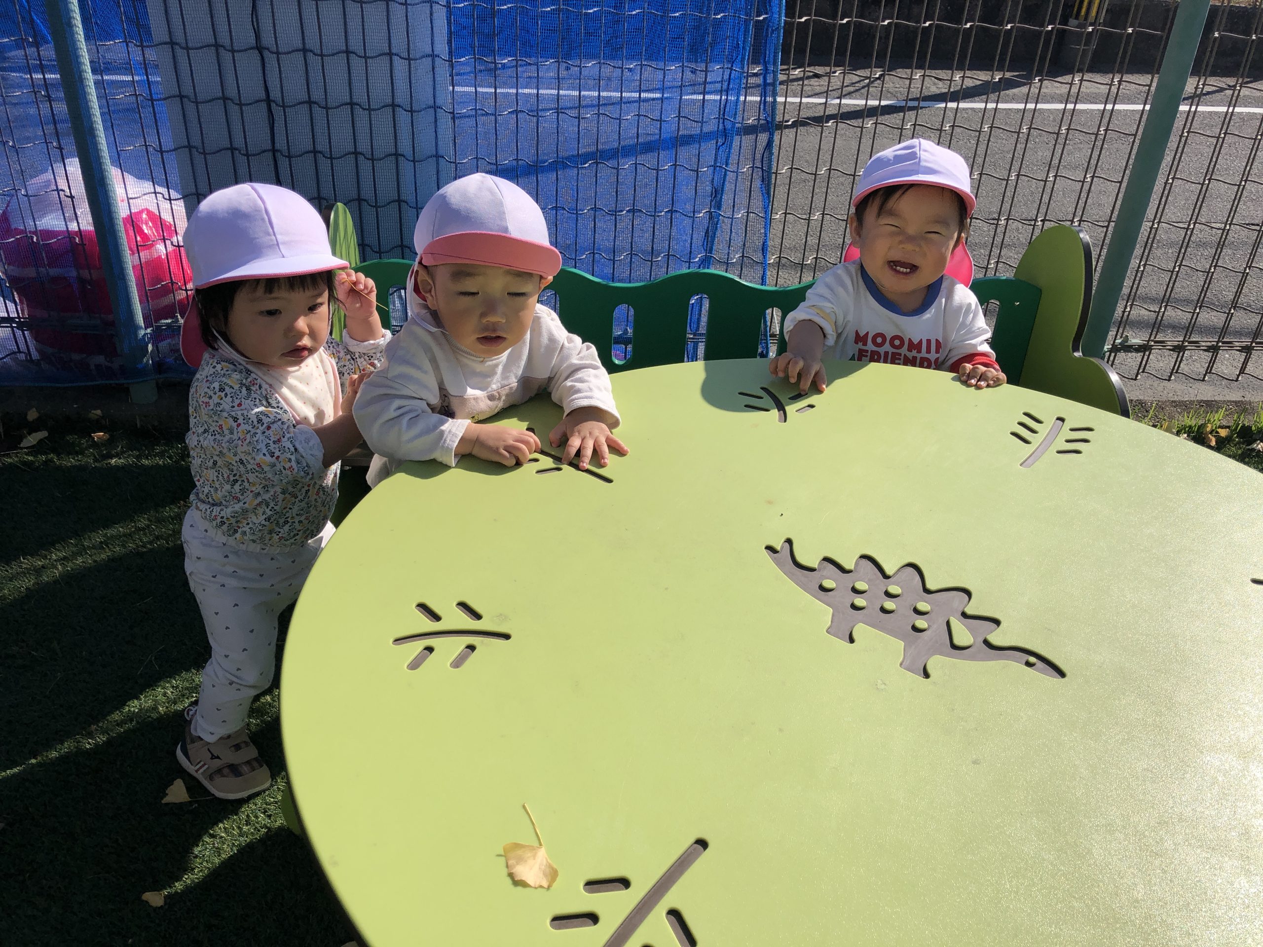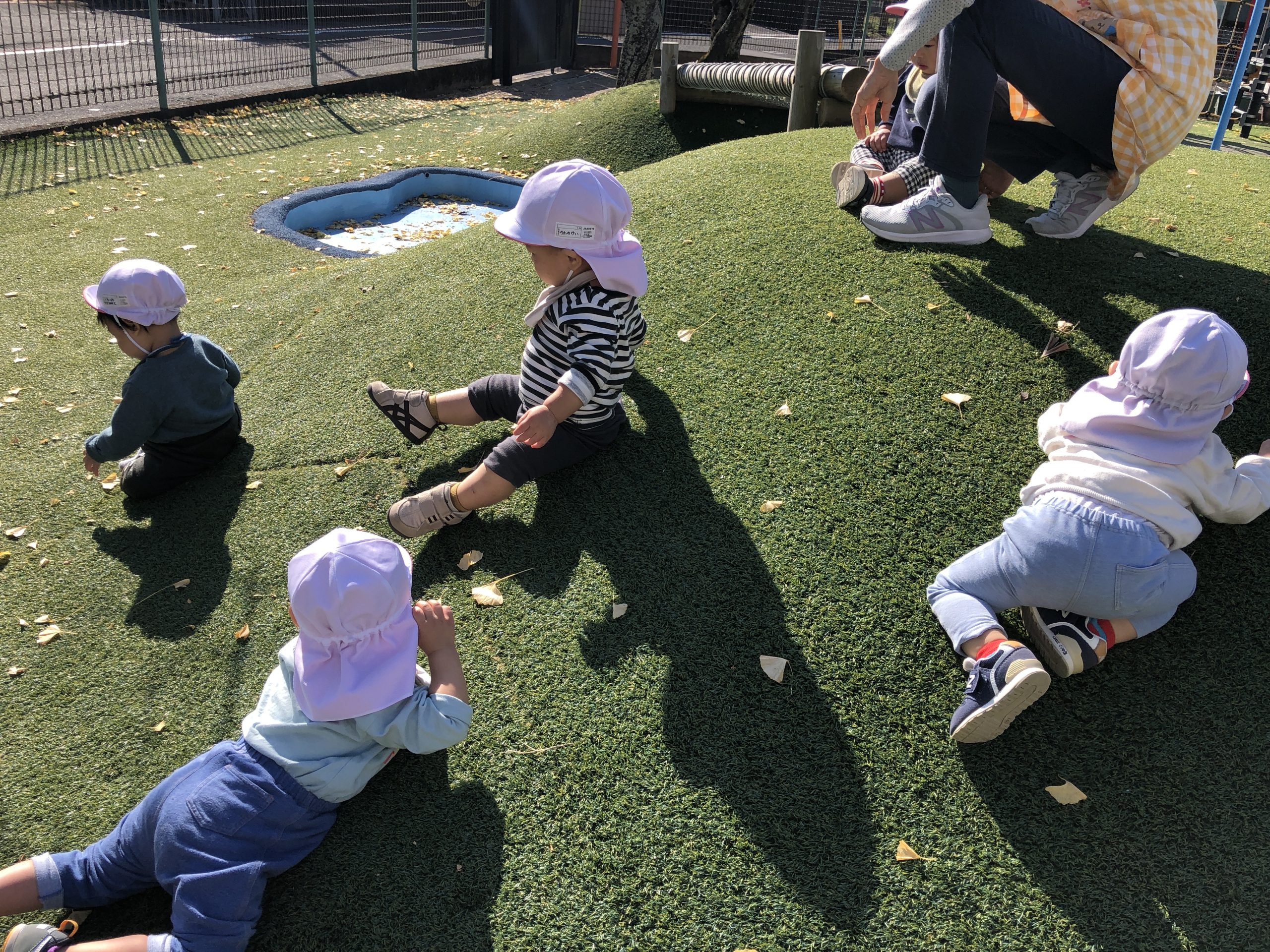豆うつしの後には、帽子、靴下・靴を履いて築山に行ってあそびました。山の上やベンチに座ってくつろいだり、銀杏の葉っぱを拾って触ってみたり、山登りや歩いたりと探索を楽しんでいました☆彡