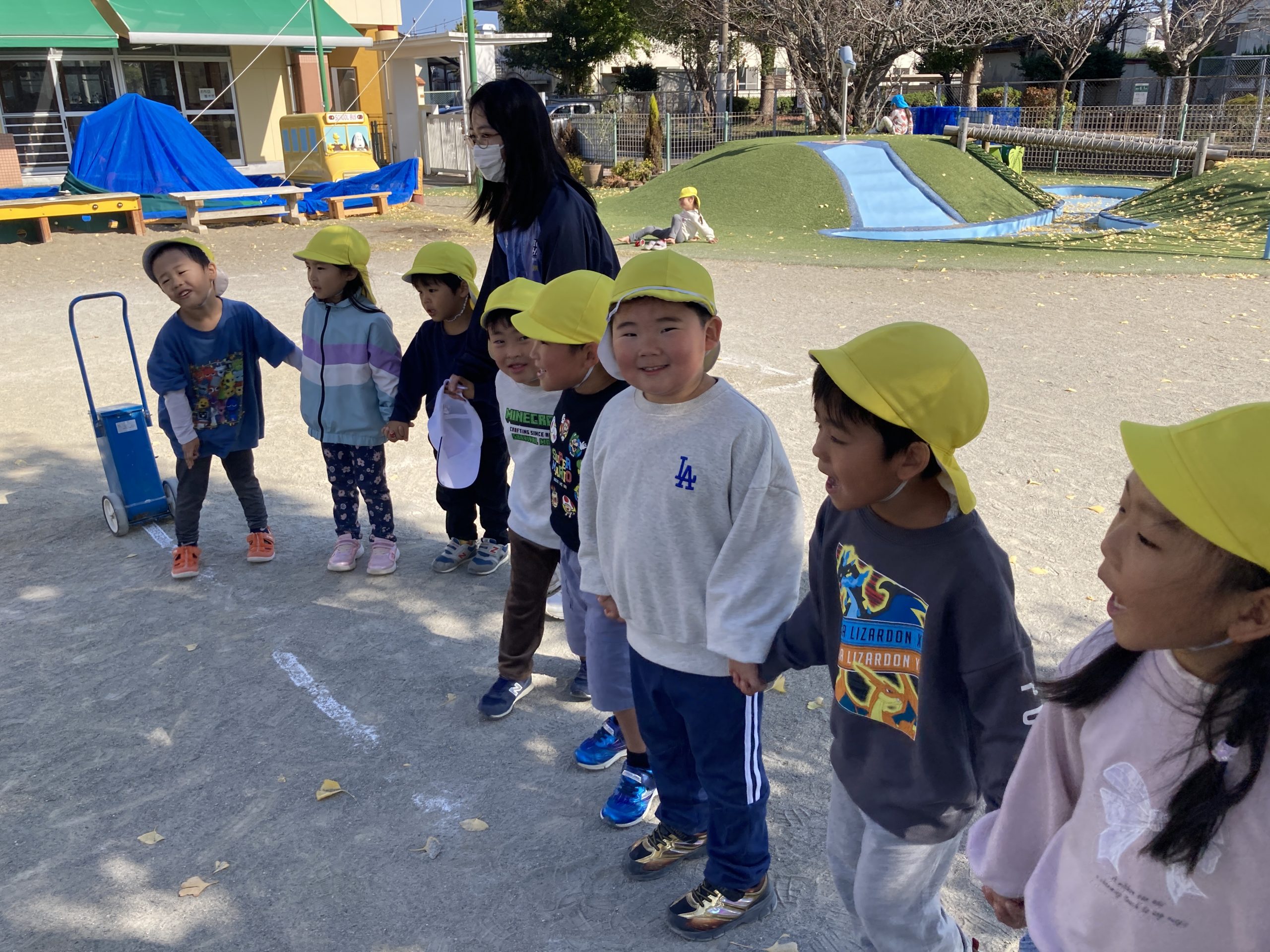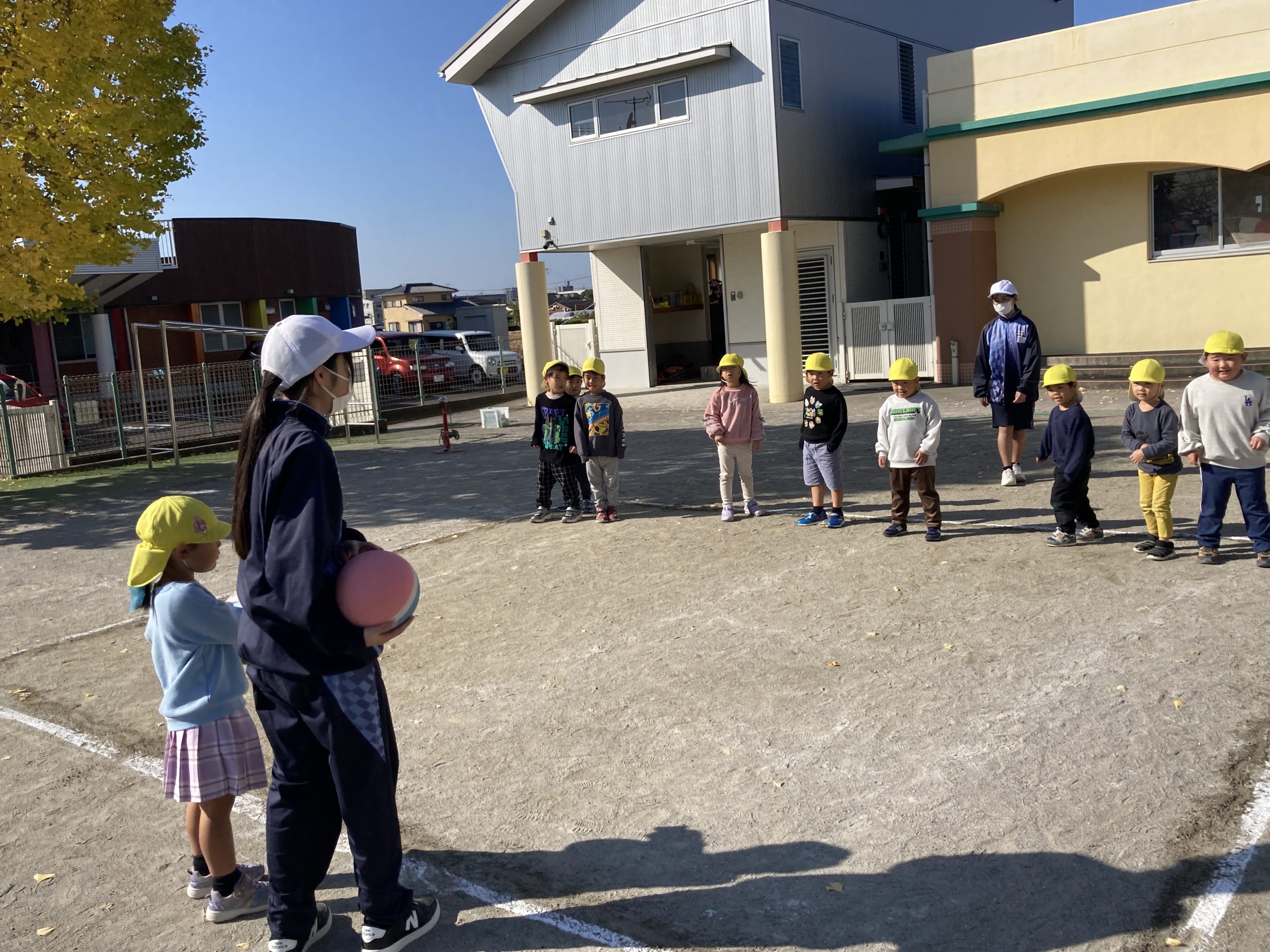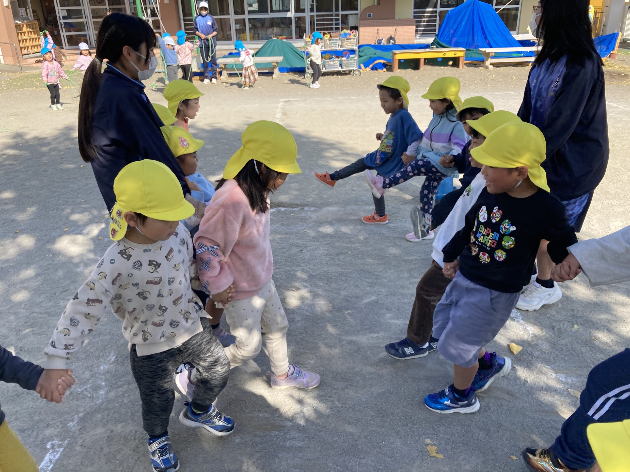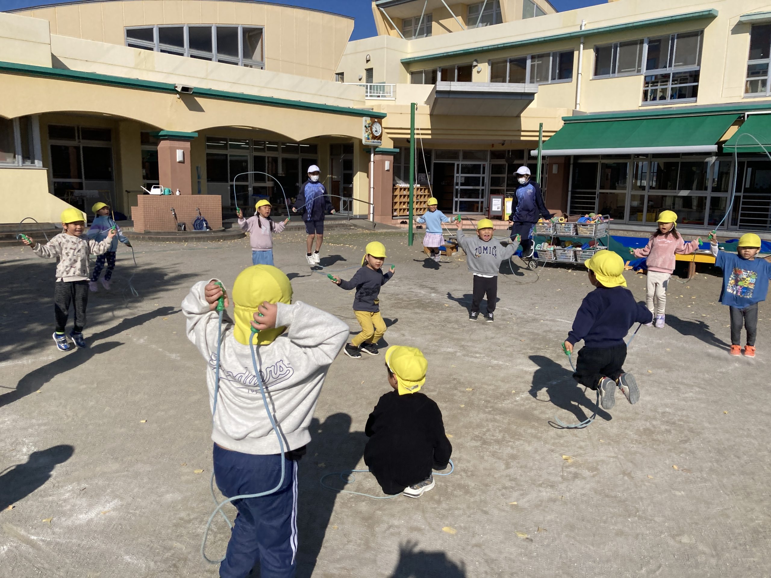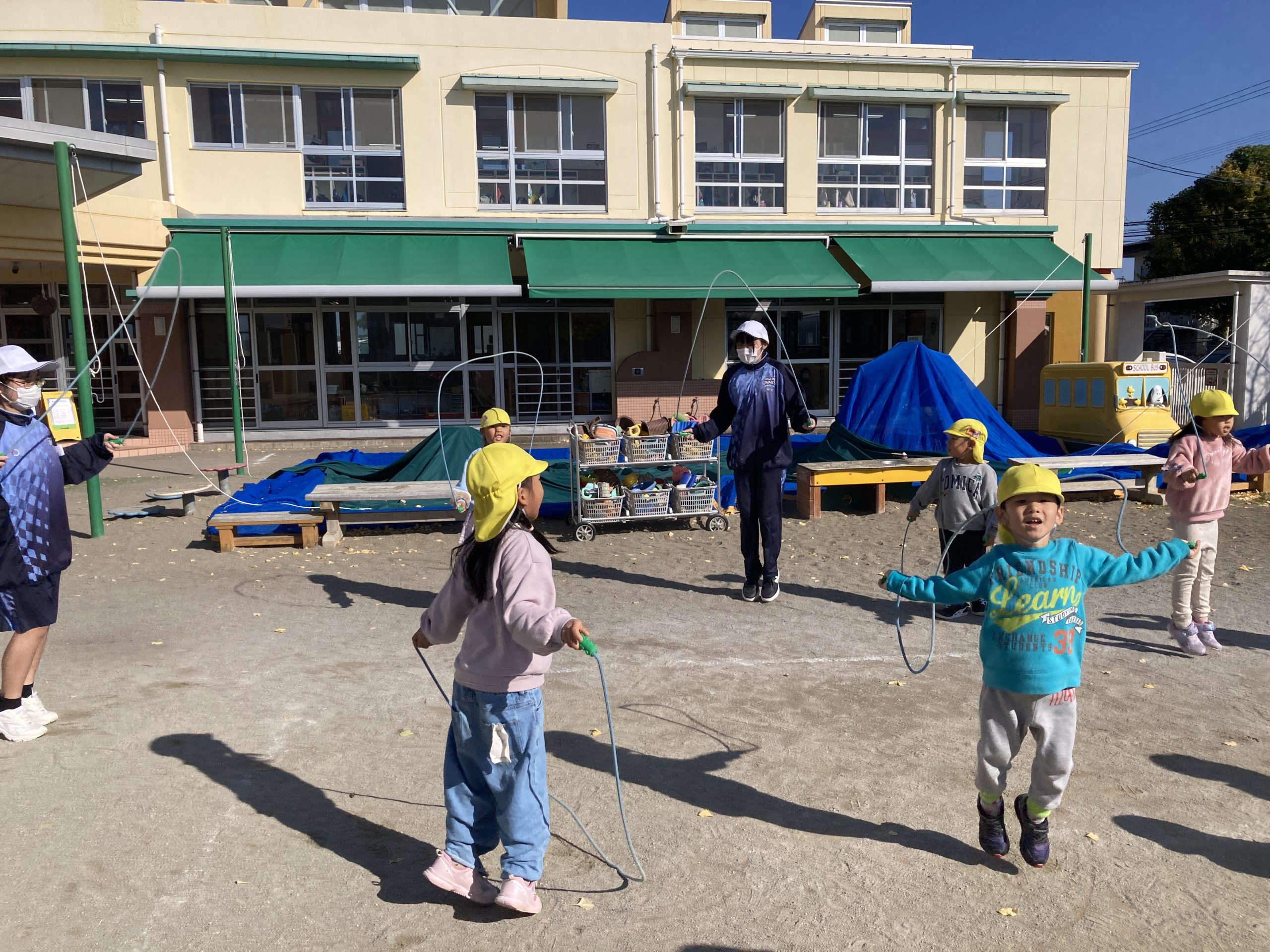 今日は戸外で遊びました。職場体験学習の中学生もりすぐみさんに入って、一生に遊びました。短なわとびでは、中学生とどちらが長く跳び続けられるかを競争をして遊びました。長く跳び続けて、中学生よりも長く、跳べるお友だちもいました。