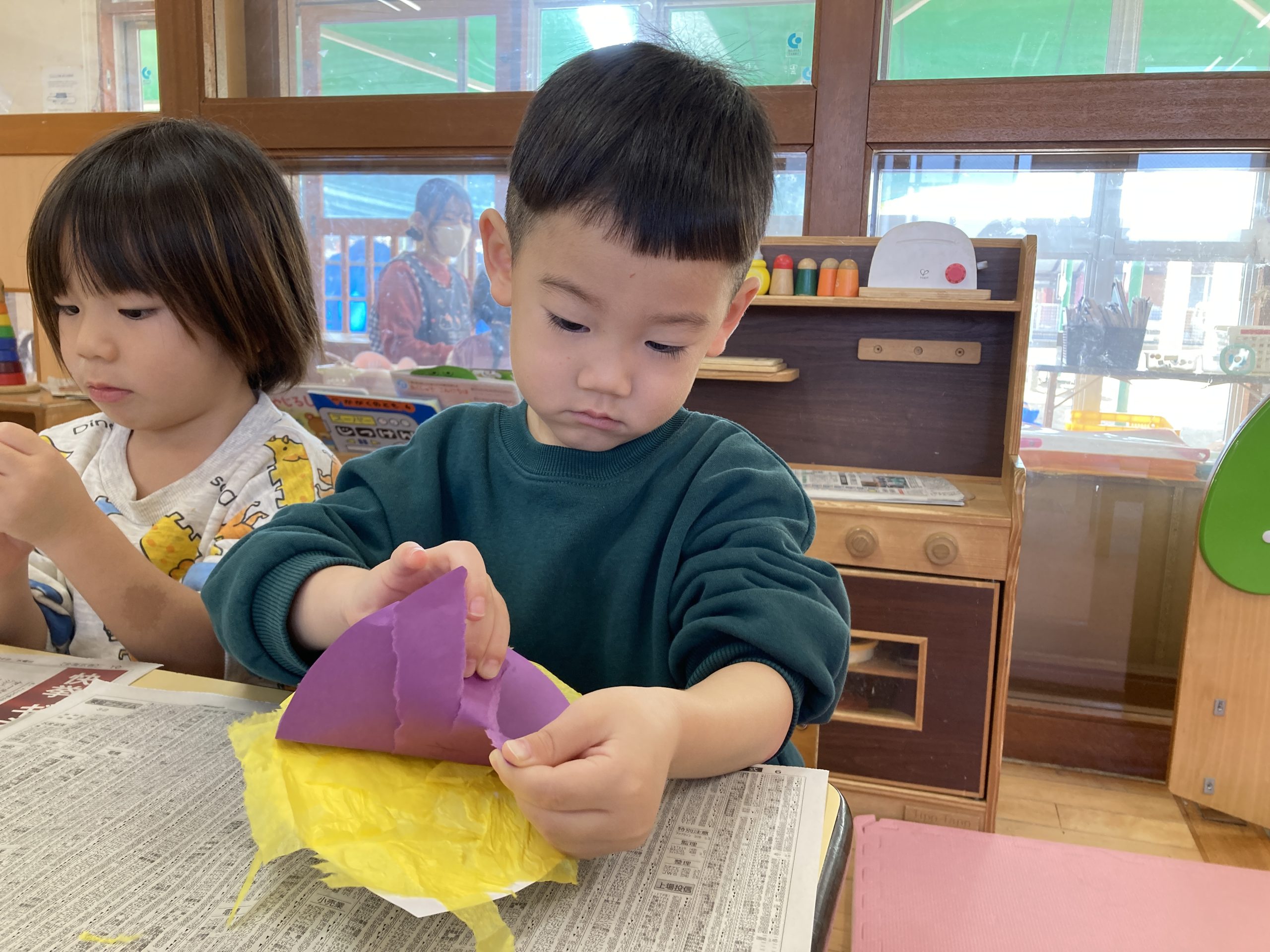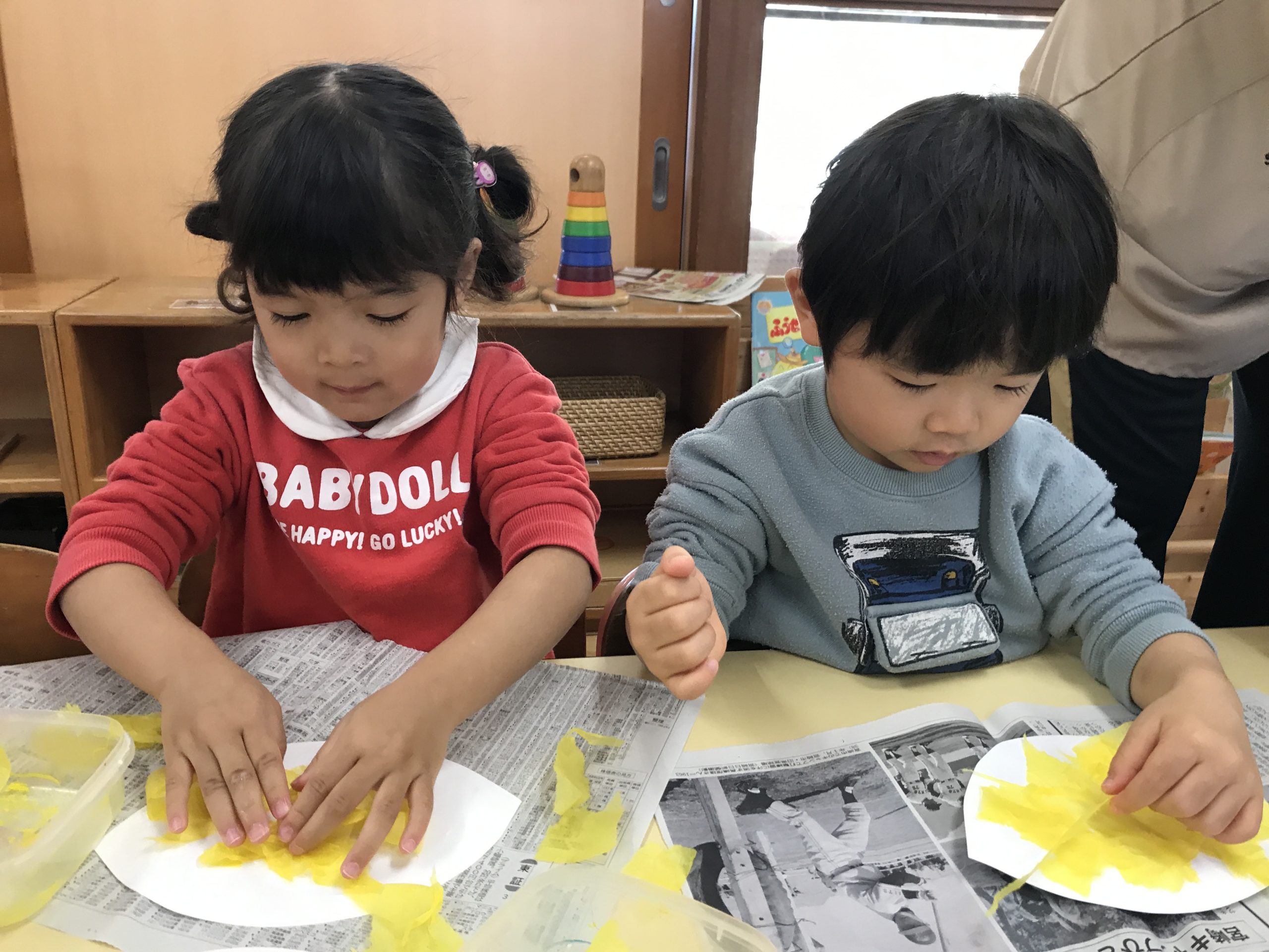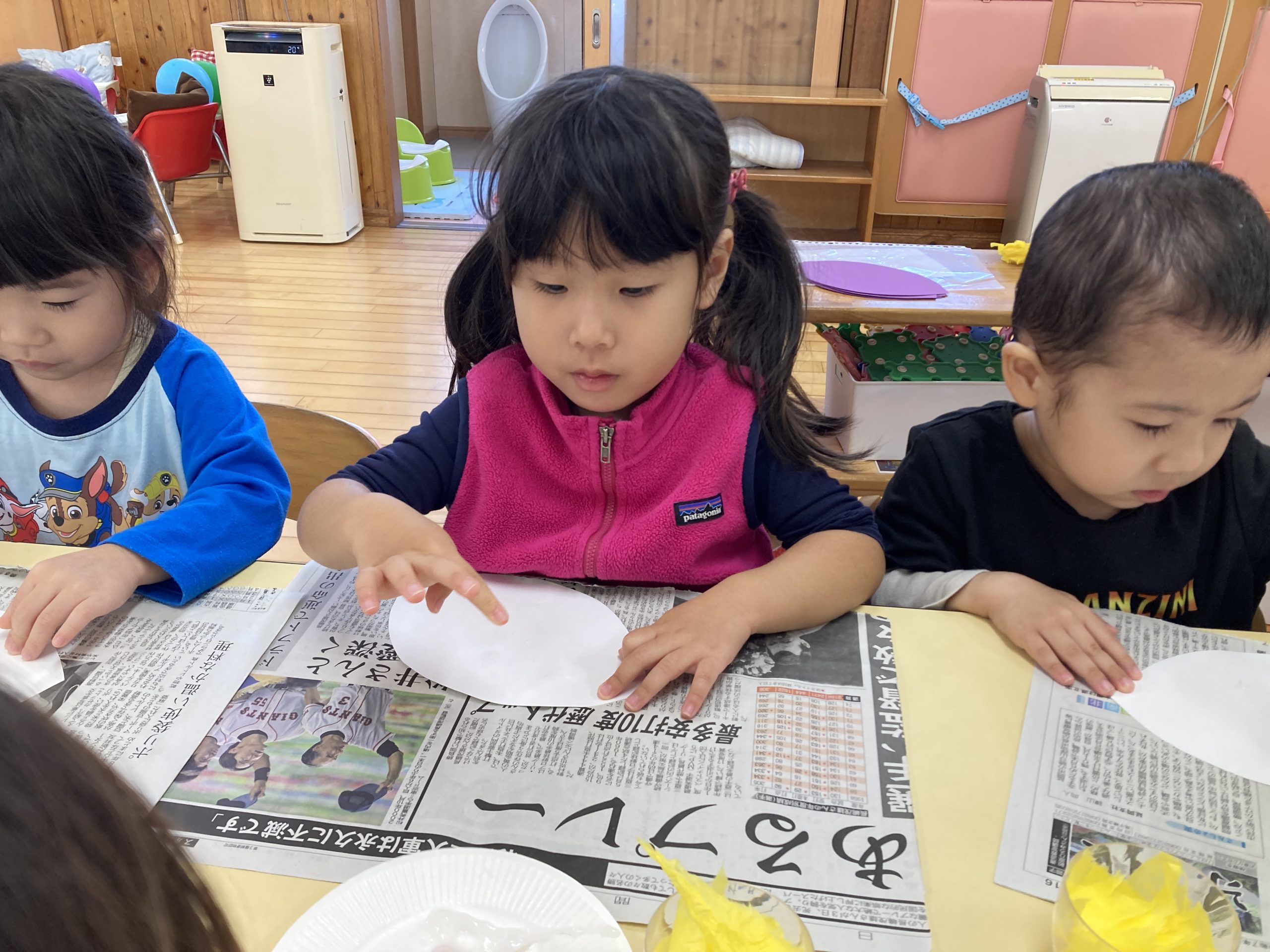 今日は、製作で焼き芋を作りました🍠💛花紙をちぎり、画用紙にのりを塗って花紙を貼り付けました!みんな上手に作ることができていましたよ✨また、画用紙を破いて焼き芋の皮がむけている様子も表現しました!